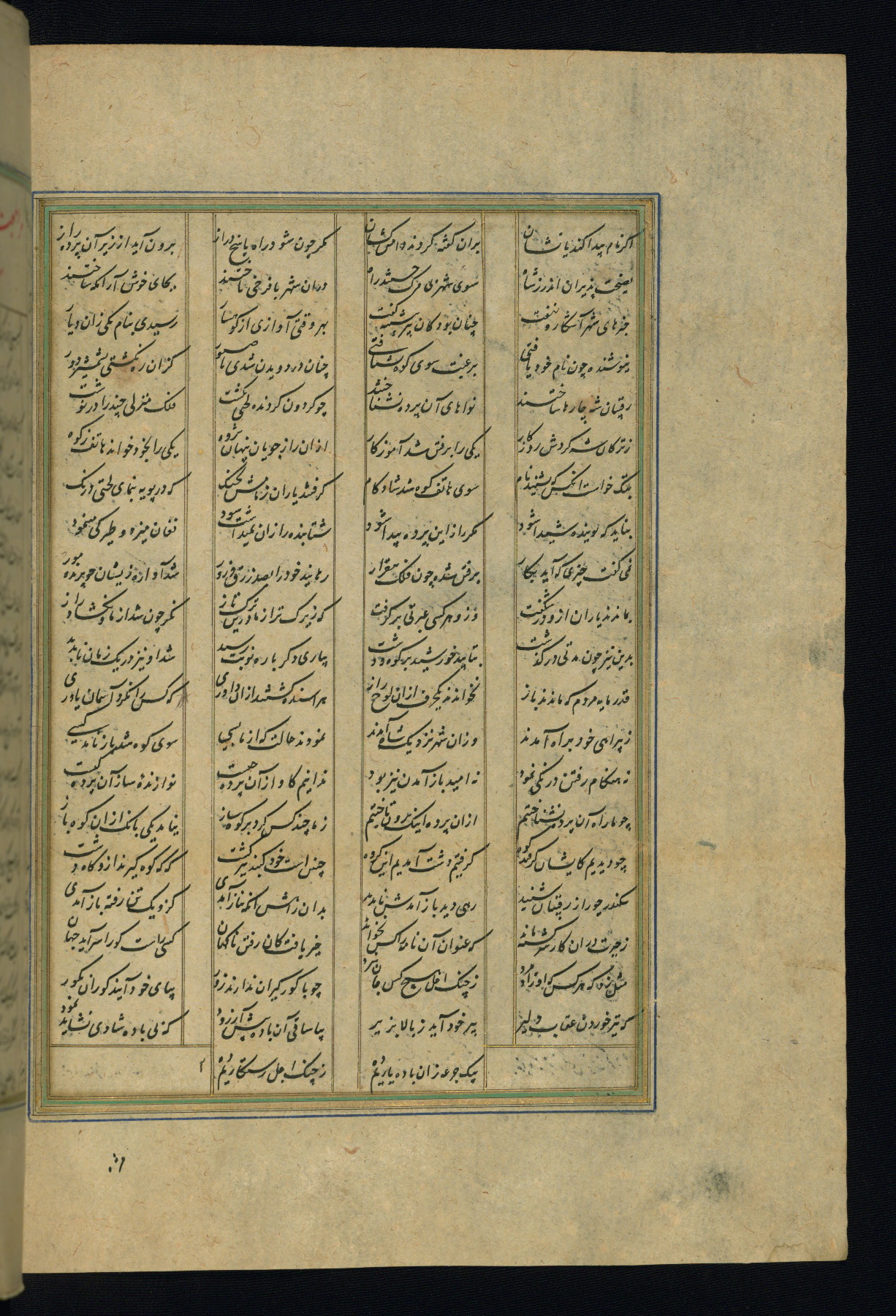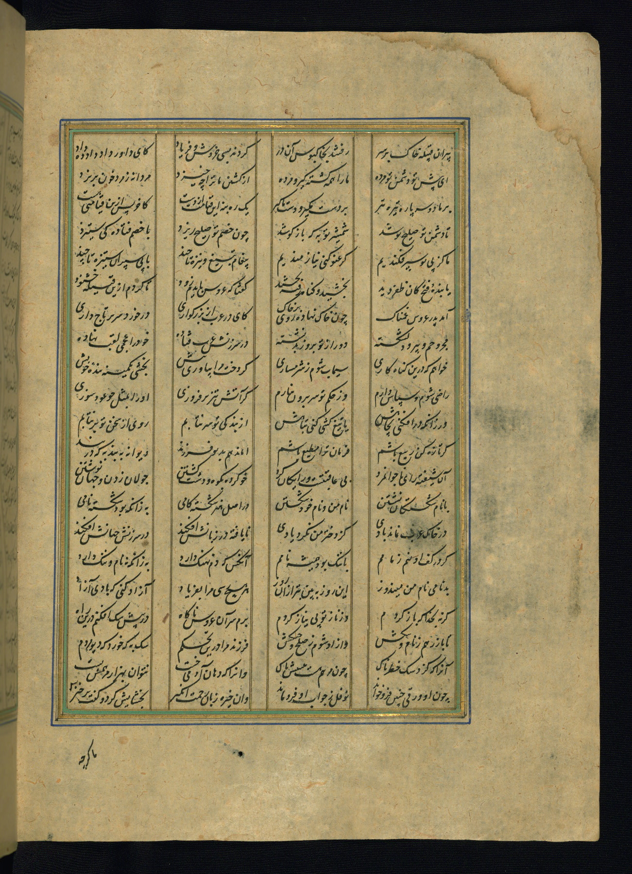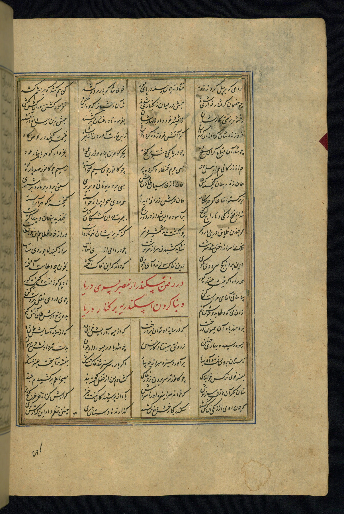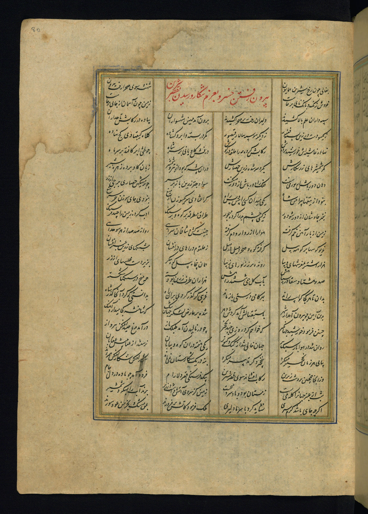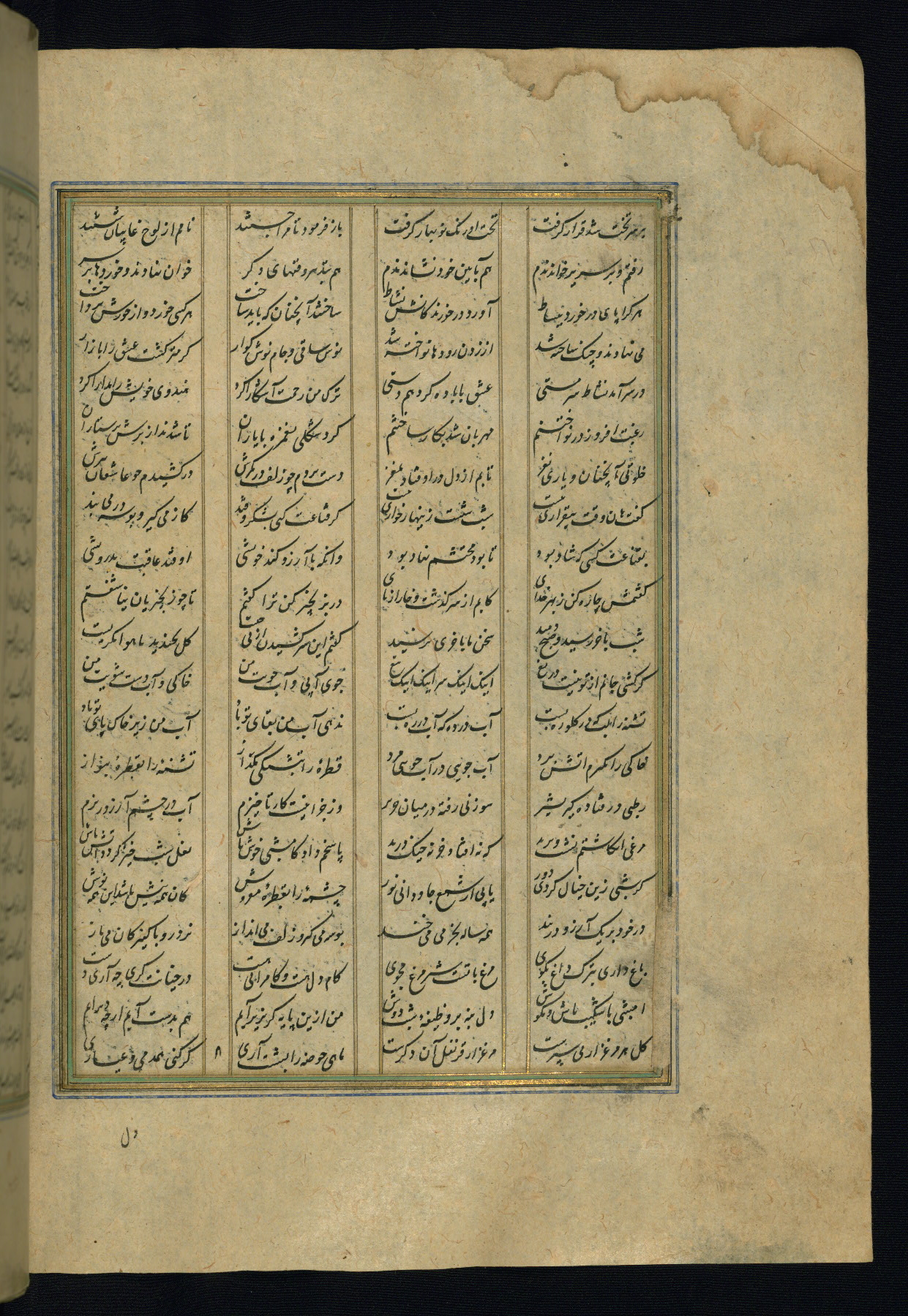 This is an illuminated and illustrated copy of the Khamsah (quintet) by Niẓāmī Ganjavī (d. 605 AH / 1209 CE), completed by Ḥabīb Allāh ibn ʿAlī ibn Ḥusām in Safavid Iran in Rabīʿ II 971 AH / 1563 CE. Illuminated titlepieces introduce the five poems, and there are thirty illustrations, the majority of which are attributable to thirteenth century AH / nineteenth CE Qajar Iran. Ownership notes and seals indicating the provenance of this manuscript are found throughout the codex (fols. 1a, 2a, 153a, 177a, 233a, 349a, and 351a). The binding is not original to the manuscript.
