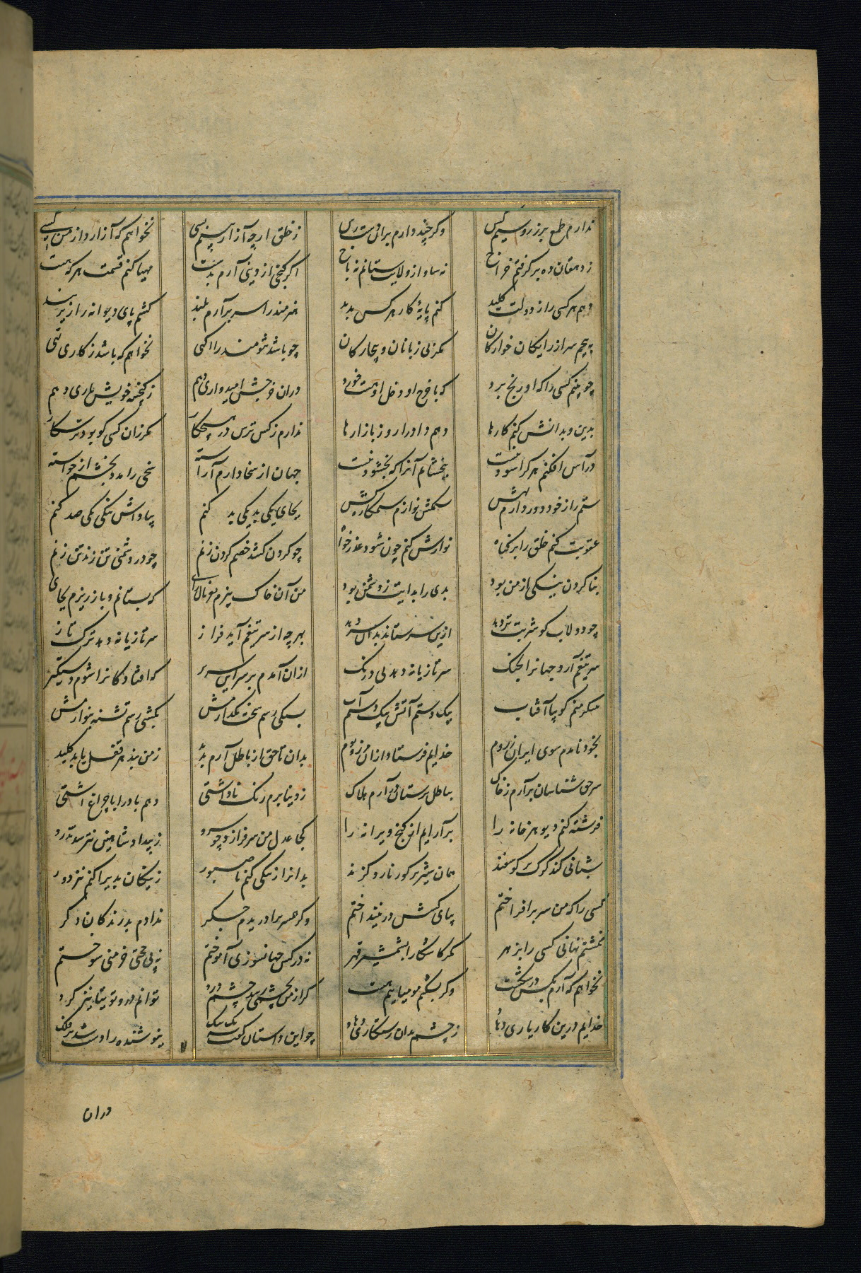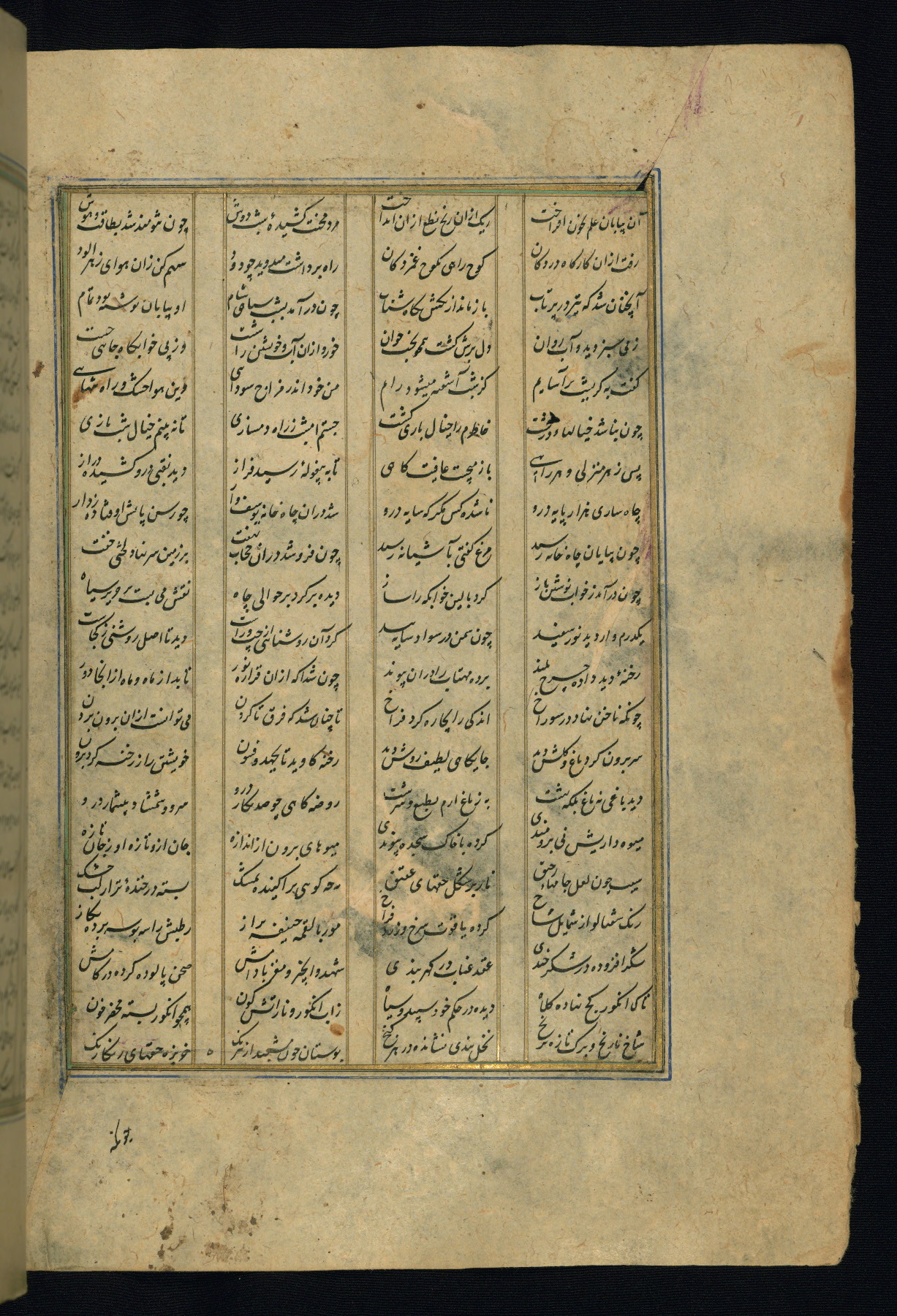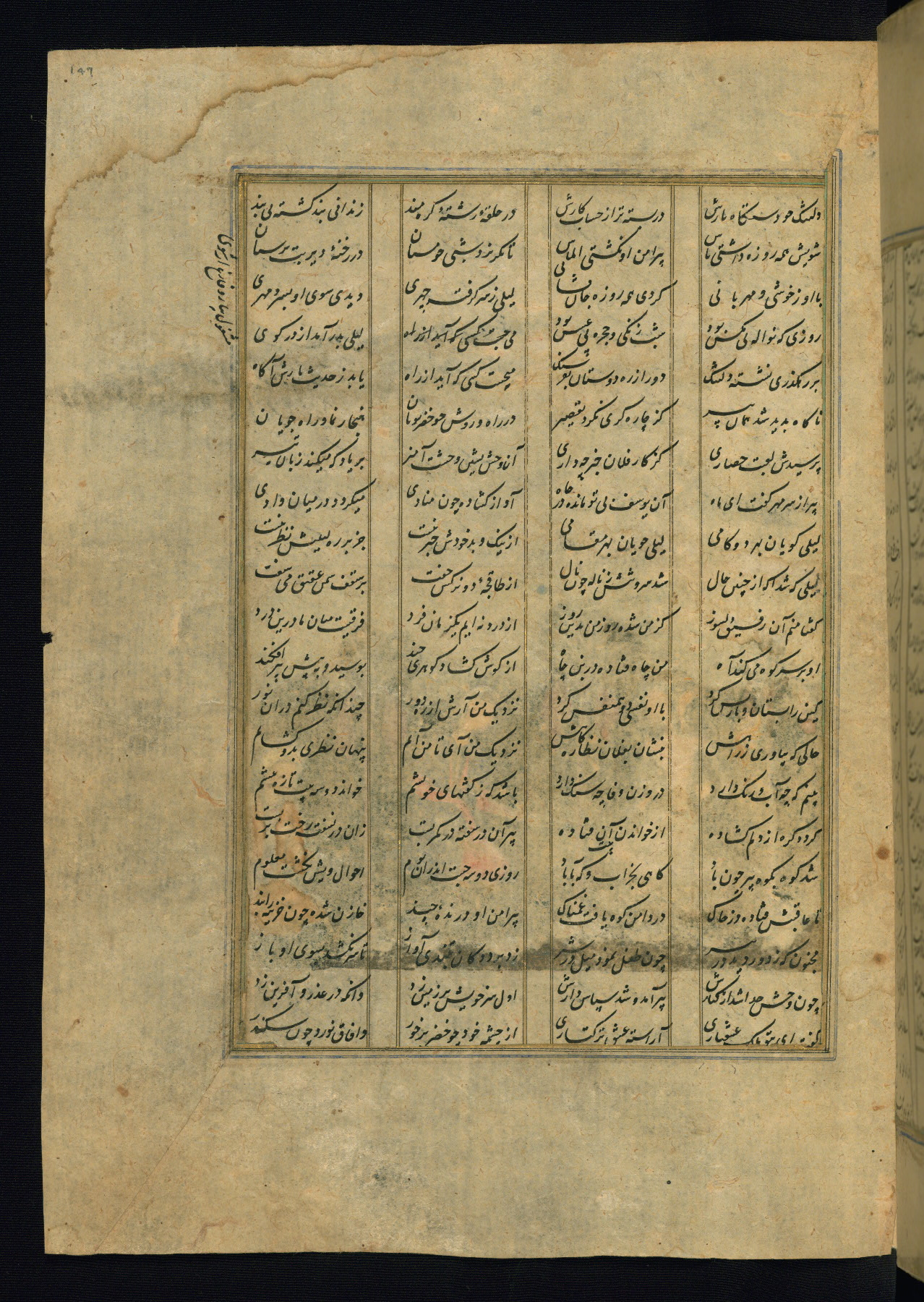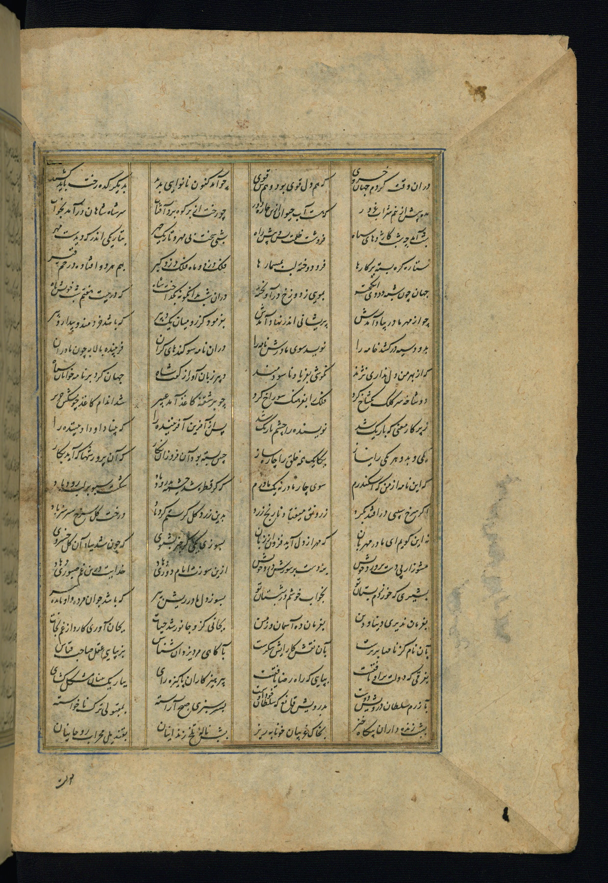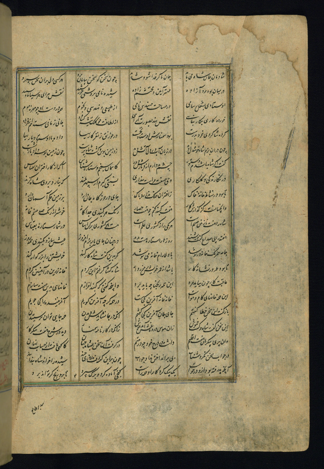 This is an illuminated and illustrated copy of the Khamsah (quintet) by Niẓāmī Ganjavī (d. 605 AH / 1209 CE), completed by Ḥabīb Allāh ibn ʿAlī ibn Ḥusām in Safavid Iran in Rabīʿ II 971 AH / 1563 CE. Illuminated titlepieces introduce the five poems, and there are thirty illustrations, the majority of which are attributable to thirteenth century AH / nineteenth CE Qajar Iran. Ownership notes and seals indicating the provenance of this manuscript are found throughout the codex (fols. 1a, 2a, 153a, 177a, 233a, 349a, and 351a). The binding is not original to the manuscript.