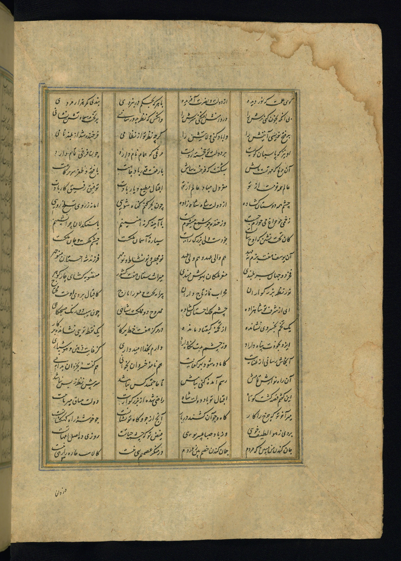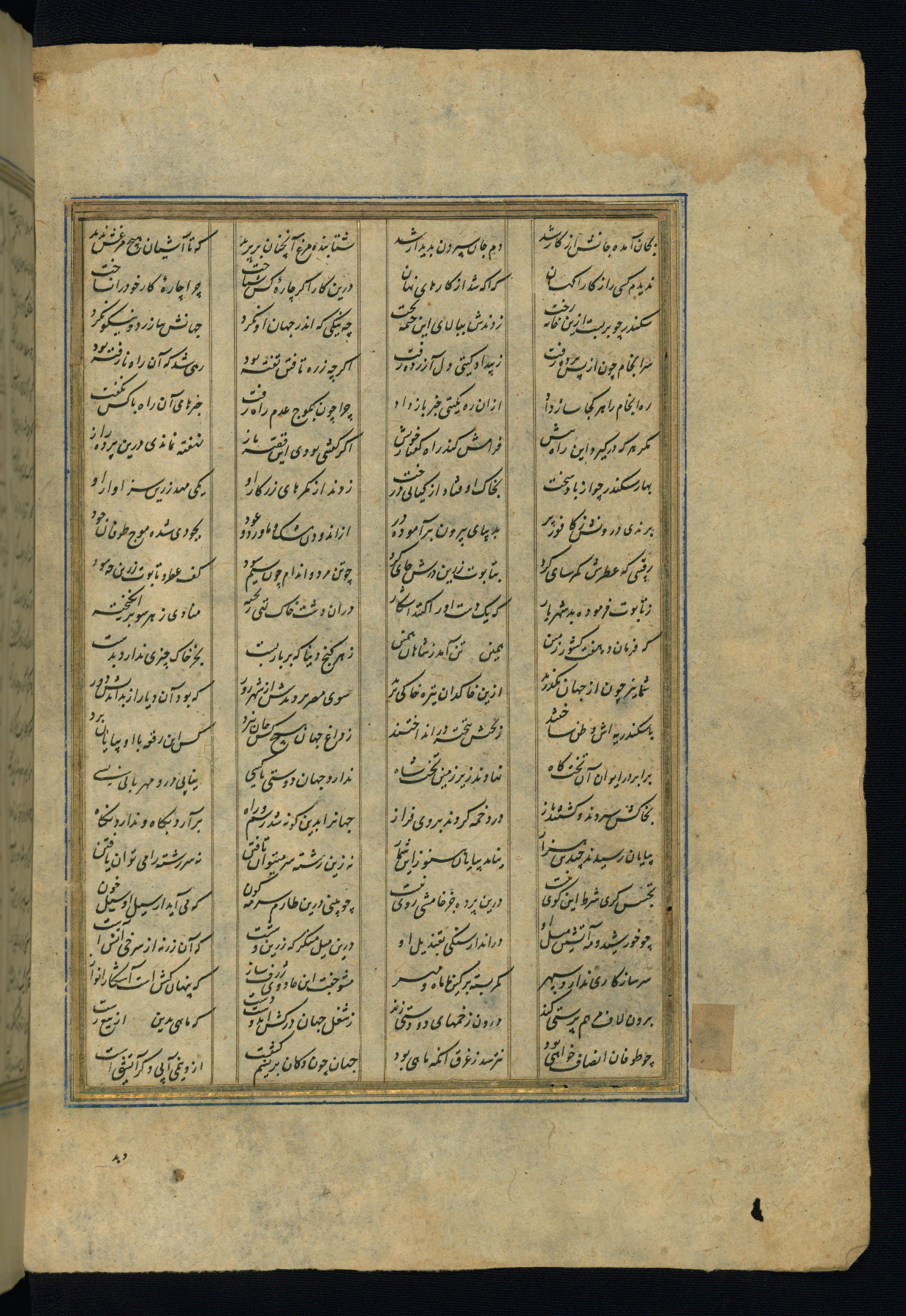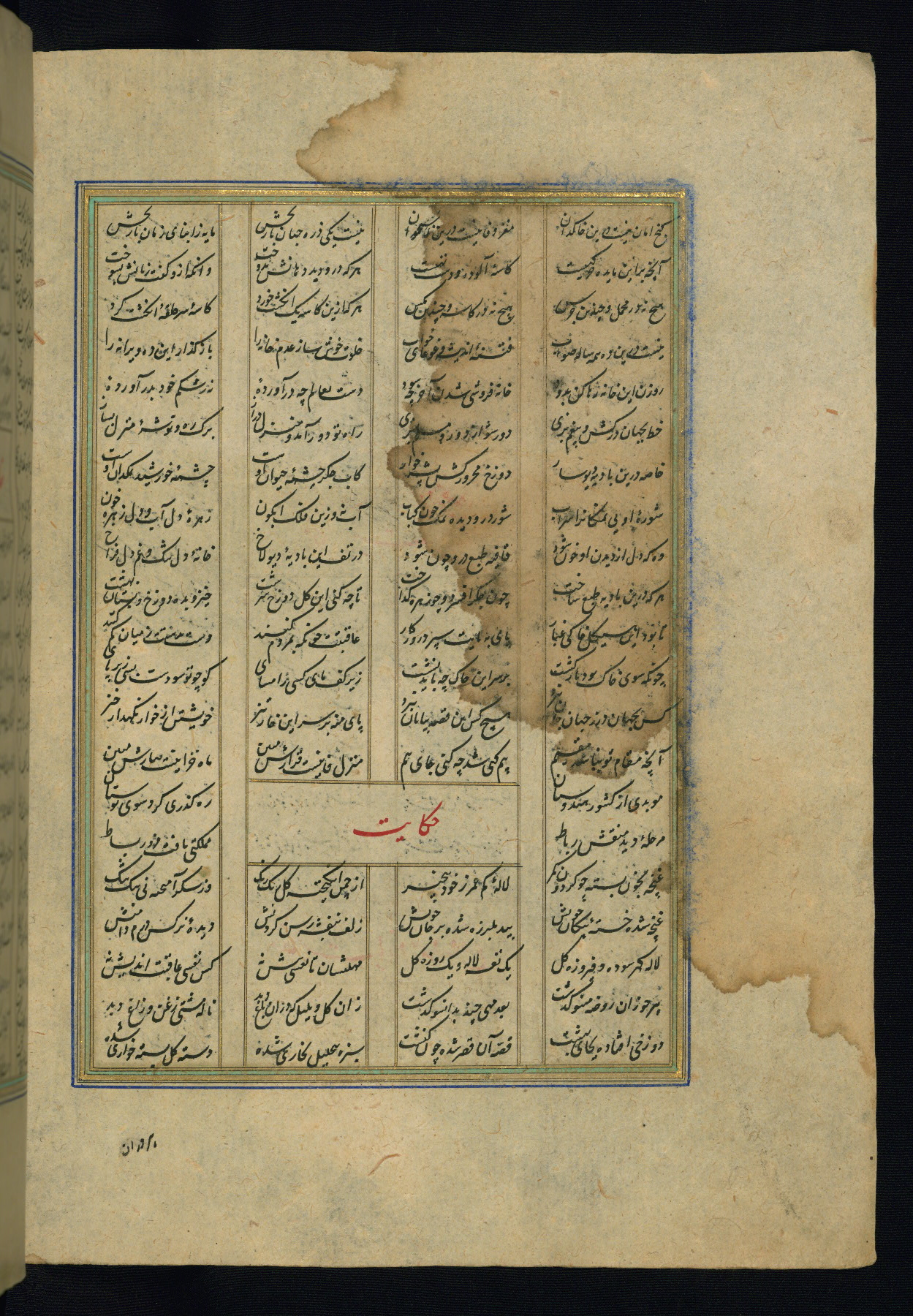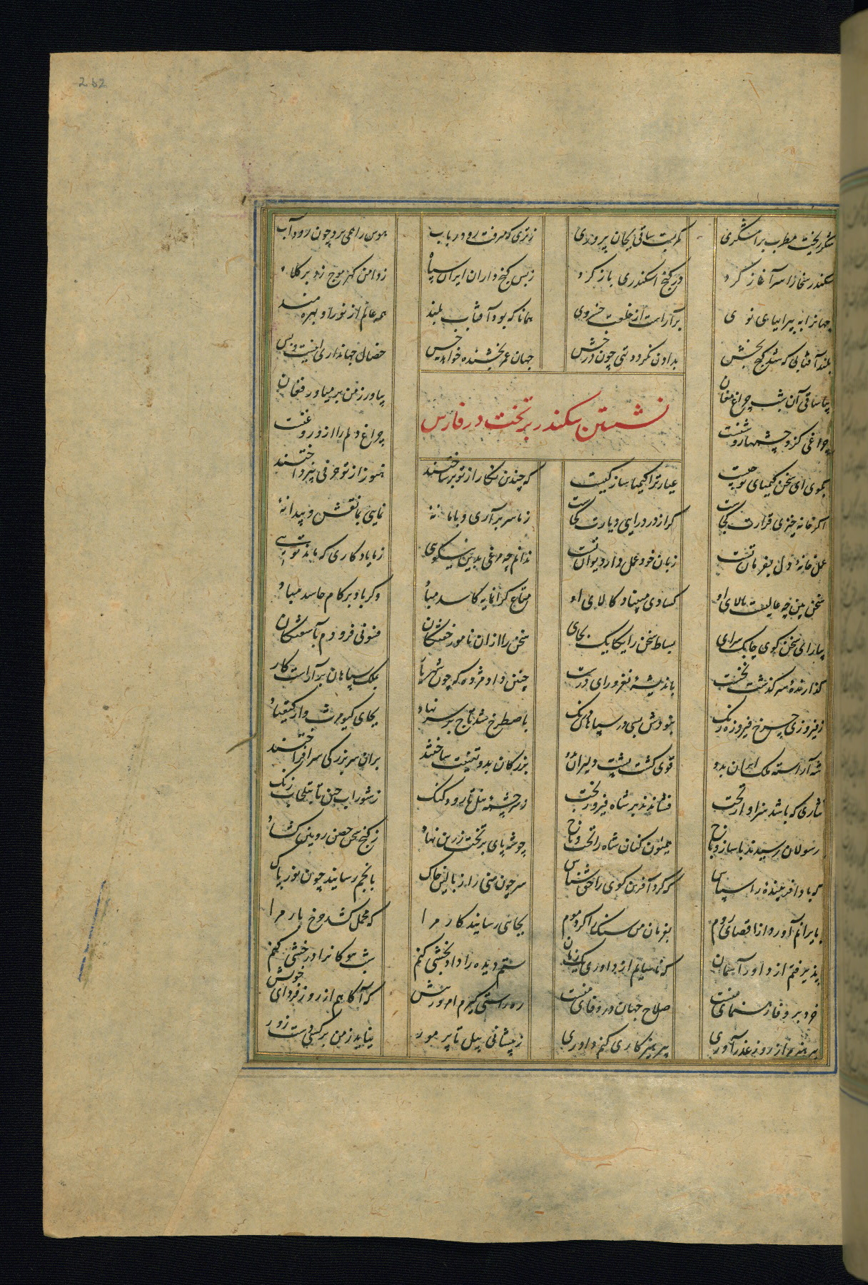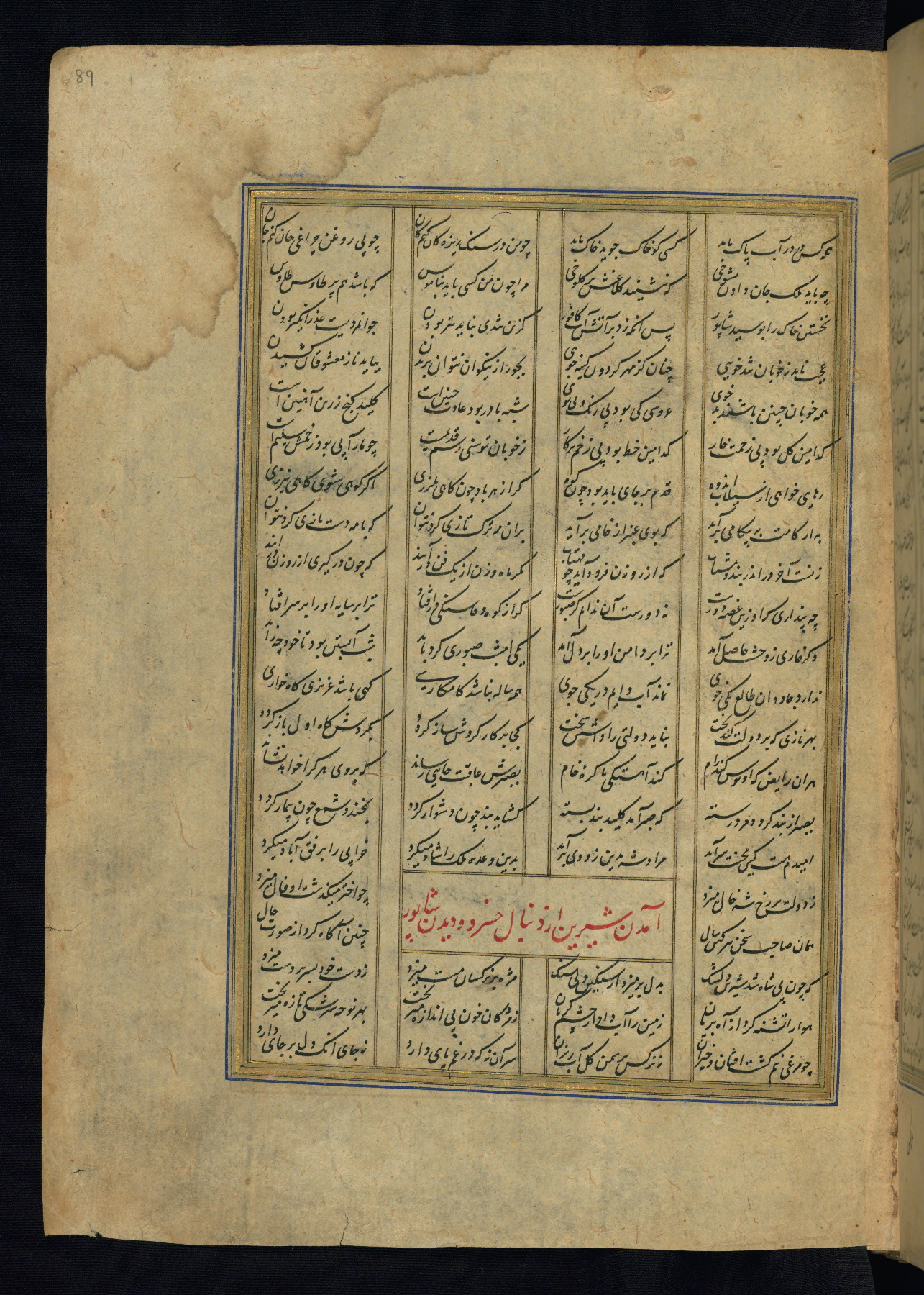 This is an illuminated and illustrated copy of the Khamsah (quintet) by Niẓāmī Ganjavī (d. 605 AH / 1209 CE), completed by Ḥabīb Allāh ibn ʿAlī ibn Ḥusām in Safavid Iran in Rabīʿ II 971 AH / 1563 CE. Illuminated titlepieces introduce the five poems, and there are thirty illustrations, the majority of which are attributable to thirteenth century AH / nineteenth CE Qajar Iran. Ownership notes and seals indicating the provenance of this manuscript are found throughout the codex (fols. 1a, 2a, 153a, 177a, 233a, 349a, and 351a). The binding is not original to the manuscript.