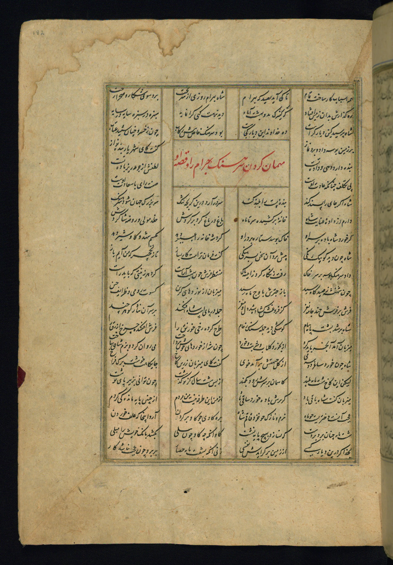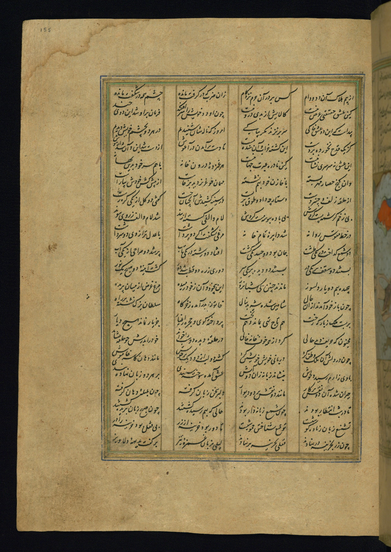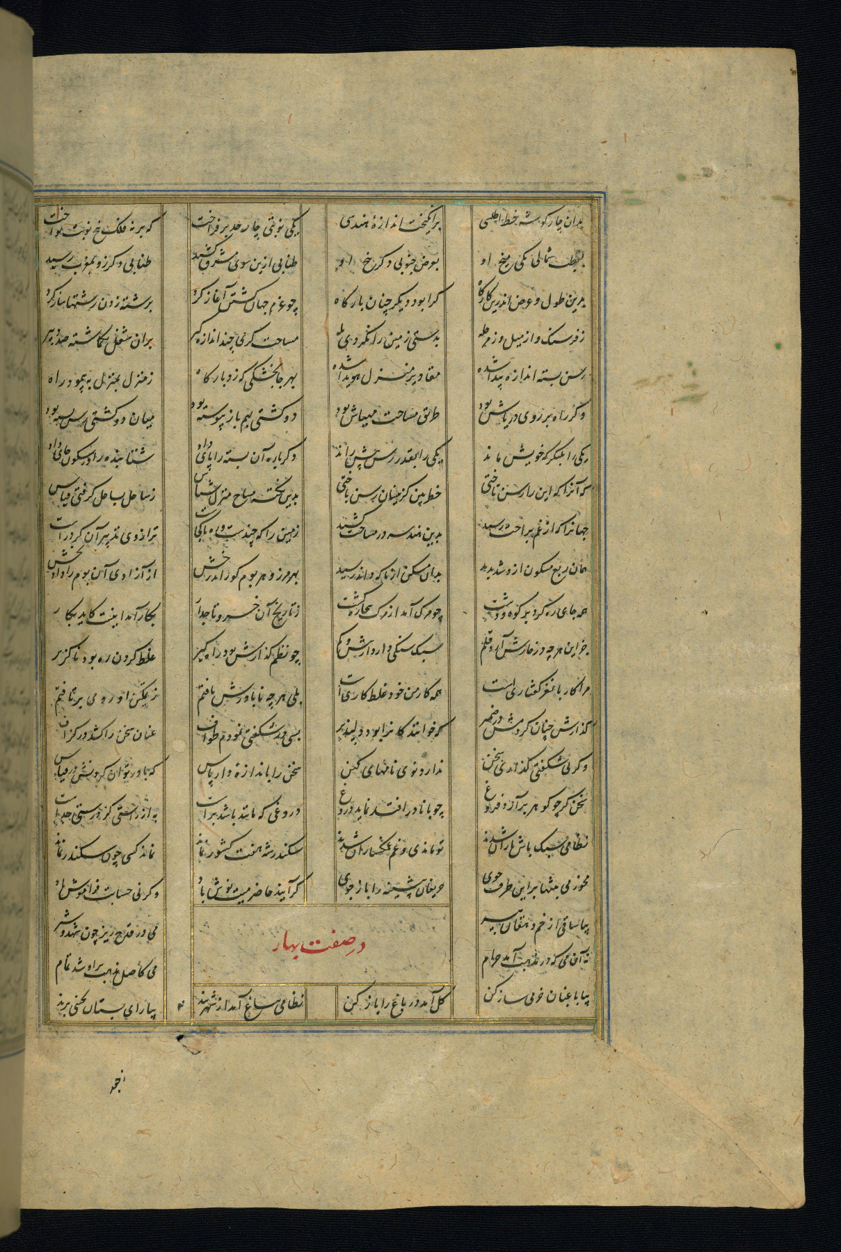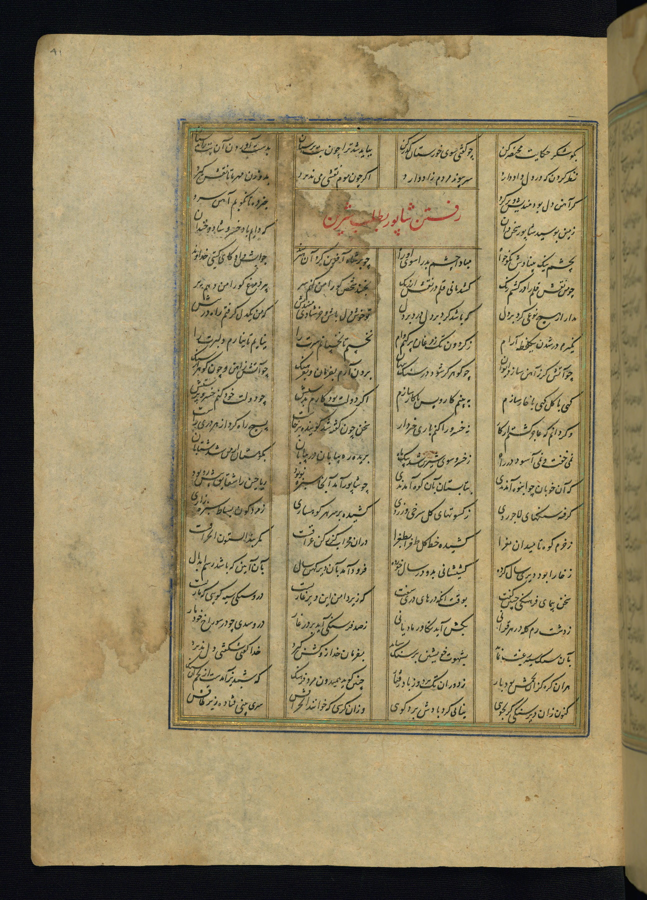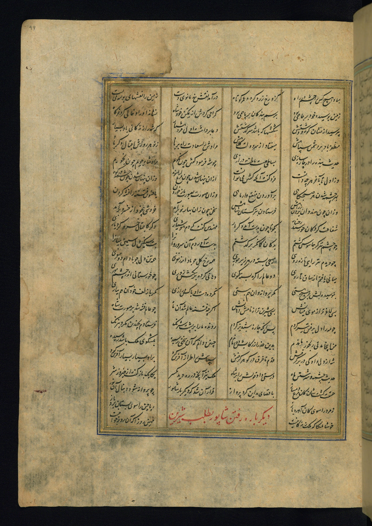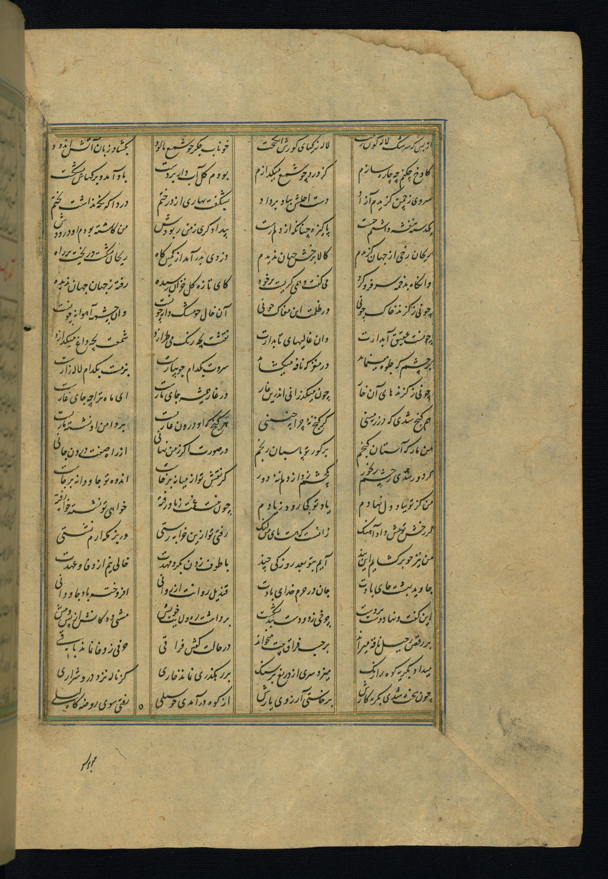 This is an illuminated and illustrated copy of the Khamsah (quintet) by Niẓāmī Ganjavī (d. 605 AH / 1209 CE), completed by Ḥabīb Allāh ibn ʿAlī ibn Ḥusām in Safavid Iran in Rabīʿ II 971 AH / 1563 CE. Illuminated titlepieces introduce the five poems, and there are thirty illustrations, the majority of which are attributable to thirteenth century AH / nineteenth CE Qajar Iran. Ownership notes and seals indicating the provenance of this manuscript are found throughout the codex (fols. 1a, 2a, 153a, 177a, 233a, 349a, and 351a). The binding is not original to the manuscript.