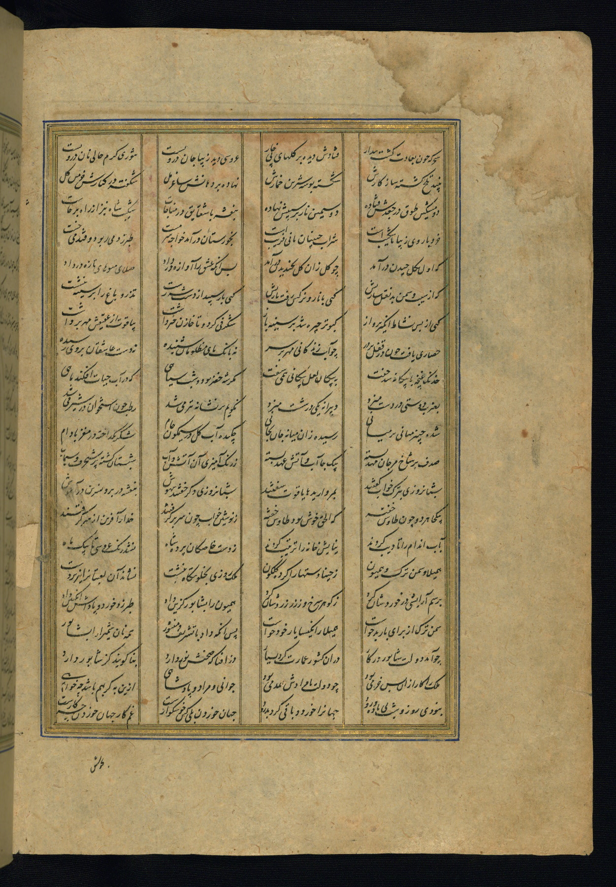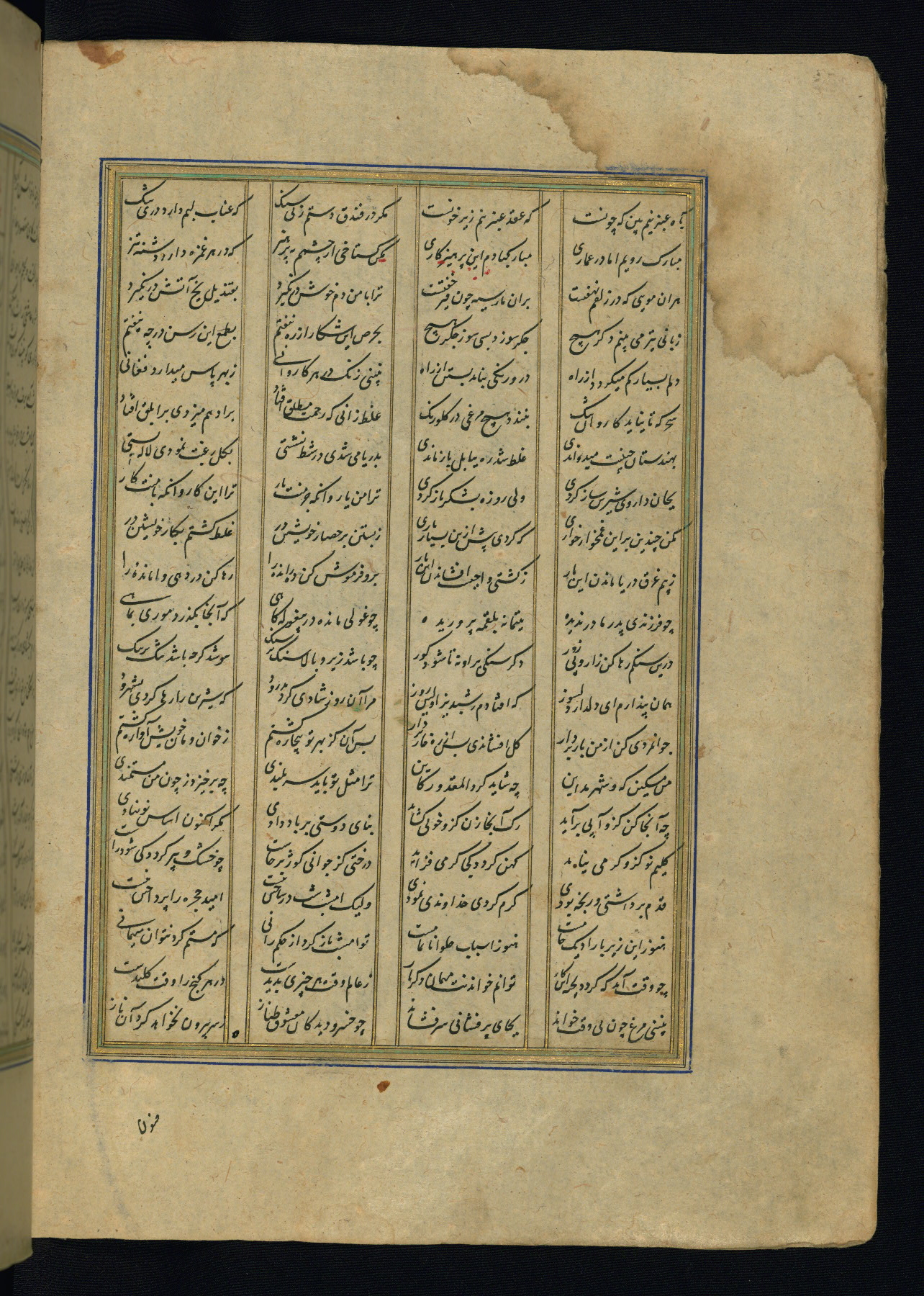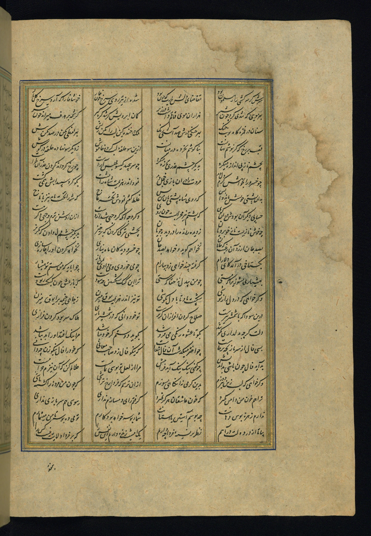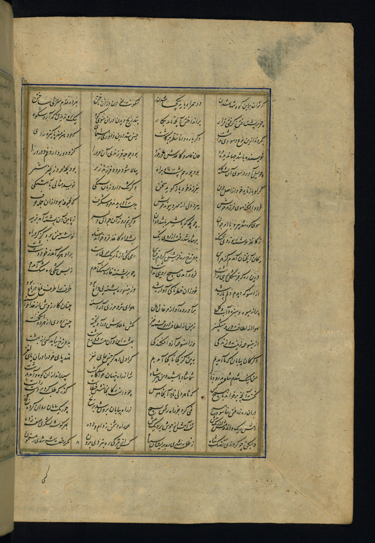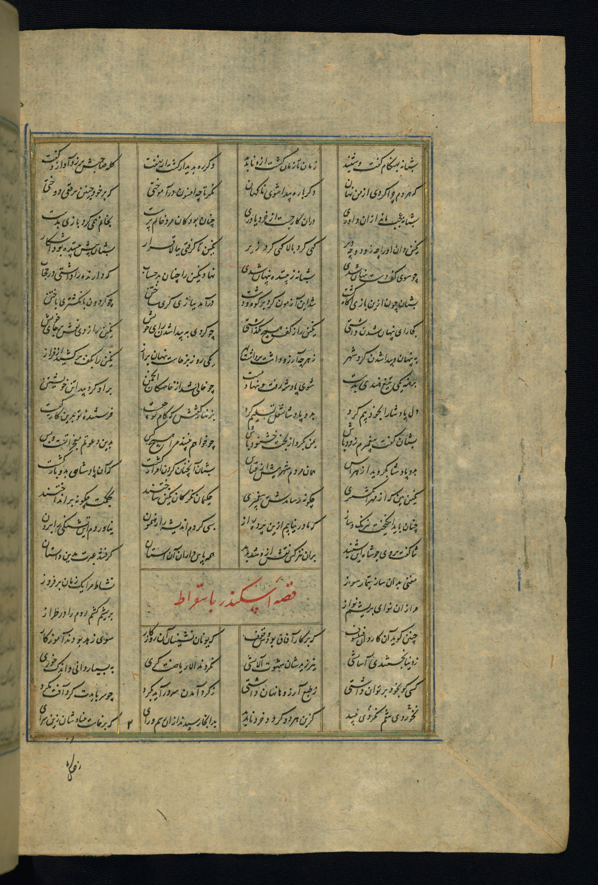 This is an illuminated and illustrated copy of the Khamsah (quintet) by Niẓāmī Ganjavī (d. 605 AH / 1209 CE), completed by Ḥabīb Allāh ibn ʿAlī ibn Ḥusām in Safavid Iran in Rabīʿ II 971 AH / 1563 CE. Illuminated titlepieces introduce the five poems, and there are thirty illustrations, the majority of which are attributable to thirteenth century AH / nineteenth CE Qajar Iran. Ownership notes and seals indicating the provenance of this manuscript are found throughout the codex (fols. 1a, 2a, 153a, 177a, 233a, 349a, and 351a). The binding is not original to the manuscript.