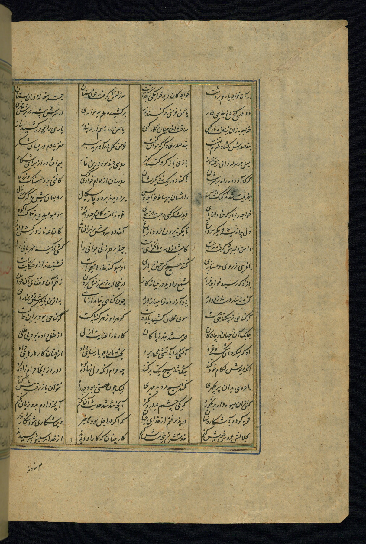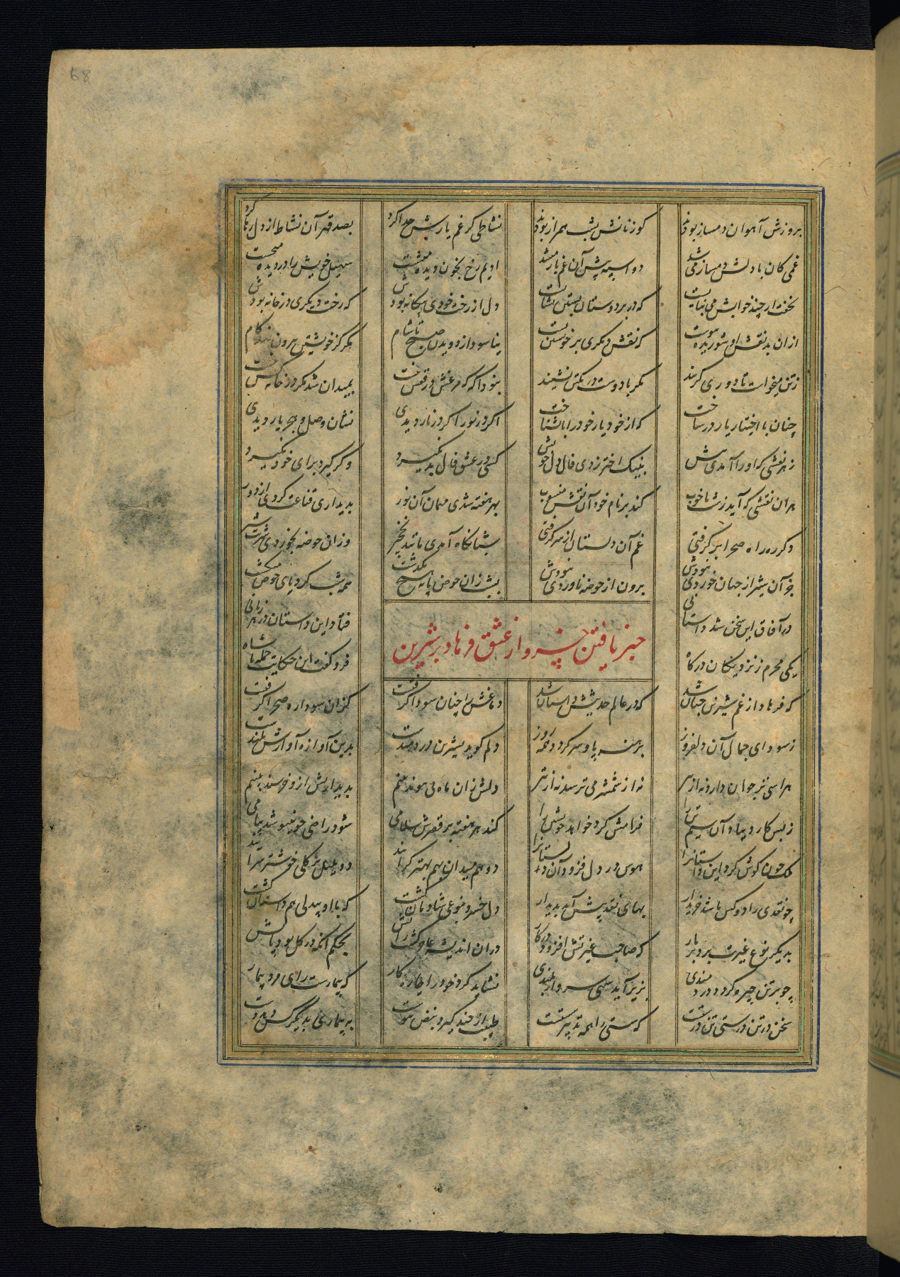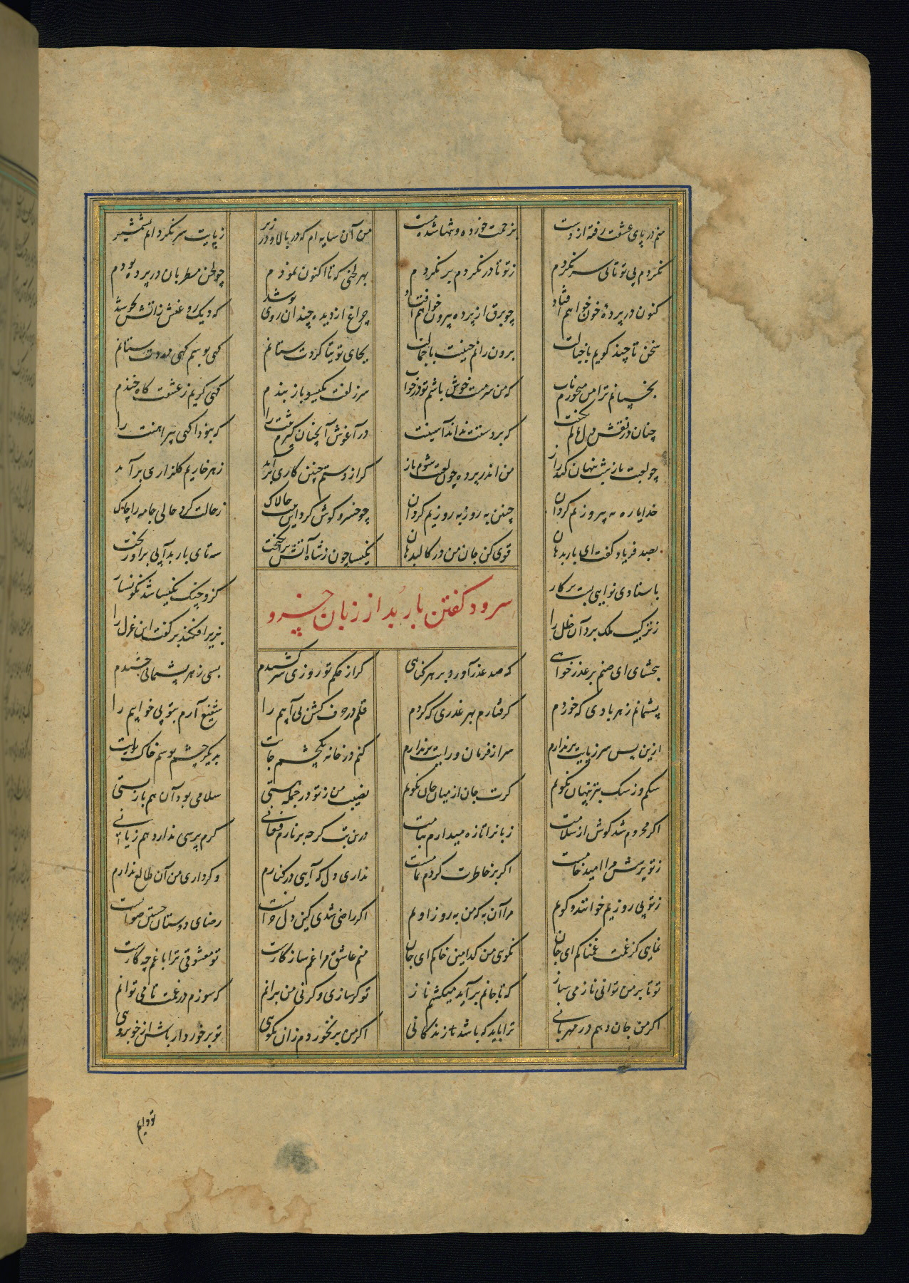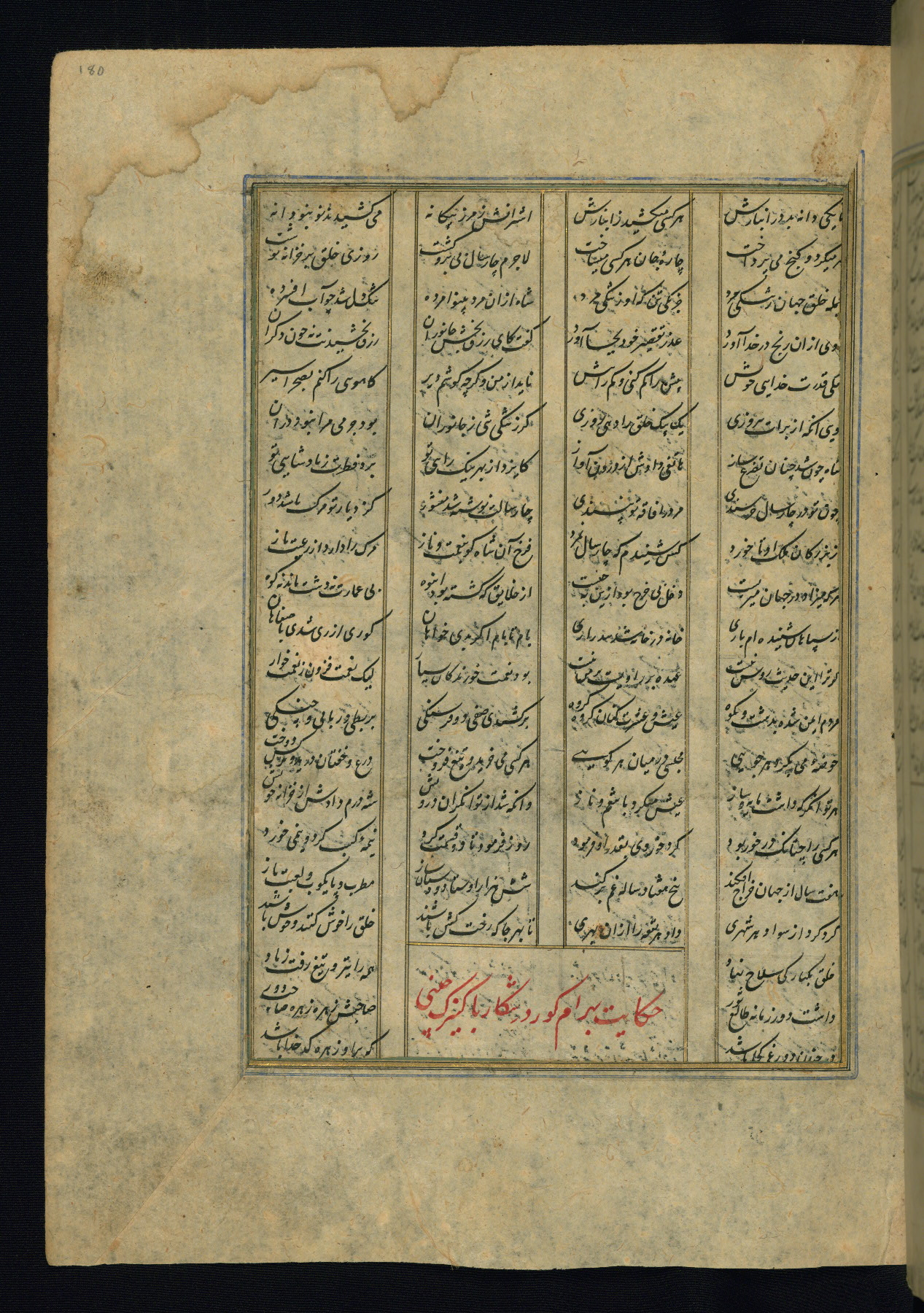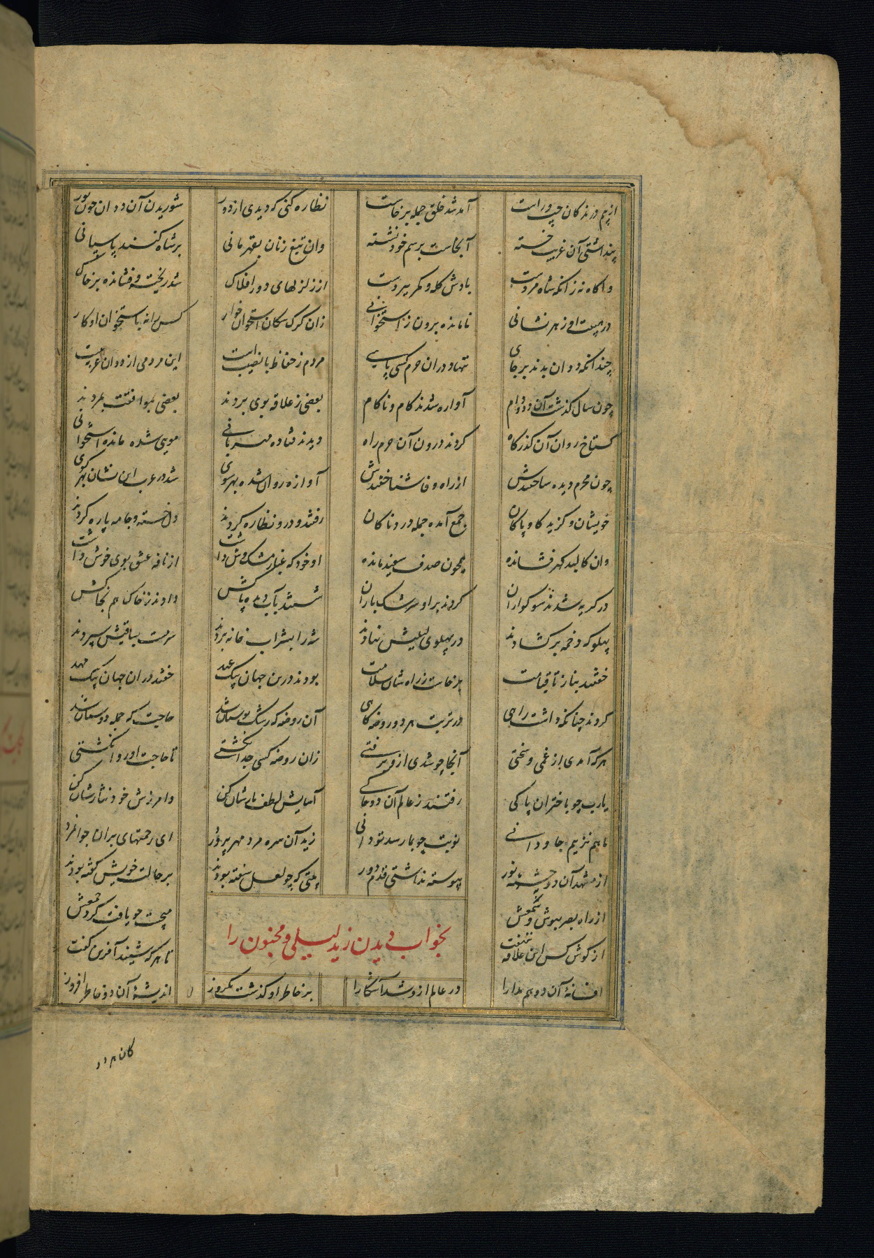 This is an illuminated and illustrated copy of the Khamsah (quintet) by Niẓāmī Ganjavī (d. 605 AH / 1209 CE), completed by Ḥabīb Allāh ibn ʿAlī ibn Ḥusām in Safavid Iran in Rabīʿ II 971 AH / 1563 CE. Illuminated titlepieces introduce the five poems, and there are thirty illustrations, the majority of which are attributable to thirteenth century AH / nineteenth CE Qajar Iran. Ownership notes and seals indicating the provenance of this manuscript are found throughout the codex (fols. 1a, 2a, 153a, 177a, 233a, 349a, and 351a). The binding is not original to the manuscript.