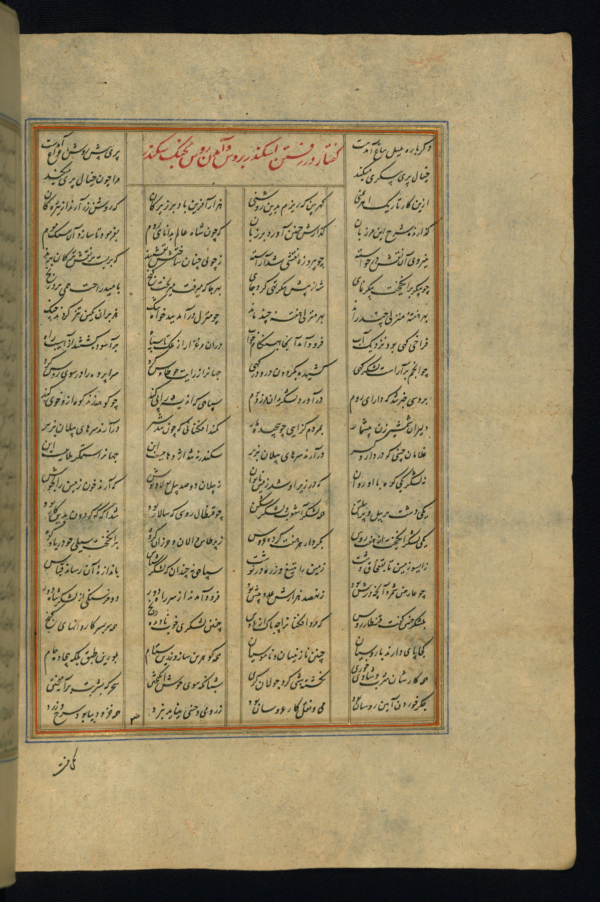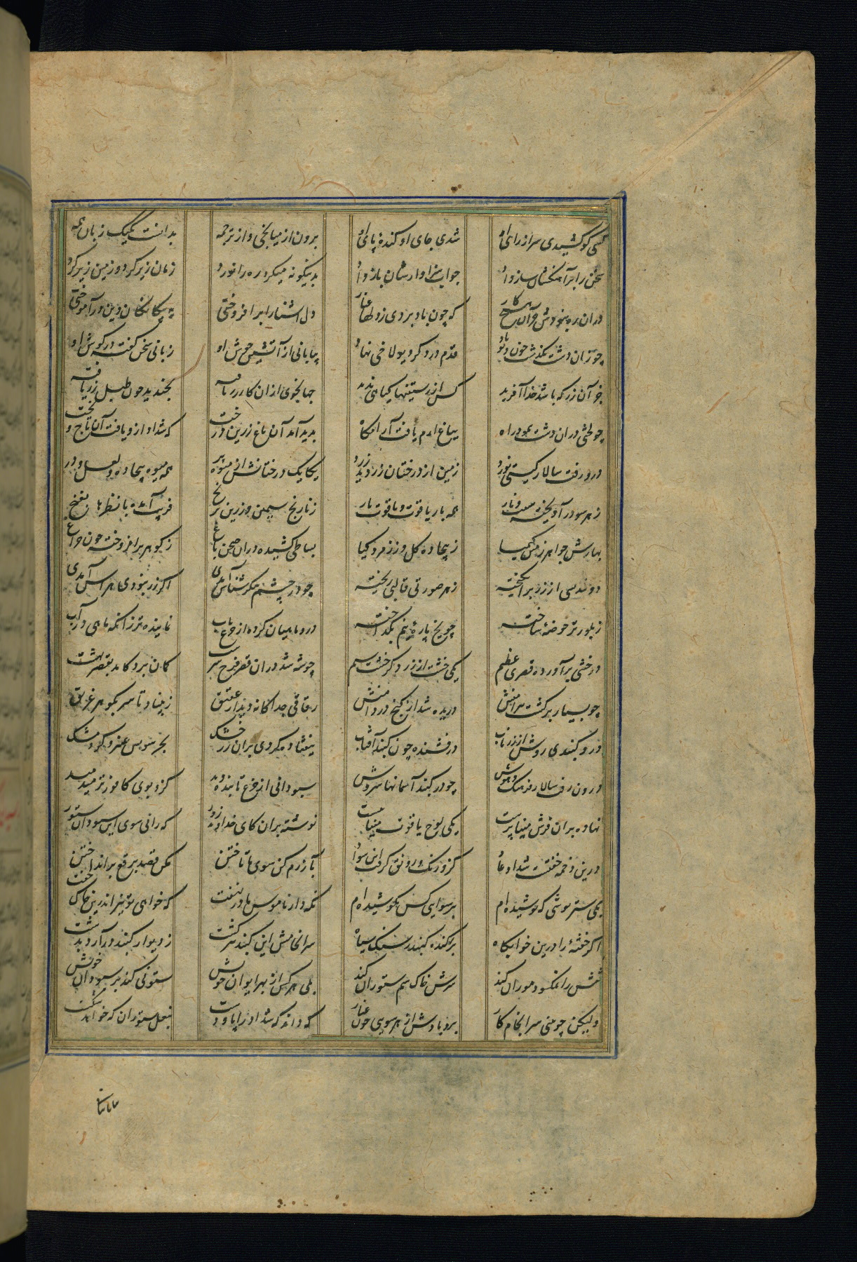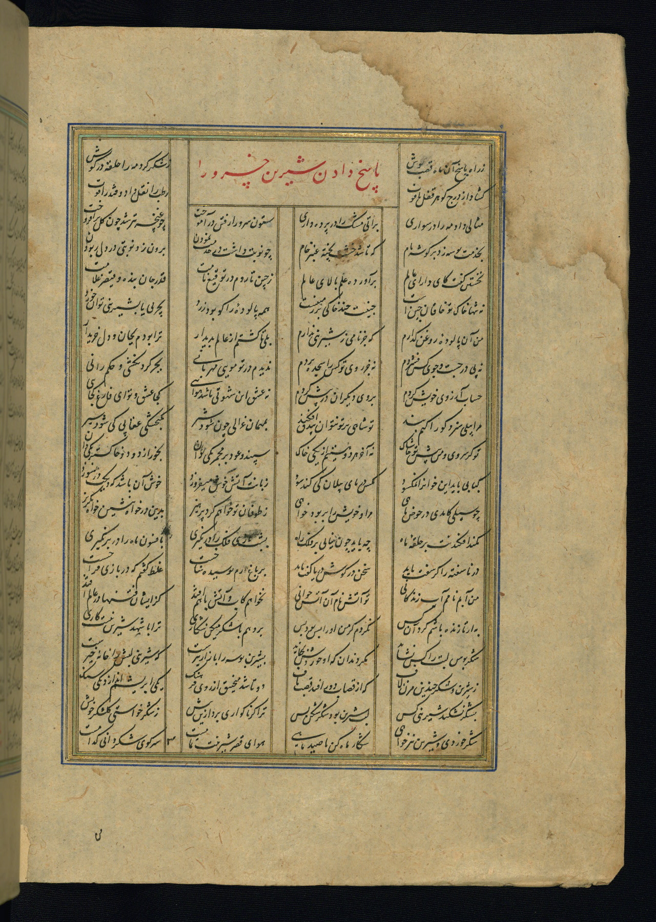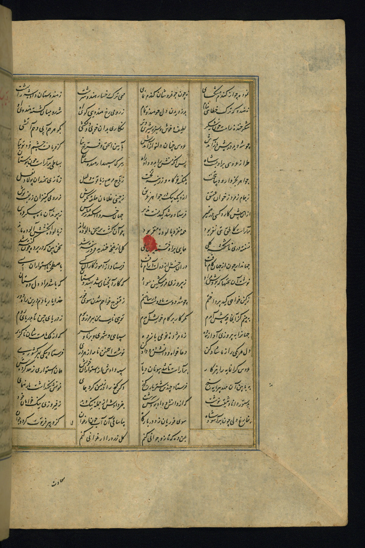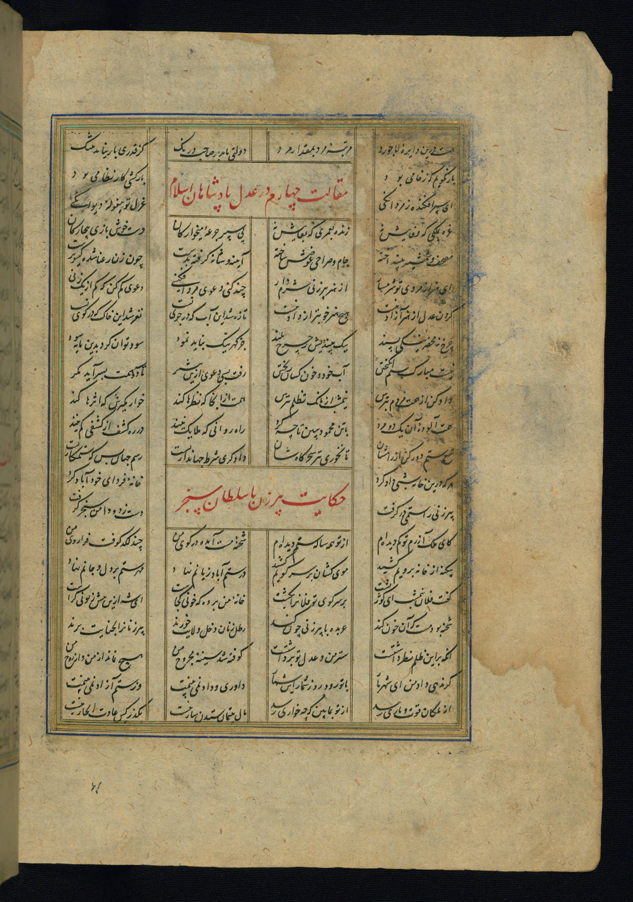 This is an illuminated and illustrated copy of the Khamsah (quintet) by Niẓāmī Ganjavī (d. 605 AH / 1209 CE), completed by Ḥabīb Allāh ibn ʿAlī ibn Ḥusām in Safavid Iran in Rabīʿ II 971 AH / 1563 CE. Illuminated titlepieces introduce the five poems, and there are thirty illustrations, the majority of which are attributable to thirteenth century AH / nineteenth CE Qajar Iran. Ownership notes and seals indicating the provenance of this manuscript are found throughout the codex (fols. 1a, 2a, 153a, 177a, 233a, 349a, and 351a). The binding is not original to the manuscript.