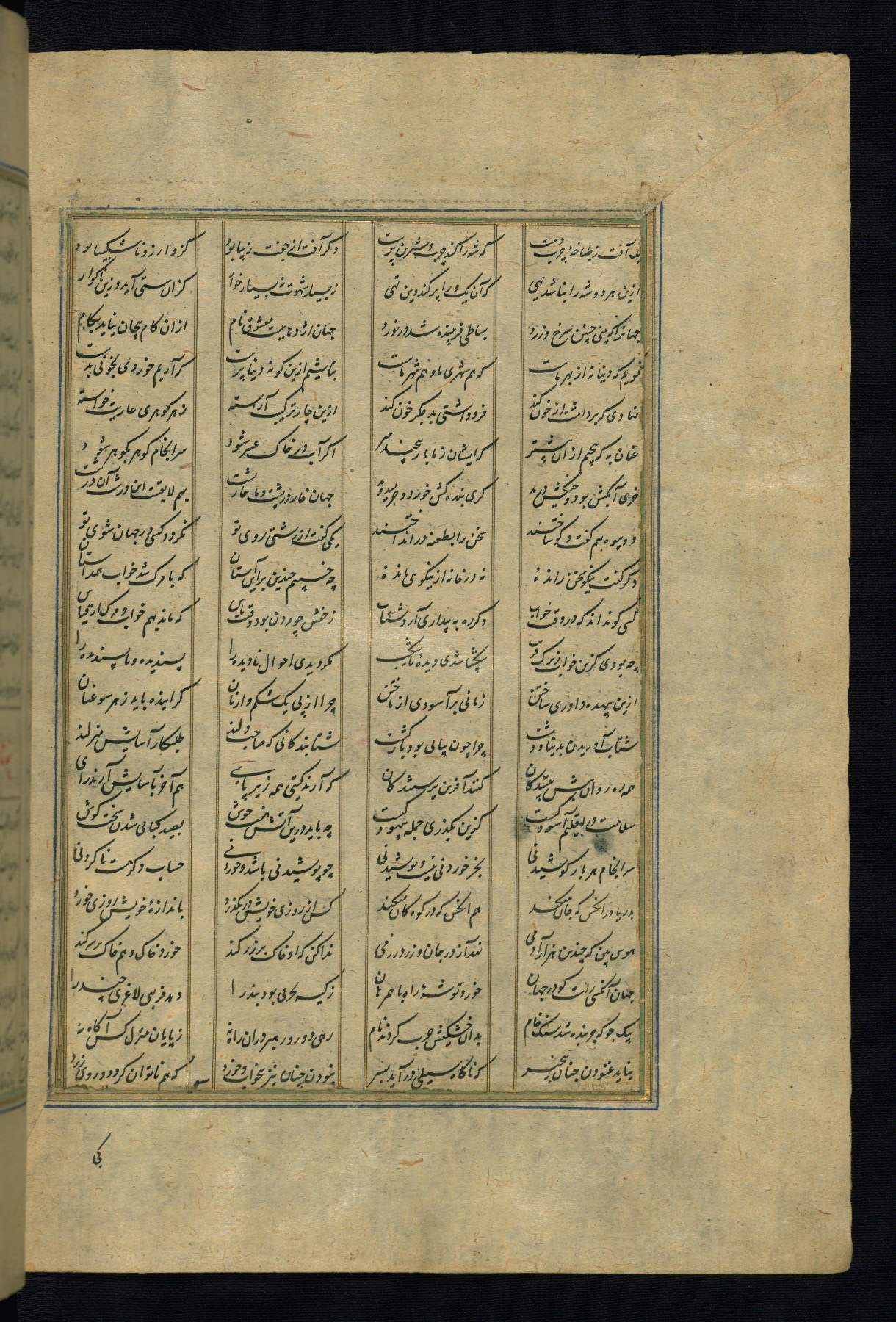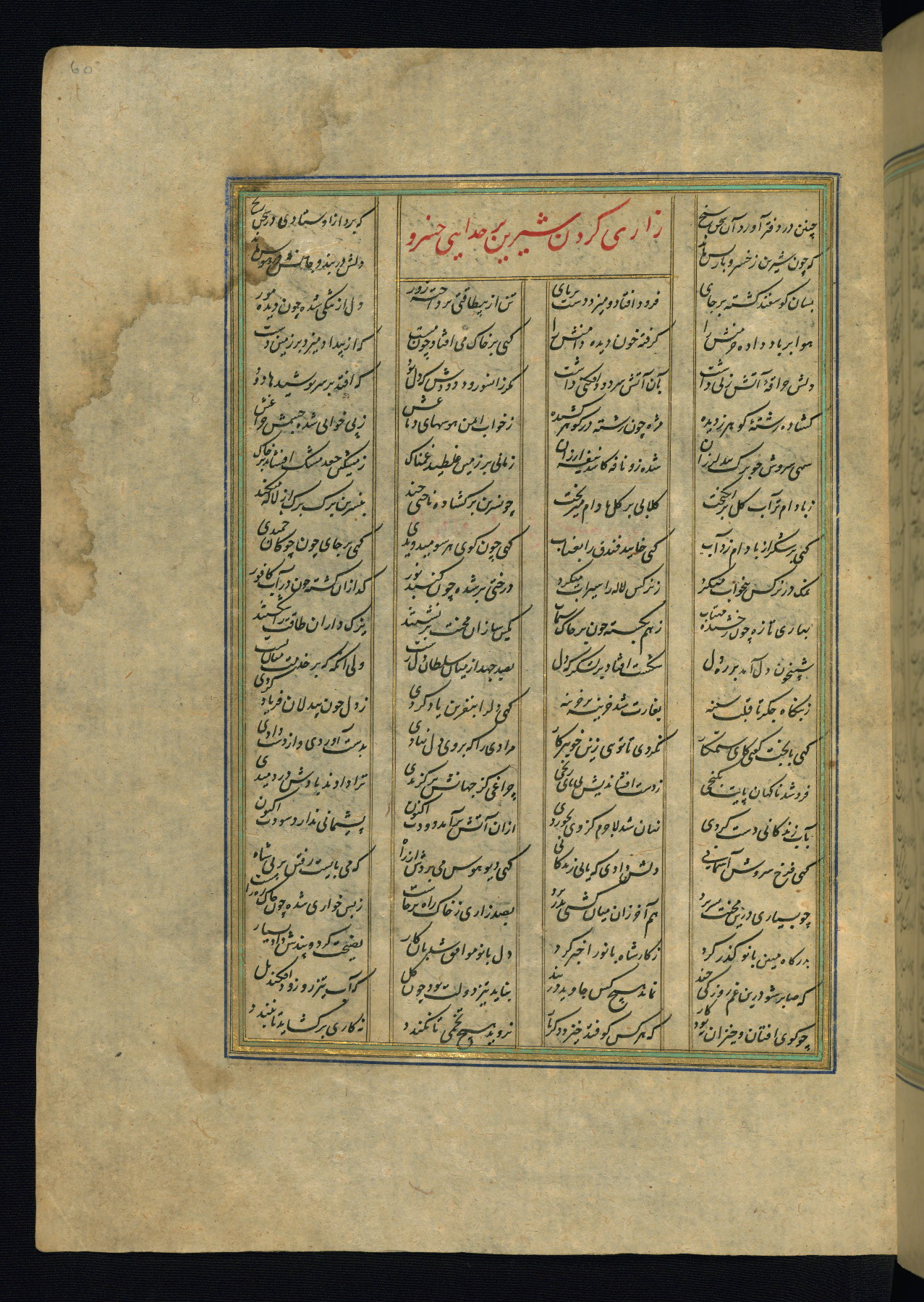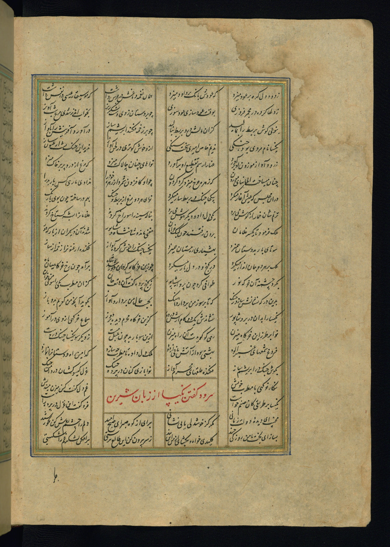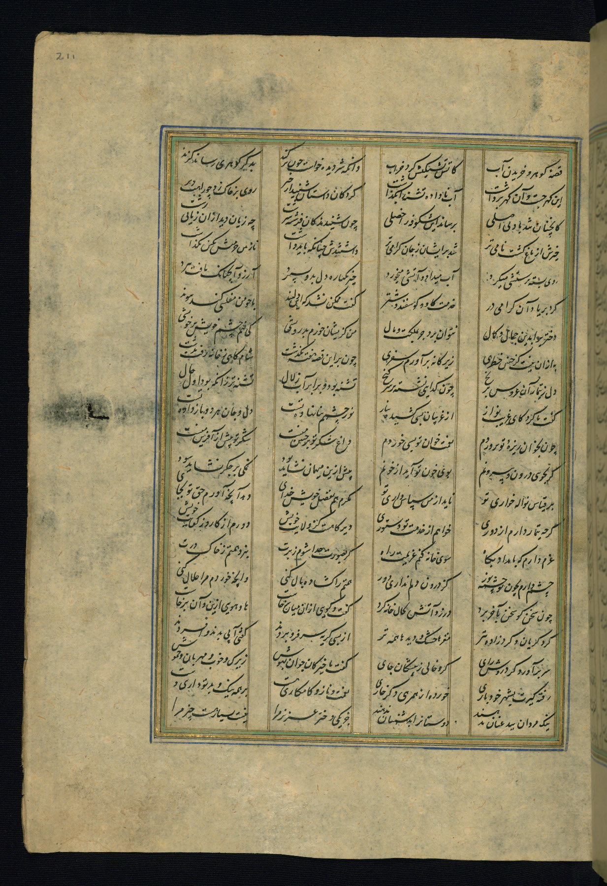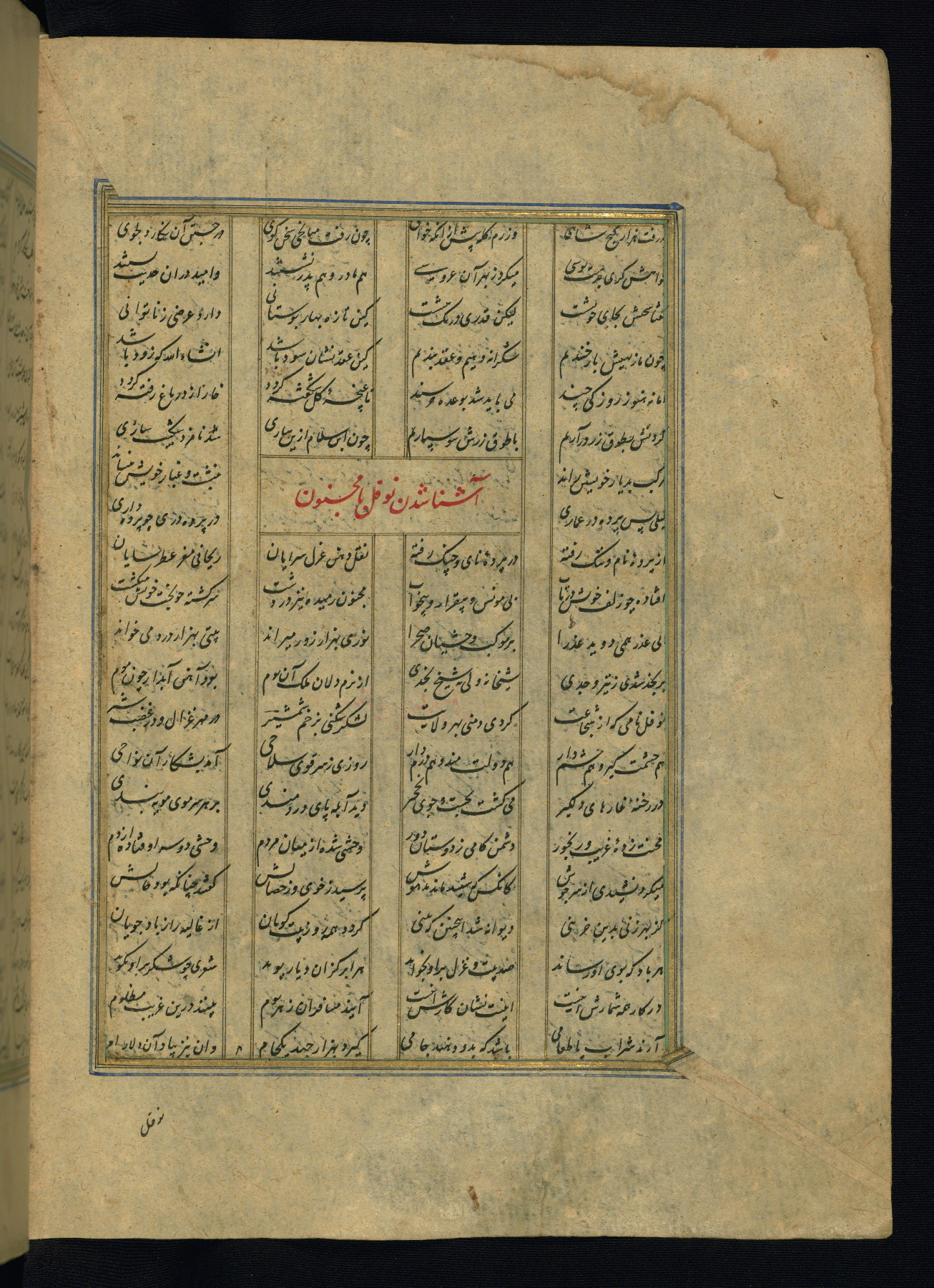 This is an illuminated and illustrated copy of the Khamsah (quintet) by Niẓāmī Ganjavī (d. 605 AH / 1209 CE), completed by Ḥabīb Allāh ibn ʿAlī ibn Ḥusām in Safavid Iran in Rabīʿ II 971 AH / 1563 CE. Illuminated titlepieces introduce the five poems, and there are thirty illustrations, the majority of which are attributable to thirteenth century AH / nineteenth CE Qajar Iran. Ownership notes and seals indicating the provenance of this manuscript are found throughout the codex (fols. 1a, 2a, 153a, 177a, 233a, 349a, and 351a). The binding is not original to the manuscript.