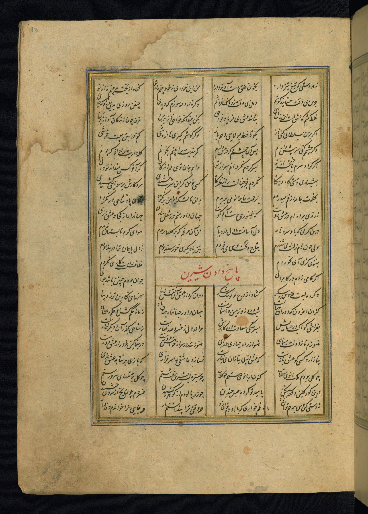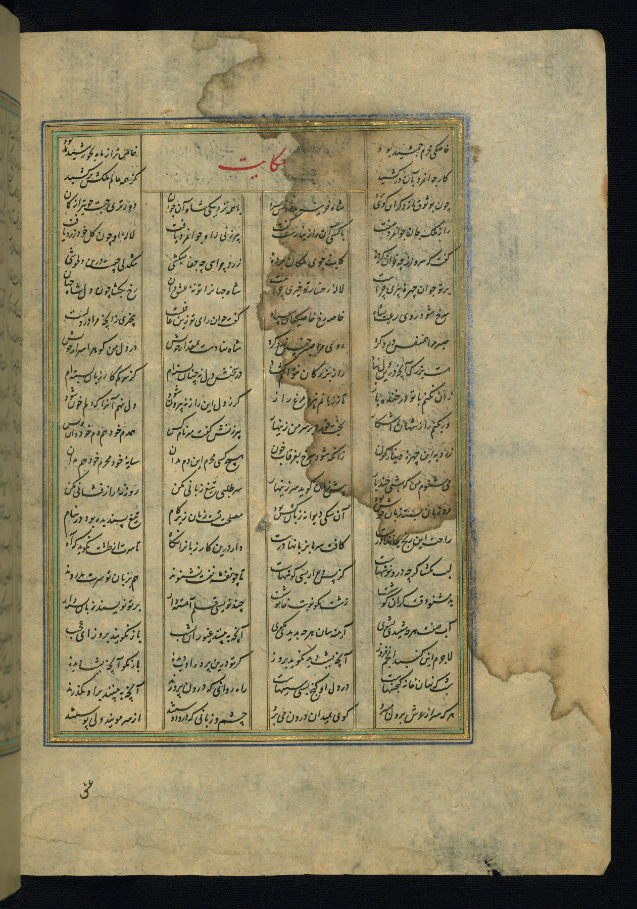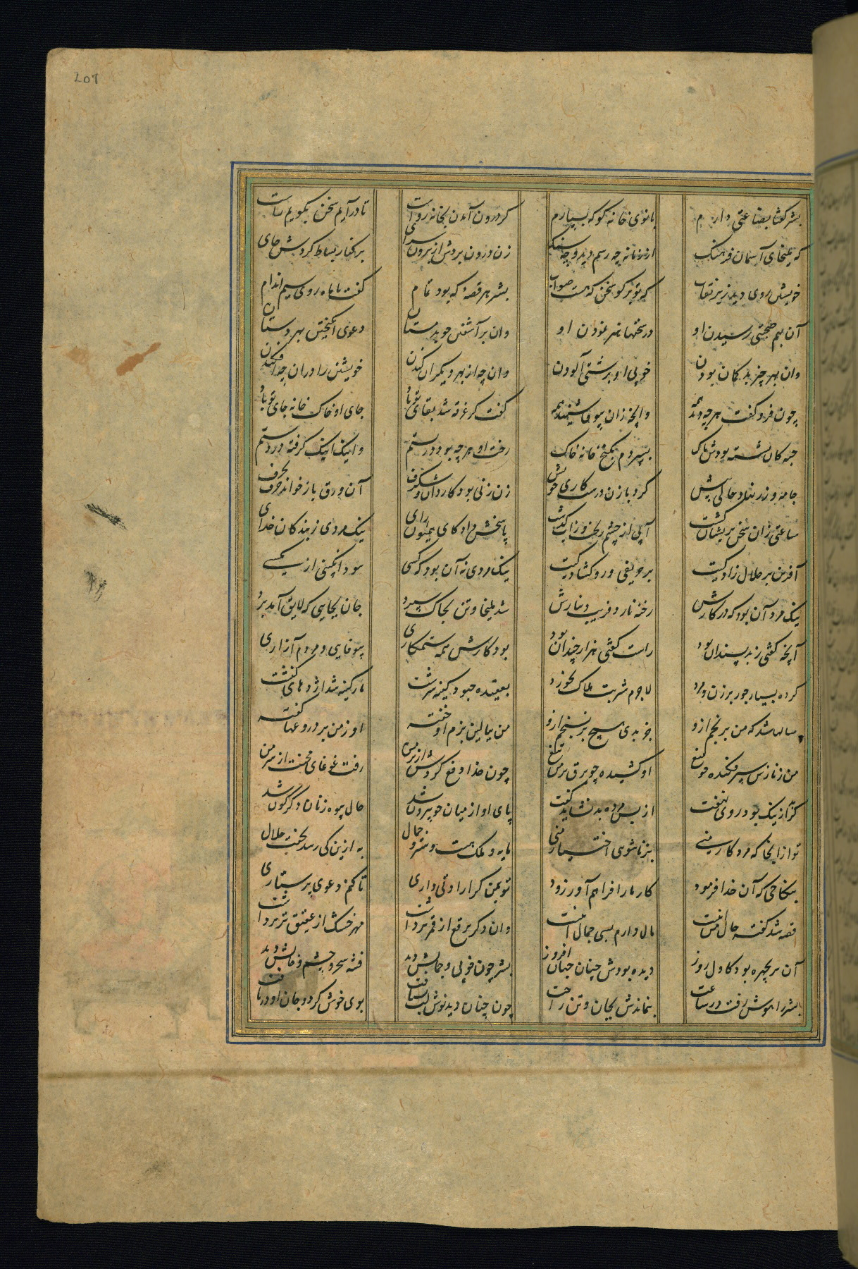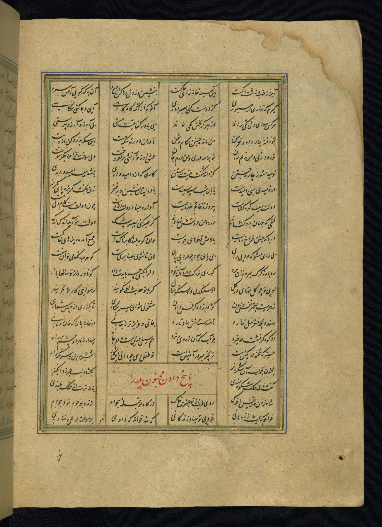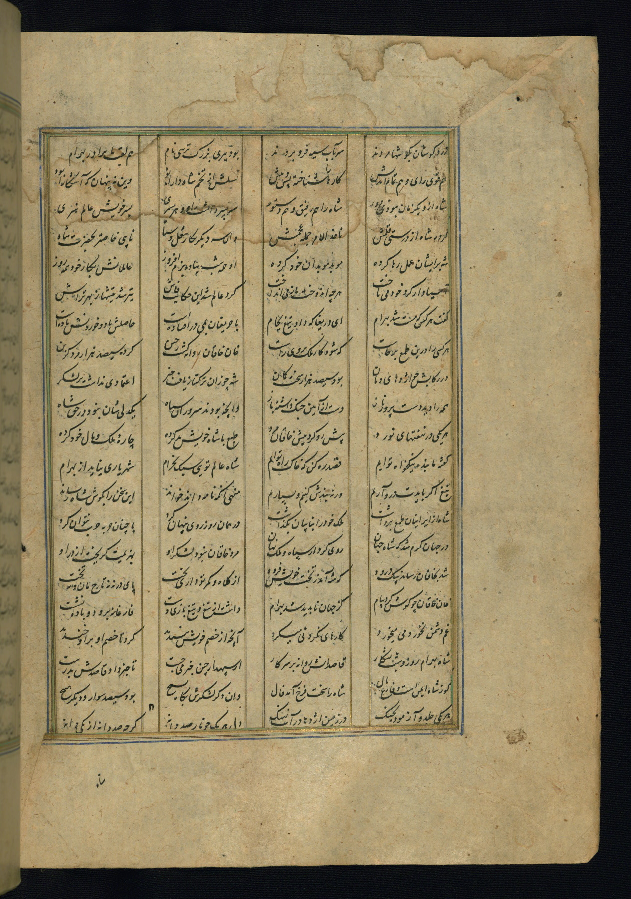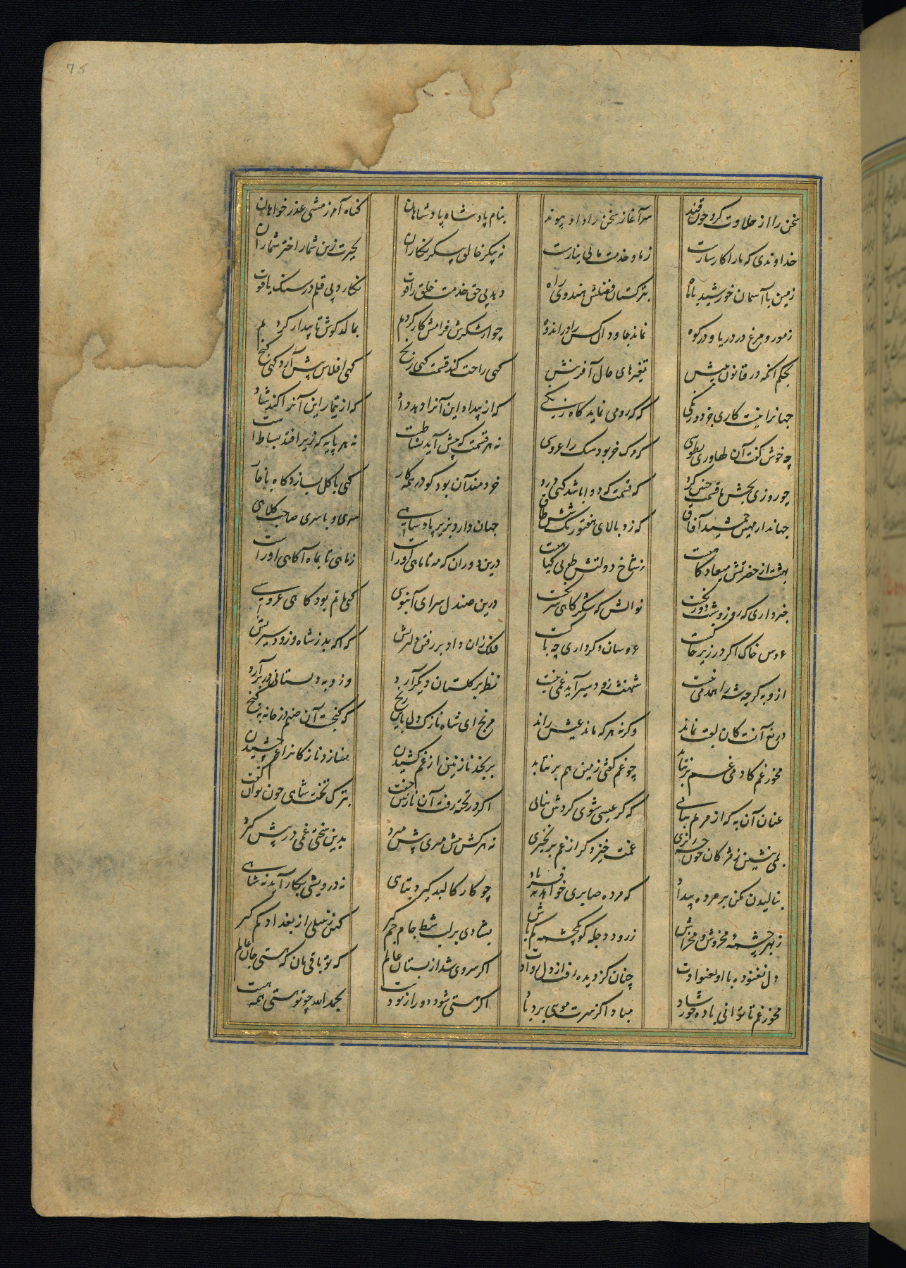 This is an illuminated and illustrated copy of the Khamsah (quintet) by Niẓāmī Ganjavī (d. 605 AH / 1209 CE), completed by Ḥabīb Allāh ibn ʿAlī ibn Ḥusām in Safavid Iran in Rabīʿ II 971 AH / 1563 CE. Illuminated titlepieces introduce the five poems, and there are thirty illustrations, the majority of which are attributable to thirteenth century AH / nineteenth CE Qajar Iran. Ownership notes and seals indicating the provenance of this manuscript are found throughout the codex (fols. 1a, 2a, 153a, 177a, 233a, 349a, and 351a). The binding is not original to the manuscript.
