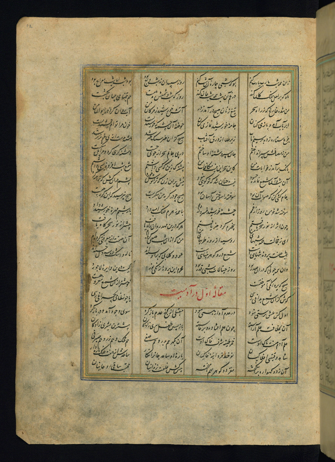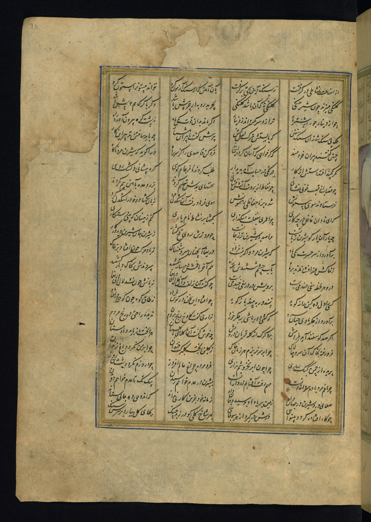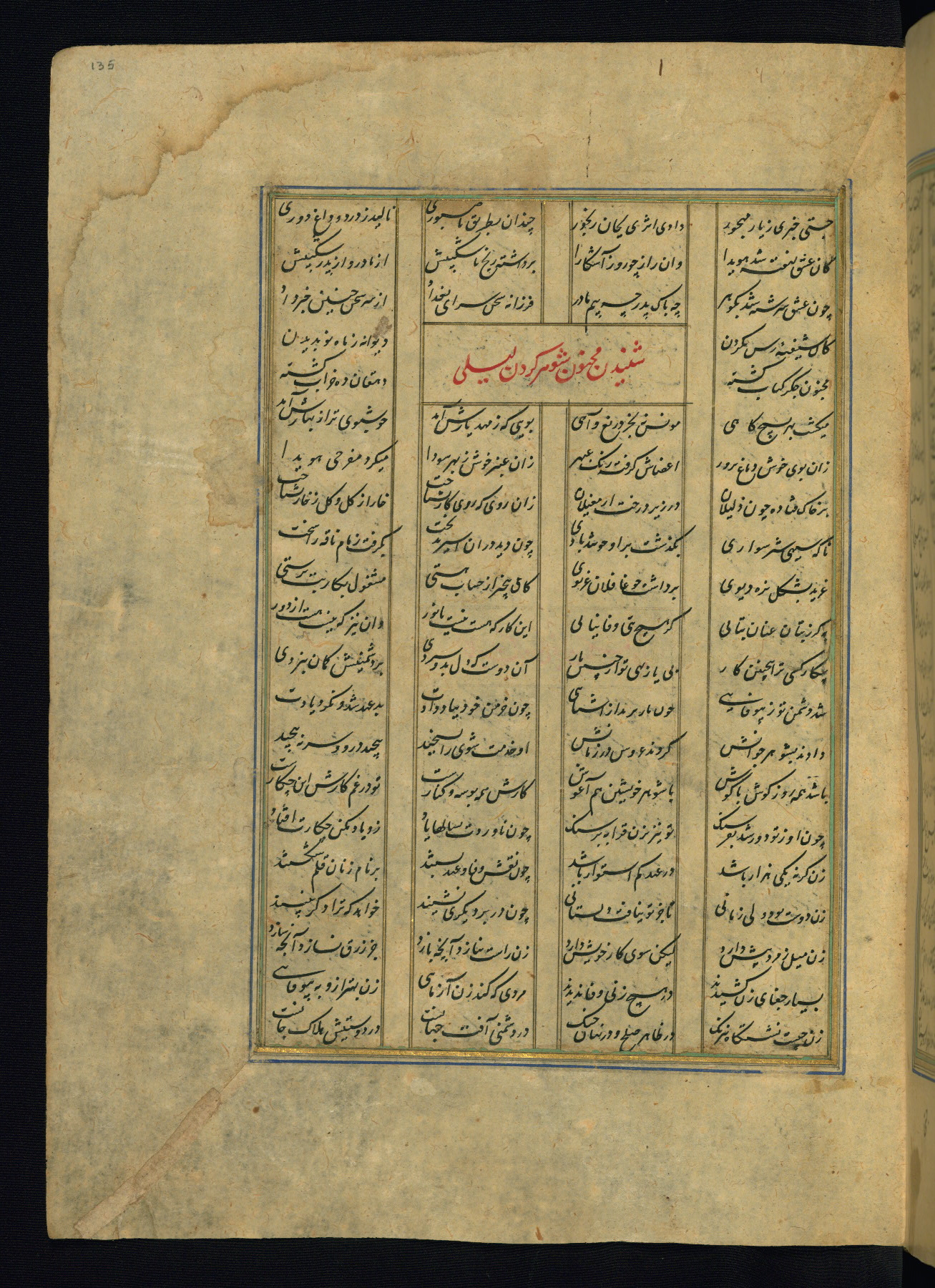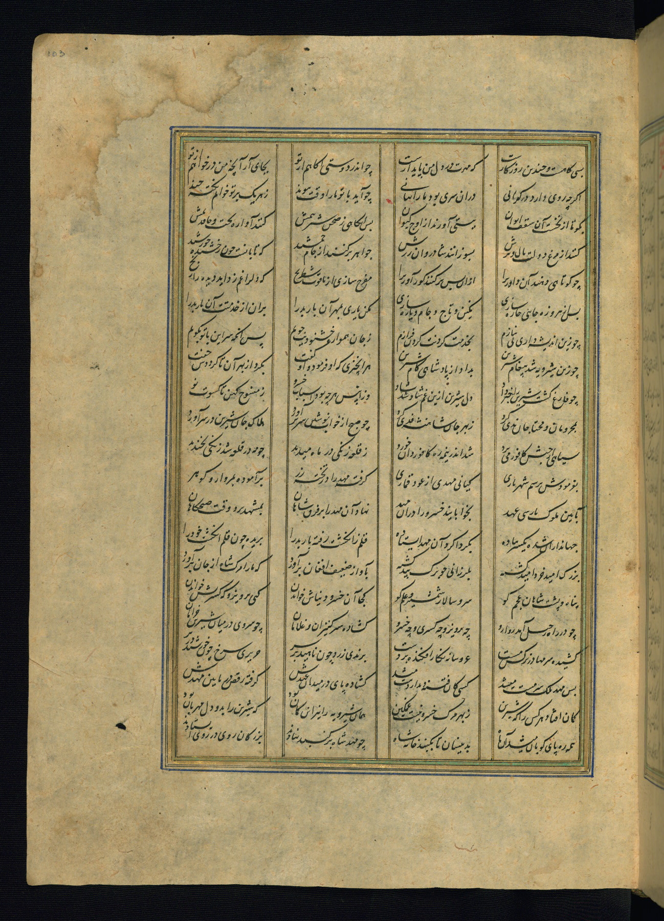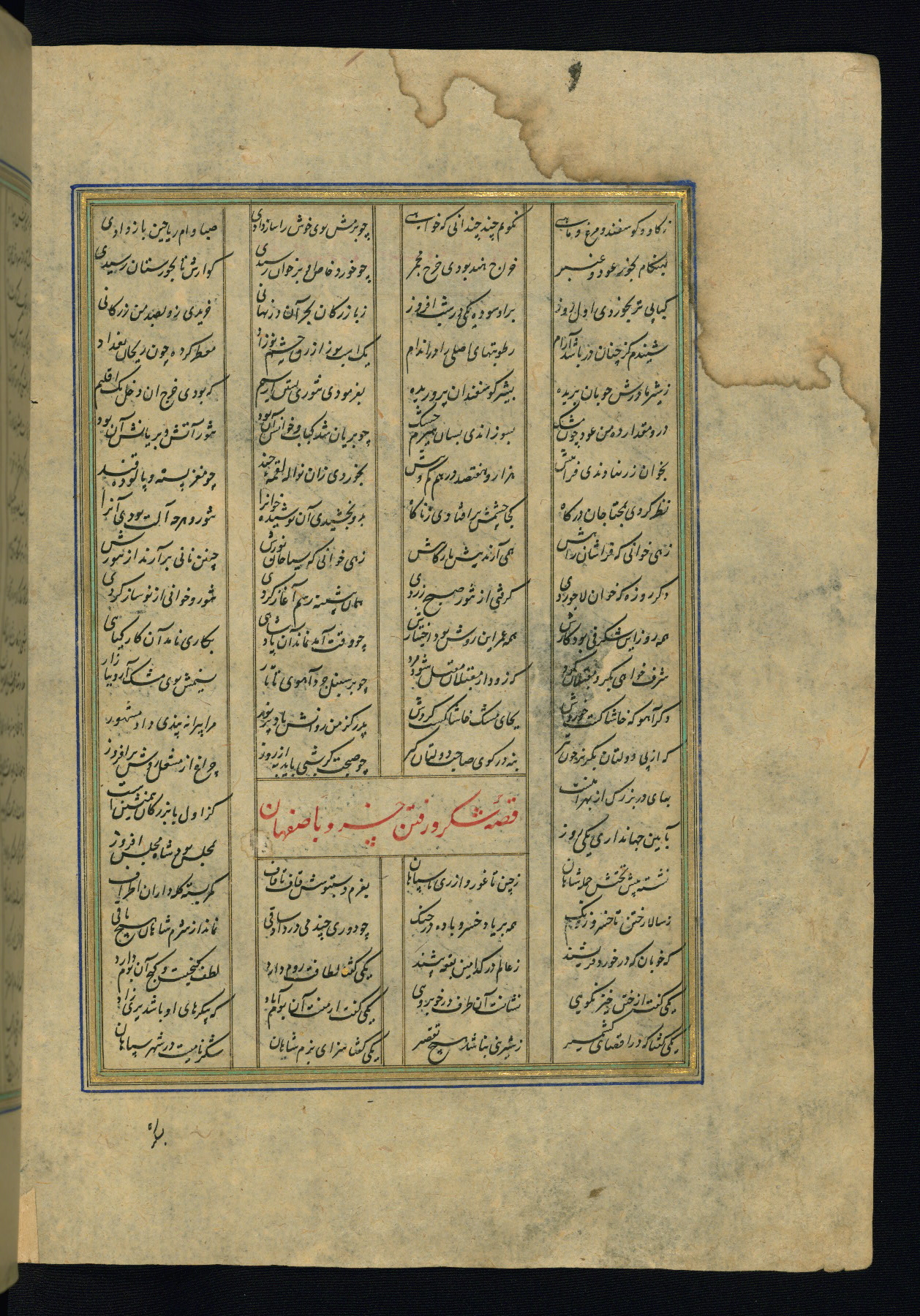 This is an illuminated and illustrated copy of the Khamsah (quintet) by Niẓāmī Ganjavī (d. 605 AH / 1209 CE), completed by Ḥabīb Allāh ibn ʿAlī ibn Ḥusām in Safavid Iran in Rabīʿ II 971 AH / 1563 CE. Illuminated titlepieces introduce the five poems, and there are thirty illustrations, the majority of which are attributable to thirteenth century AH / nineteenth CE Qajar Iran. Ownership notes and seals indicating the provenance of this manuscript are found throughout the codex (fols. 1a, 2a, 153a, 177a, 233a, 349a, and 351a). The binding is not original to the manuscript.