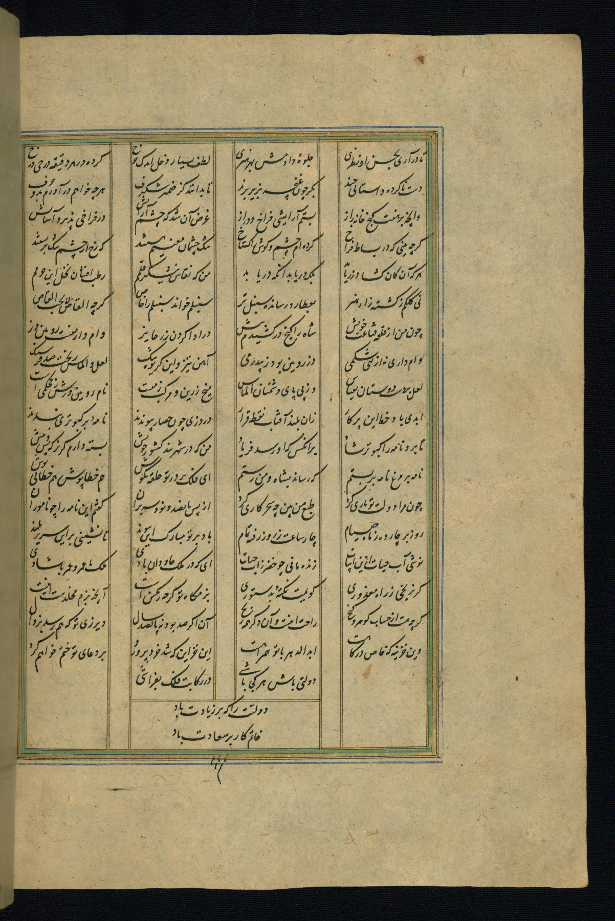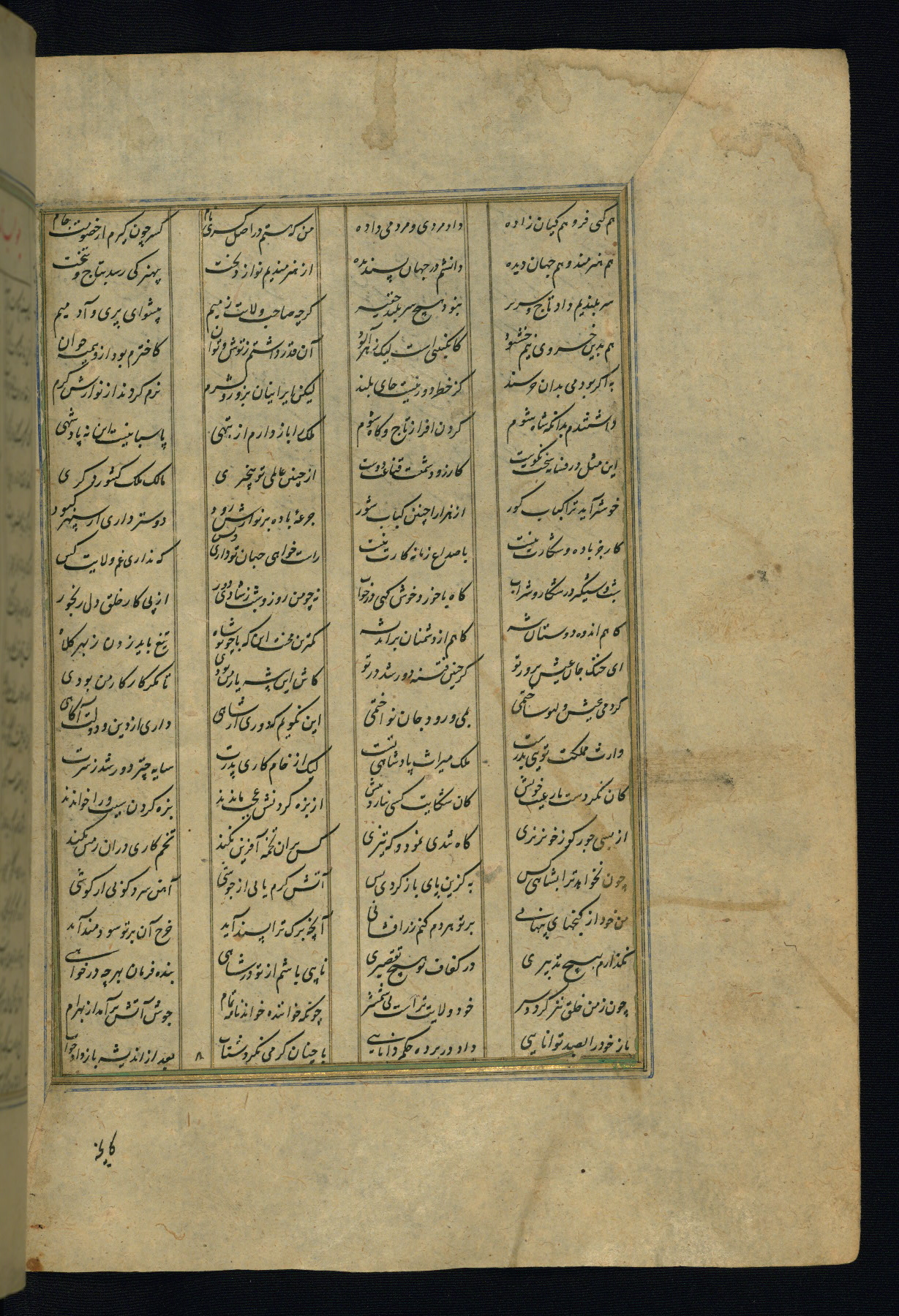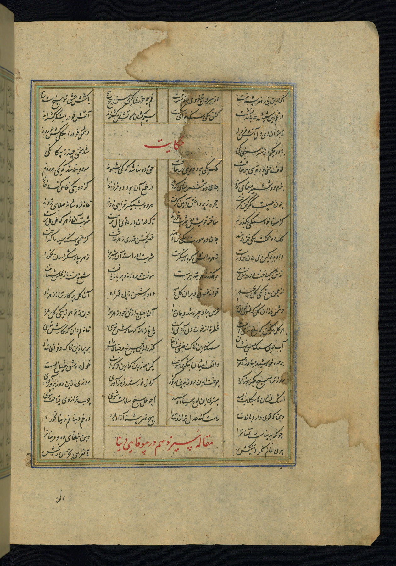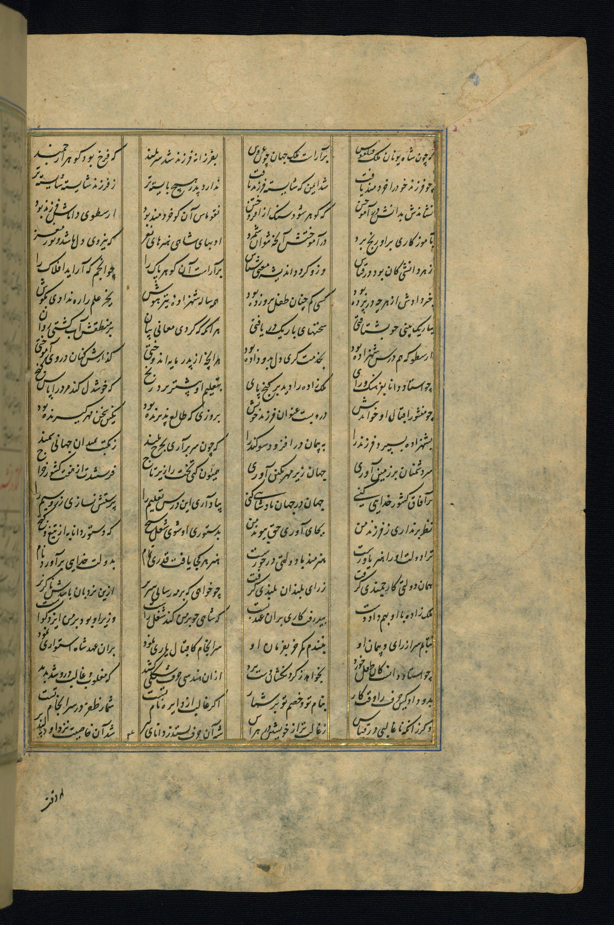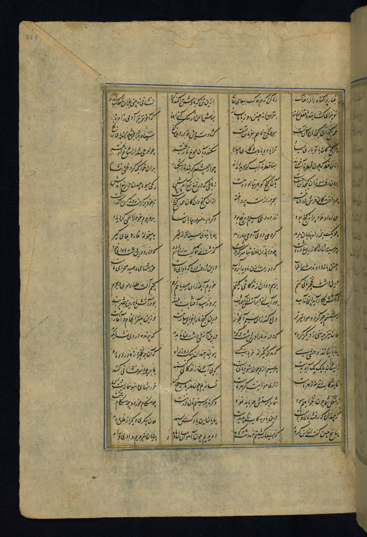 This is an illuminated and illustrated copy of the Khamsah (quintet) by Niẓāmī Ganjavī (d. 605 AH / 1209 CE), completed by Ḥabīb Allāh ibn ʿAlī ibn Ḥusām in Safavid Iran in Rabīʿ II 971 AH / 1563 CE. Illuminated titlepieces introduce the five poems, and there are thirty illustrations, the majority of which are attributable to thirteenth century AH / nineteenth CE Qajar Iran. Ownership notes and seals indicating the provenance of this manuscript are found throughout the codex (fols. 1a, 2a, 153a, 177a, 233a, 349a, and 351a). The binding is not original to the manuscript.