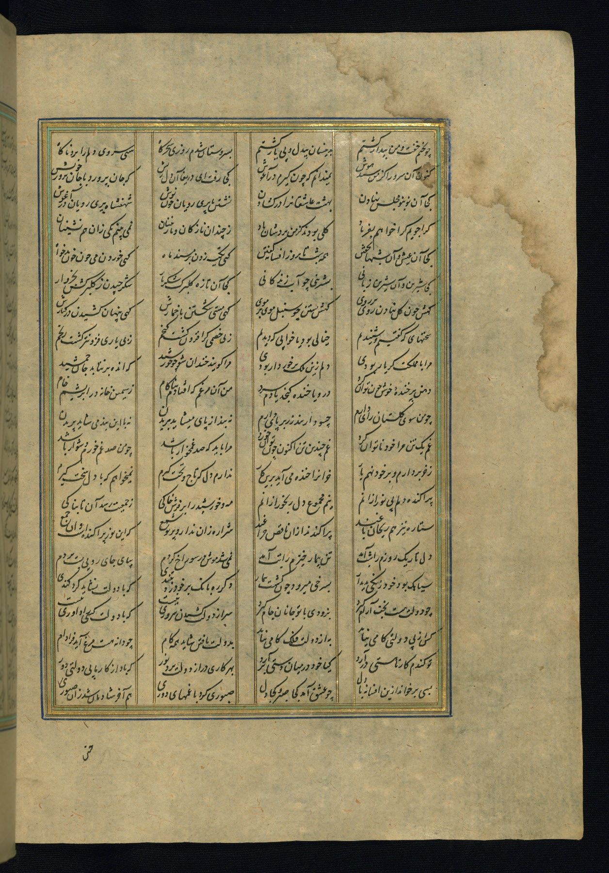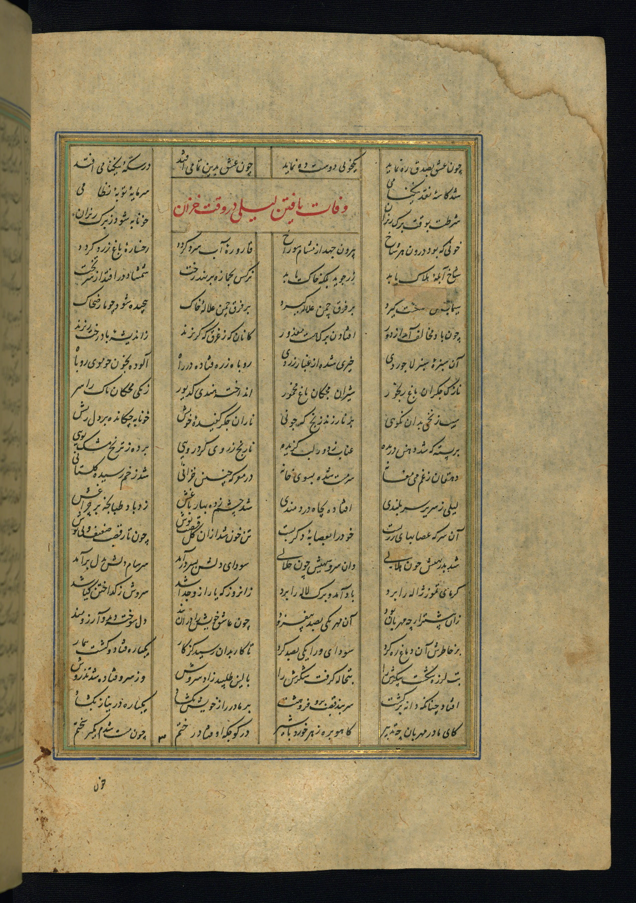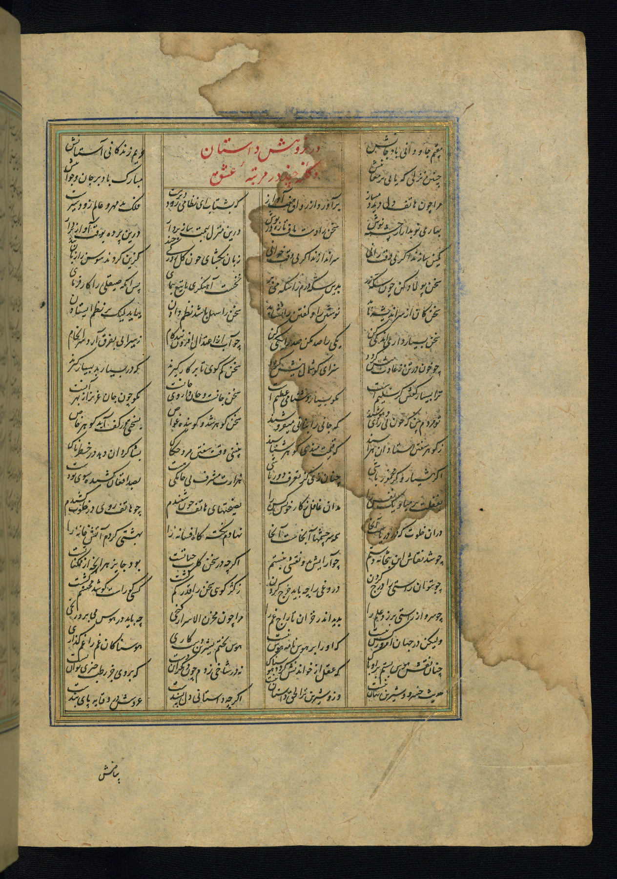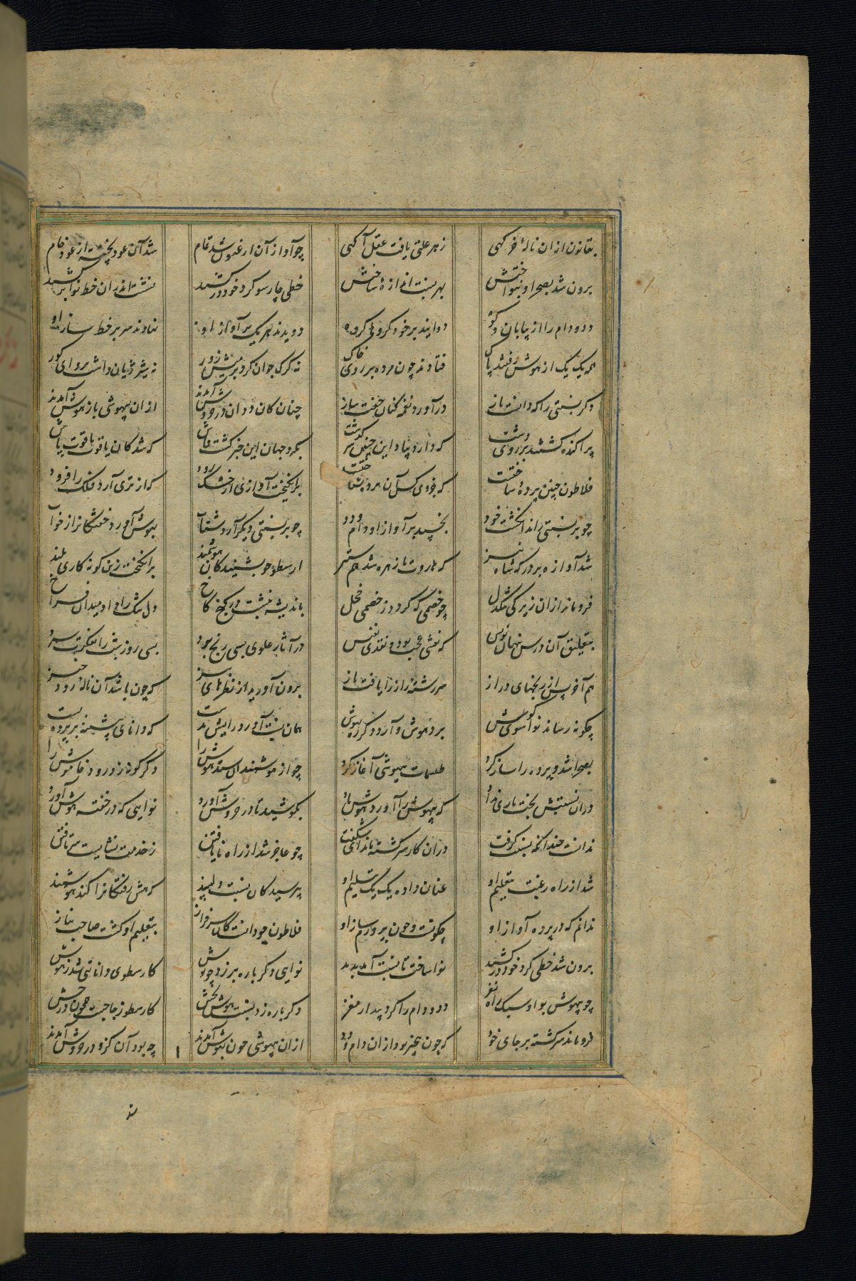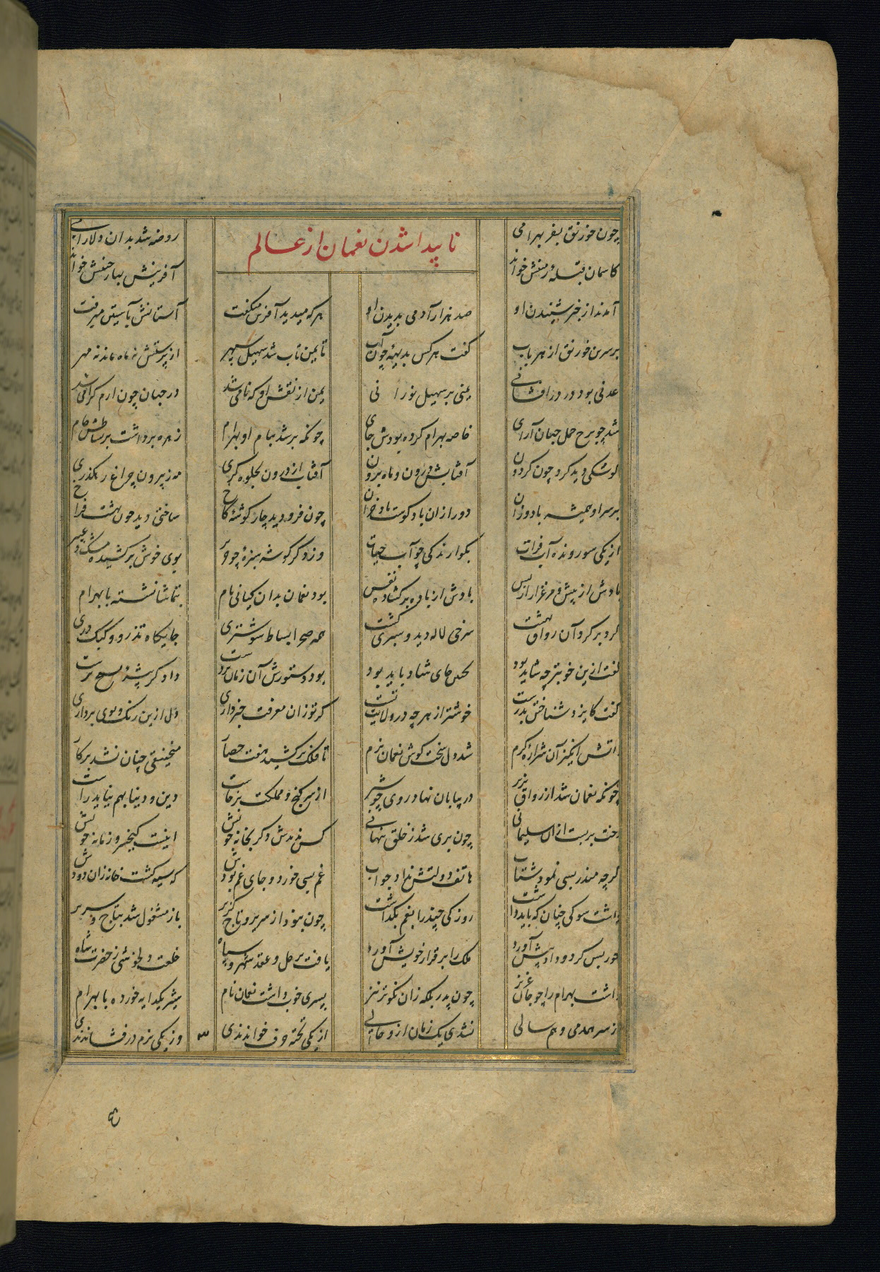 This is an illuminated and illustrated copy of the Khamsah (quintet) by Niẓāmī Ganjavī (d. 605 AH / 1209 CE), completed by Ḥabīb Allāh ibn ʿAlī ibn Ḥusām in Safavid Iran in Rabīʿ II 971 AH / 1563 CE. Illuminated titlepieces introduce the five poems, and there are thirty illustrations, the majority of which are attributable to thirteenth century AH / nineteenth CE Qajar Iran. Ownership notes and seals indicating the provenance of this manuscript are found throughout the codex (fols. 1a, 2a, 153a, 177a, 233a, 349a, and 351a). The binding is not original to the manuscript.