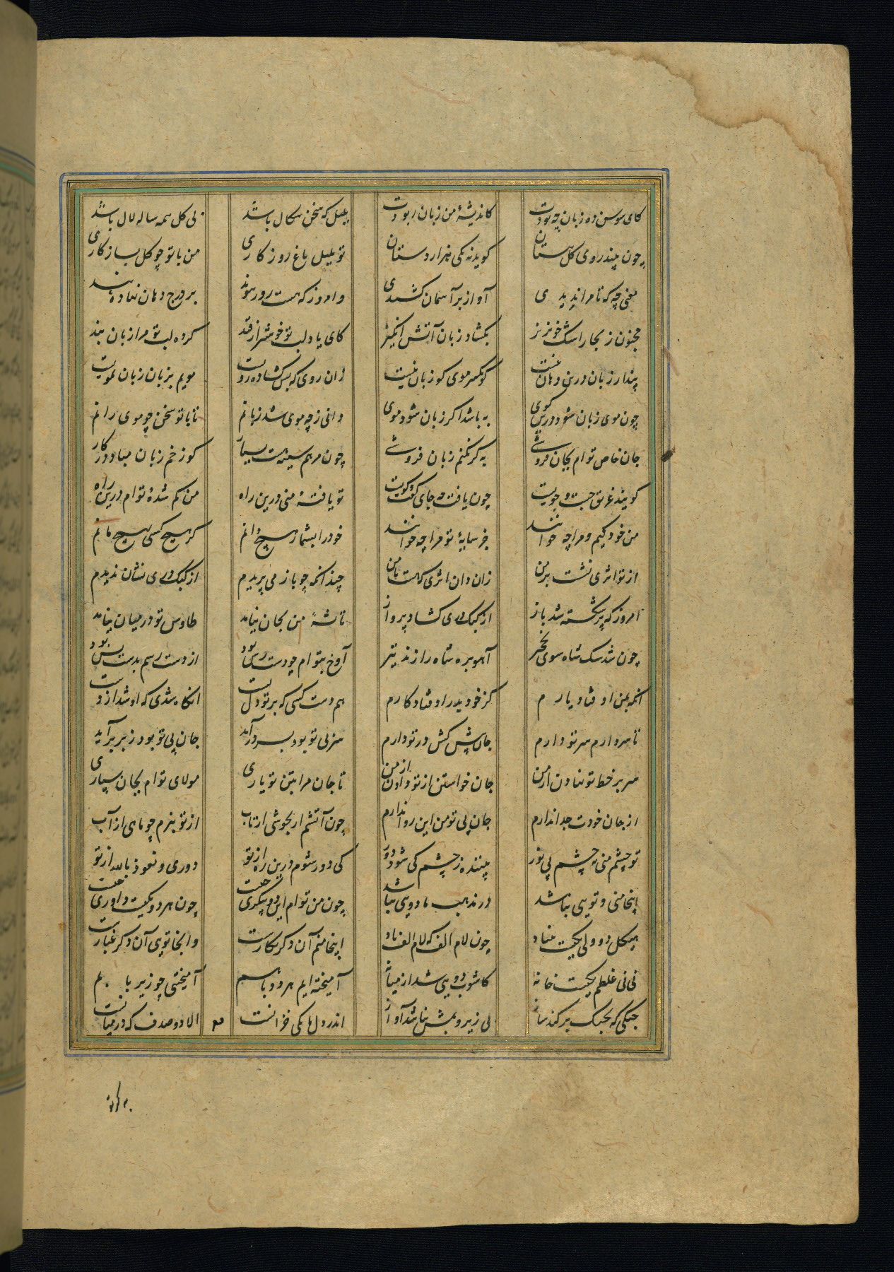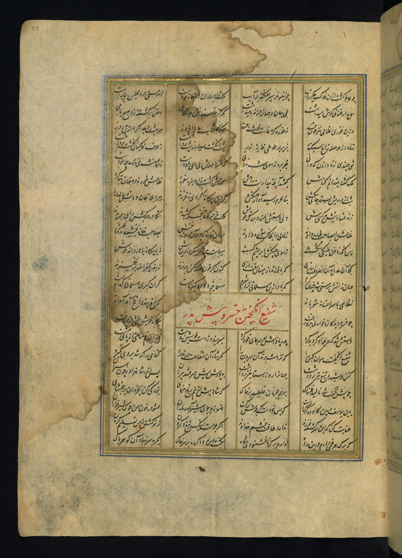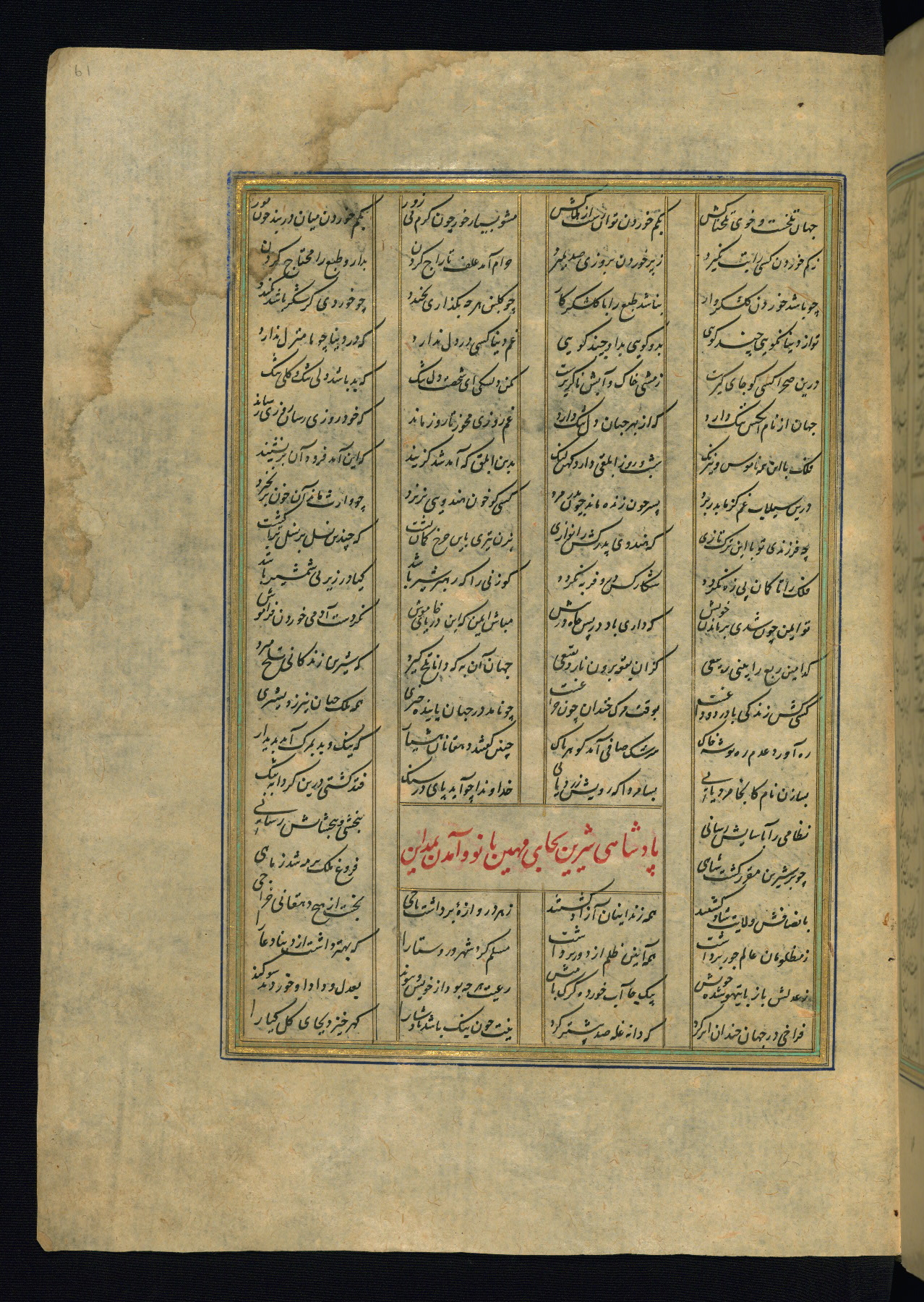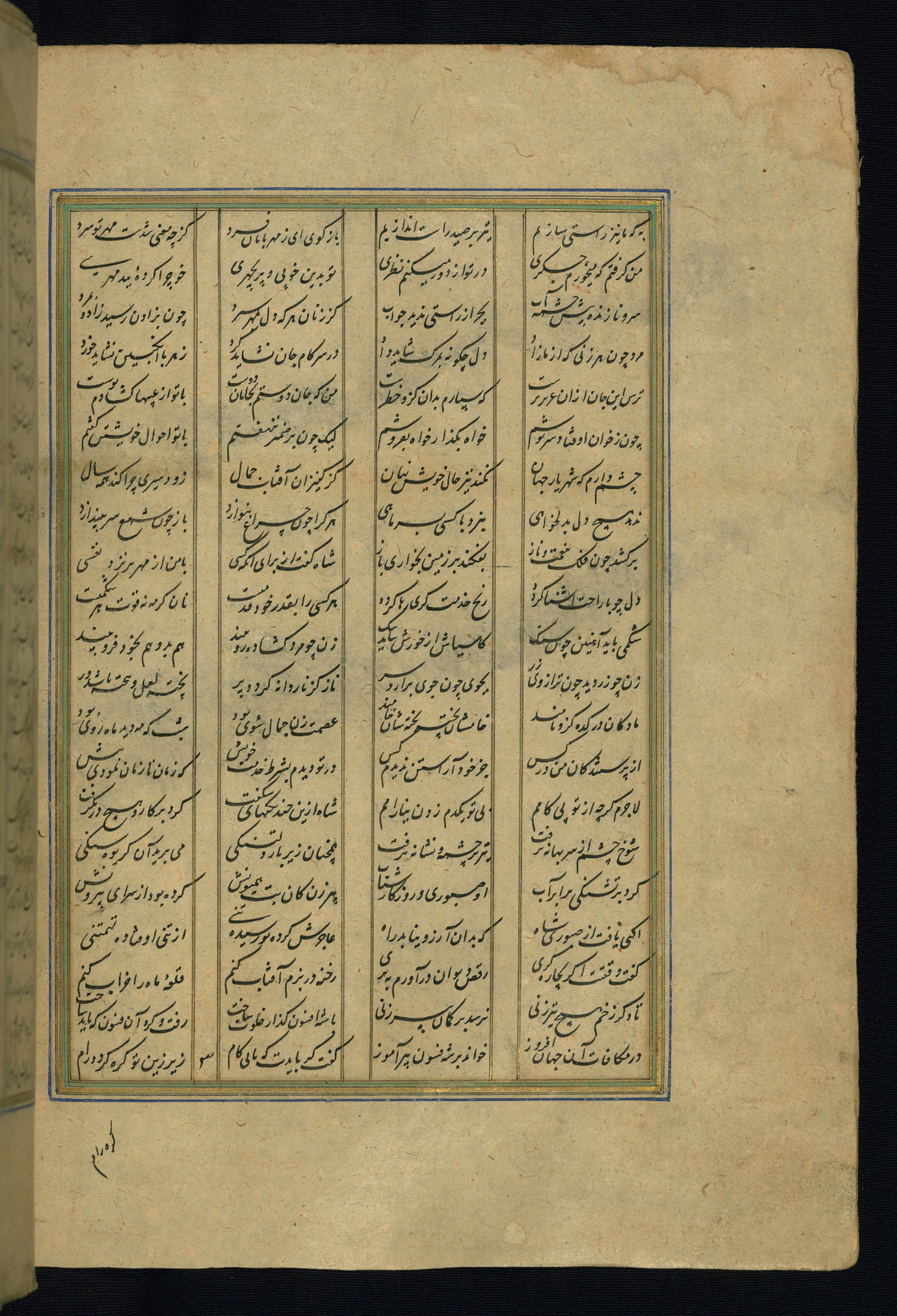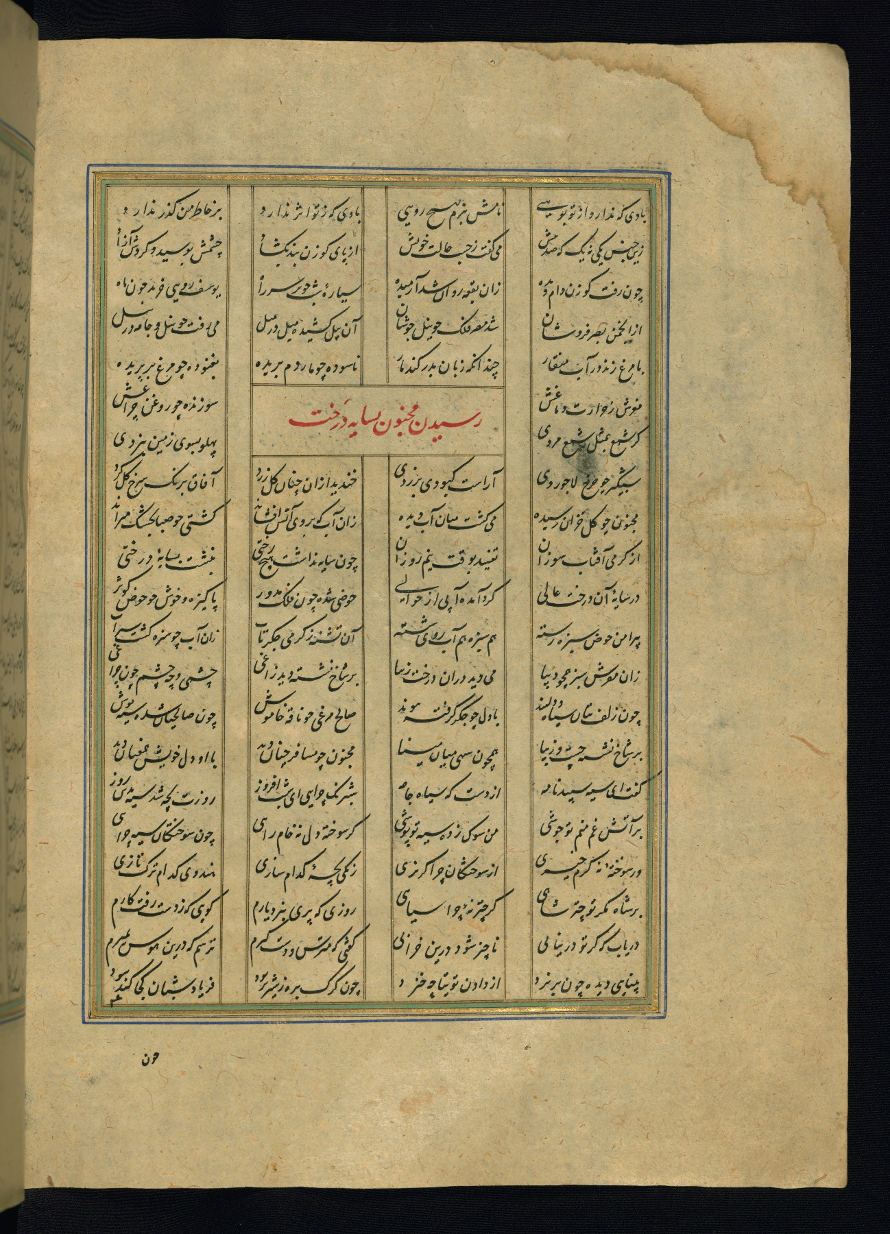 This is an illuminated and illustrated copy of the Khamsah (quintet) by Niẓāmī Ganjavī (d. 605 AH / 1209 CE), completed by Ḥabīb Allāh ibn ʿAlī ibn Ḥusām in Safavid Iran in Rabīʿ II 971 AH / 1563 CE. Illuminated titlepieces introduce the five poems, and there are thirty illustrations, the majority of which are attributable to thirteenth century AH / nineteenth CE Qajar Iran. Ownership notes and seals indicating the provenance of this manuscript are found throughout the codex (fols. 1a, 2a, 153a, 177a, 233a, 349a, and 351a). The binding is not original to the manuscript.