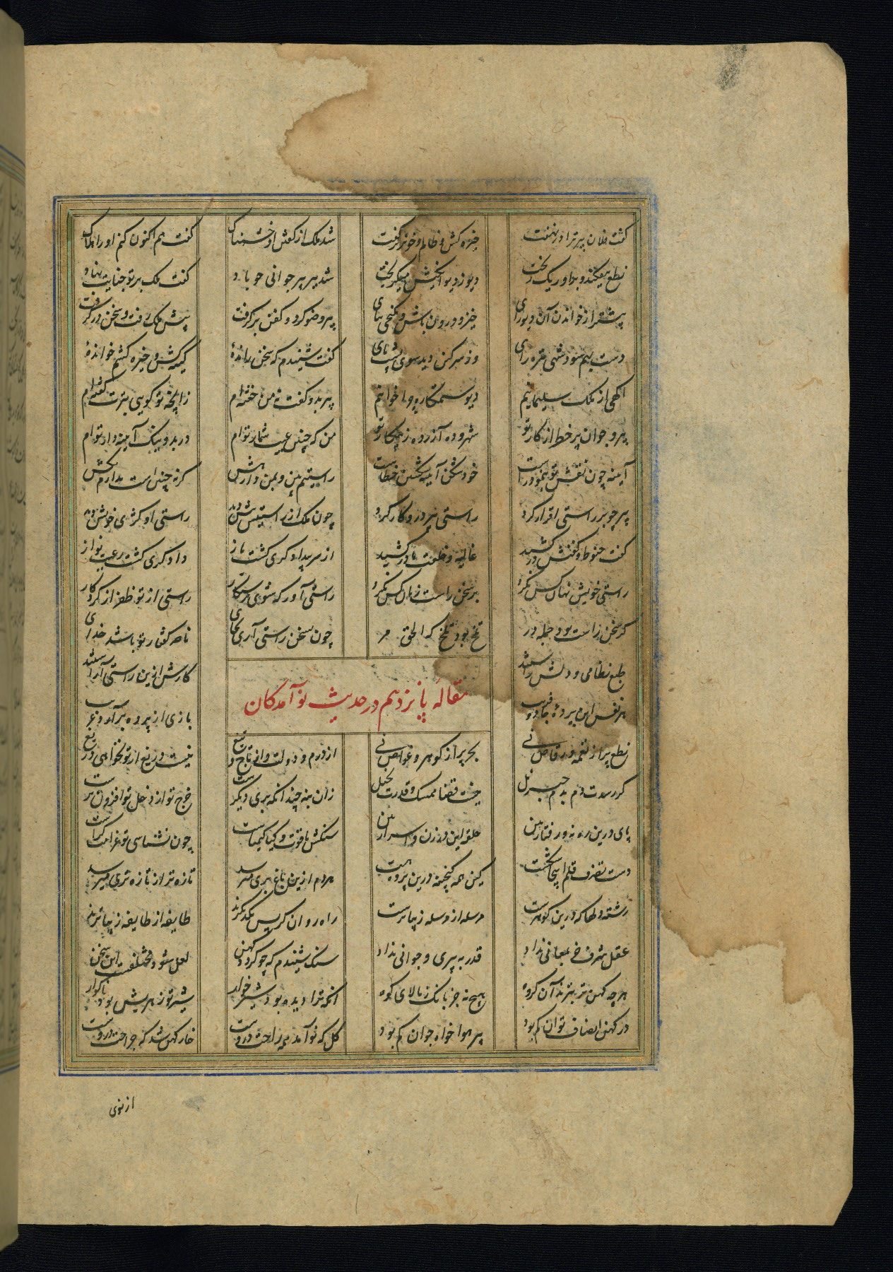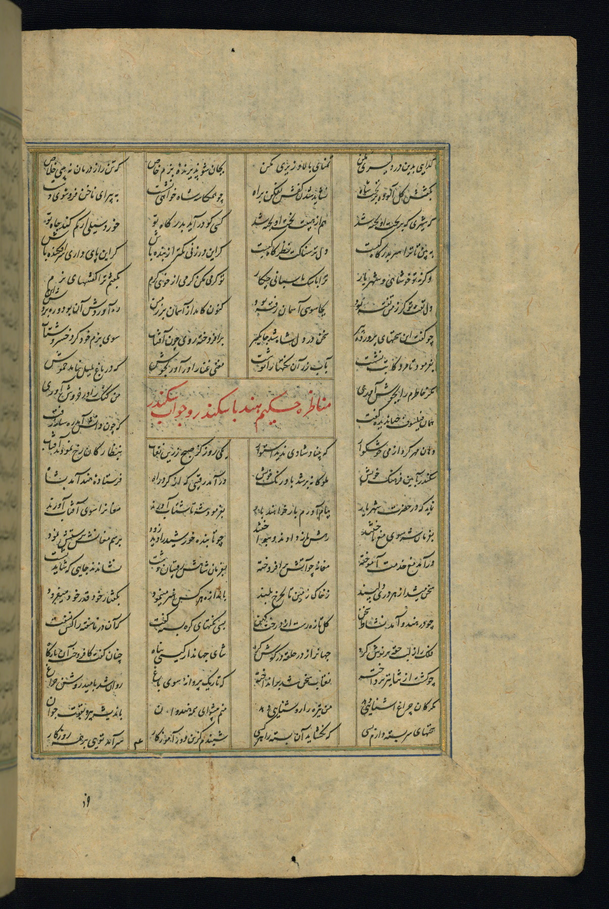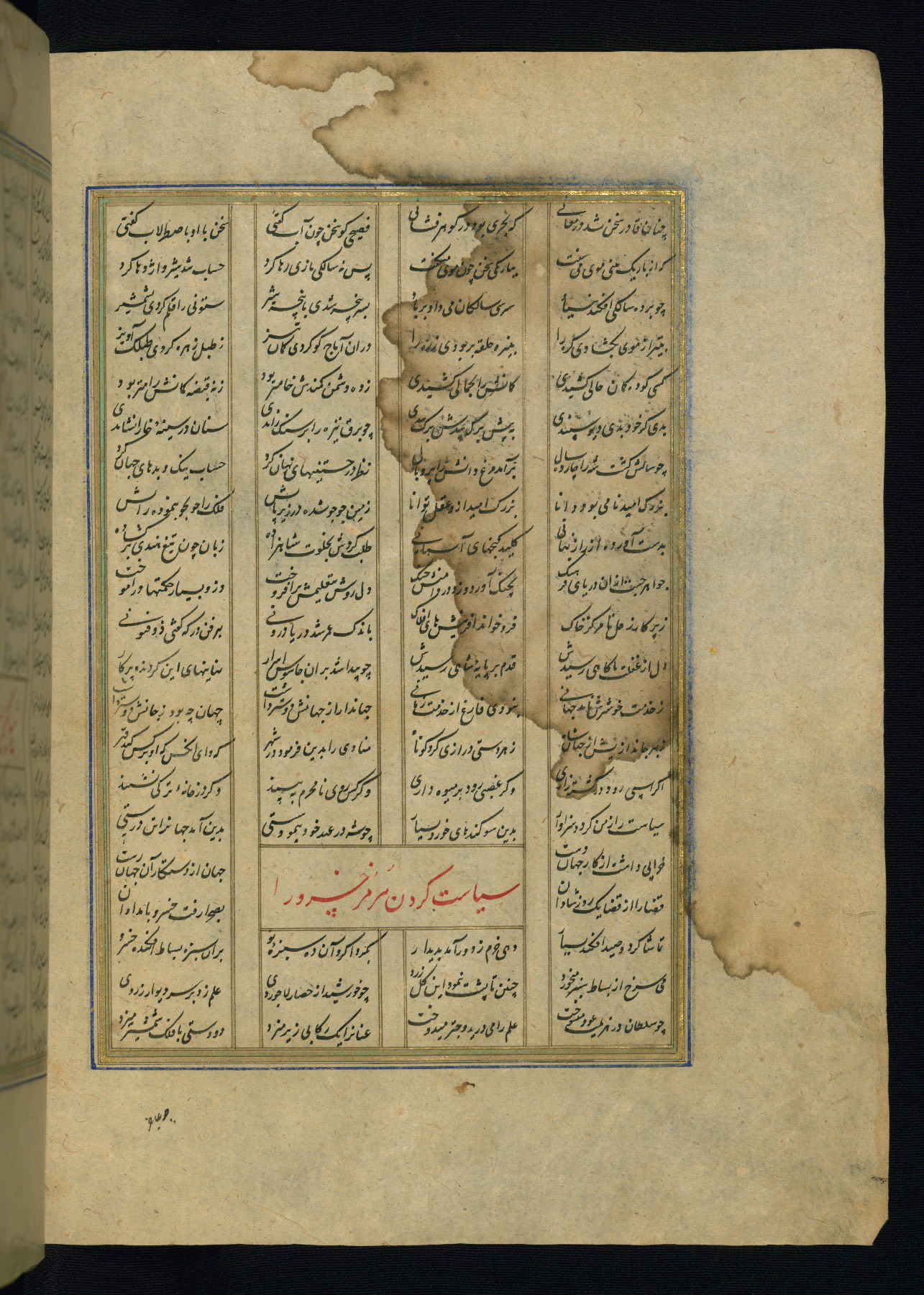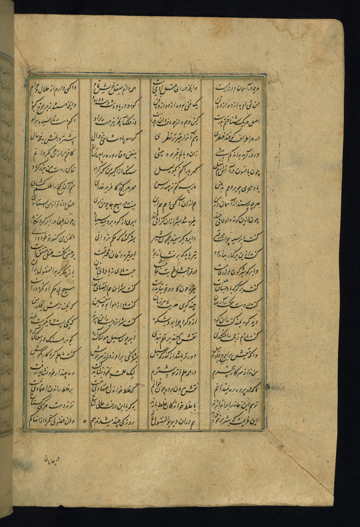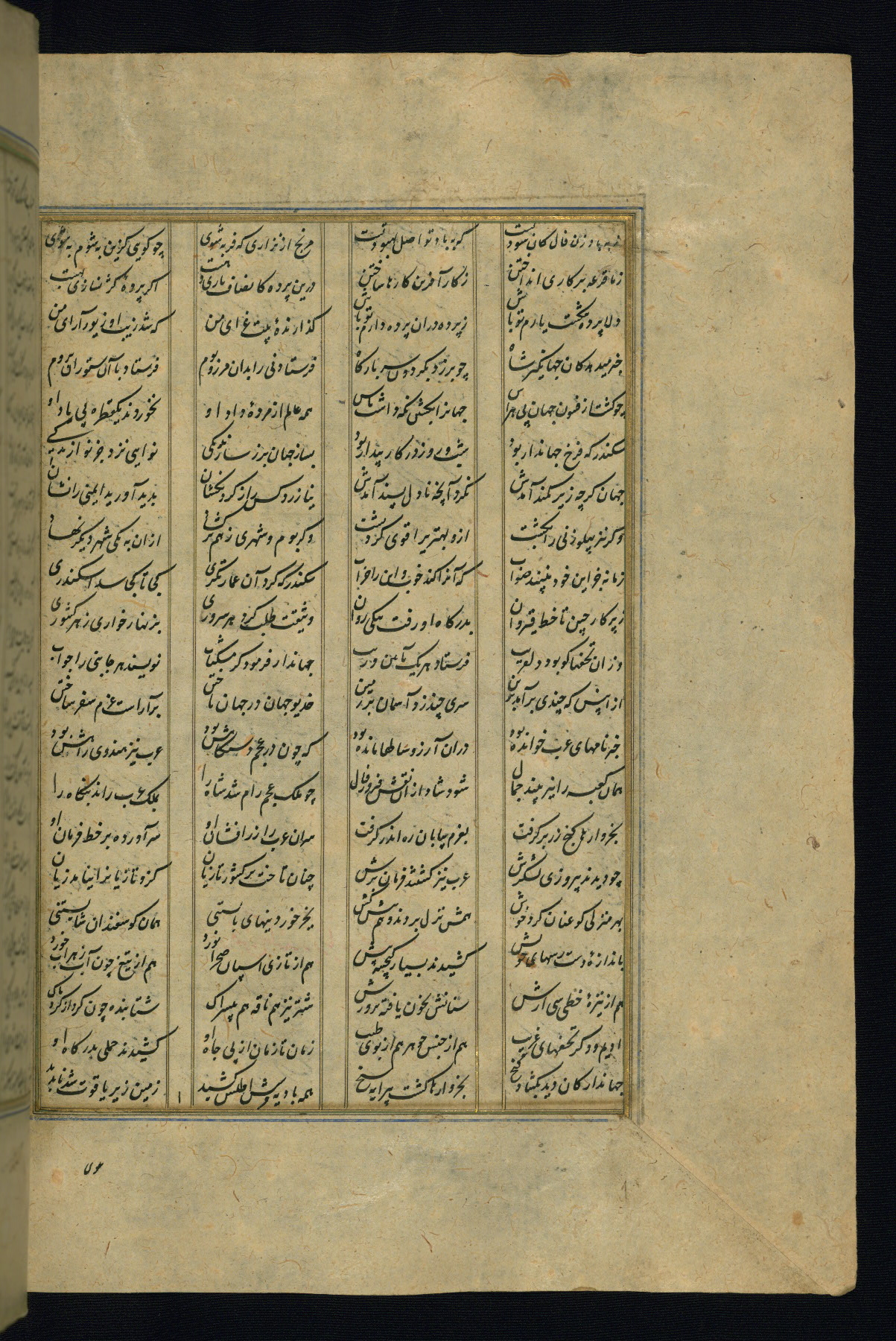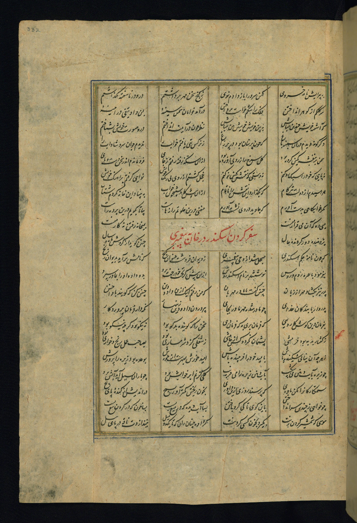 This is an illuminated and illustrated copy of the Khamsah (quintet) by Niẓāmī Ganjavī (d. 605 AH / 1209 CE), completed by Ḥabīb Allāh ibn ʿAlī ibn Ḥusām in Safavid Iran in Rabīʿ II 971 AH / 1563 CE. Illuminated titlepieces introduce the five poems, and there are thirty illustrations, the majority of which are attributable to thirteenth century AH / nineteenth CE Qajar Iran. Ownership notes and seals indicating the provenance of this manuscript are found throughout the codex (fols. 1a, 2a, 153a, 177a, 233a, 349a, and 351a). The binding is not original to the manuscript.