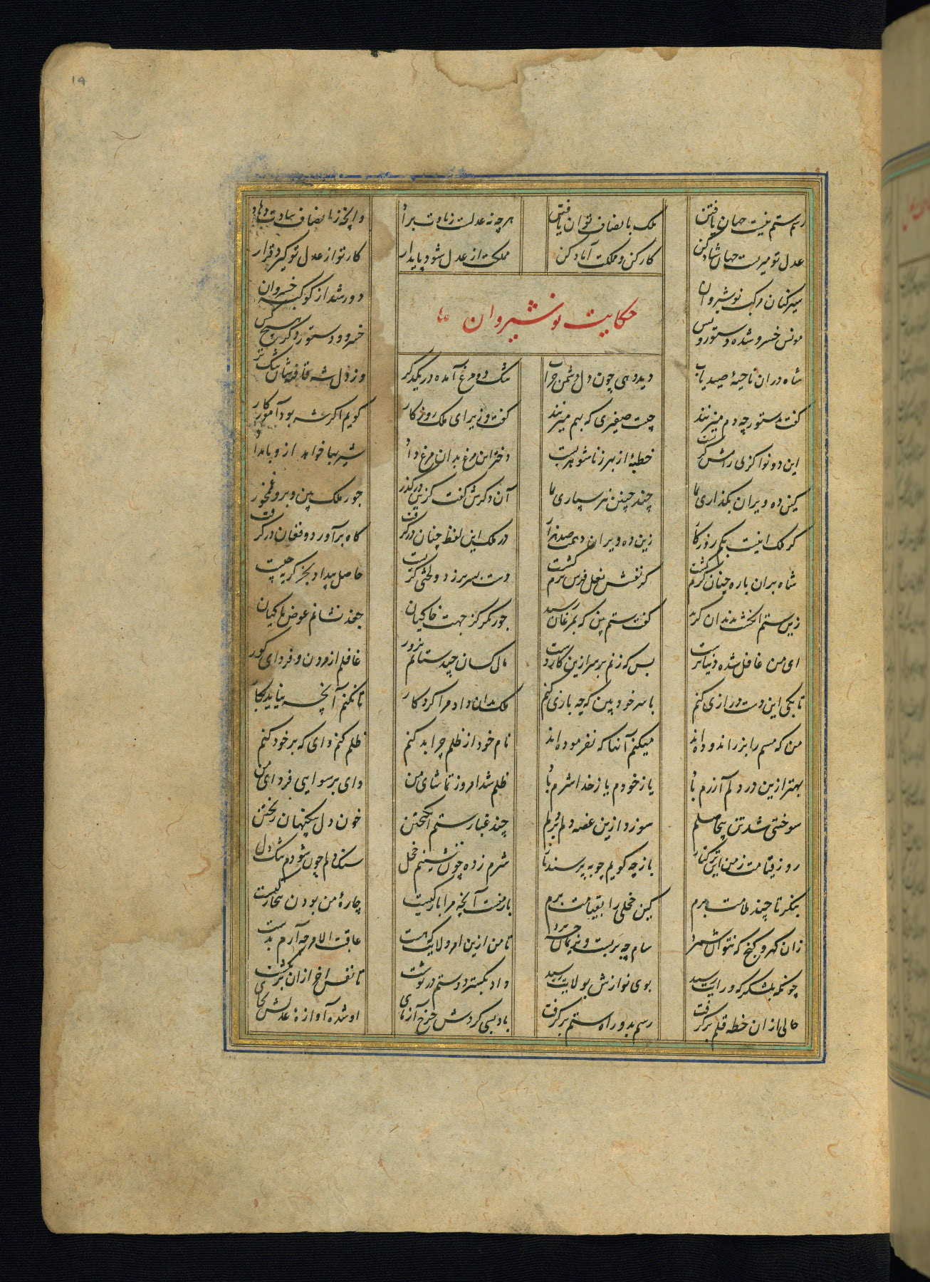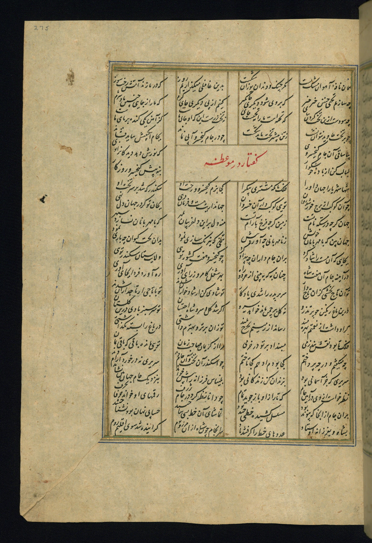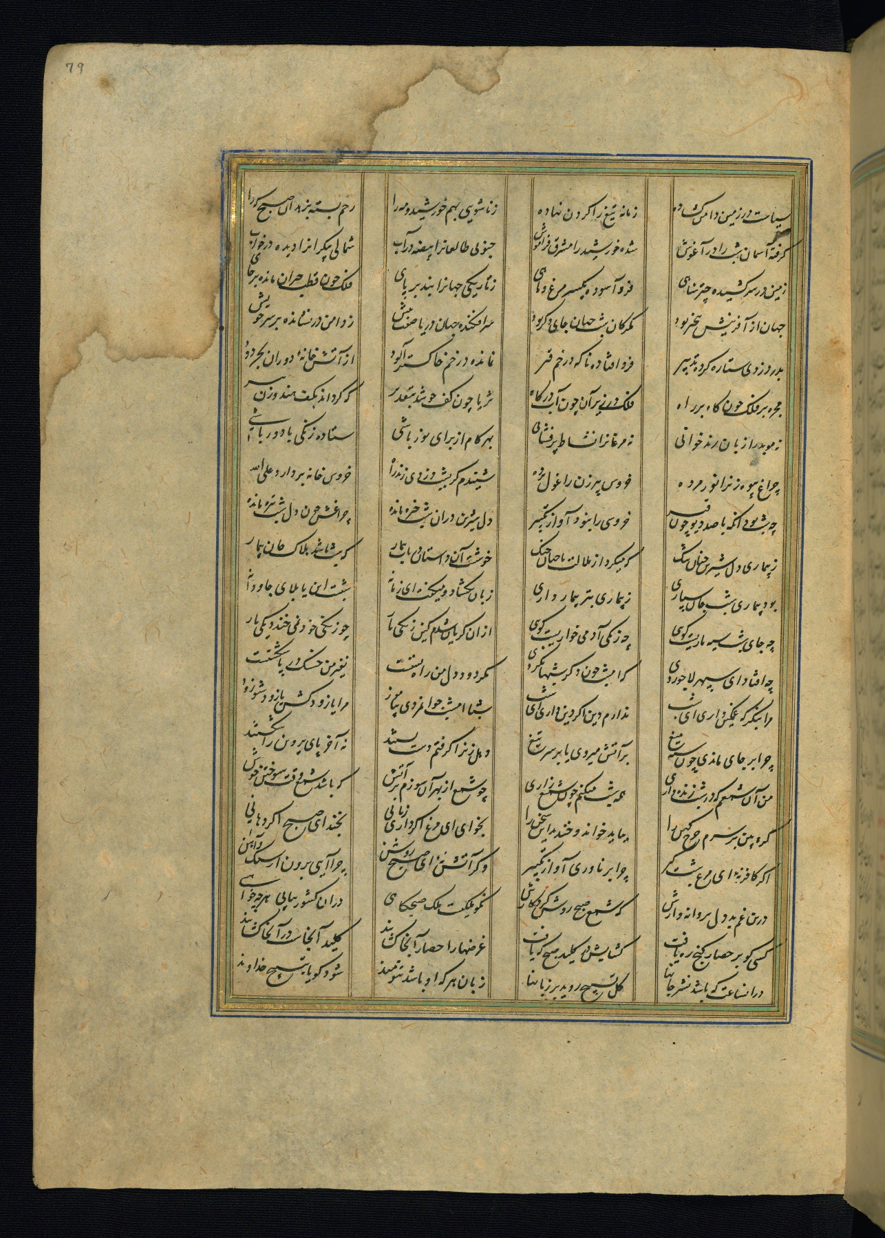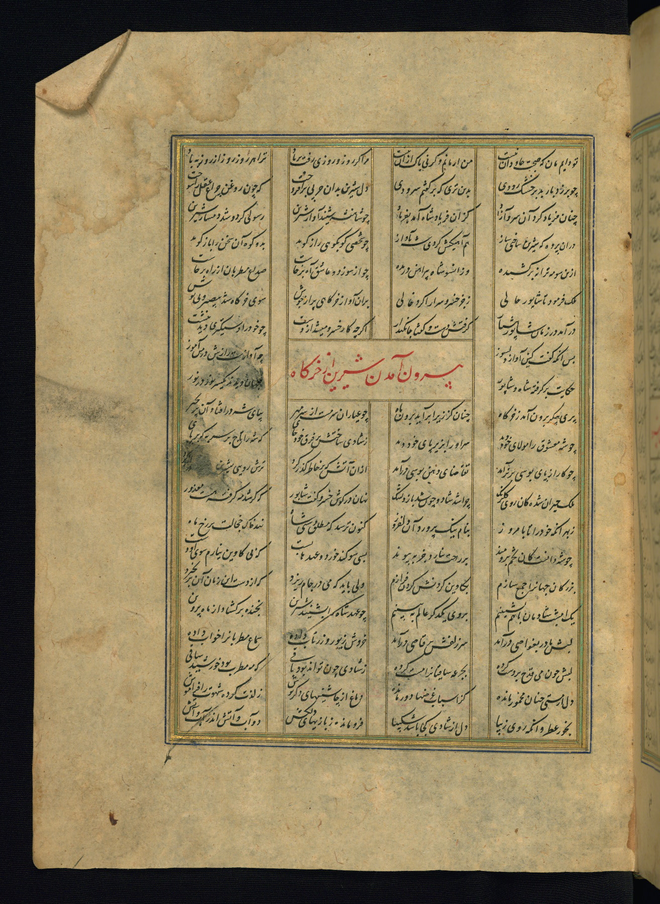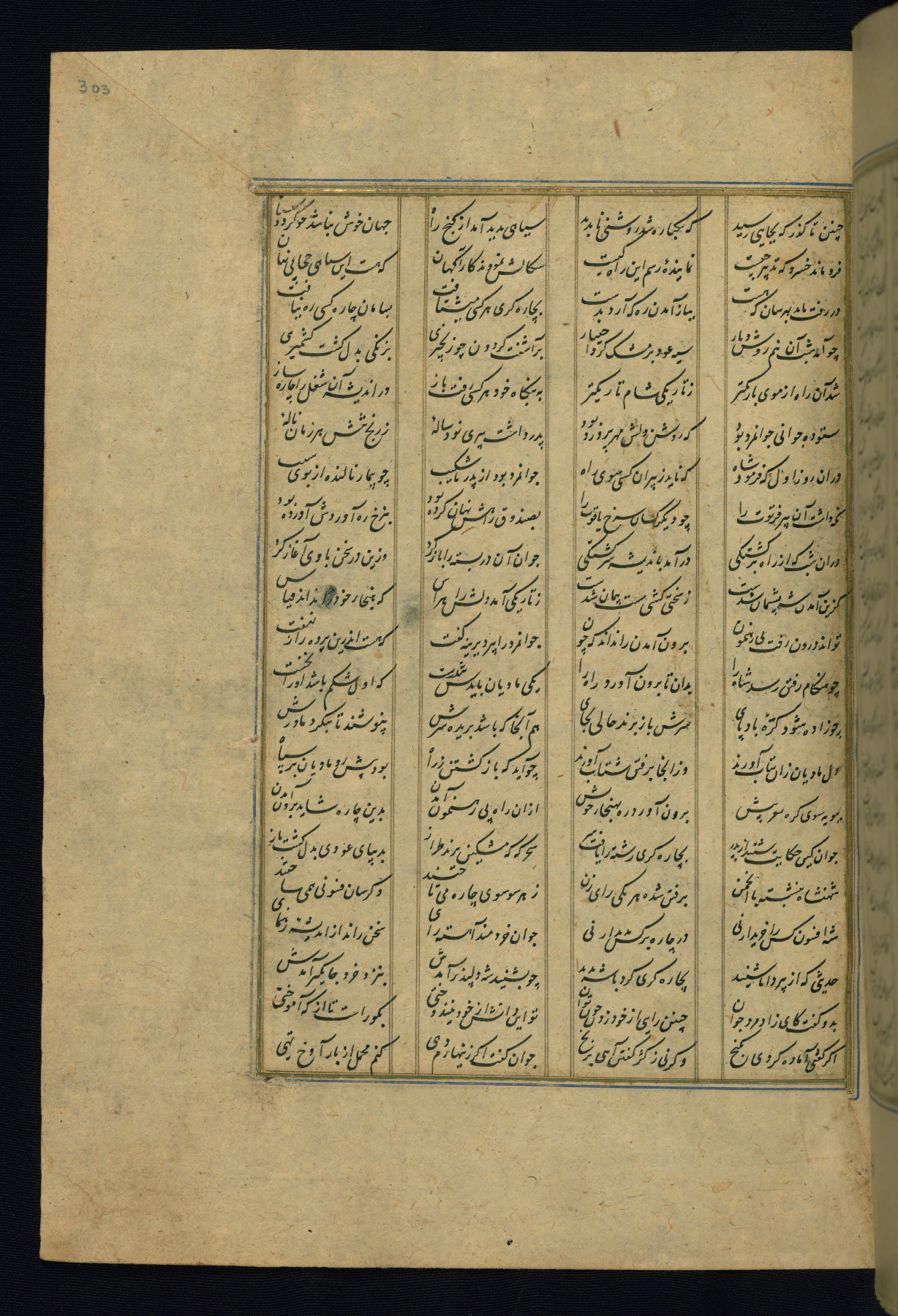 This is an illuminated and illustrated copy of the Khamsah (quintet) by Niẓāmī Ganjavī (d. 605 AH / 1209 CE), completed by Ḥabīb Allāh ibn ʿAlī ibn Ḥusām in Safavid Iran in Rabīʿ II 971 AH / 1563 CE. Illuminated titlepieces introduce the five poems, and there are thirty illustrations, the majority of which are attributable to thirteenth century AH / nineteenth CE Qajar Iran. Ownership notes and seals indicating the provenance of this manuscript are found throughout the codex (fols. 1a, 2a, 153a, 177a, 233a, 349a, and 351a). The binding is not original to the manuscript.