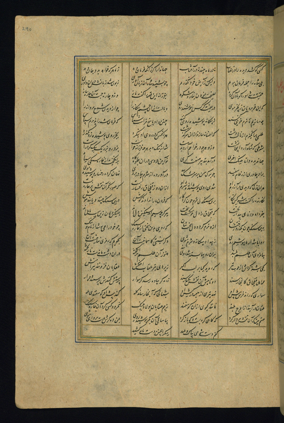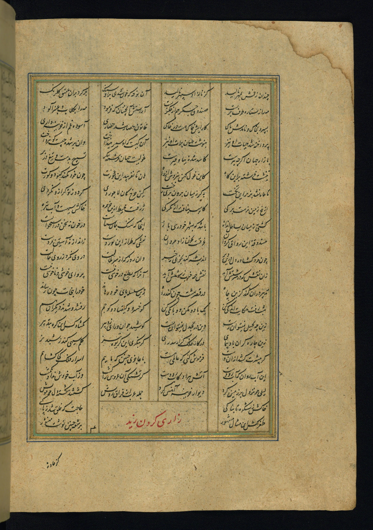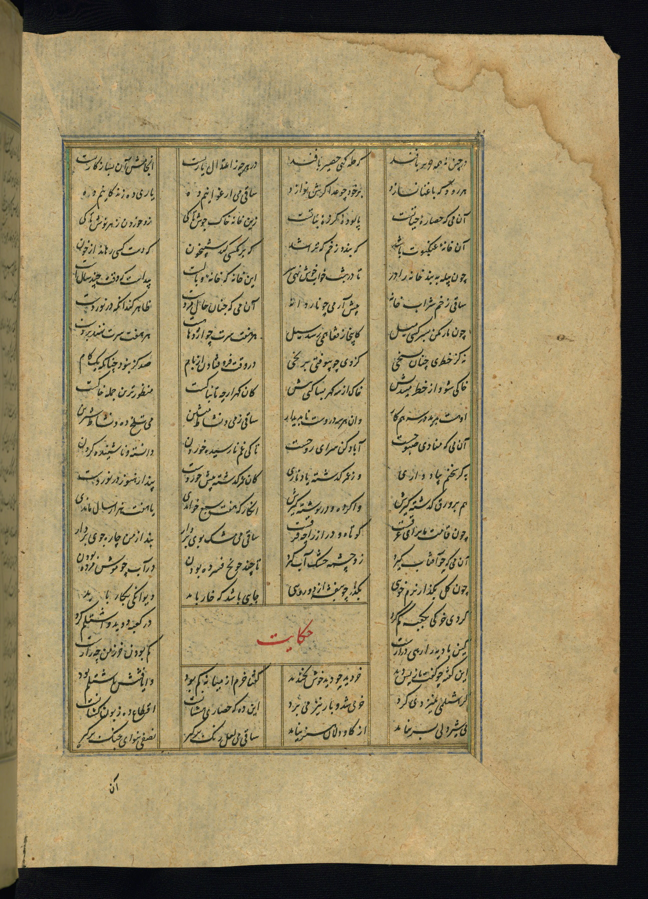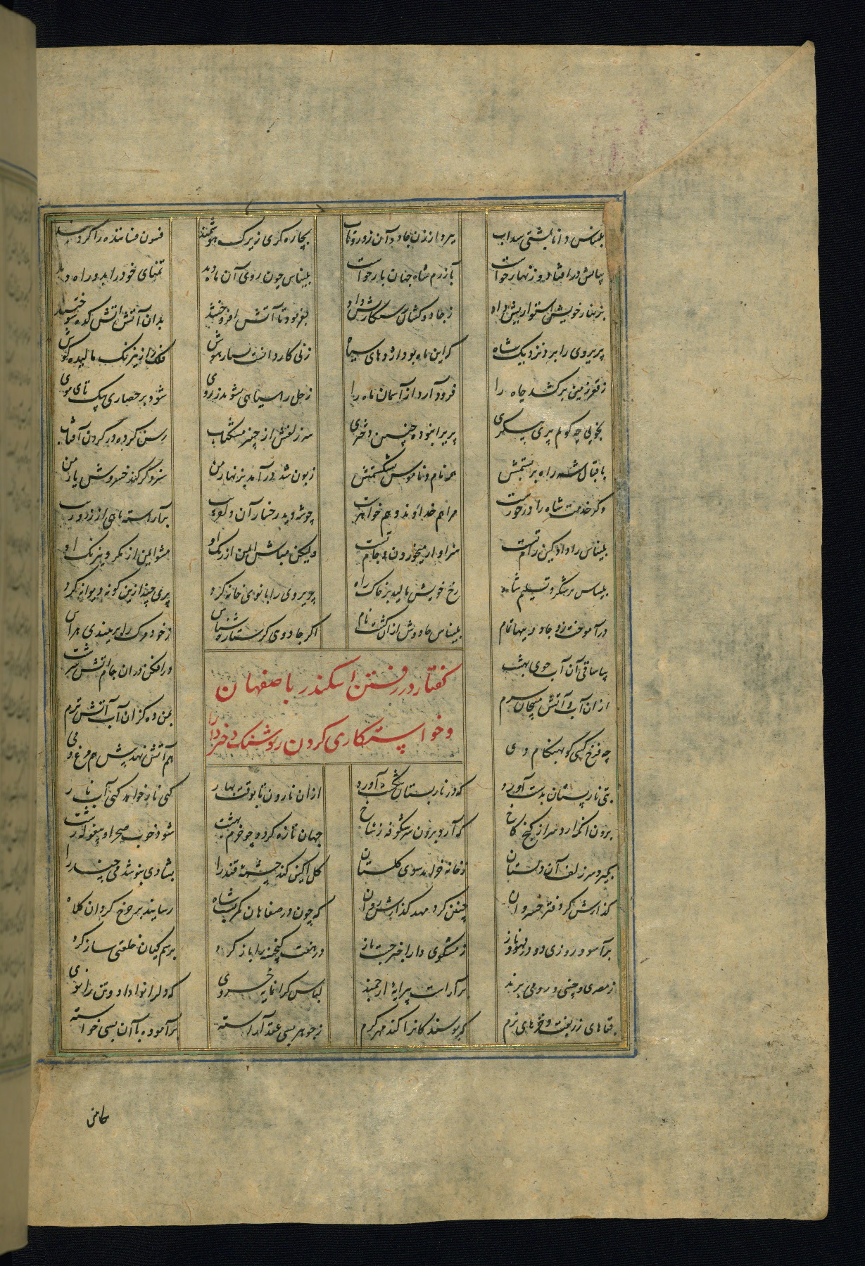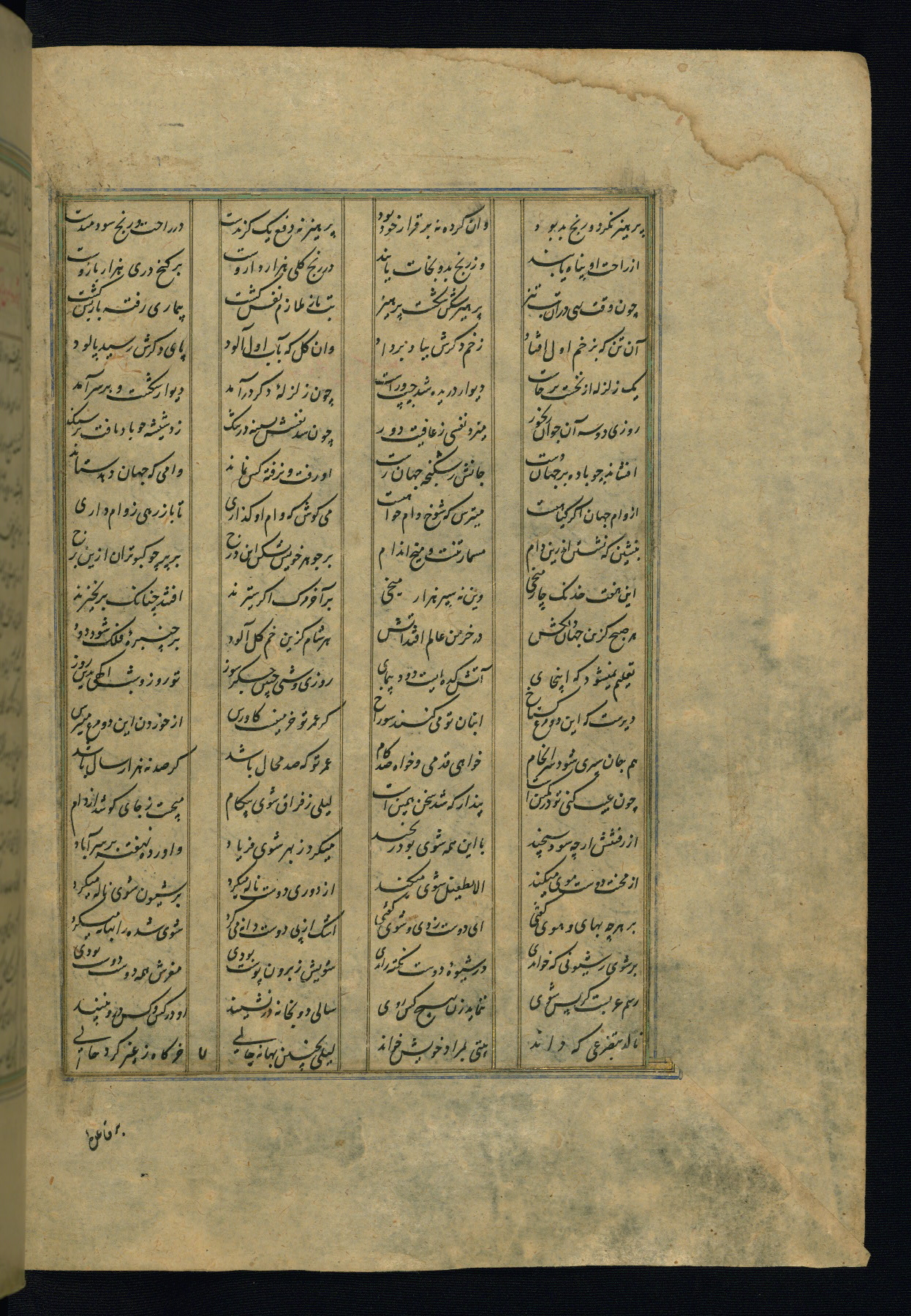 This is an illuminated and illustrated copy of the Khamsah (quintet) by Niẓāmī Ganjavī (d. 605 AH / 1209 CE), completed by Ḥabīb Allāh ibn ʿAlī ibn Ḥusām in Safavid Iran in Rabīʿ II 971 AH / 1563 CE. Illuminated titlepieces introduce the five poems, and there are thirty illustrations, the majority of which are attributable to thirteenth century AH / nineteenth CE Qajar Iran. Ownership notes and seals indicating the provenance of this manuscript are found throughout the codex (fols. 1a, 2a, 153a, 177a, 233a, 349a, and 351a). The binding is not original to the manuscript.