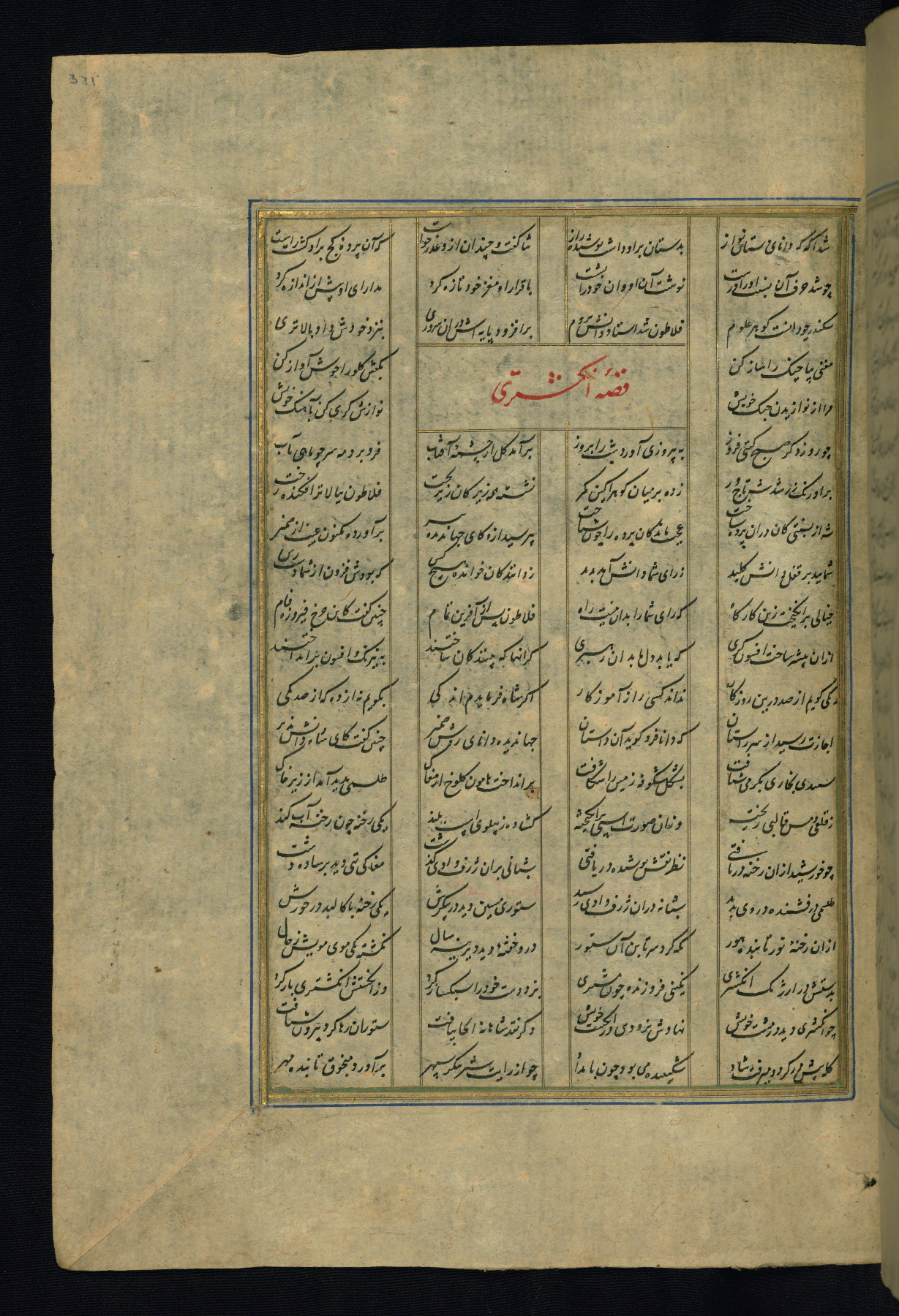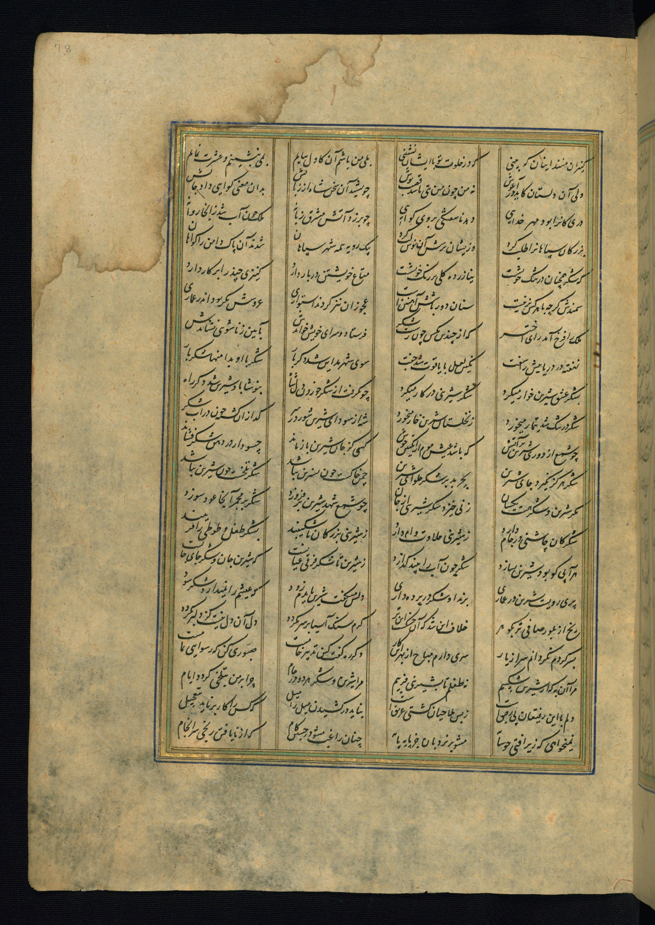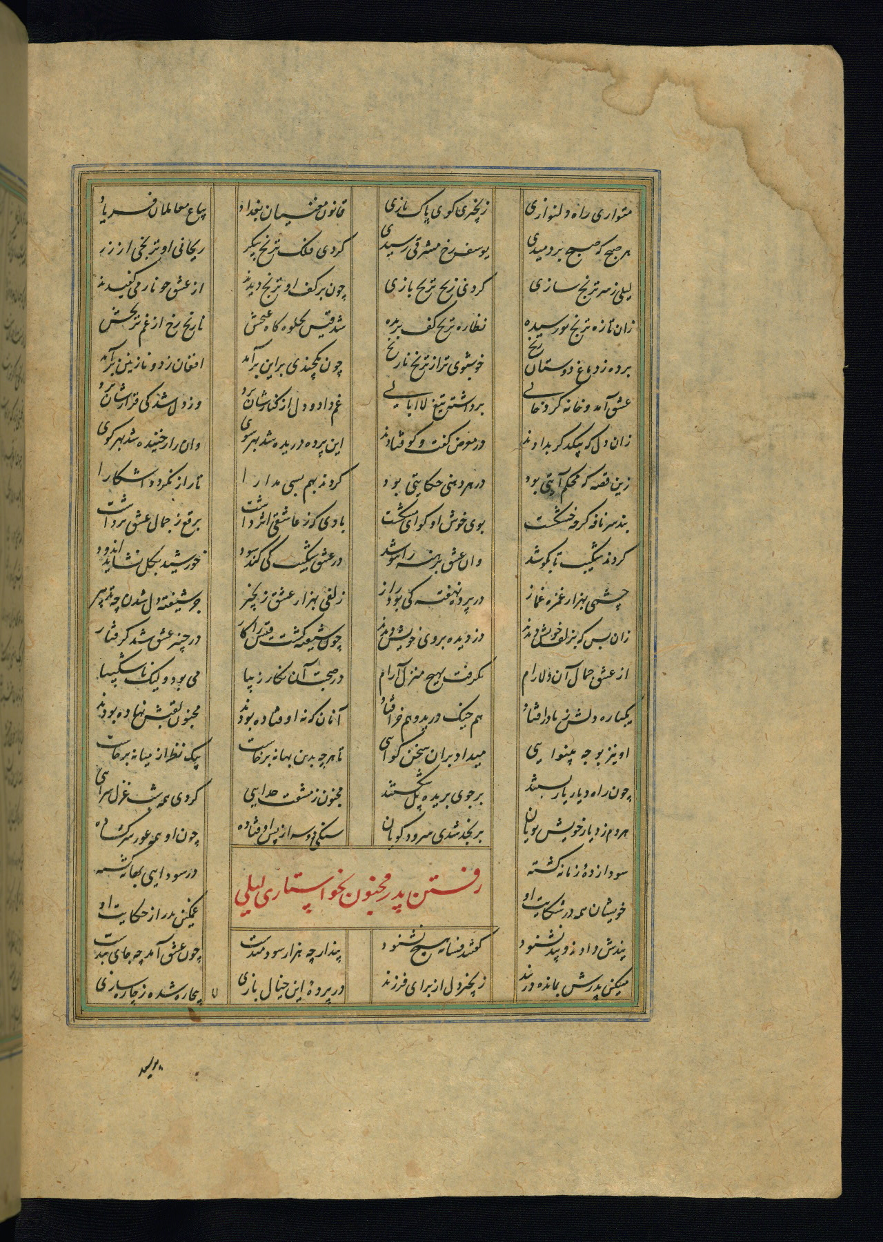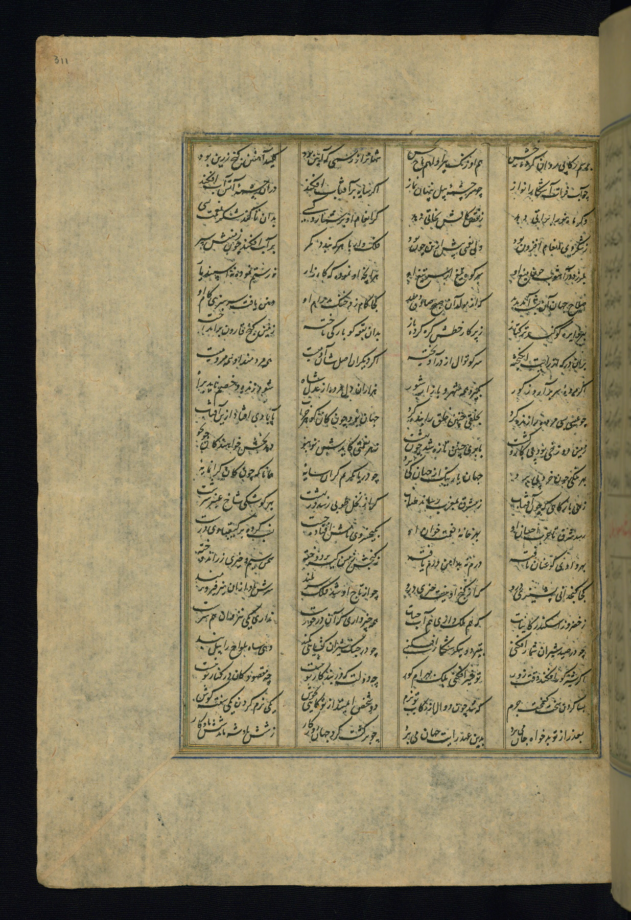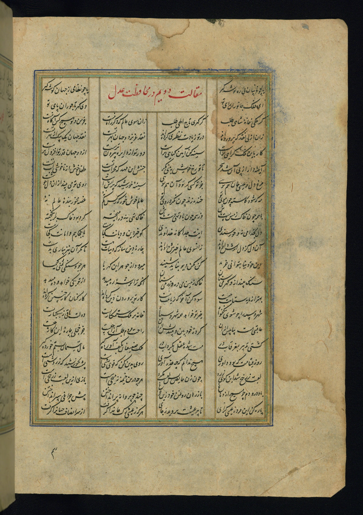 This is an illuminated and illustrated copy of the Khamsah (quintet) by Niẓāmī Ganjavī (d. 605 AH / 1209 CE), completed by Ḥabīb Allāh ibn ʿAlī ibn Ḥusām in Safavid Iran in Rabīʿ II 971 AH / 1563 CE. Illuminated titlepieces introduce the five poems, and there are thirty illustrations, the majority of which are attributable to thirteenth century AH / nineteenth CE Qajar Iran. Ownership notes and seals indicating the provenance of this manuscript are found throughout the codex (fols. 1a, 2a, 153a, 177a, 233a, 349a, and 351a). The binding is not original to the manuscript.