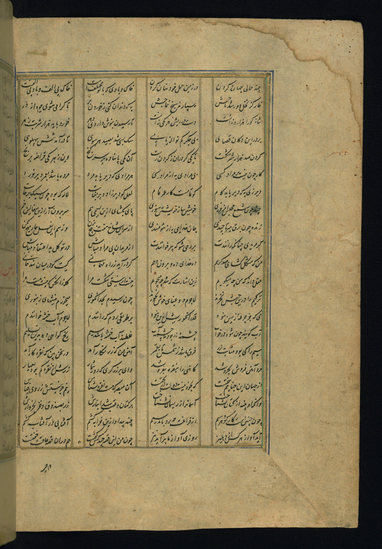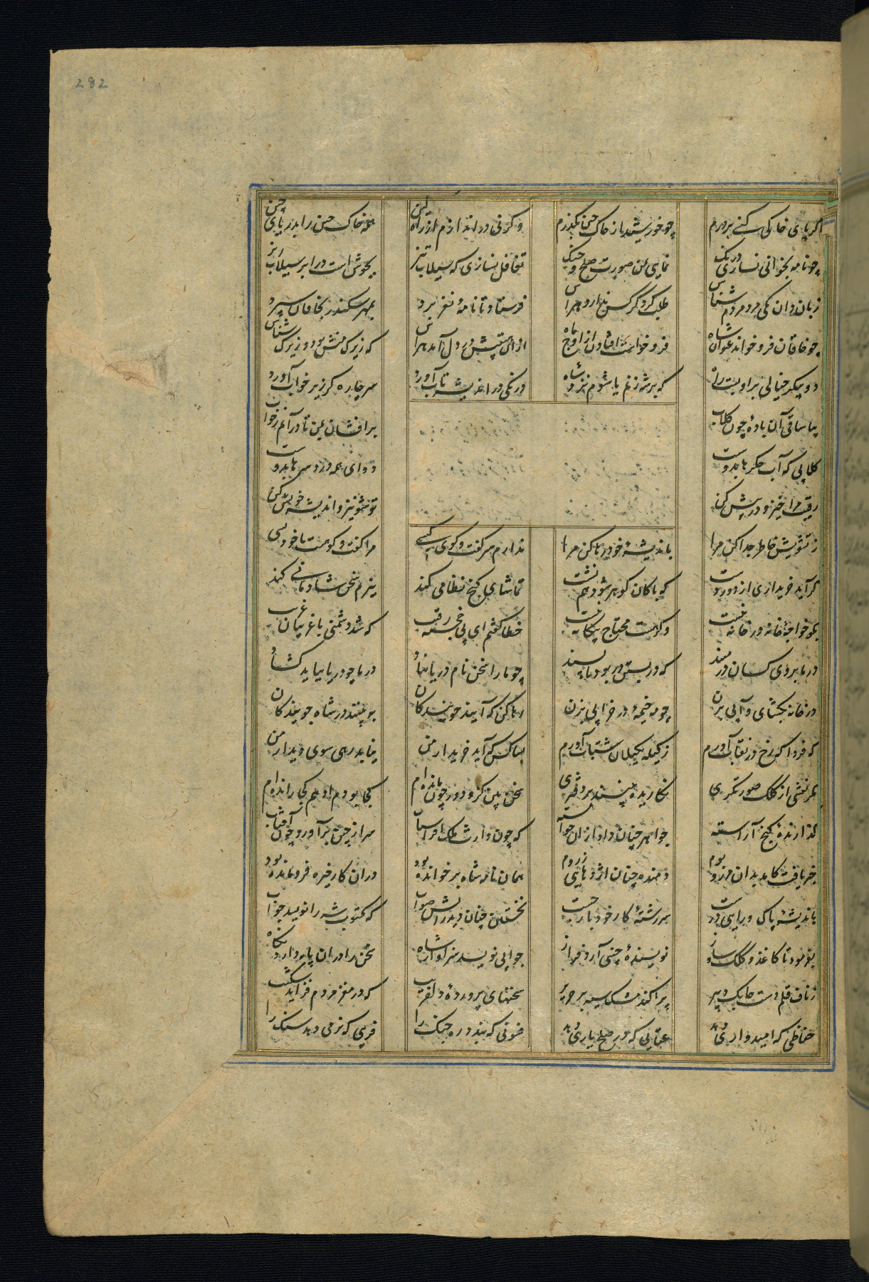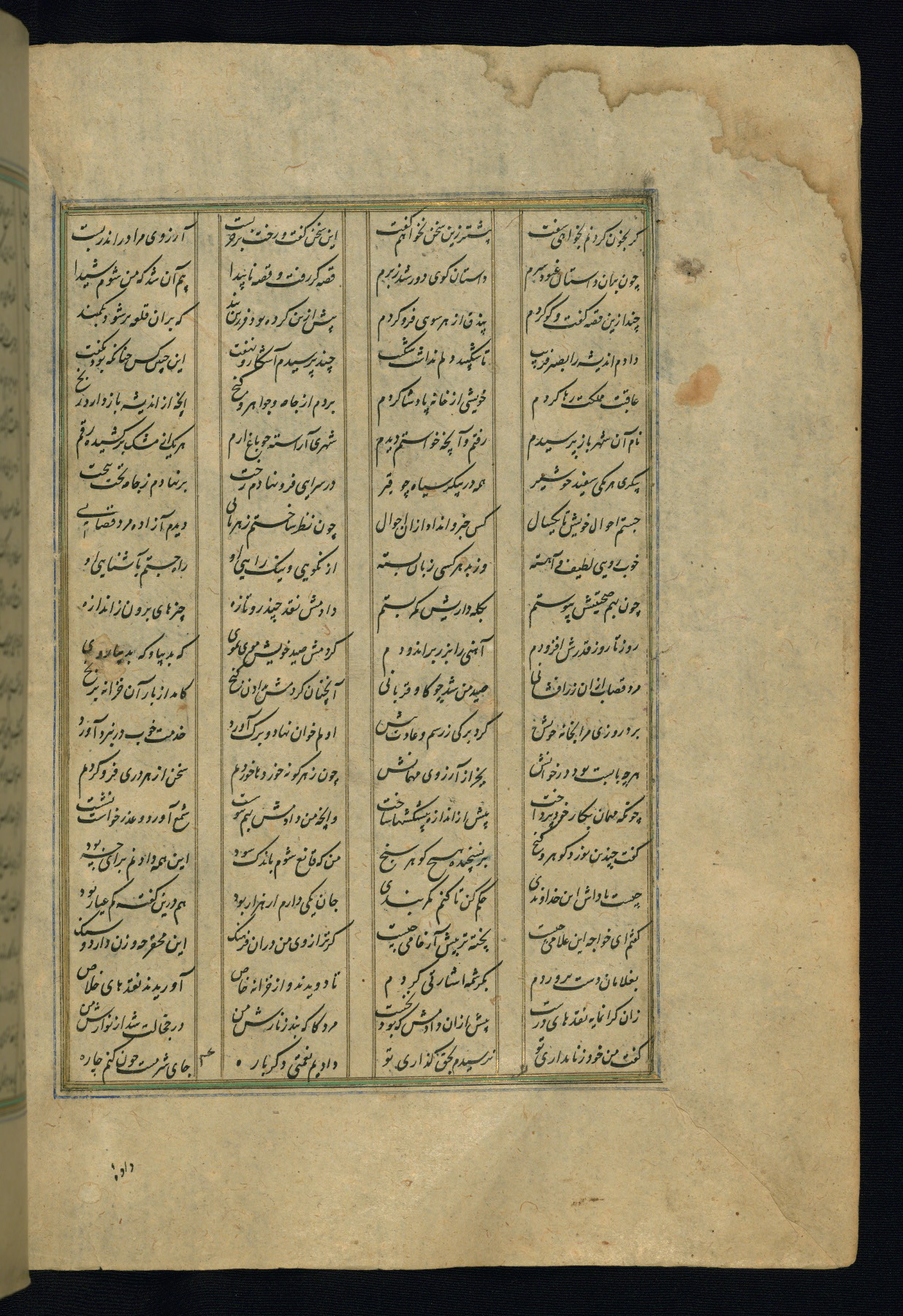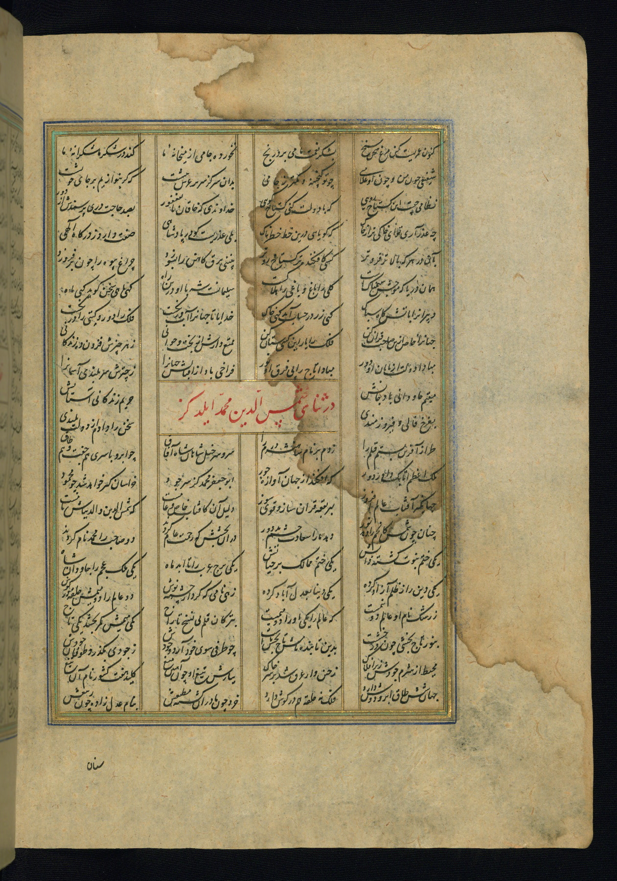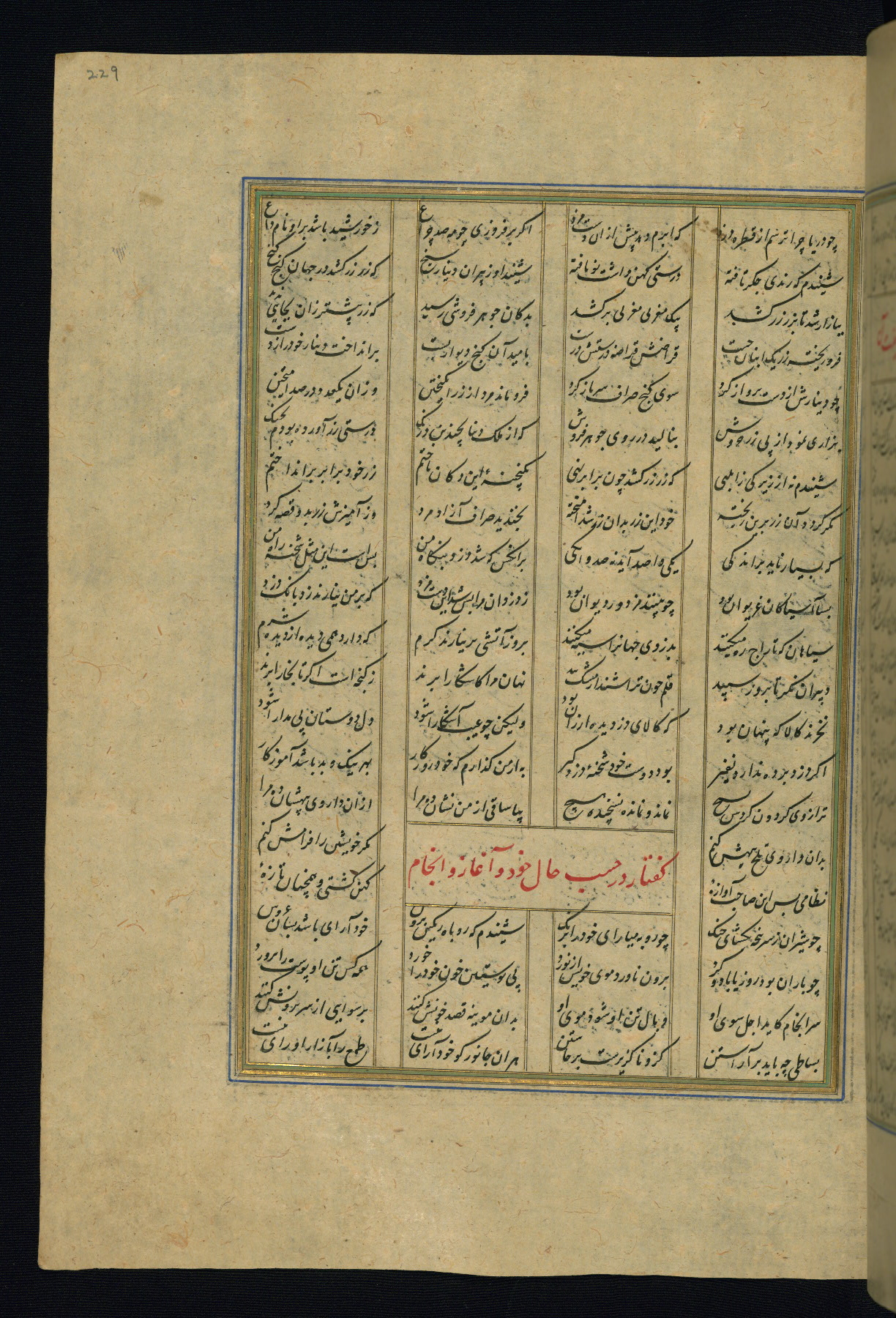This is an illuminated and illustrated copy of the Khamsah (quintet) by Niẓāmī Ganjavī (d. 605 AH / 1209 CE), completed by Ḥabīb Allāh ibn ʿAlī ibn Ḥusām in Safavid Iran in Rabīʿ II 971 AH / 1563 CE. Illuminated titlepieces introduce the five poems, and there are thirty illustrations, the majority of which are attributable to thirteenth century AH / nineteenth CE Qajar Iran. Ownership notes and seals indicating the provenance of this manuscript are found throughout the codex (fols. 1a, 2a, 153a, 177a, 233a, 349a, and 351a). The binding is not original to the manuscript.