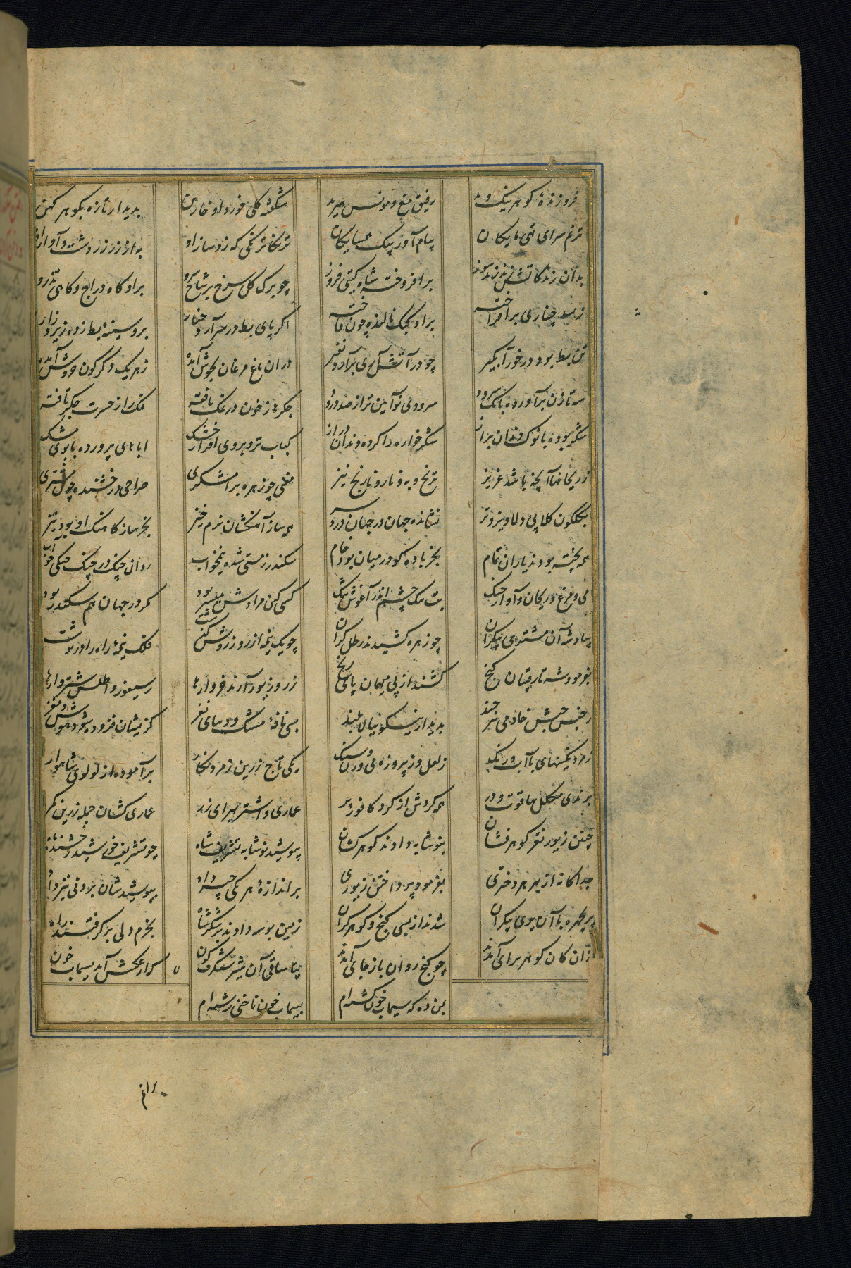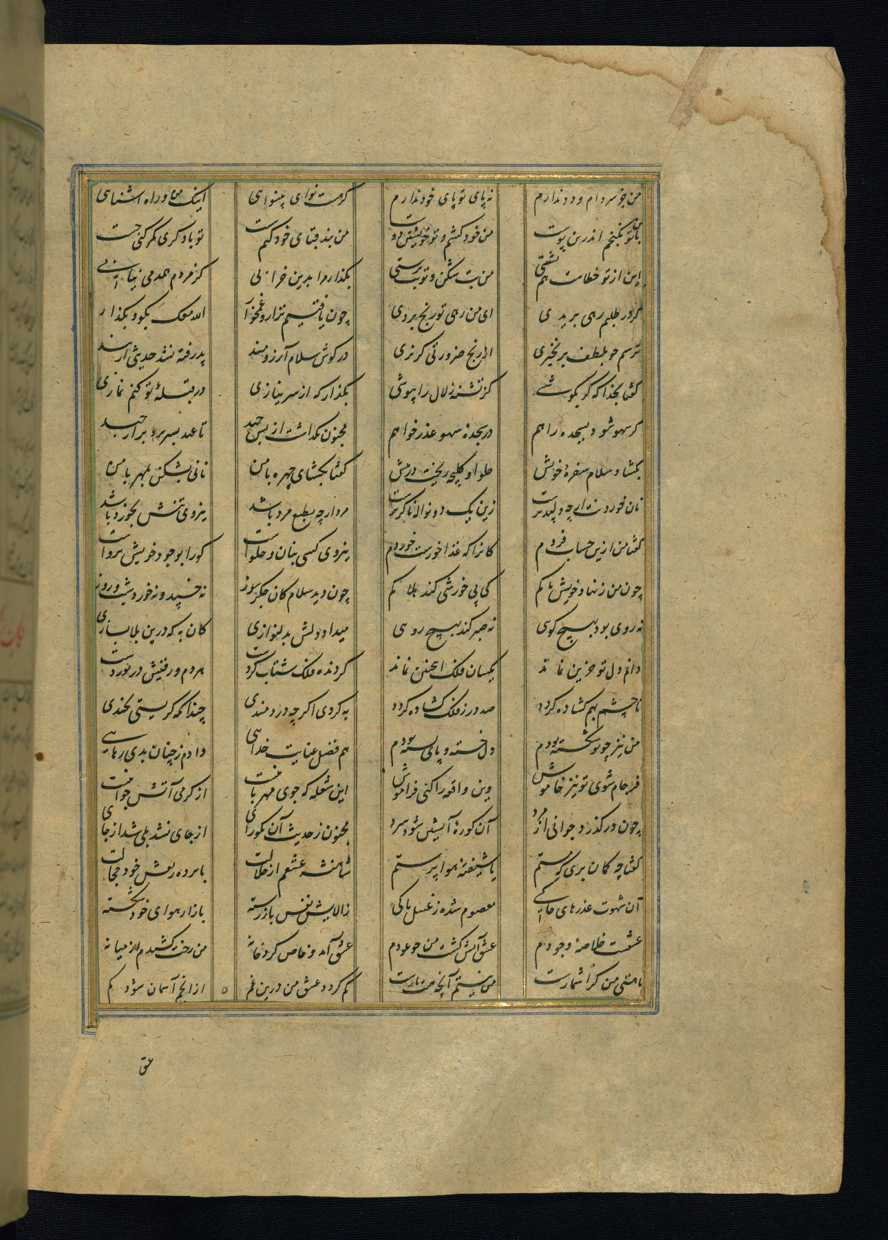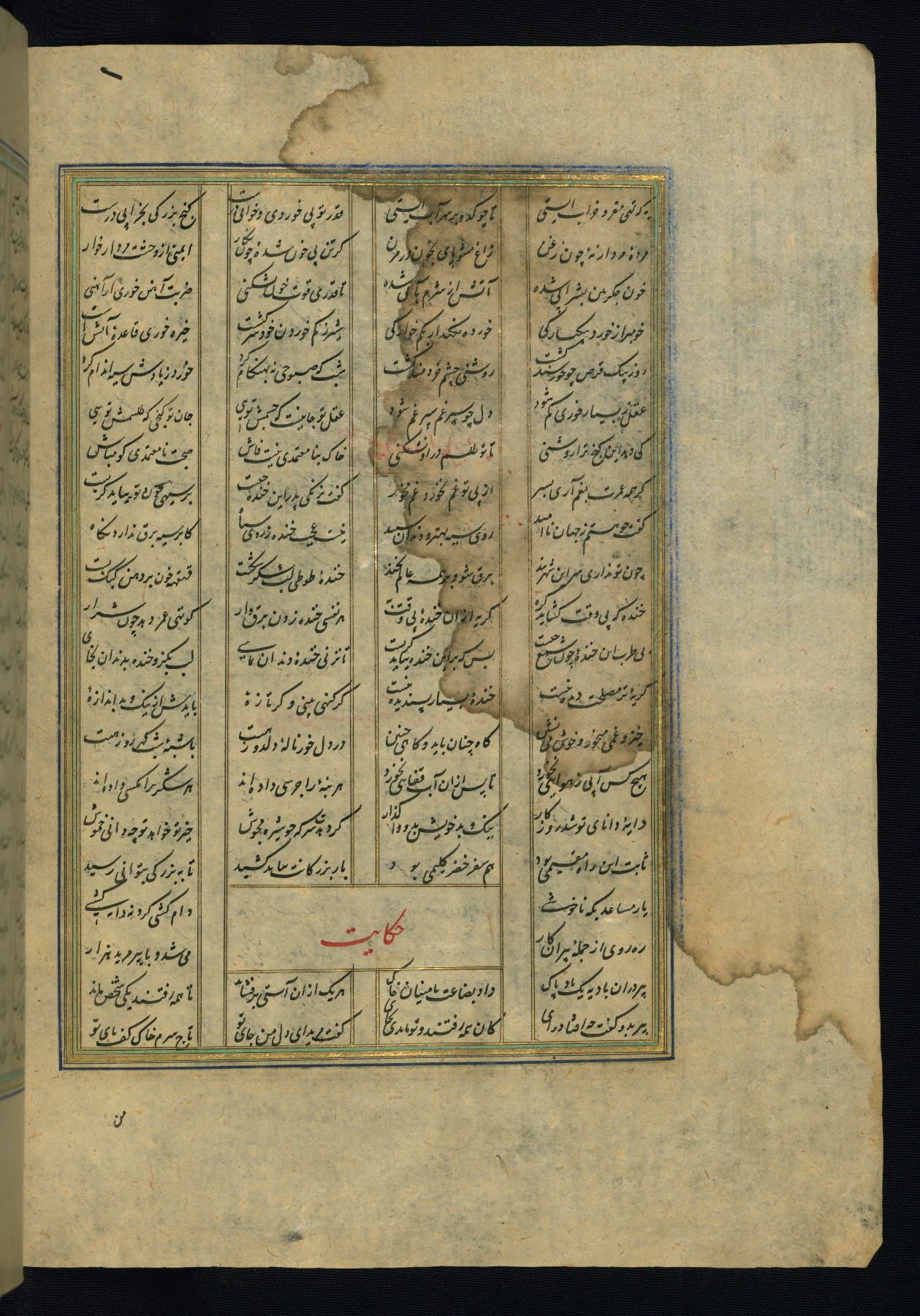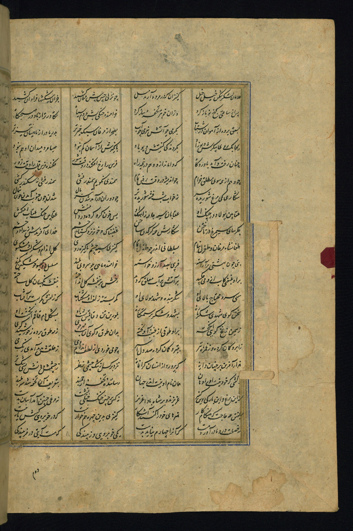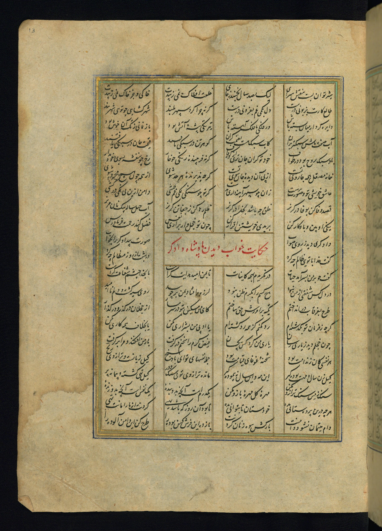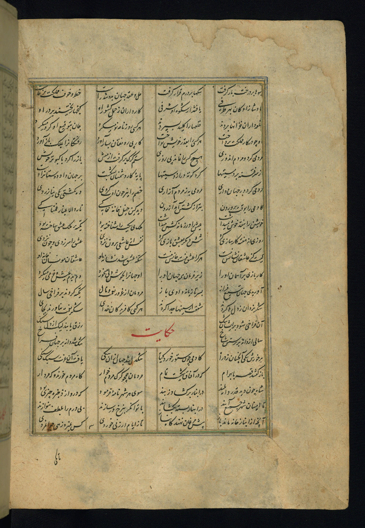 This is an illuminated and illustrated copy of the Khamsah (quintet) by Niẓāmī Ganjavī (d. 605 AH / 1209 CE), completed by Ḥabīb Allāh ibn ʿAlī ibn Ḥusām in Safavid Iran in Rabīʿ II 971 AH / 1563 CE. Illuminated titlepieces introduce the five poems, and there are thirty illustrations, the majority of which are attributable to thirteenth century AH / nineteenth CE Qajar Iran. Ownership notes and seals indicating the provenance of this manuscript are found throughout the codex (fols. 1a, 2a, 153a, 177a, 233a, 349a, and 351a). The binding is not original to the manuscript.