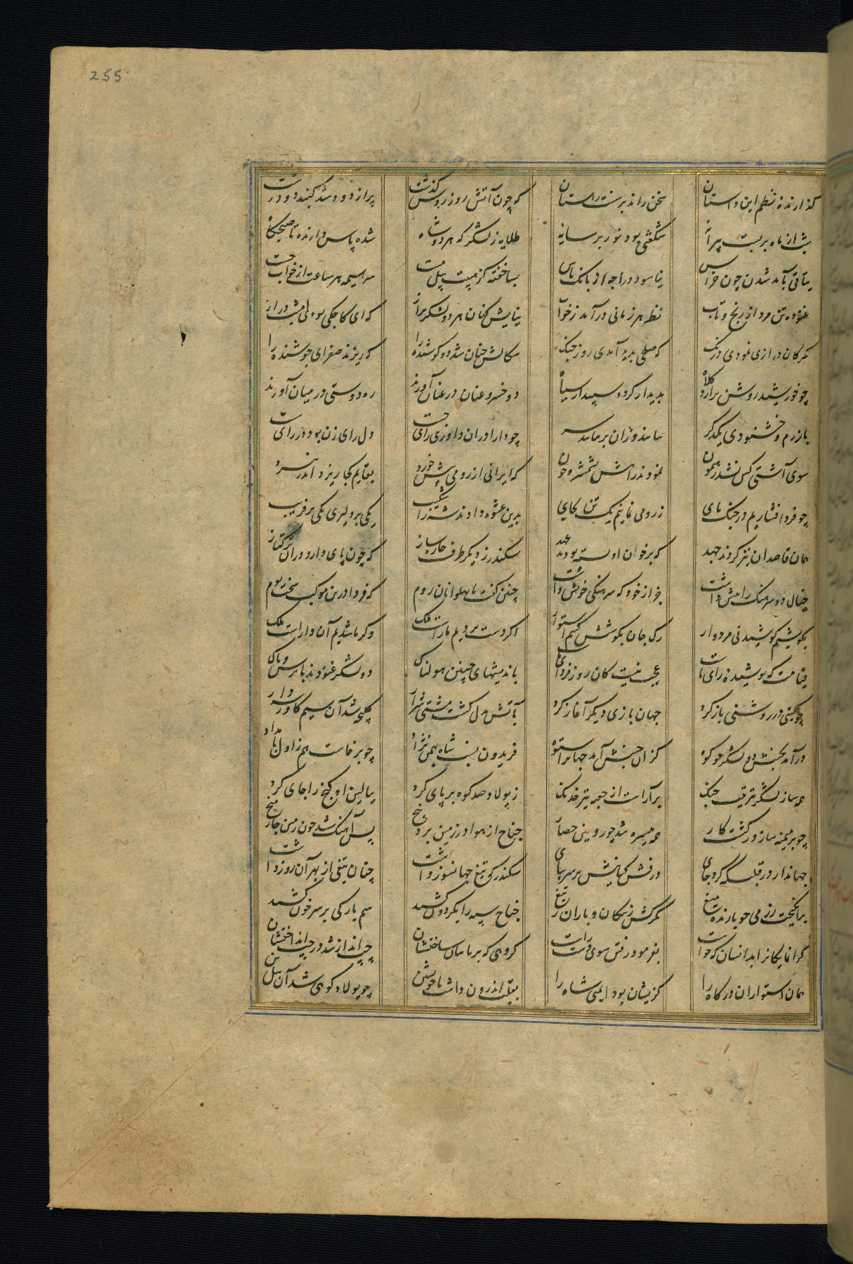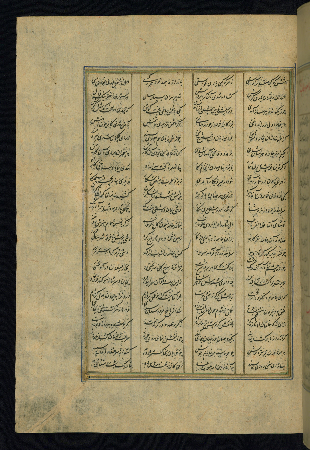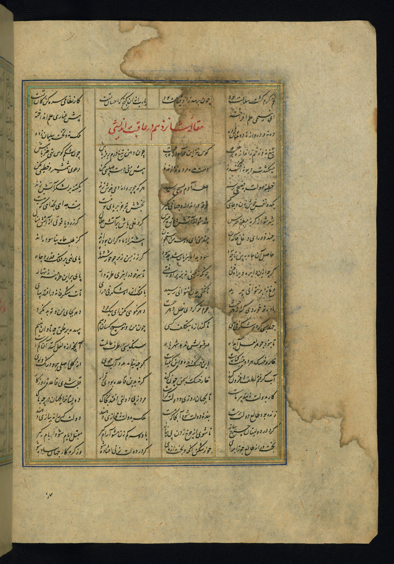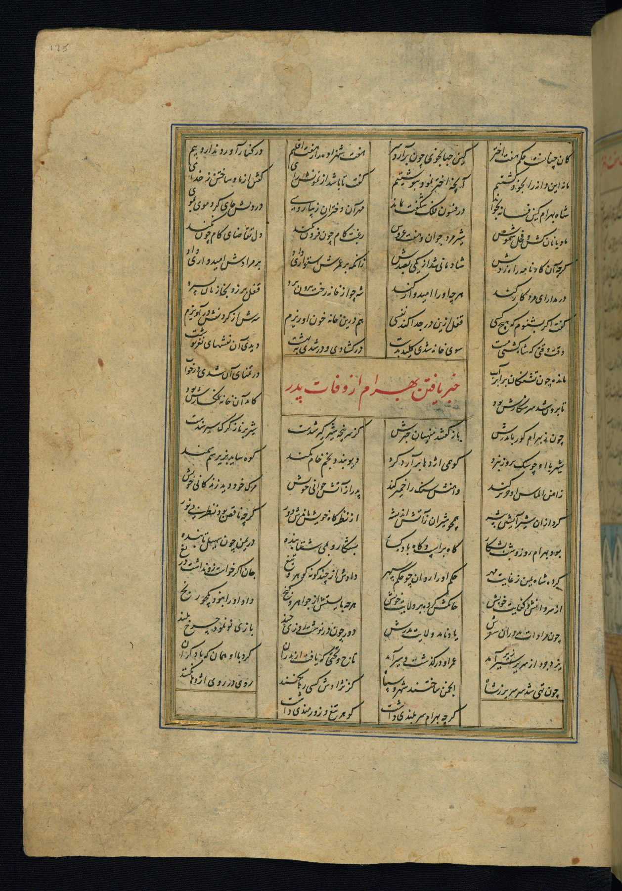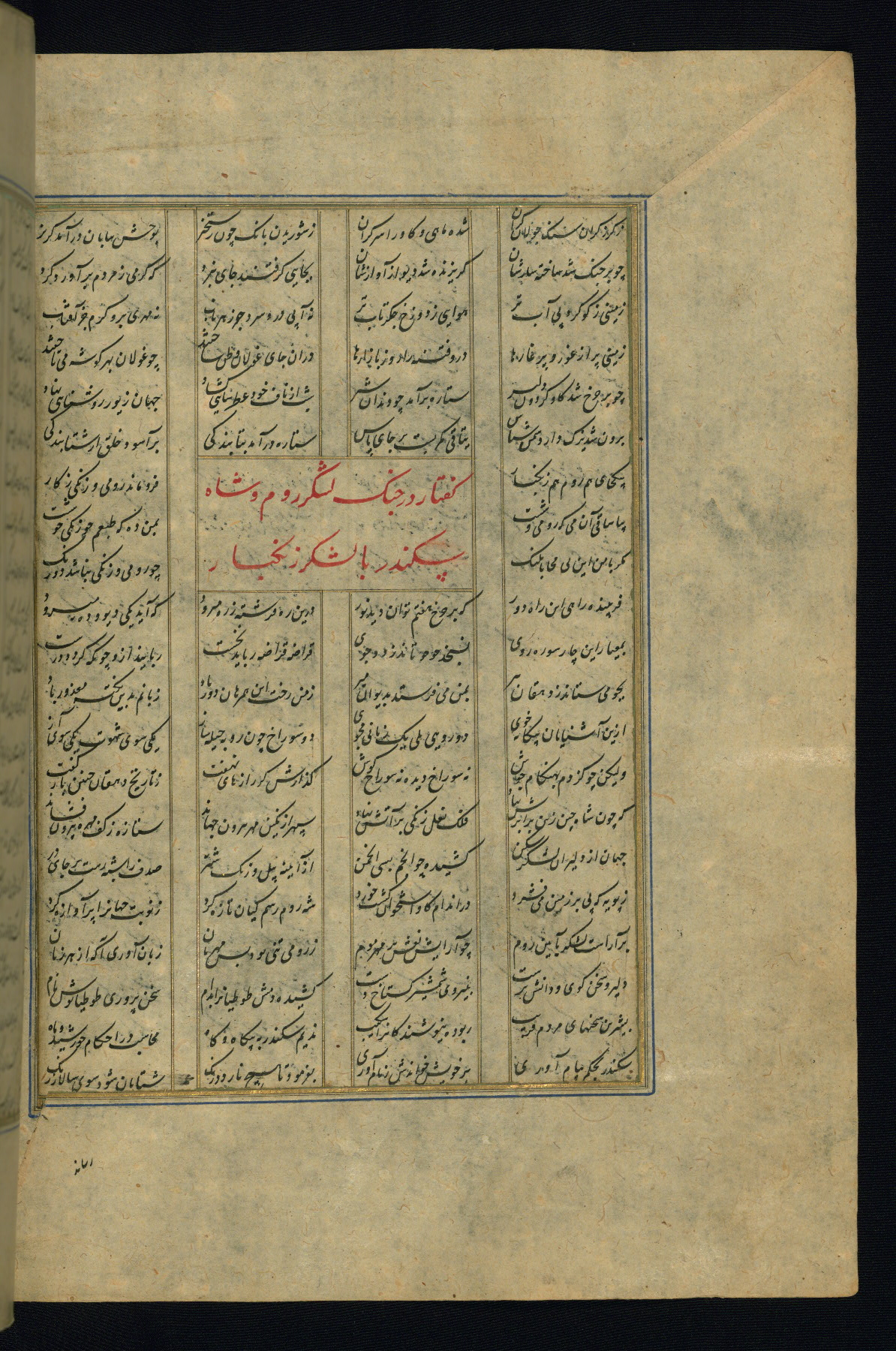This is an illuminated and illustrated copy of the Khamsah (quintet) by Niẓāmī Ganjavī (d. 605 AH / 1209 CE), completed by Ḥabīb Allāh ibn ʿAlī ibn Ḥusām in Safavid Iran in Rabīʿ II 971 AH / 1563 CE. Illuminated titlepieces introduce the five poems, and there are thirty illustrations, the majority of which are attributable to thirteenth century AH / nineteenth CE Qajar Iran. Ownership notes and seals indicating the provenance of this manuscript are found throughout the codex (fols. 1a, 2a, 153a, 177a, 233a, 349a, and 351a). The binding is not original to the manuscript.