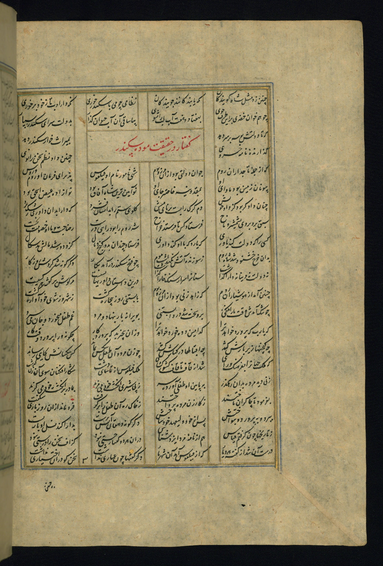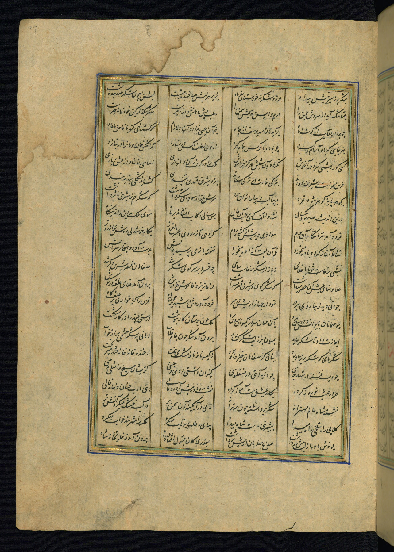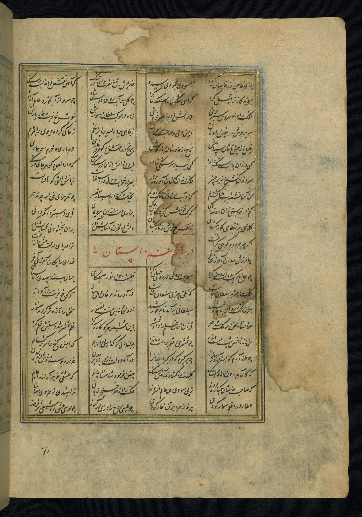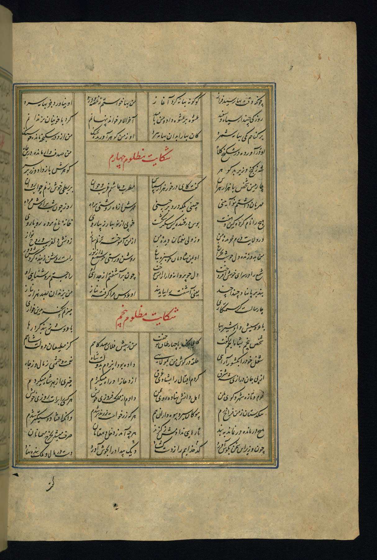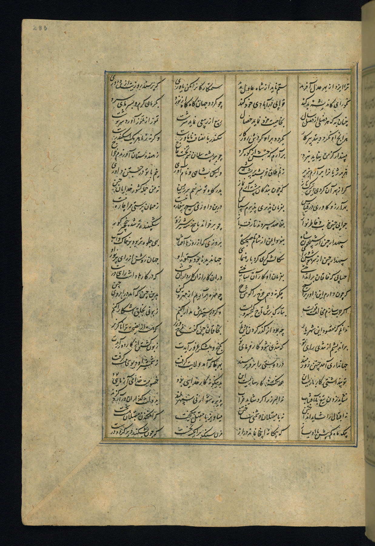This is an illuminated and illustrated copy of the Khamsah (quintet) by Niẓāmī Ganjavī (d. 605 AH / 1209 CE), completed by Ḥabīb Allāh ibn ʿAlī ibn Ḥusām in Safavid Iran in Rabīʿ II 971 AH / 1563 CE. Illuminated titlepieces introduce the five poems, and there are thirty illustrations, the majority of which are attributable to thirteenth century AH / nineteenth CE Qajar Iran. Ownership notes and seals indicating the provenance of this manuscript are found throughout the codex (fols. 1a, 2a, 153a, 177a, 233a, 349a, and 351a). The binding is not original to the manuscript.