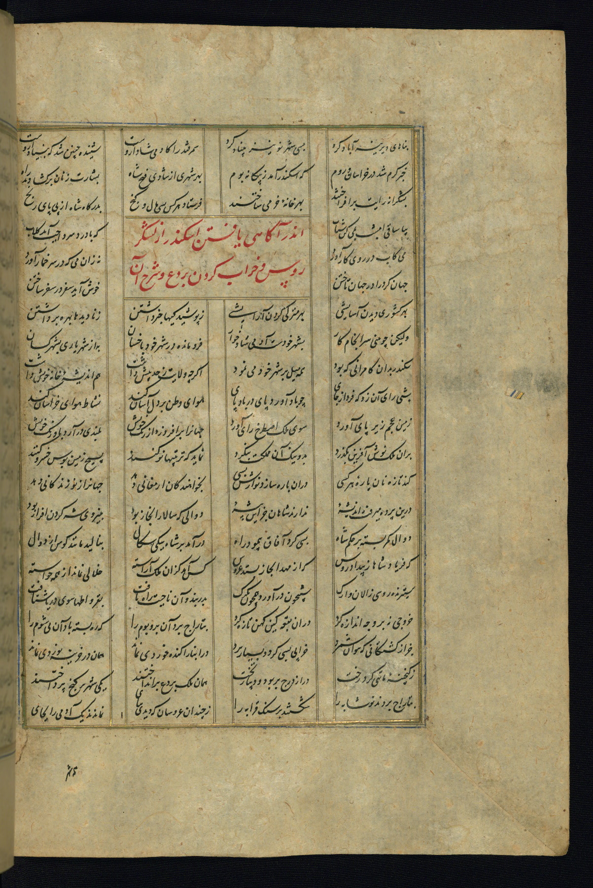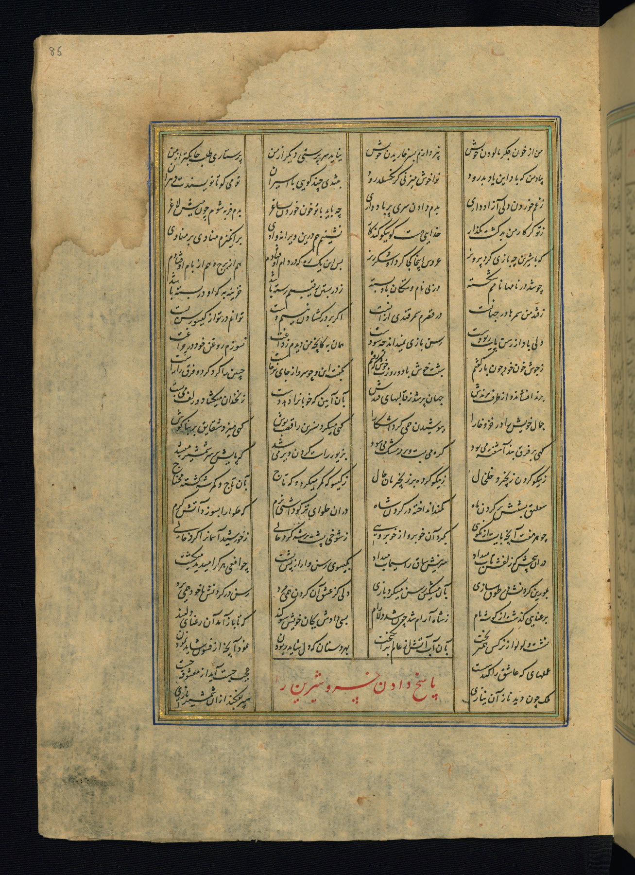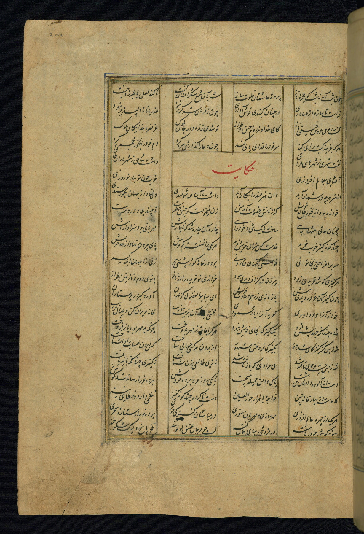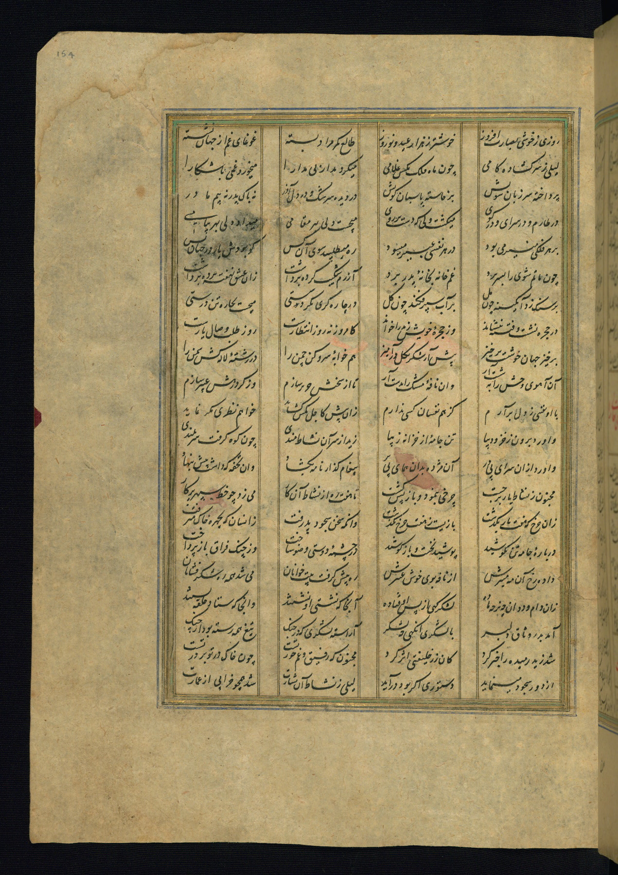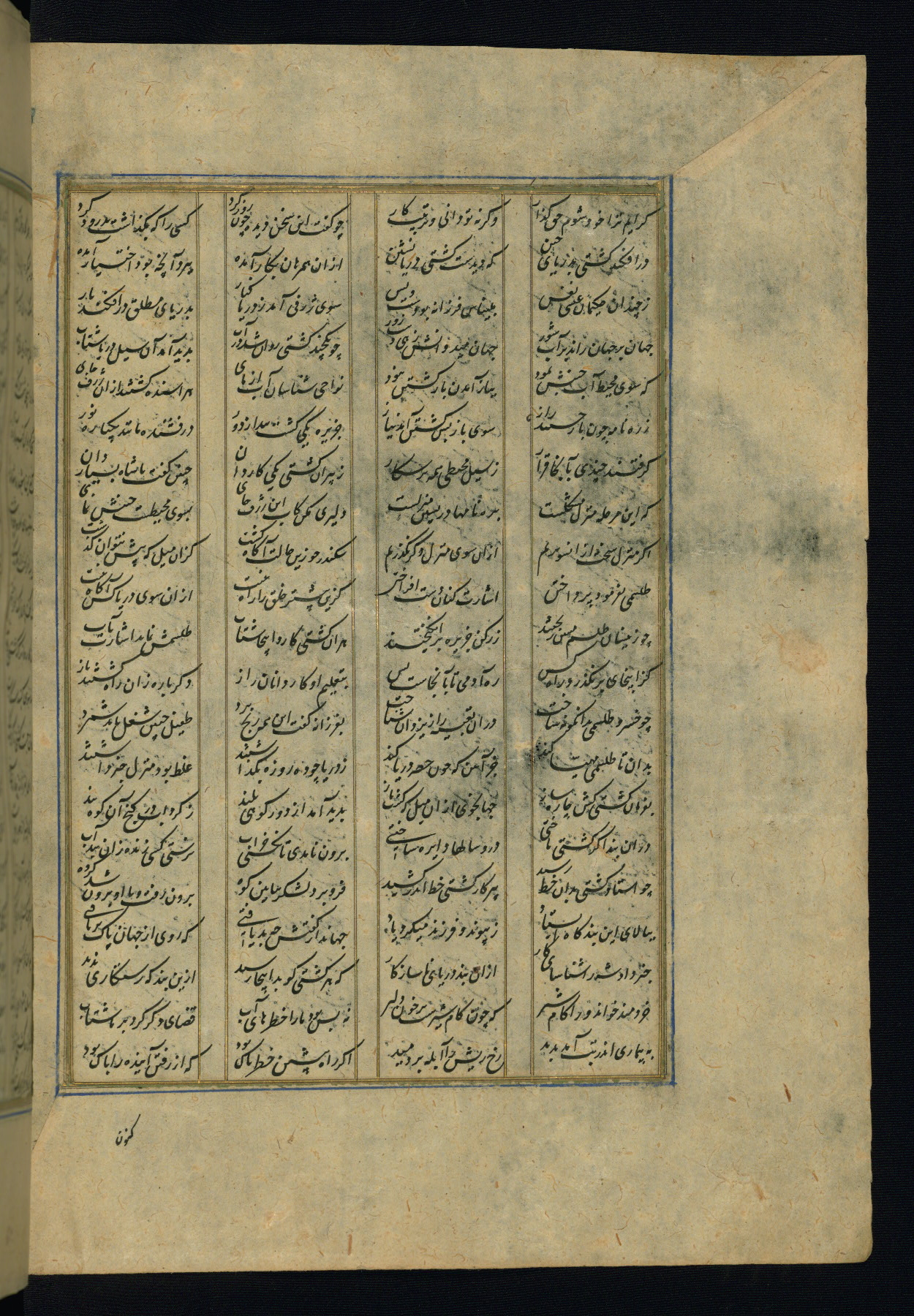 This is an illuminated and illustrated copy of the Khamsah (quintet) by Niẓāmī Ganjavī (d. 605 AH / 1209 CE), completed by Ḥabīb Allāh ibn ʿAlī ibn Ḥusām in Safavid Iran in Rabīʿ II 971 AH / 1563 CE. Illuminated titlepieces introduce the five poems, and there are thirty illustrations, the majority of which are attributable to thirteenth century AH / nineteenth CE Qajar Iran. Ownership notes and seals indicating the provenance of this manuscript are found throughout the codex (fols. 1a, 2a, 153a, 177a, 233a, 349a, and 351a). The binding is not original to the manuscript.