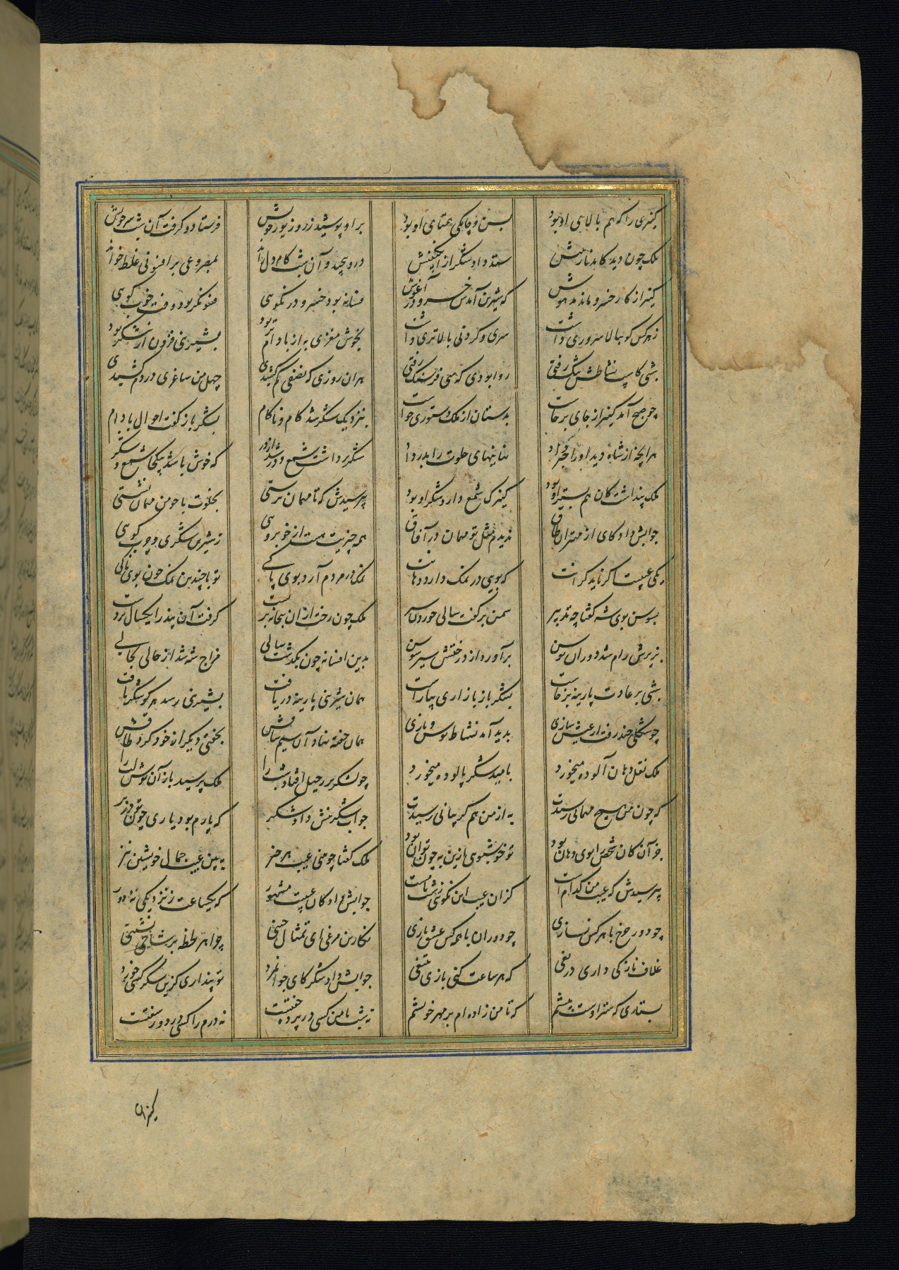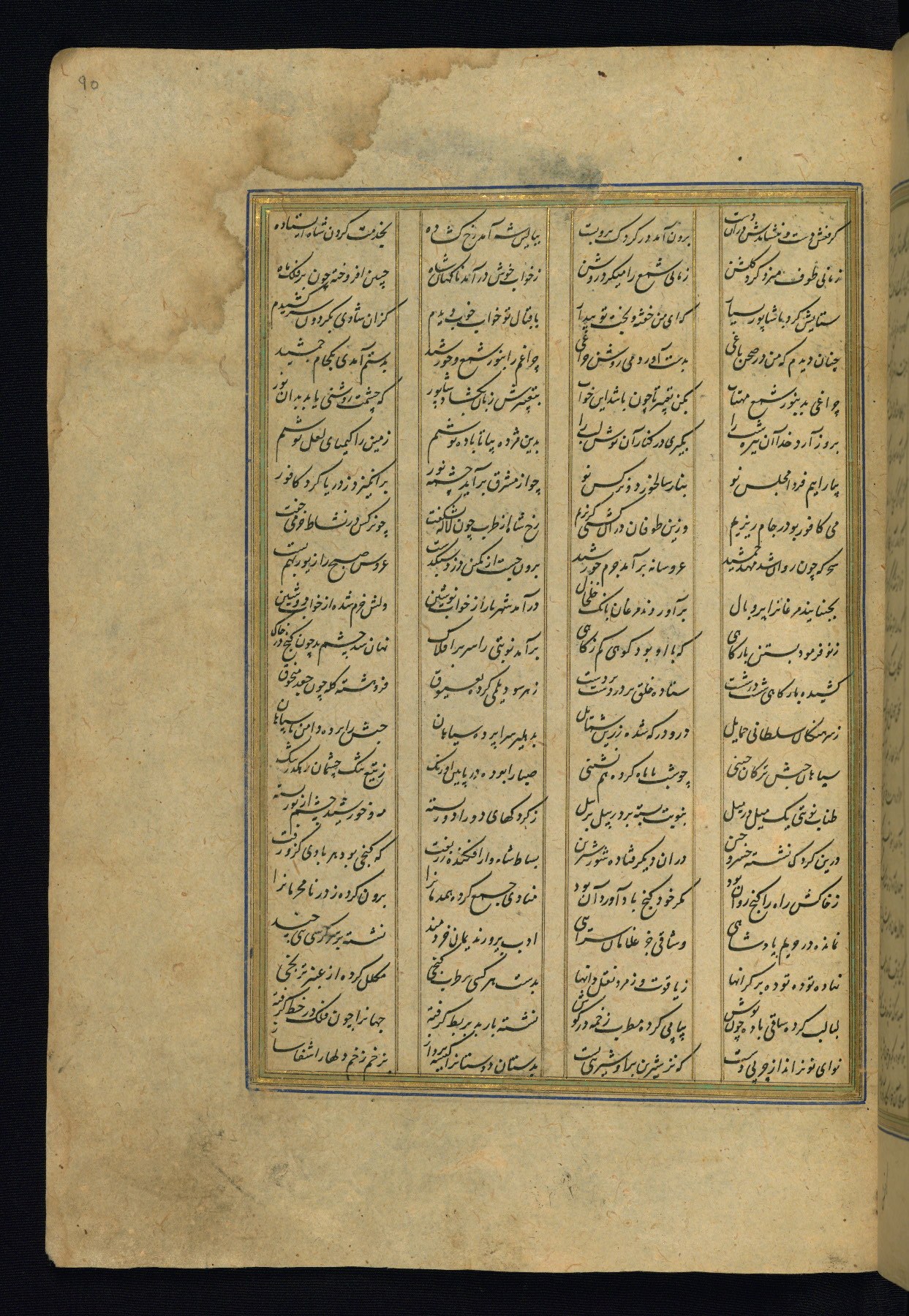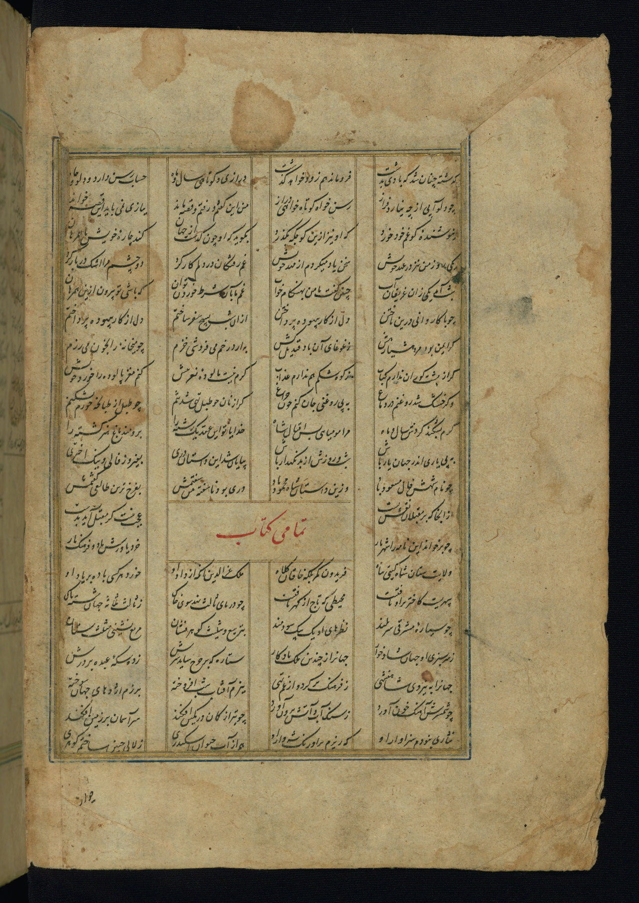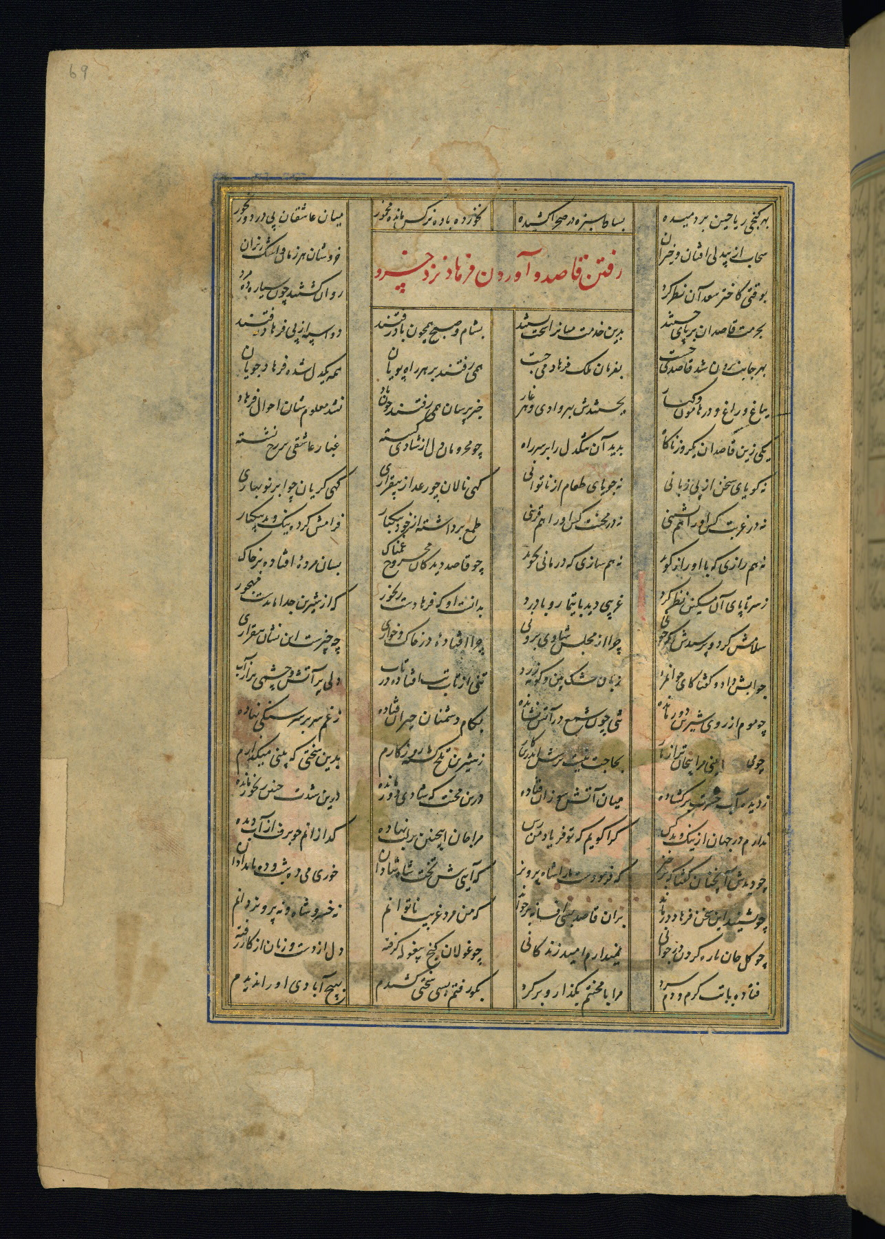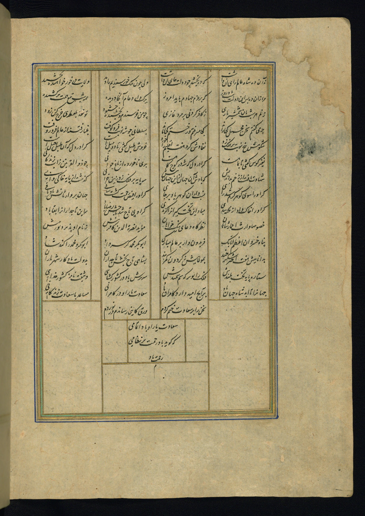 This is an illuminated and illustrated copy of the Khamsah (quintet) by Niẓāmī Ganjavī (d. 605 AH / 1209 CE), completed by Ḥabīb Allāh ibn ʿAlī ibn Ḥusām in Safavid Iran in Rabīʿ II 971 AH / 1563 CE. Illuminated titlepieces introduce the five poems, and there are thirty illustrations, the majority of which are attributable to thirteenth century AH / nineteenth CE Qajar Iran. Ownership notes and seals indicating the provenance of this manuscript are found throughout the codex (fols. 1a, 2a, 153a, 177a, 233a, 349a, and 351a). The binding is not original to the manuscript.