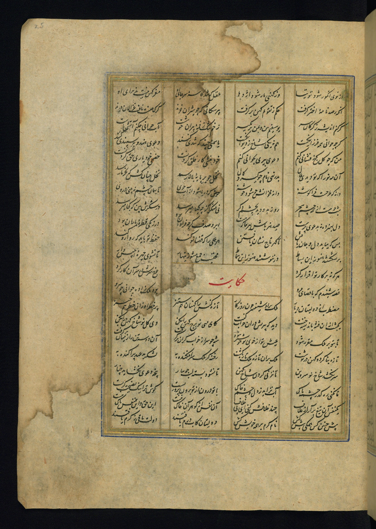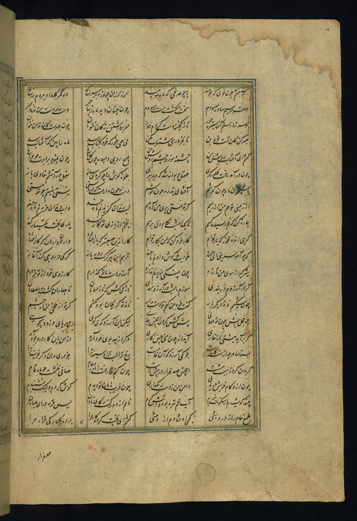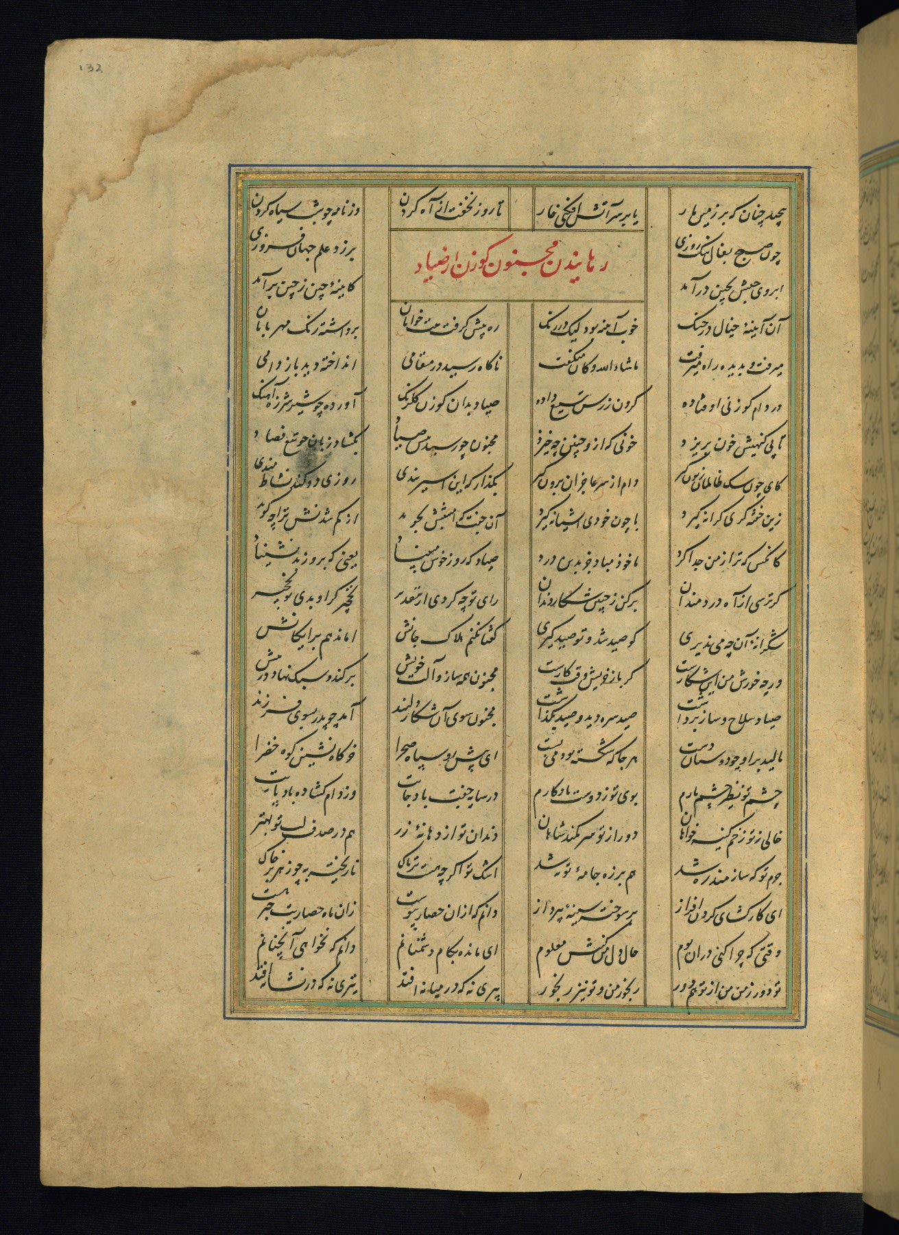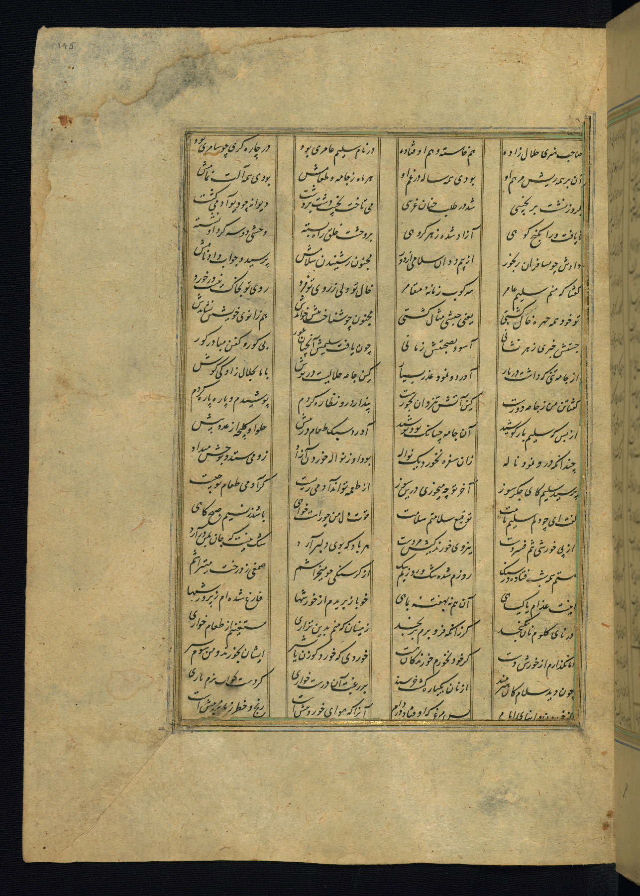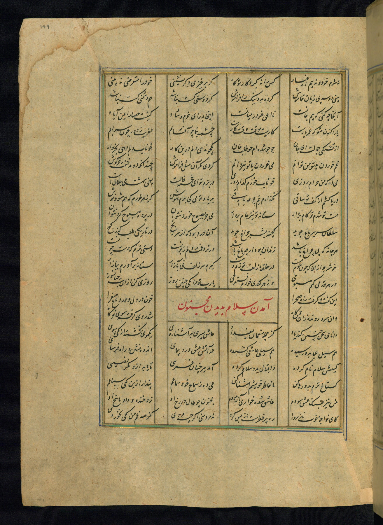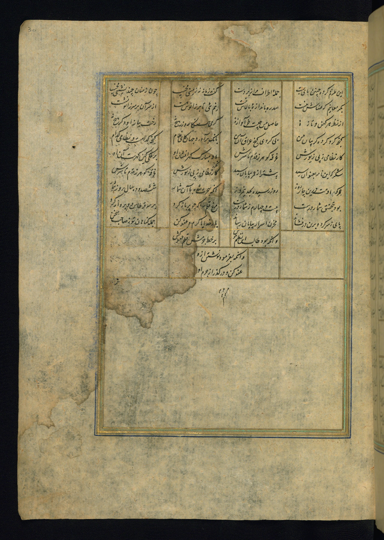 This is an illuminated and illustrated copy of the Khamsah (quintet) by Niẓāmī Ganjavī (d. 605 AH / 1209 CE), completed by Ḥabīb Allāh ibn ʿAlī ibn Ḥusām in Safavid Iran in Rabīʿ II 971 AH / 1563 CE. Illuminated titlepieces introduce the five poems, and there are thirty illustrations, the majority of which are attributable to thirteenth century AH / nineteenth CE Qajar Iran. Ownership notes and seals indicating the provenance of this manuscript are found throughout the codex (fols. 1a, 2a, 153a, 177a, 233a, 349a, and 351a). The binding is not original to the manuscript.