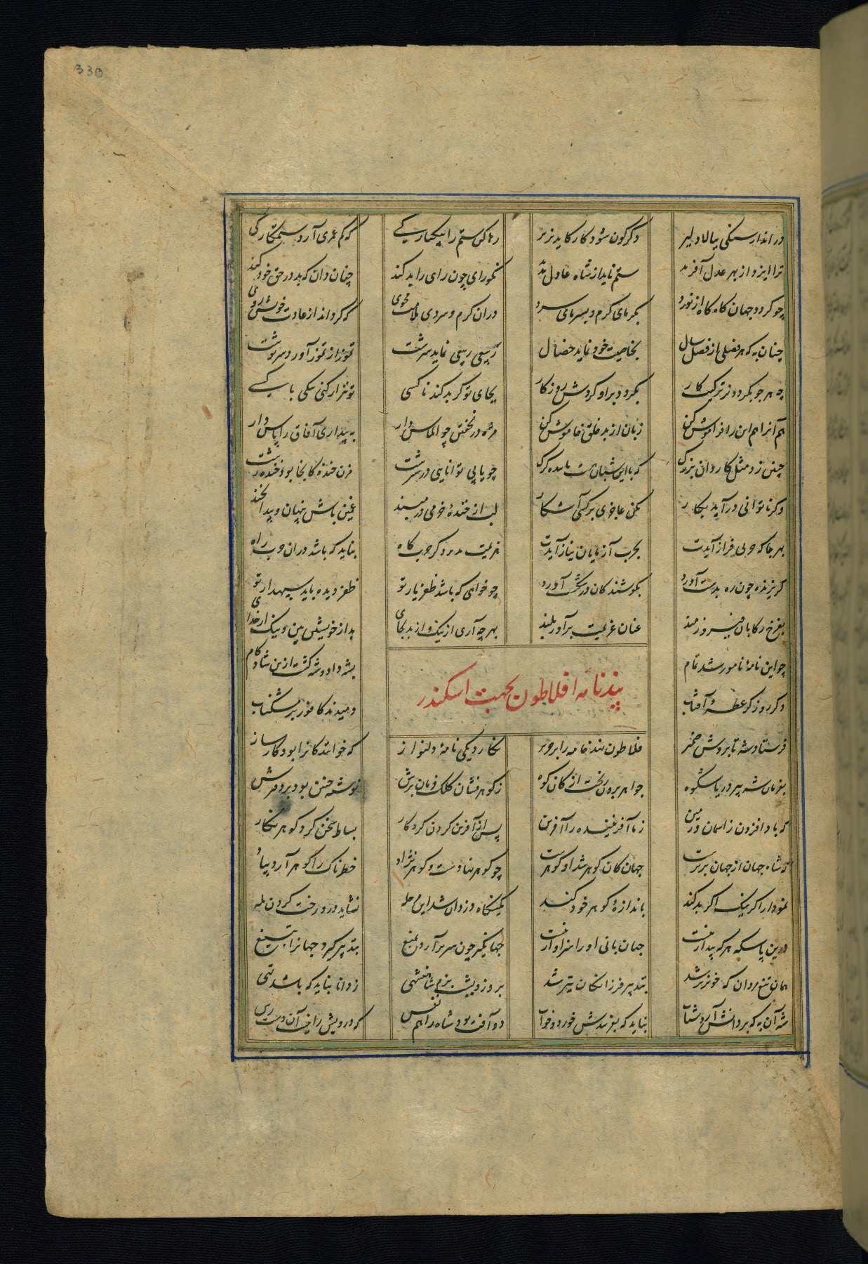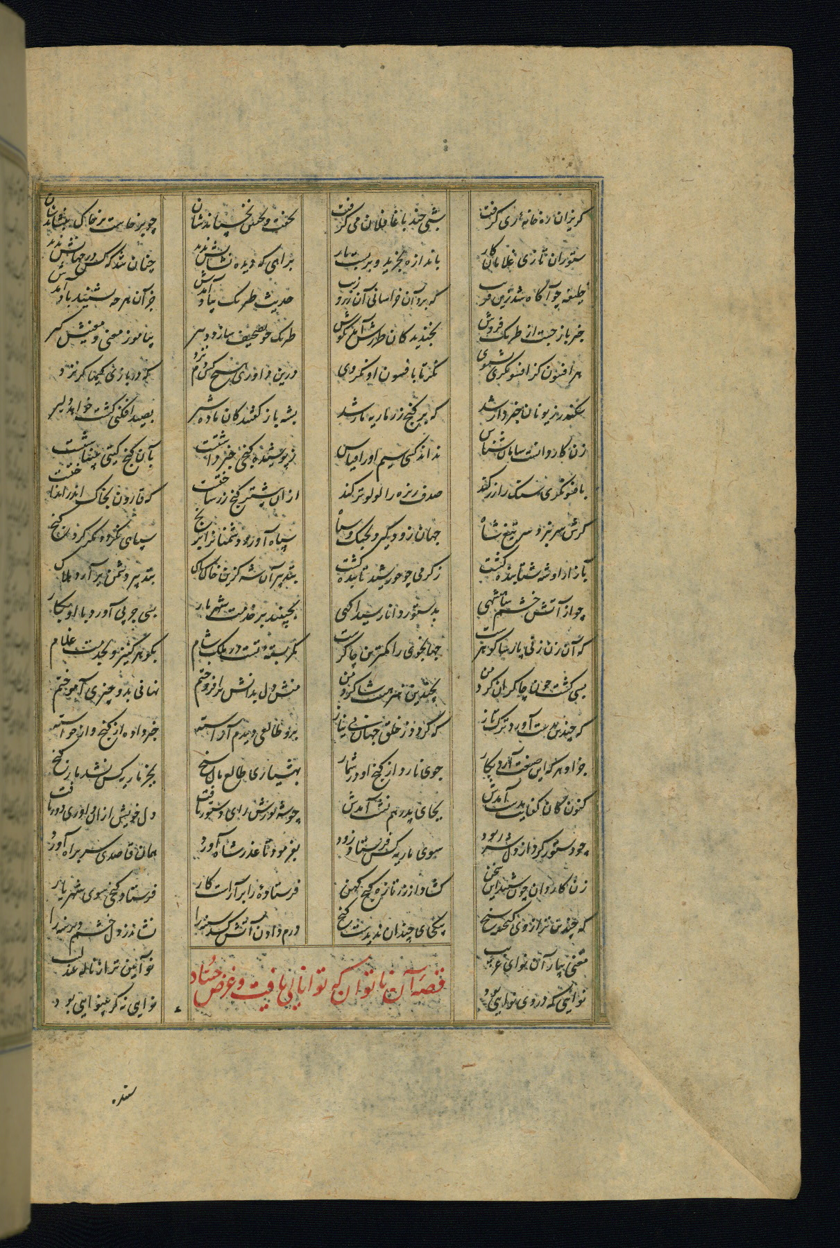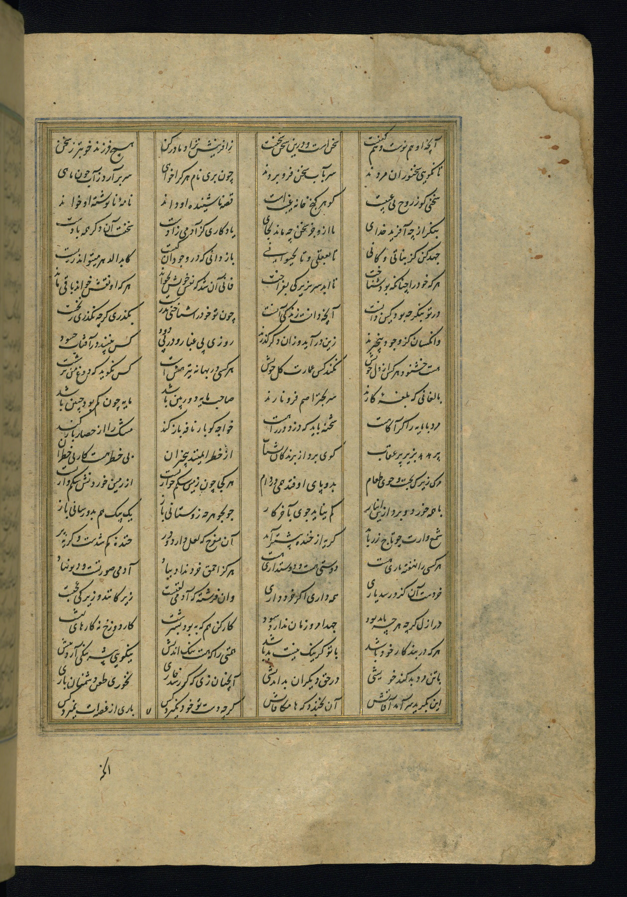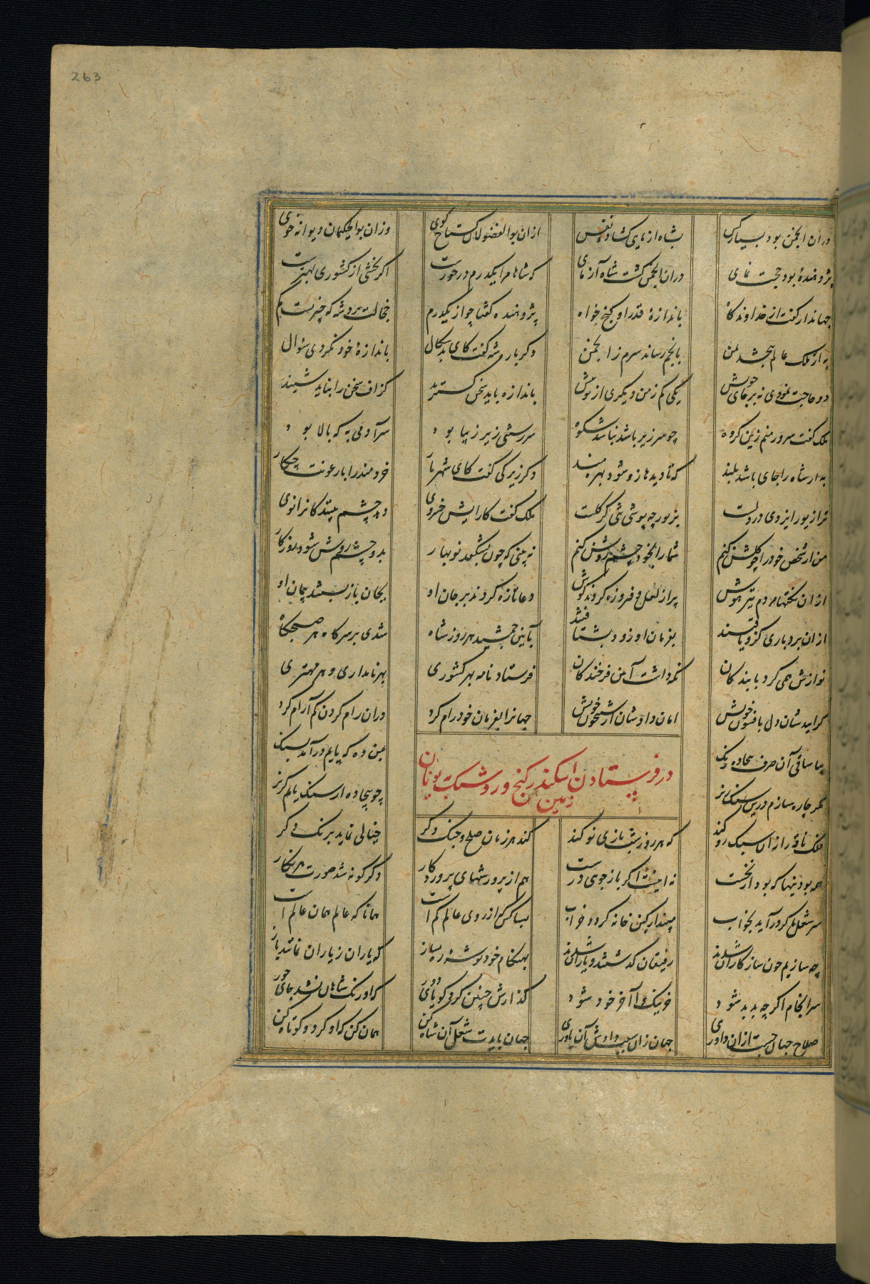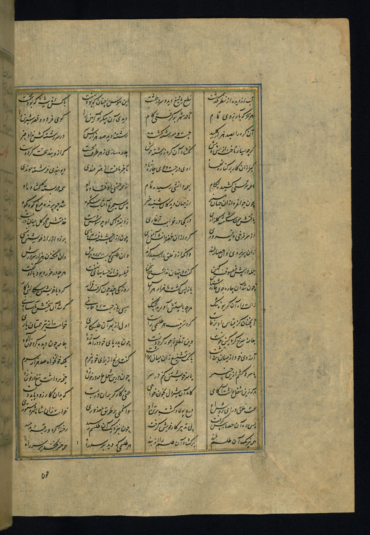 This is an illuminated and illustrated copy of the Khamsah (quintet) by Niẓāmī Ganjavī (d. 605 AH / 1209 CE), completed by Ḥabīb Allāh ibn ʿAlī ibn Ḥusām in Safavid Iran in Rabīʿ II 971 AH / 1563 CE. Illuminated titlepieces introduce the five poems, and there are thirty illustrations, the majority of which are attributable to thirteenth century AH / nineteenth CE Qajar Iran. Ownership notes and seals indicating the provenance of this manuscript are found throughout the codex (fols. 1a, 2a, 153a, 177a, 233a, 349a, and 351a). The binding is not original to the manuscript.