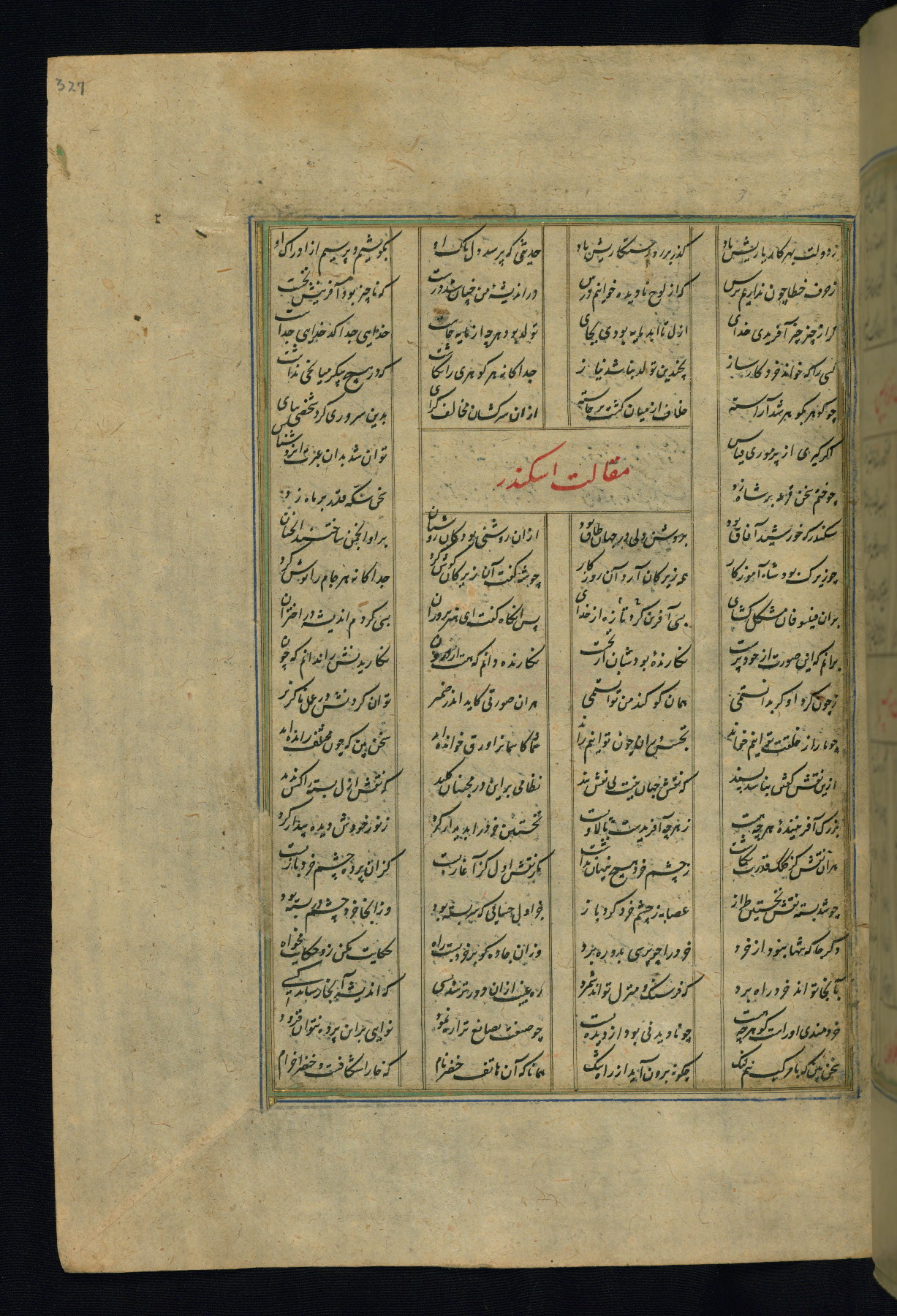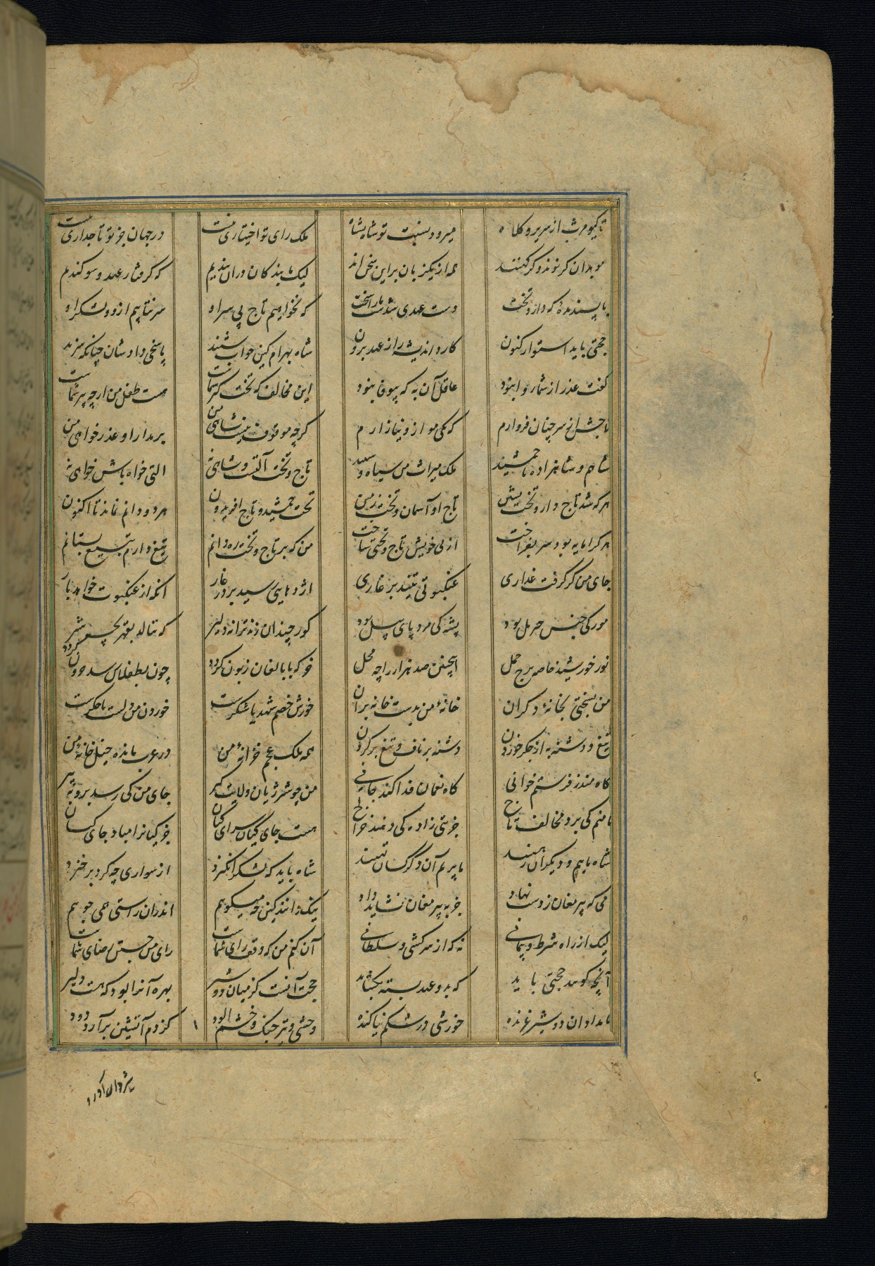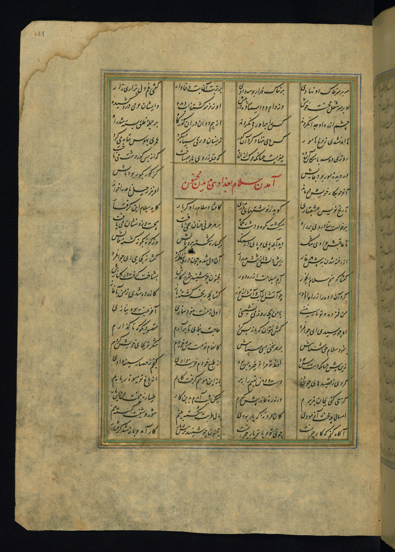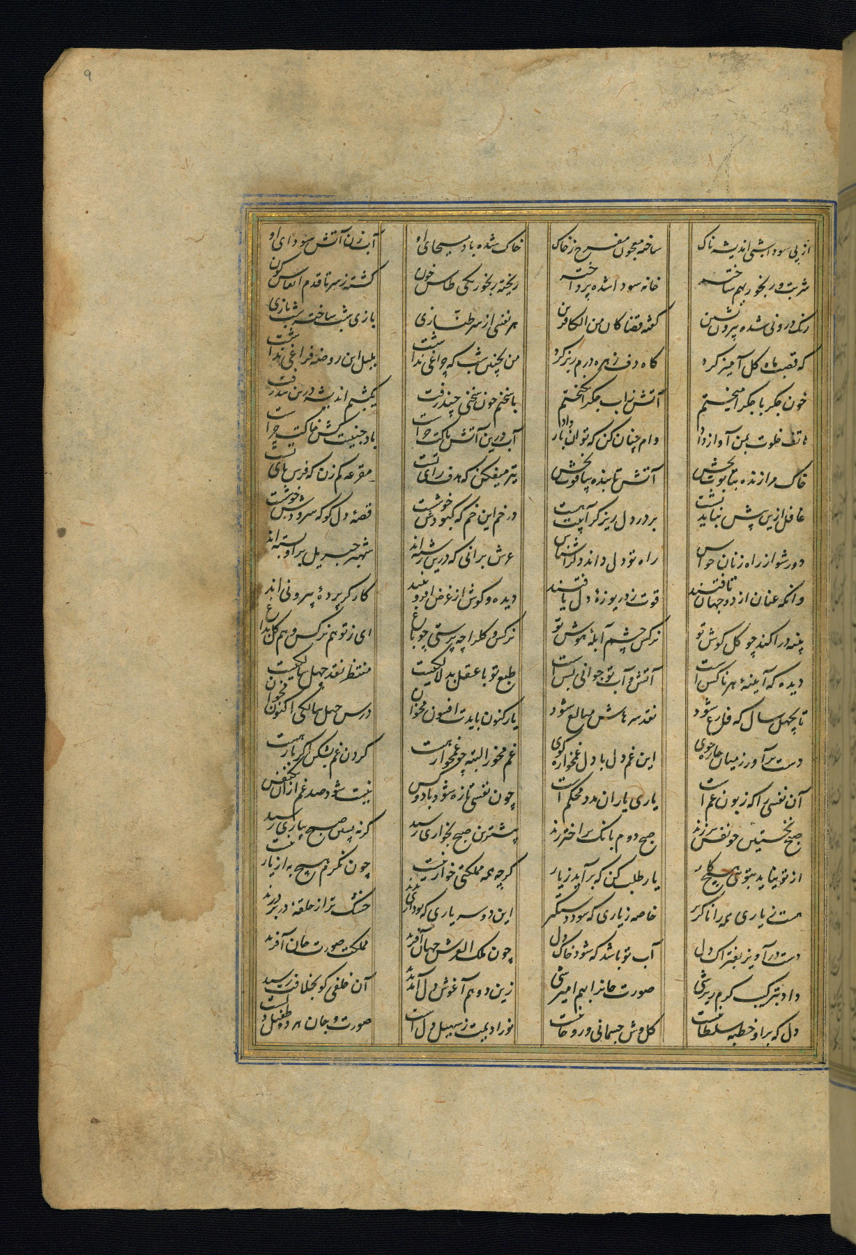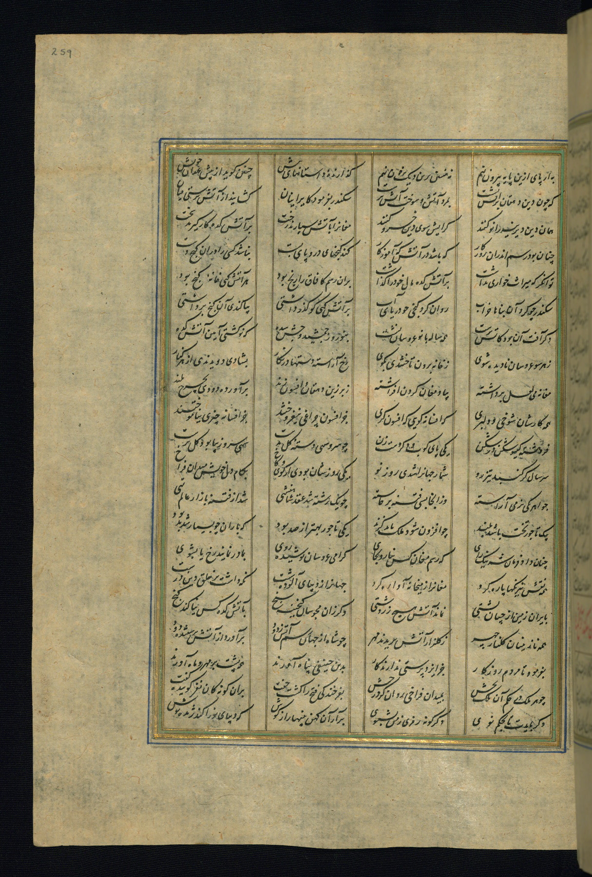 This is an illuminated and illustrated copy of the Khamsah (quintet) by Niẓāmī Ganjavī (d. 605 AH / 1209 CE), completed by Ḥabīb Allāh ibn ʿAlī ibn Ḥusām in Safavid Iran in Rabīʿ II 971 AH / 1563 CE. Illuminated titlepieces introduce the five poems, and there are thirty illustrations, the majority of which are attributable to thirteenth century AH / nineteenth CE Qajar Iran. Ownership notes and seals indicating the provenance of this manuscript are found throughout the codex (fols. 1a, 2a, 153a, 177a, 233a, 349a, and 351a). The binding is not original to the manuscript.