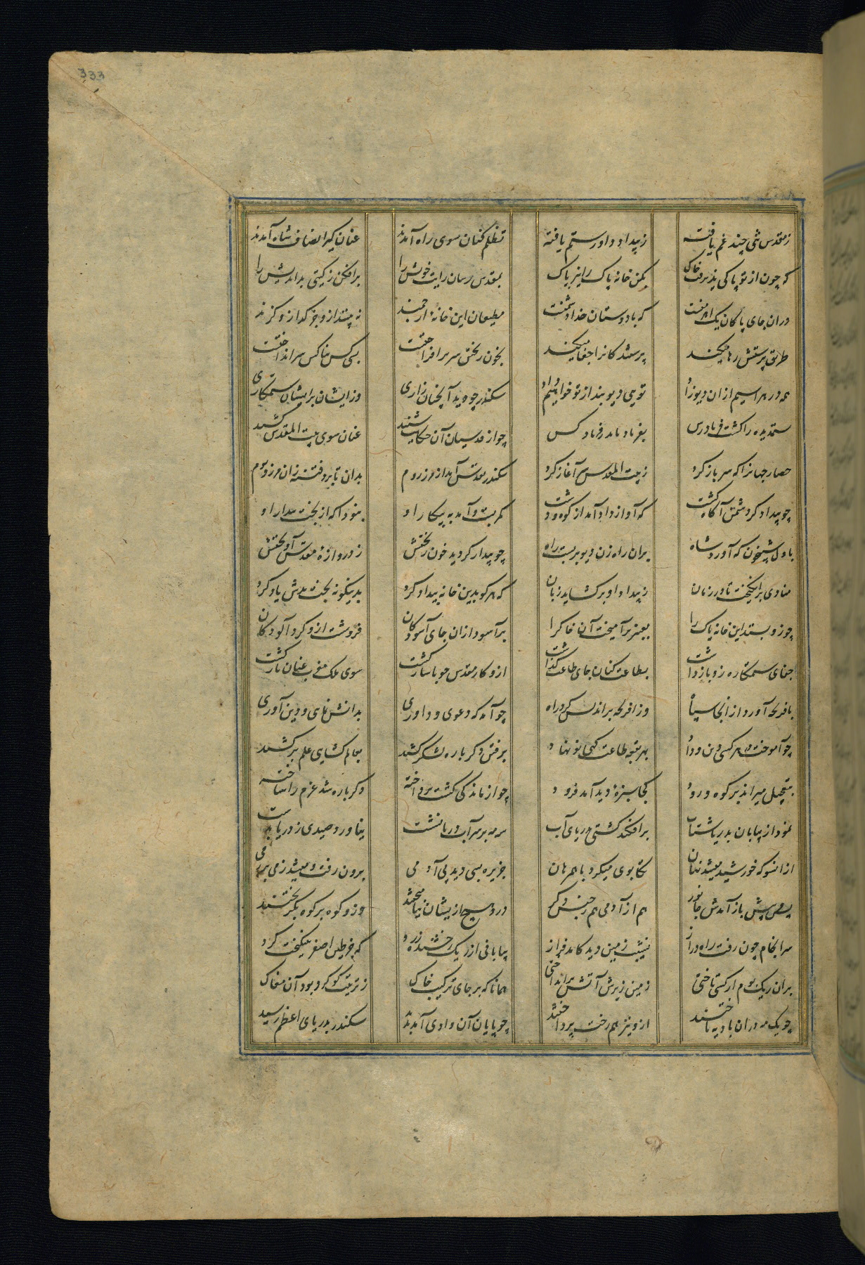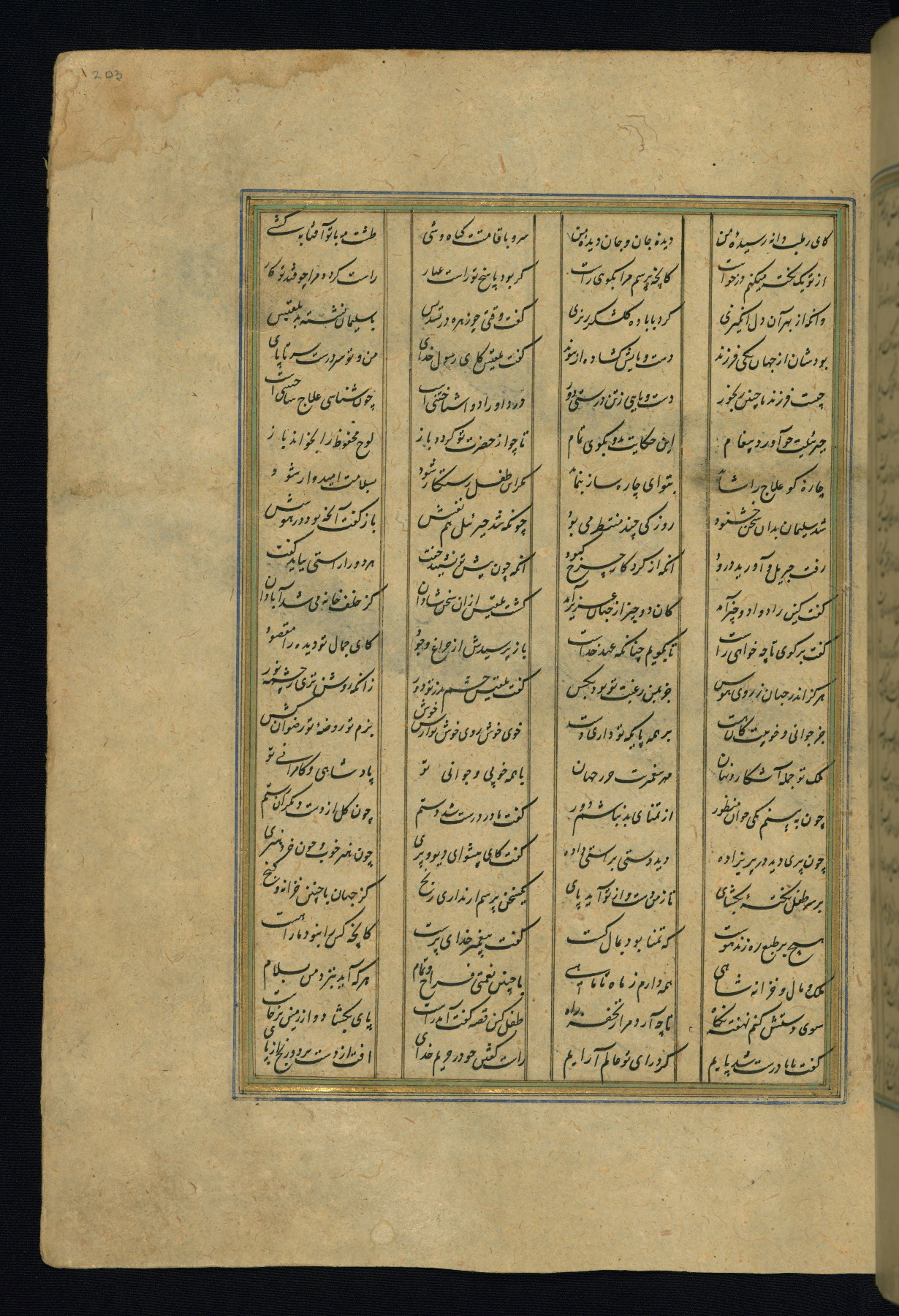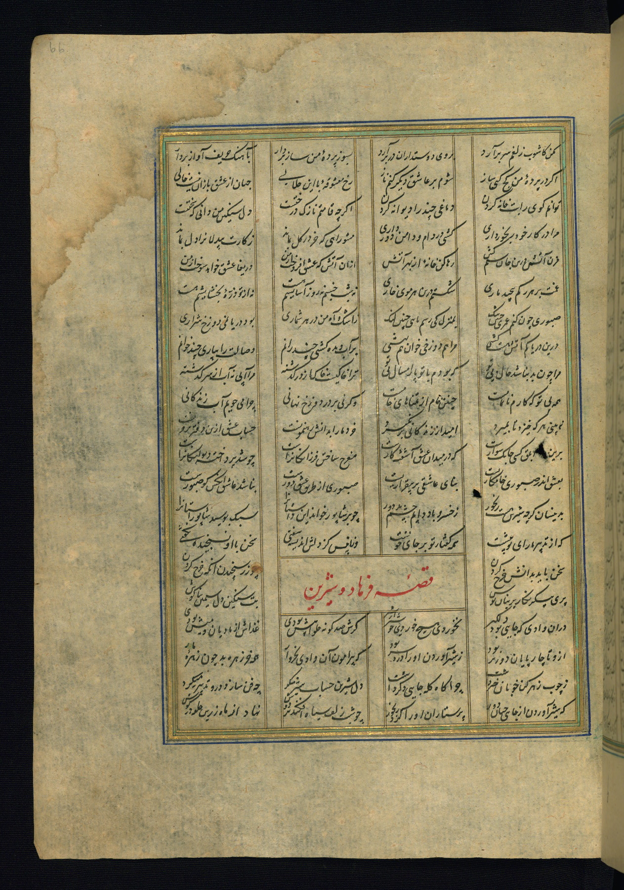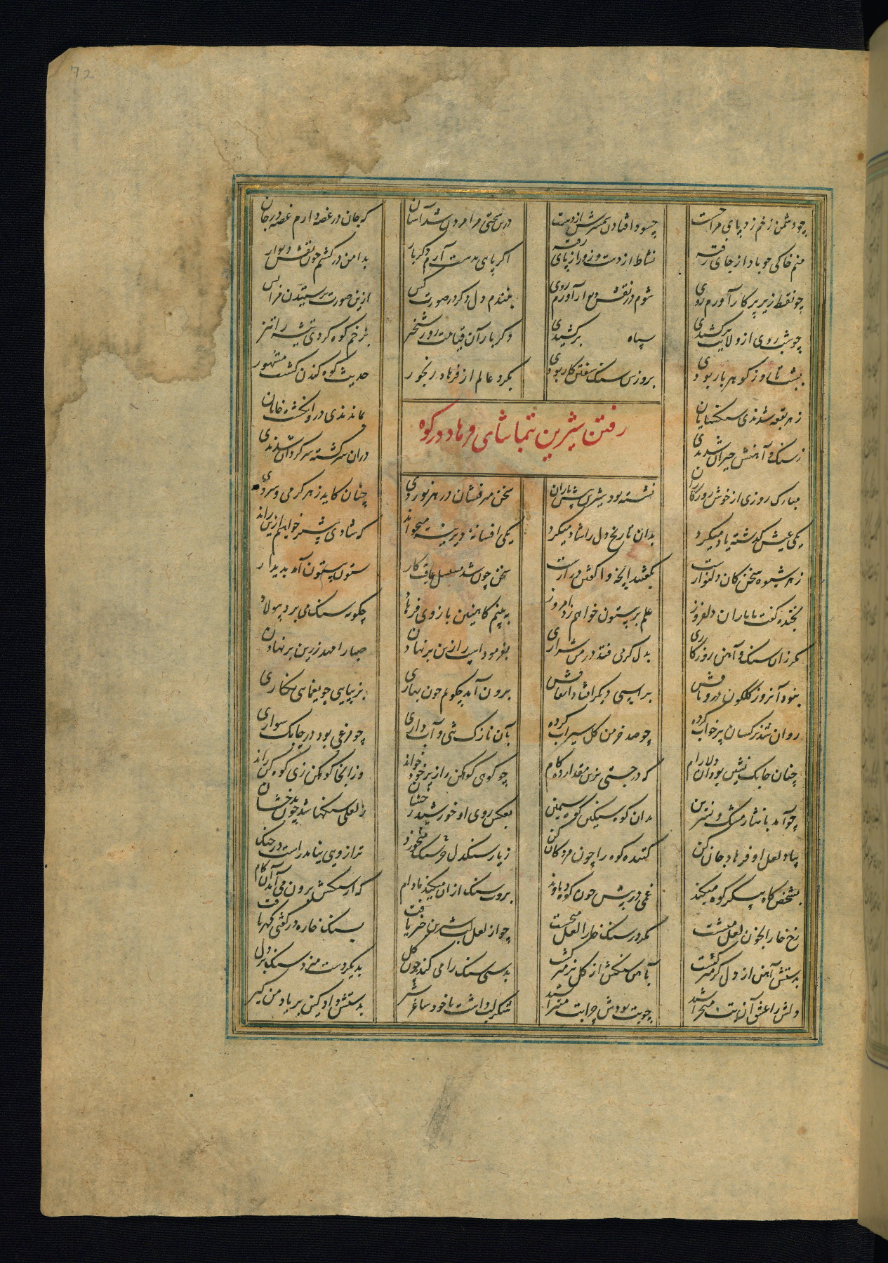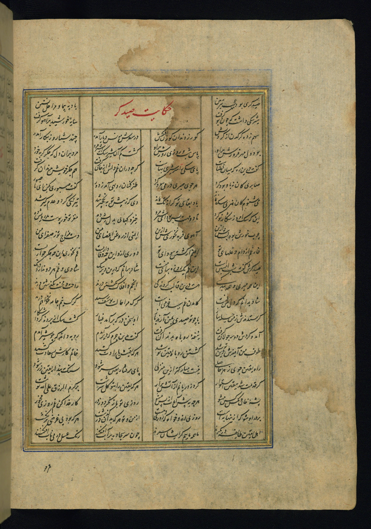 This is an illuminated and illustrated copy of the Khamsah (quintet) by Niẓāmī Ganjavī (d. 605 AH / 1209 CE), completed by Ḥabīb Allāh ibn ʿAlī ibn Ḥusām in Safavid Iran in Rabīʿ II 971 AH / 1563 CE. Illuminated titlepieces introduce the five poems, and there are thirty illustrations, the majority of which are attributable to thirteenth century AH / nineteenth CE Qajar Iran. Ownership notes and seals indicating the provenance of this manuscript are found throughout the codex (fols. 1a, 2a, 153a, 177a, 233a, 349a, and 351a). The binding is not original to the manuscript.
