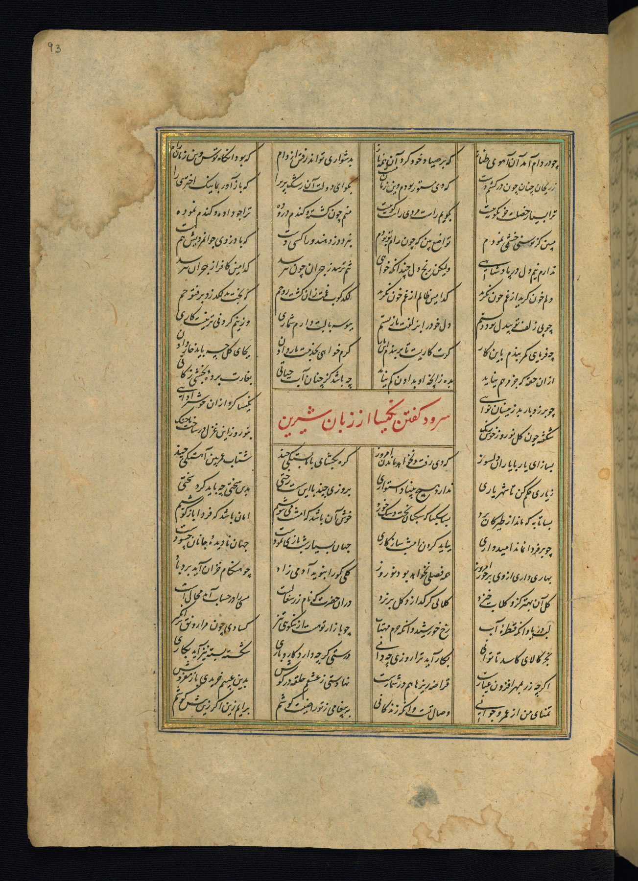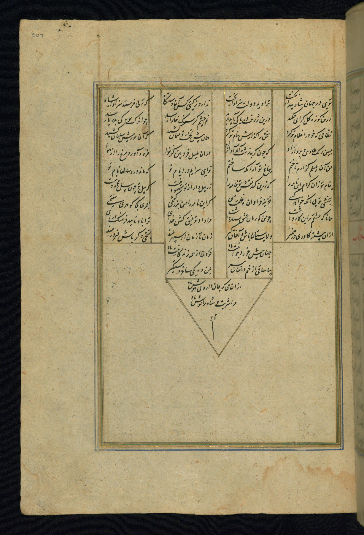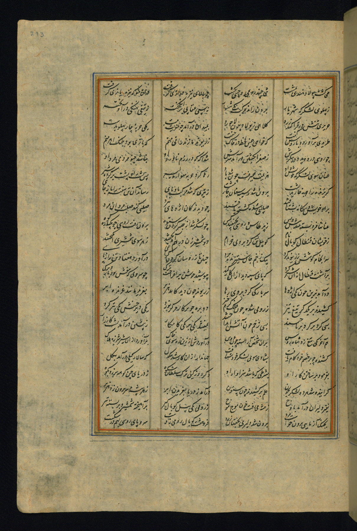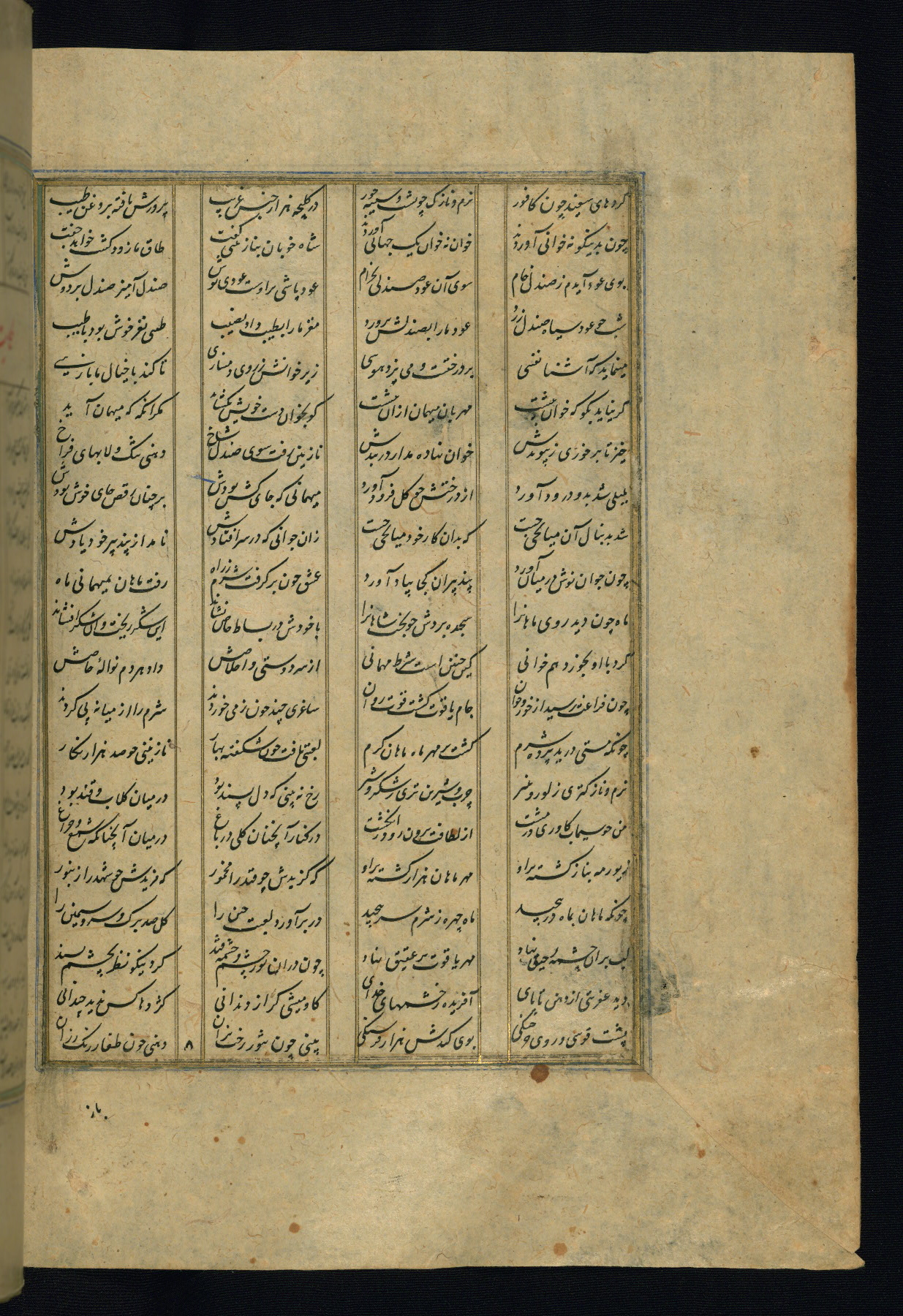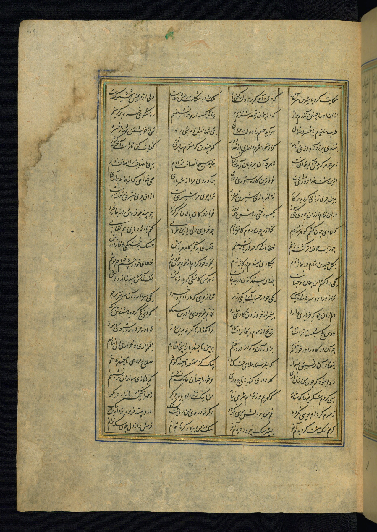 This is an illuminated and illustrated copy of the Khamsah (quintet) by Niẓāmī Ganjavī (d. 605 AH / 1209 CE), completed by Ḥabīb Allāh ibn ʿAlī ibn Ḥusām in Safavid Iran in Rabīʿ II 971 AH / 1563 CE. Illuminated titlepieces introduce the five poems, and there are thirty illustrations, the majority of which are attributable to thirteenth century AH / nineteenth CE Qajar Iran. Ownership notes and seals indicating the provenance of this manuscript are found throughout the codex (fols. 1a, 2a, 153a, 177a, 233a, 349a, and 351a). The binding is not original to the manuscript.