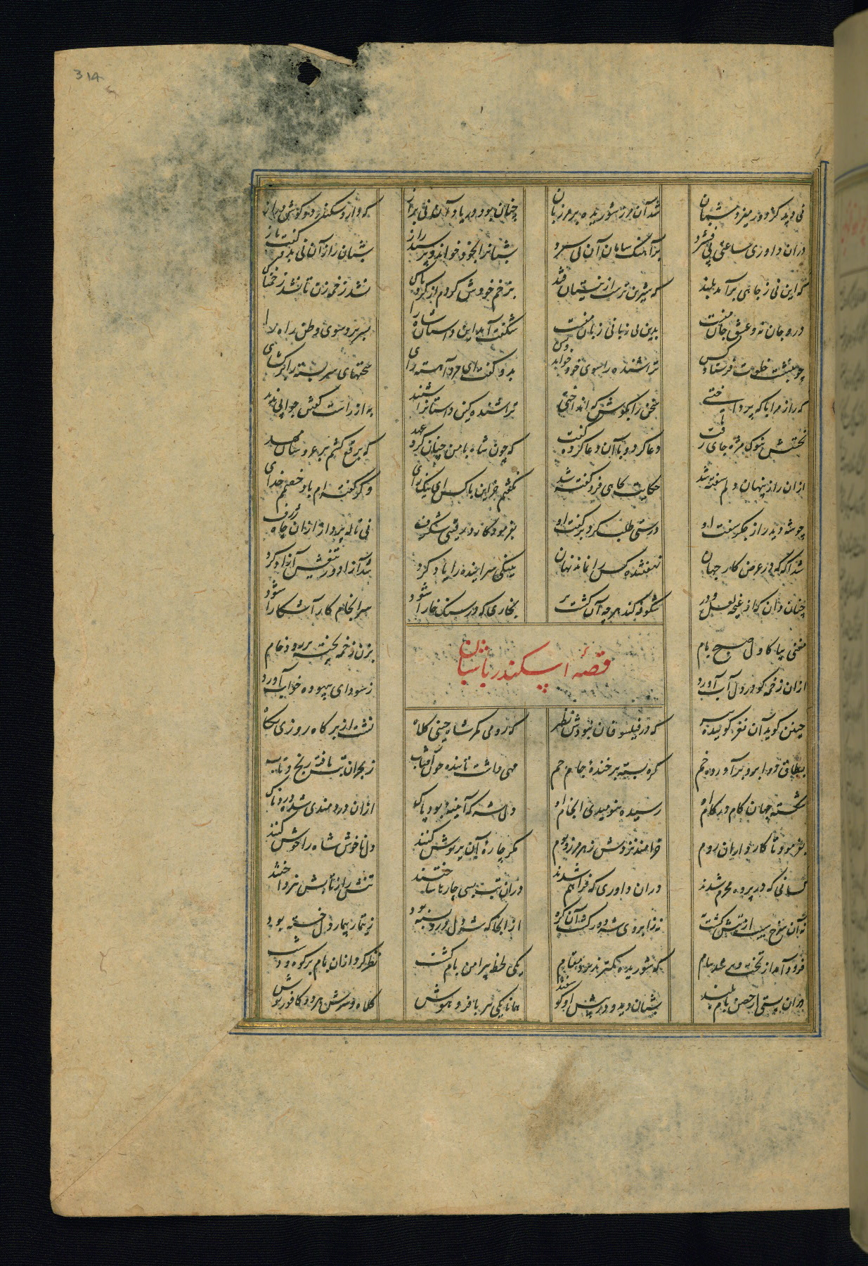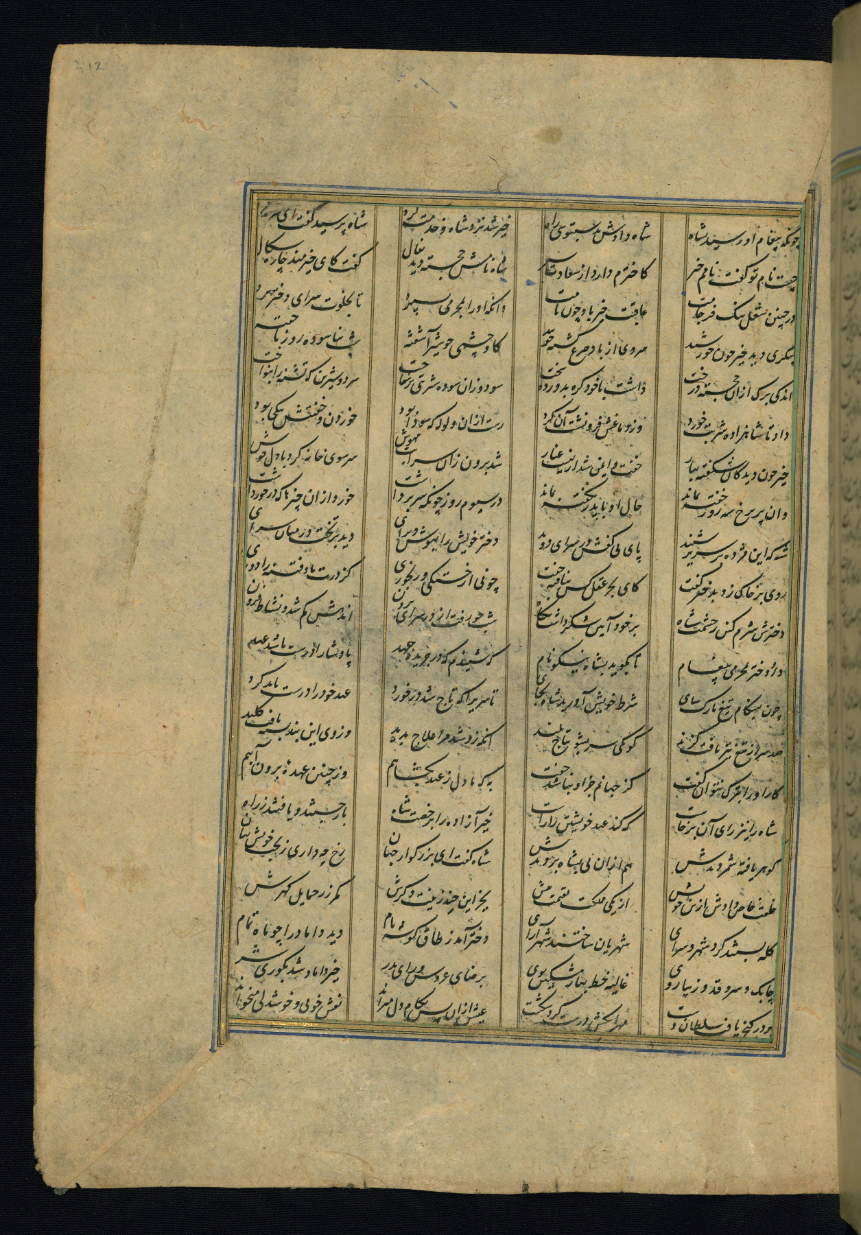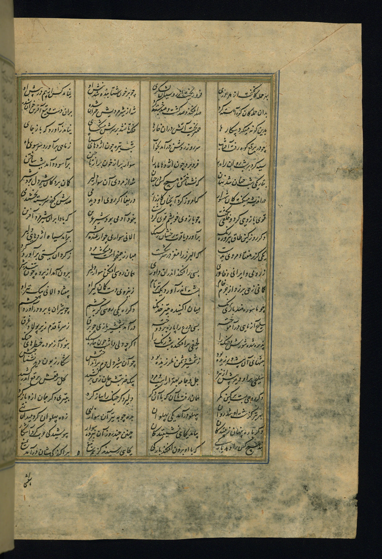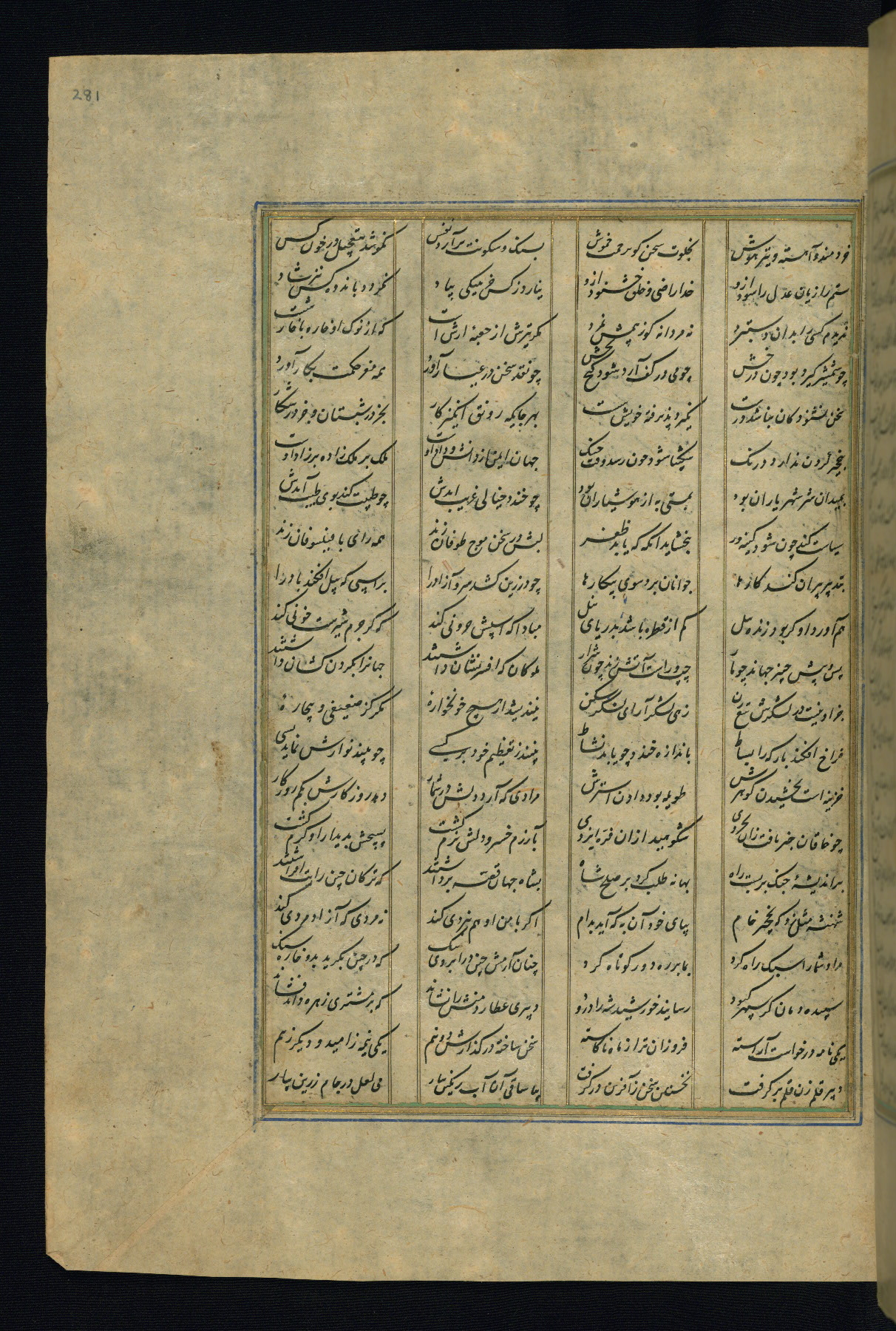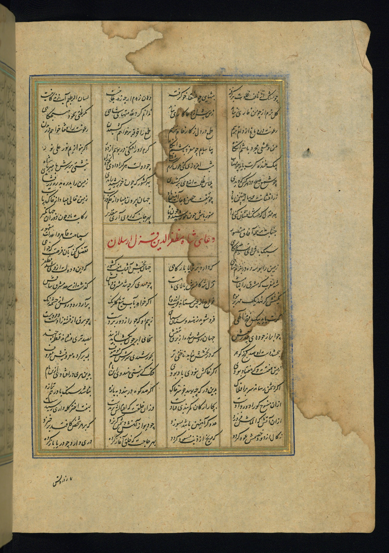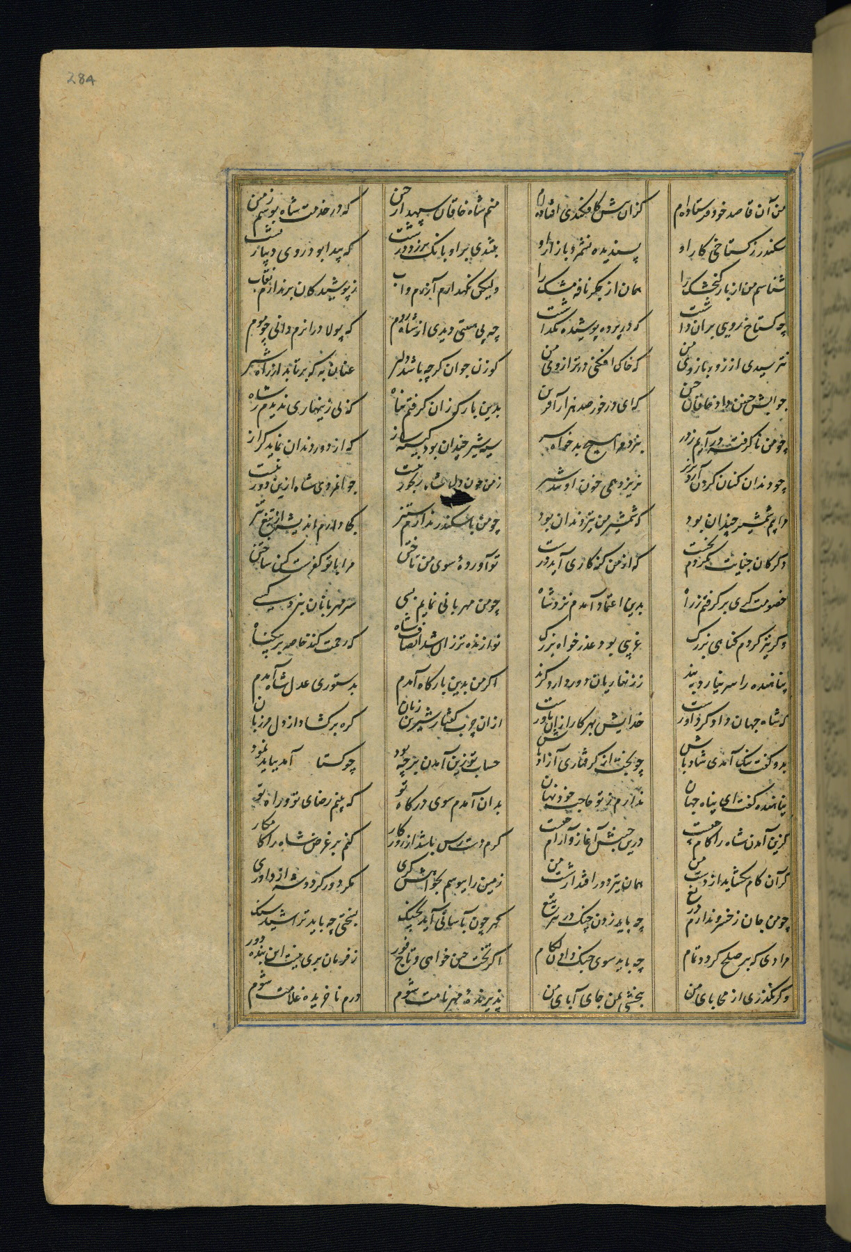 This is an illuminated and illustrated copy of the Khamsah (quintet) by Niẓāmī Ganjavī (d. 605 AH / 1209 CE), completed by Ḥabīb Allāh ibn ʿAlī ibn Ḥusām in Safavid Iran in Rabīʿ II 971 AH / 1563 CE. Illuminated titlepieces introduce the five poems, and there are thirty illustrations, the majority of which are attributable to thirteenth century AH / nineteenth CE Qajar Iran. Ownership notes and seals indicating the provenance of this manuscript are found throughout the codex (fols. 1a, 2a, 153a, 177a, 233a, 349a, and 351a). The binding is not original to the manuscript.