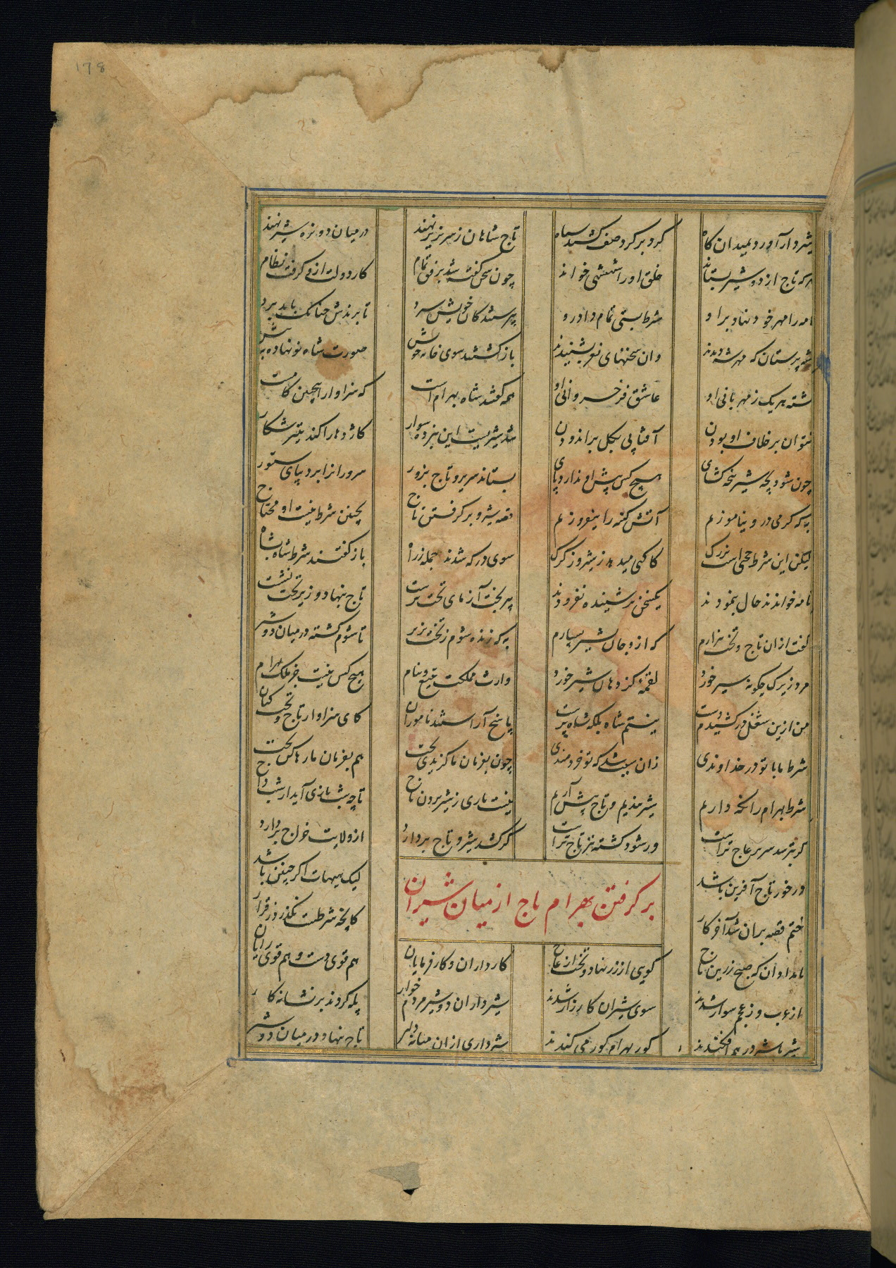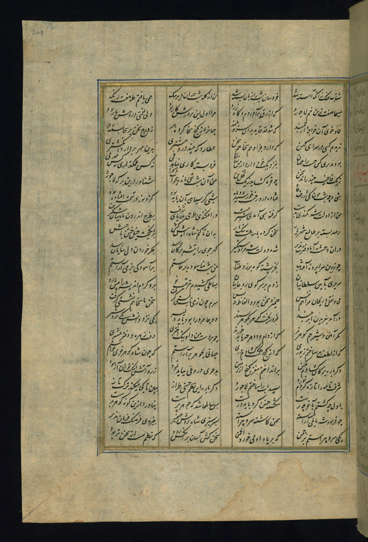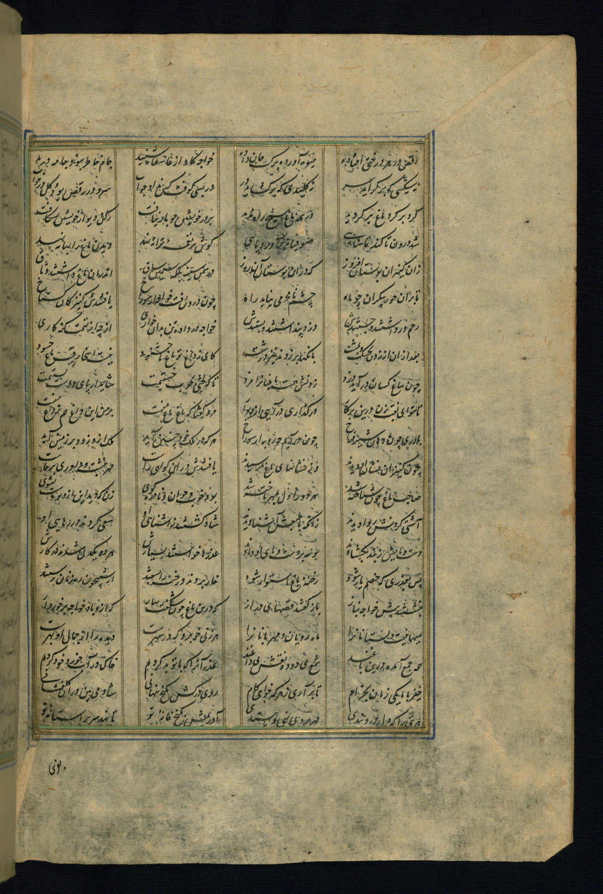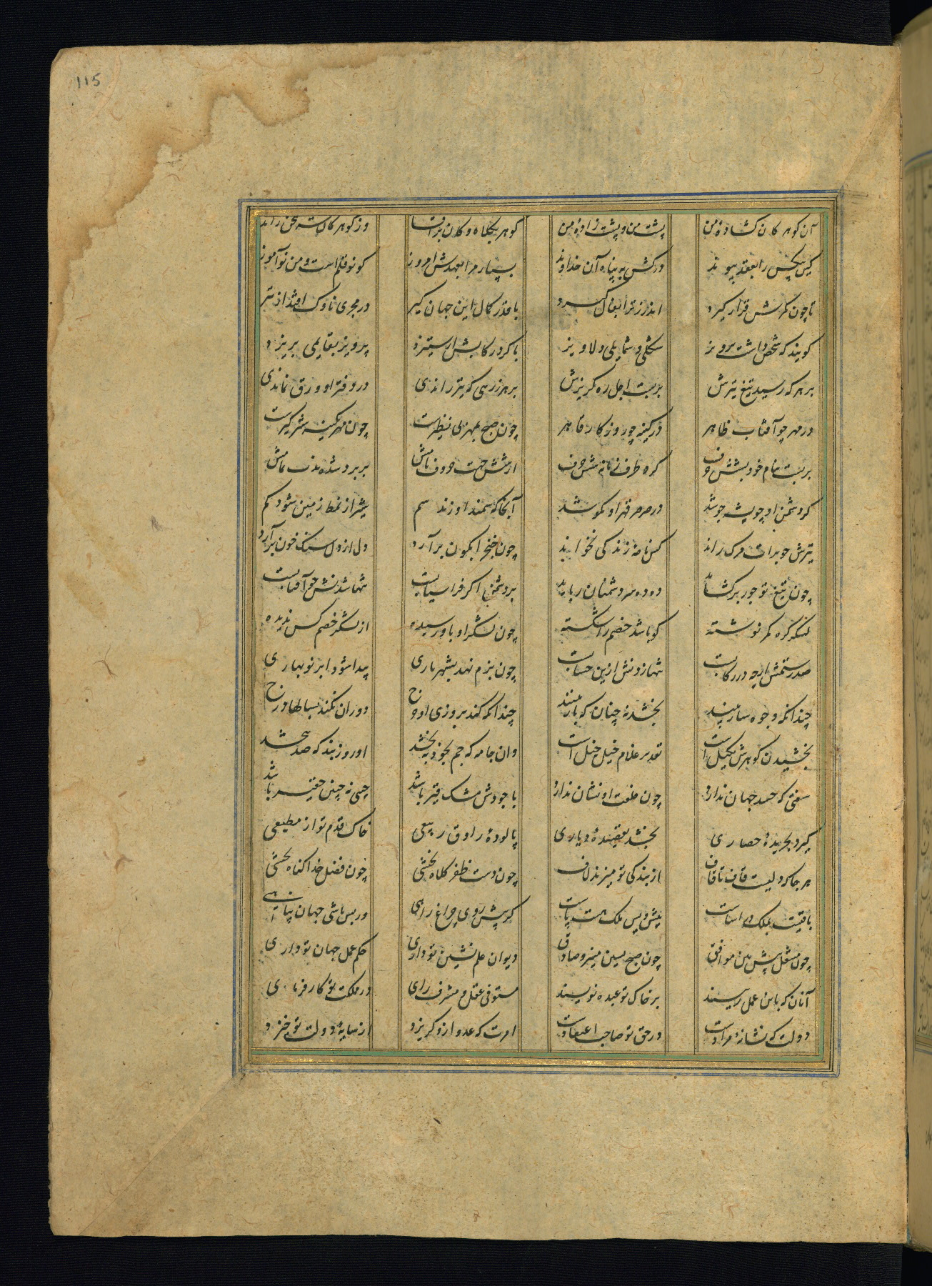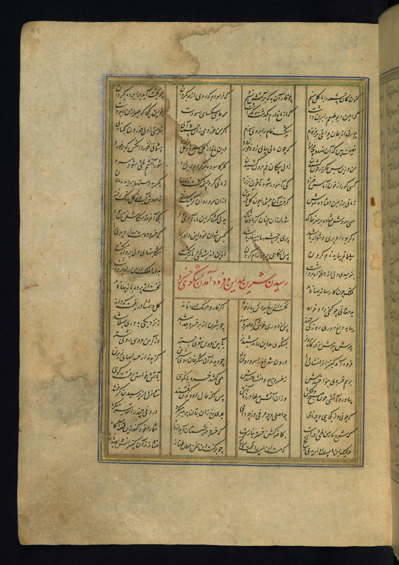 This is an illuminated and illustrated copy of the Khamsah (quintet) by Niẓāmī Ganjavī (d. 605 AH / 1209 CE), completed by Ḥabīb Allāh ibn ʿAlī ibn Ḥusām in Safavid Iran in Rabīʿ II 971 AH / 1563 CE. Illuminated titlepieces introduce the five poems, and there are thirty illustrations, the majority of which are attributable to thirteenth century AH / nineteenth CE Qajar Iran. Ownership notes and seals indicating the provenance of this manuscript are found throughout the codex (fols. 1a, 2a, 153a, 177a, 233a, 349a, and 351a). The binding is not original to the manuscript.