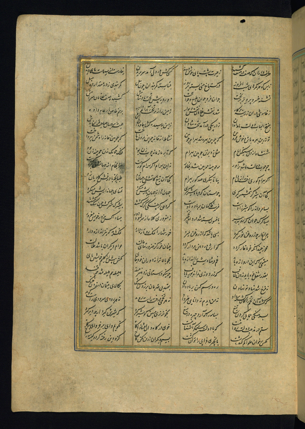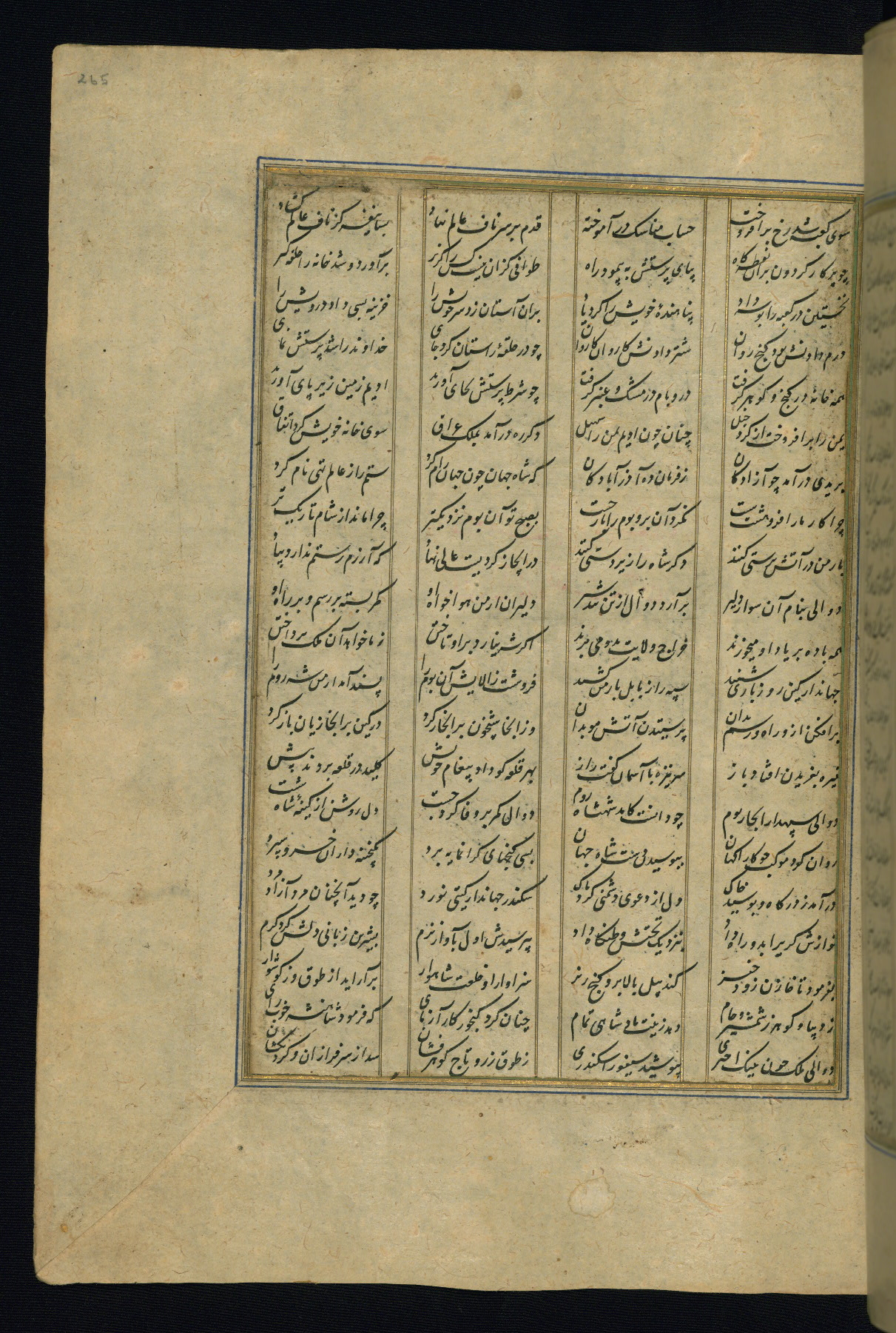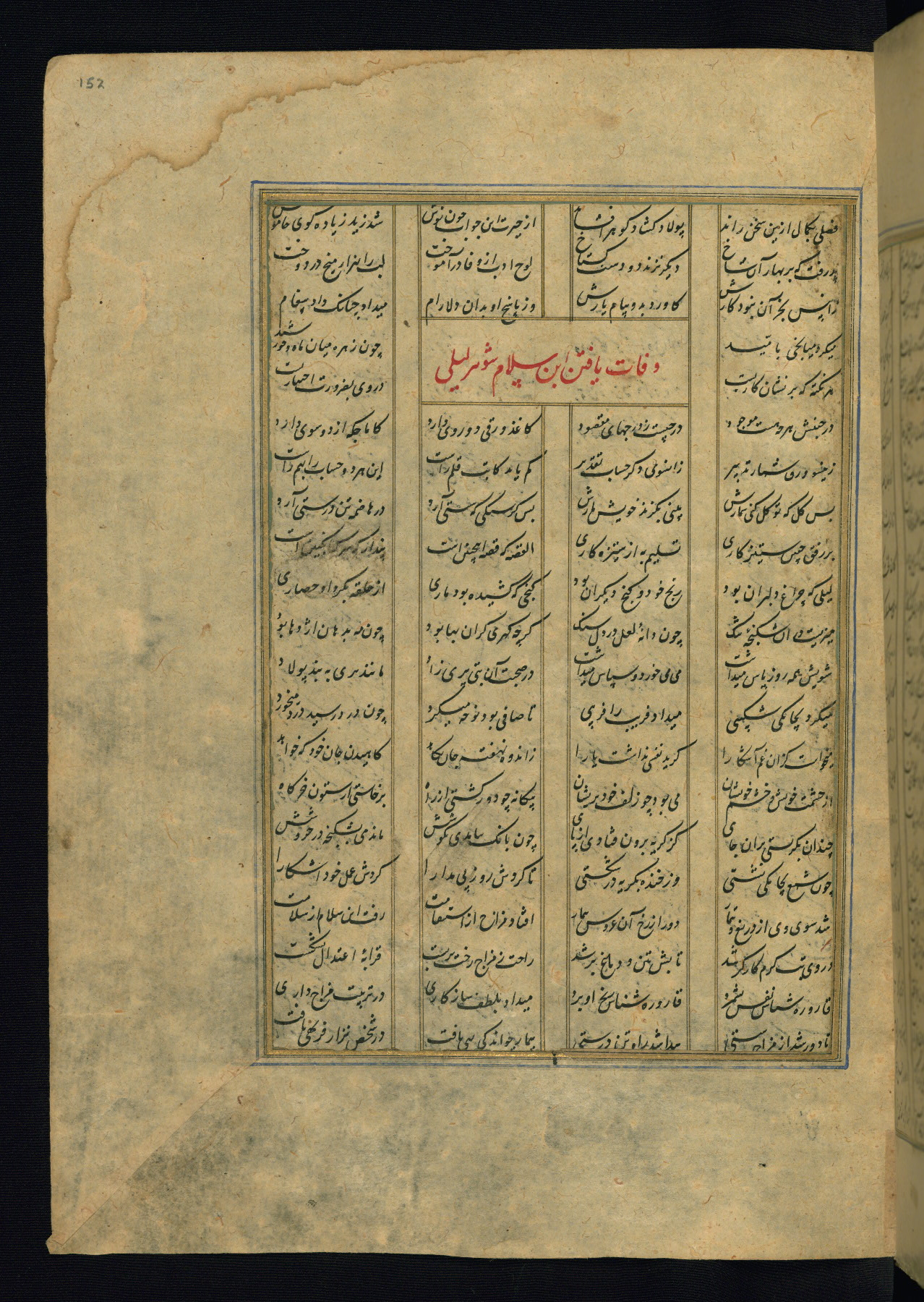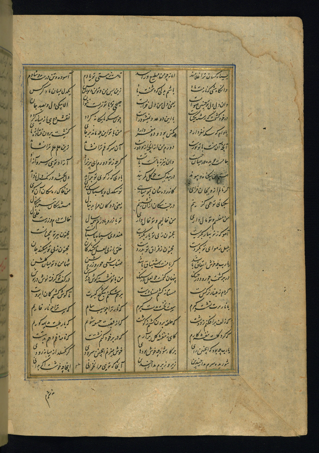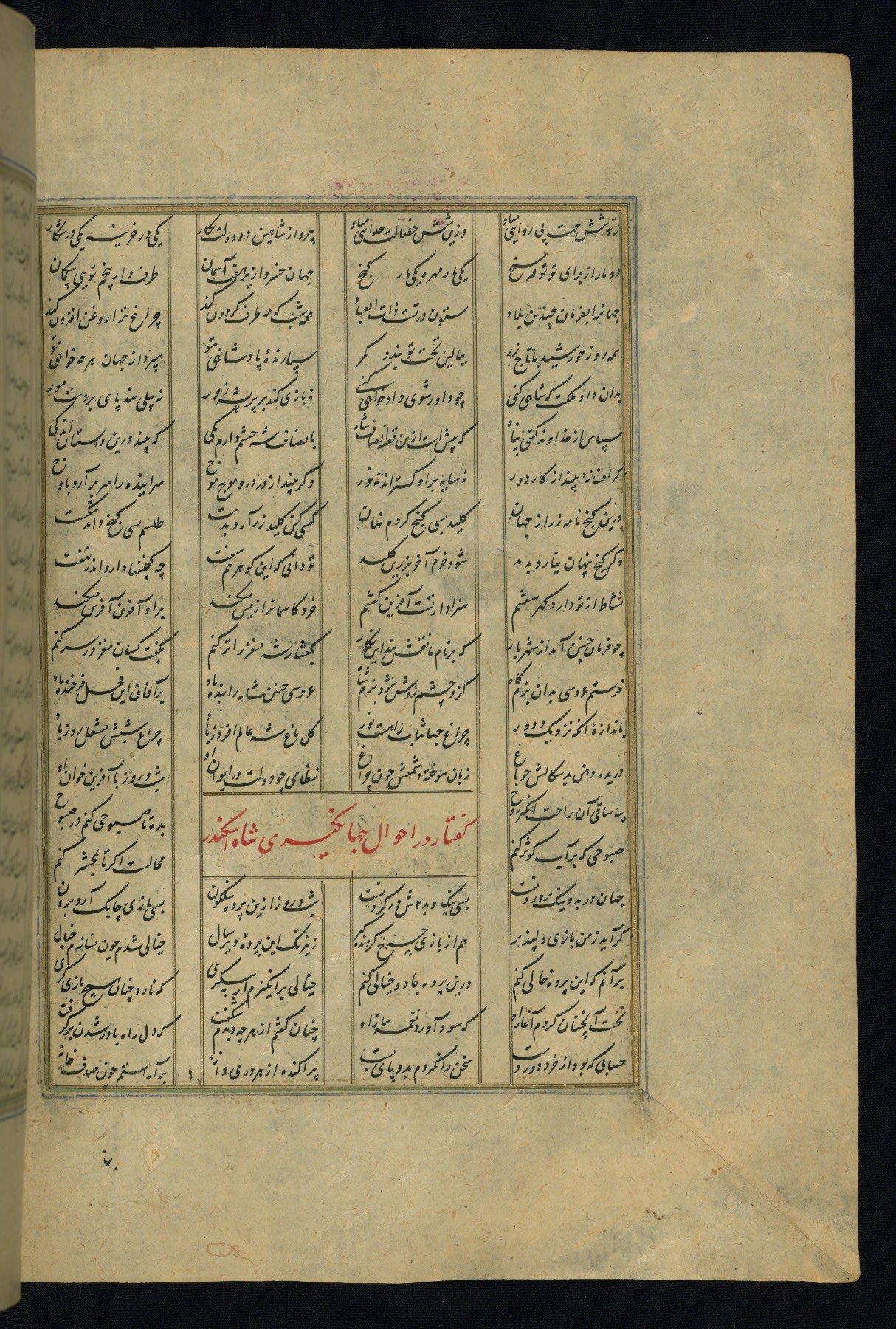 This is an illuminated and illustrated copy of the Khamsah (quintet) by Niẓāmī Ganjavī (d. 605 AH / 1209 CE), completed by Ḥabīb Allāh ibn ʿAlī ibn Ḥusām in Safavid Iran in Rabīʿ II 971 AH / 1563 CE. Illuminated titlepieces introduce the five poems, and there are thirty illustrations, the majority of which are attributable to thirteenth century AH / nineteenth CE Qajar Iran. Ownership notes and seals indicating the provenance of this manuscript are found throughout the codex (fols. 1a, 2a, 153a, 177a, 233a, 349a, and 351a). The binding is not original to the manuscript.