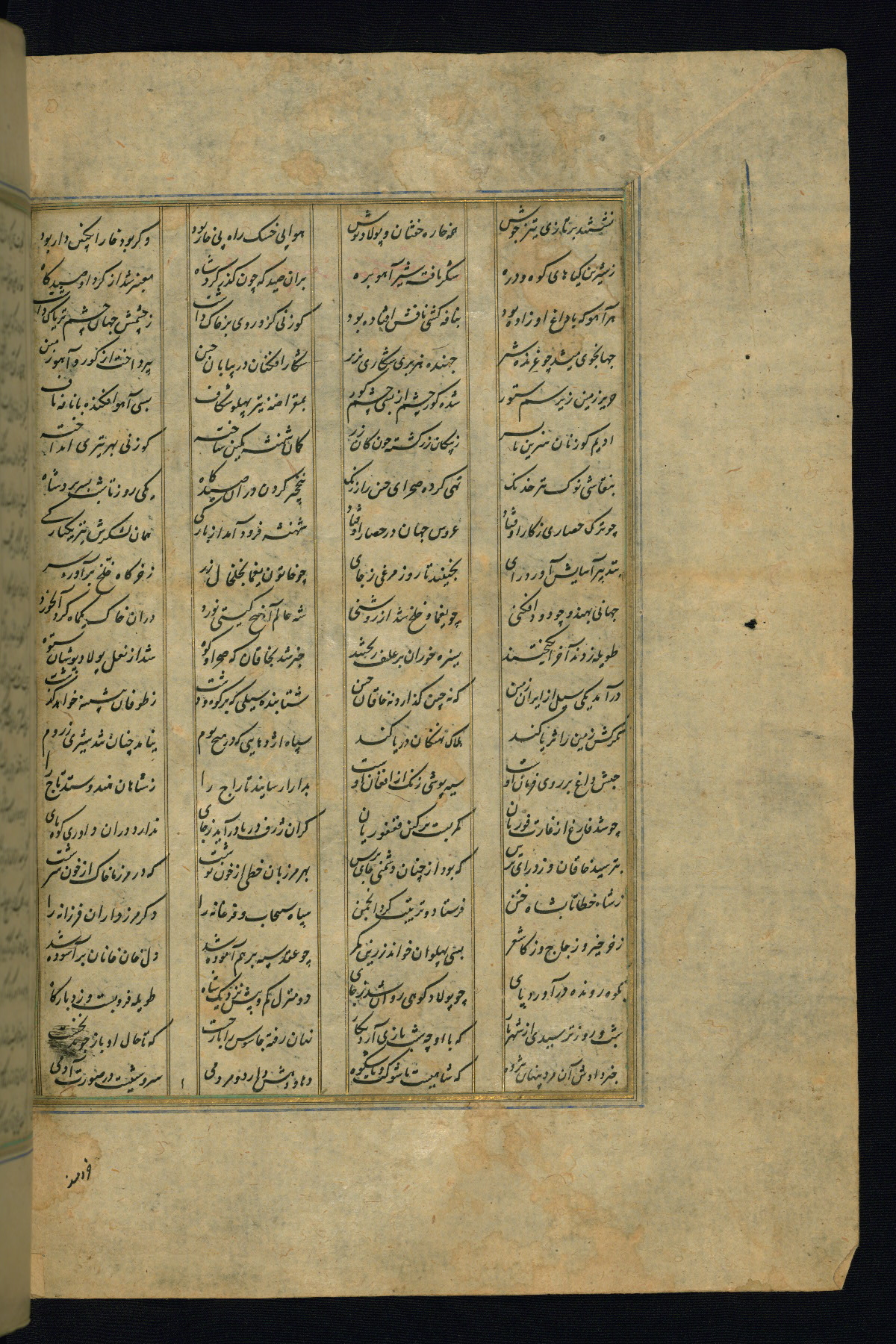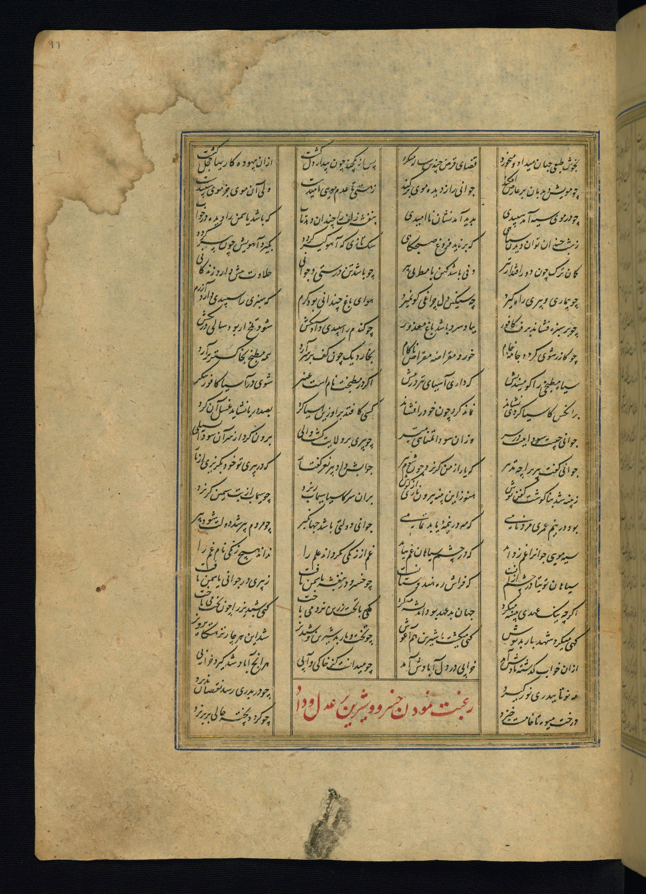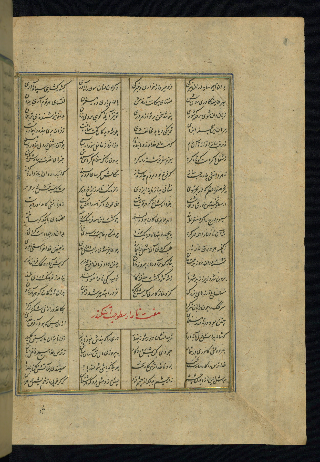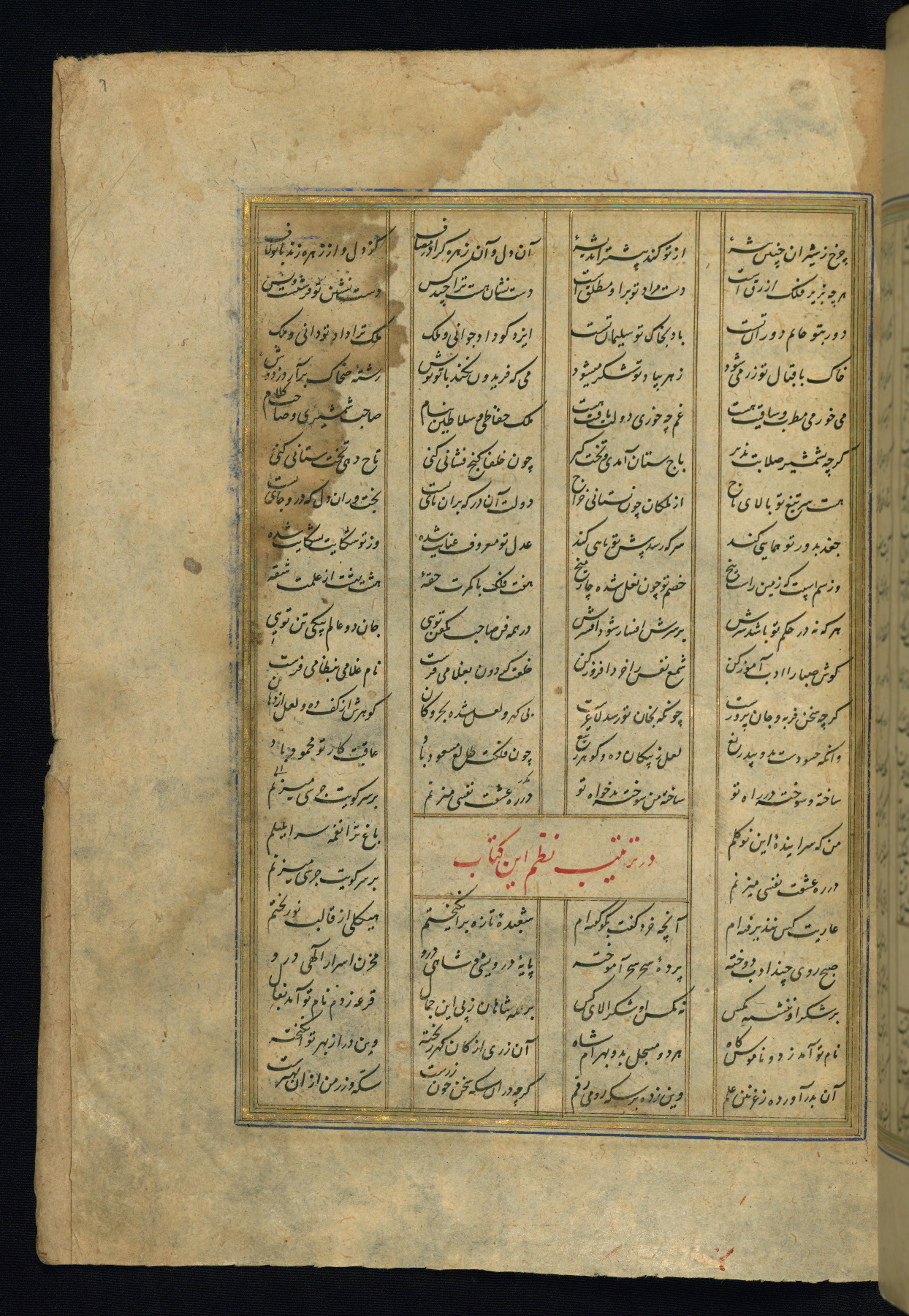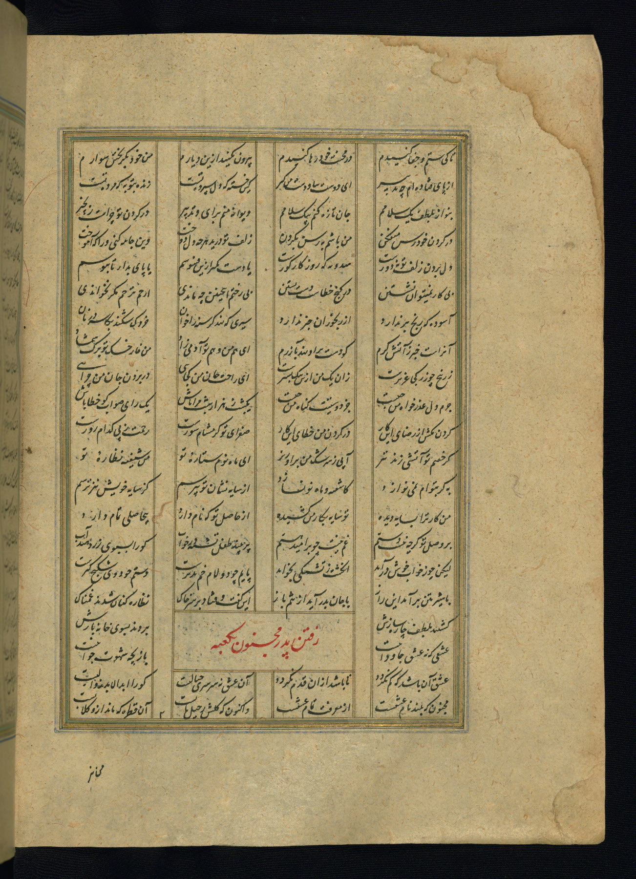 This is an illuminated and illustrated copy of the Khamsah (quintet) by Niẓāmī Ganjavī (d. 605 AH / 1209 CE), completed by Ḥabīb Allāh ibn ʿAlī ibn Ḥusām in Safavid Iran in Rabīʿ II 971 AH / 1563 CE. Illuminated titlepieces introduce the five poems, and there are thirty illustrations, the majority of which are attributable to thirteenth century AH / nineteenth CE Qajar Iran. Ownership notes and seals indicating the provenance of this manuscript are found throughout the codex (fols. 1a, 2a, 153a, 177a, 233a, 349a, and 351a). The binding is not original to the manuscript.
