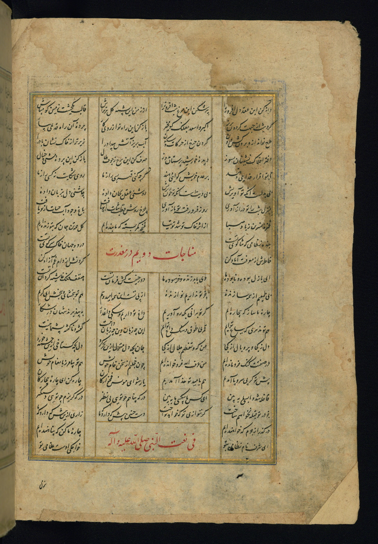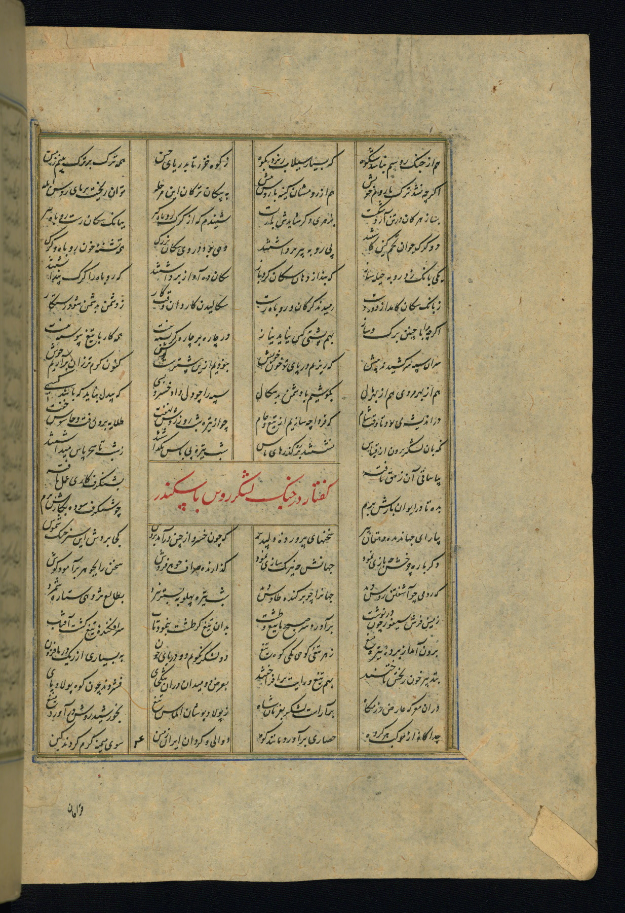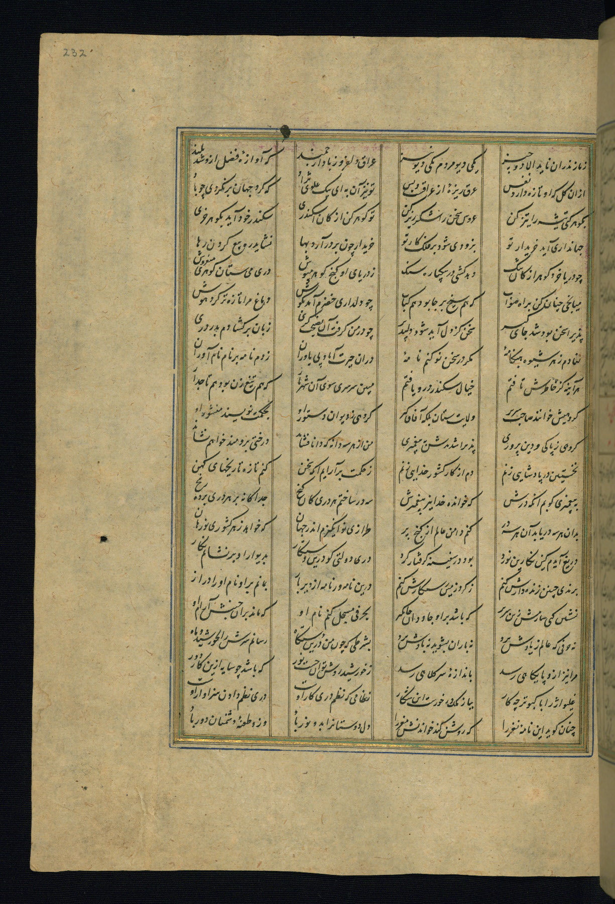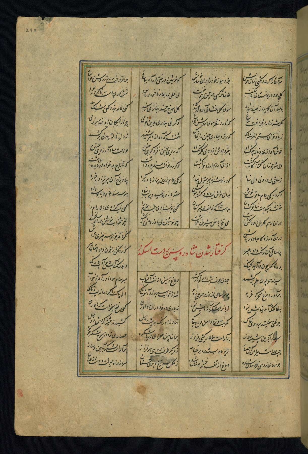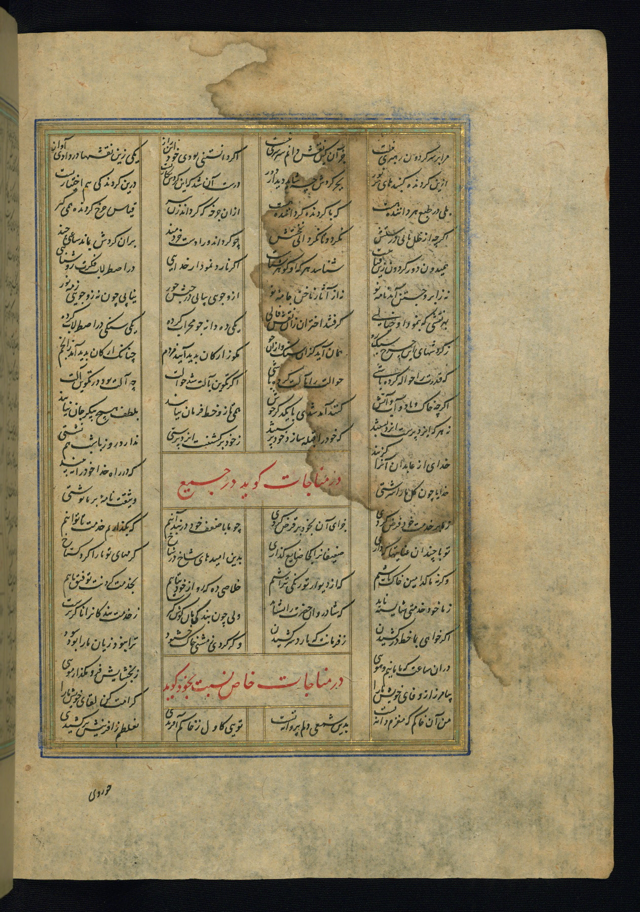 This is an illuminated and illustrated copy of the Khamsah (quintet) by Niẓāmī Ganjavī (d. 605 AH / 1209 CE), completed by Ḥabīb Allāh ibn ʿAlī ibn Ḥusām in Safavid Iran in Rabīʿ II 971 AH / 1563 CE. Illuminated titlepieces introduce the five poems, and there are thirty illustrations, the majority of which are attributable to thirteenth century AH / nineteenth CE Qajar Iran. Ownership notes and seals indicating the provenance of this manuscript are found throughout the codex (fols. 1a, 2a, 153a, 177a, 233a, 349a, and 351a). The binding is not original to the manuscript.