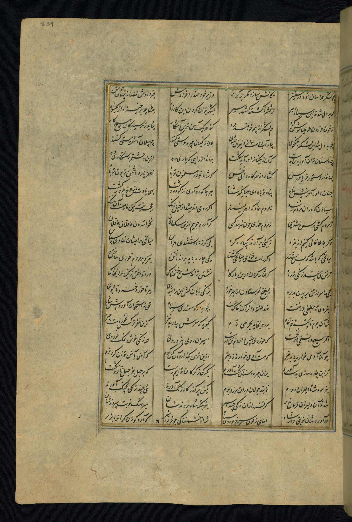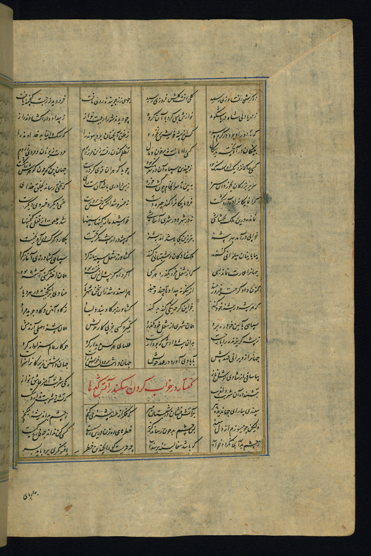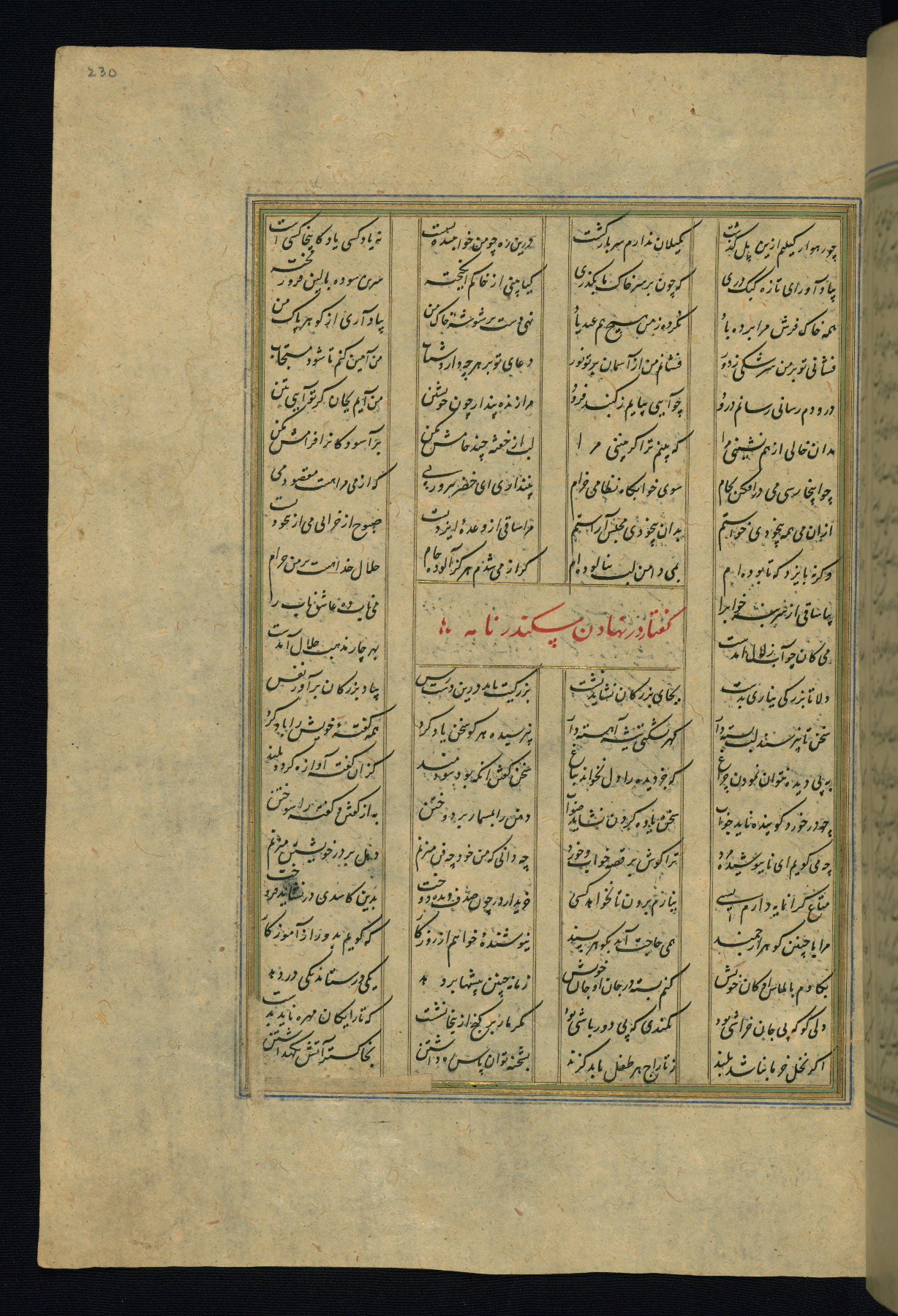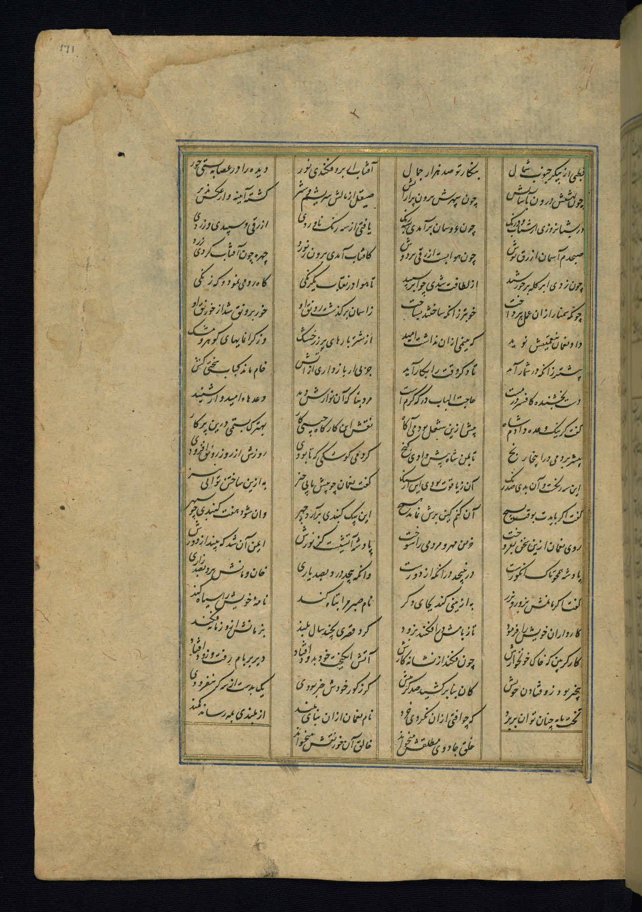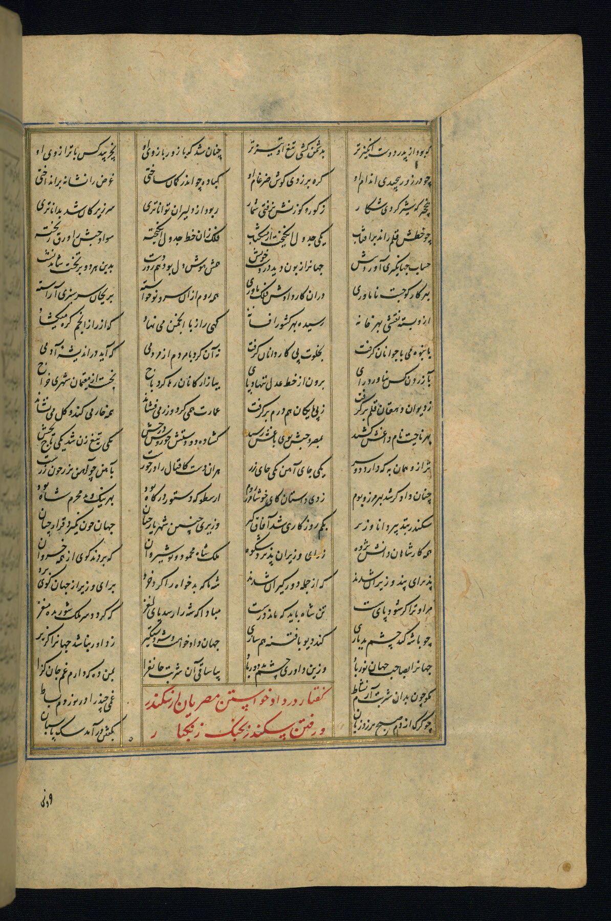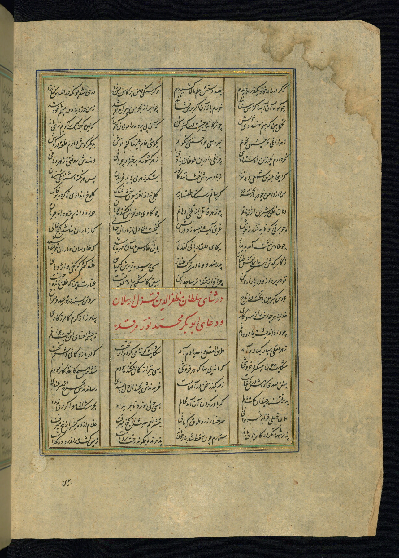 This is an illuminated and illustrated copy of the Khamsah (quintet) by Niẓāmī Ganjavī (d. 605 AH / 1209 CE), completed by Ḥabīb Allāh ibn ʿAlī ibn Ḥusām in Safavid Iran in Rabīʿ II 971 AH / 1563 CE. Illuminated titlepieces introduce the five poems, and there are thirty illustrations, the majority of which are attributable to thirteenth century AH / nineteenth CE Qajar Iran. Ownership notes and seals indicating the provenance of this manuscript are found throughout the codex (fols. 1a, 2a, 153a, 177a, 233a, 349a, and 351a). The binding is not original to the manuscript.