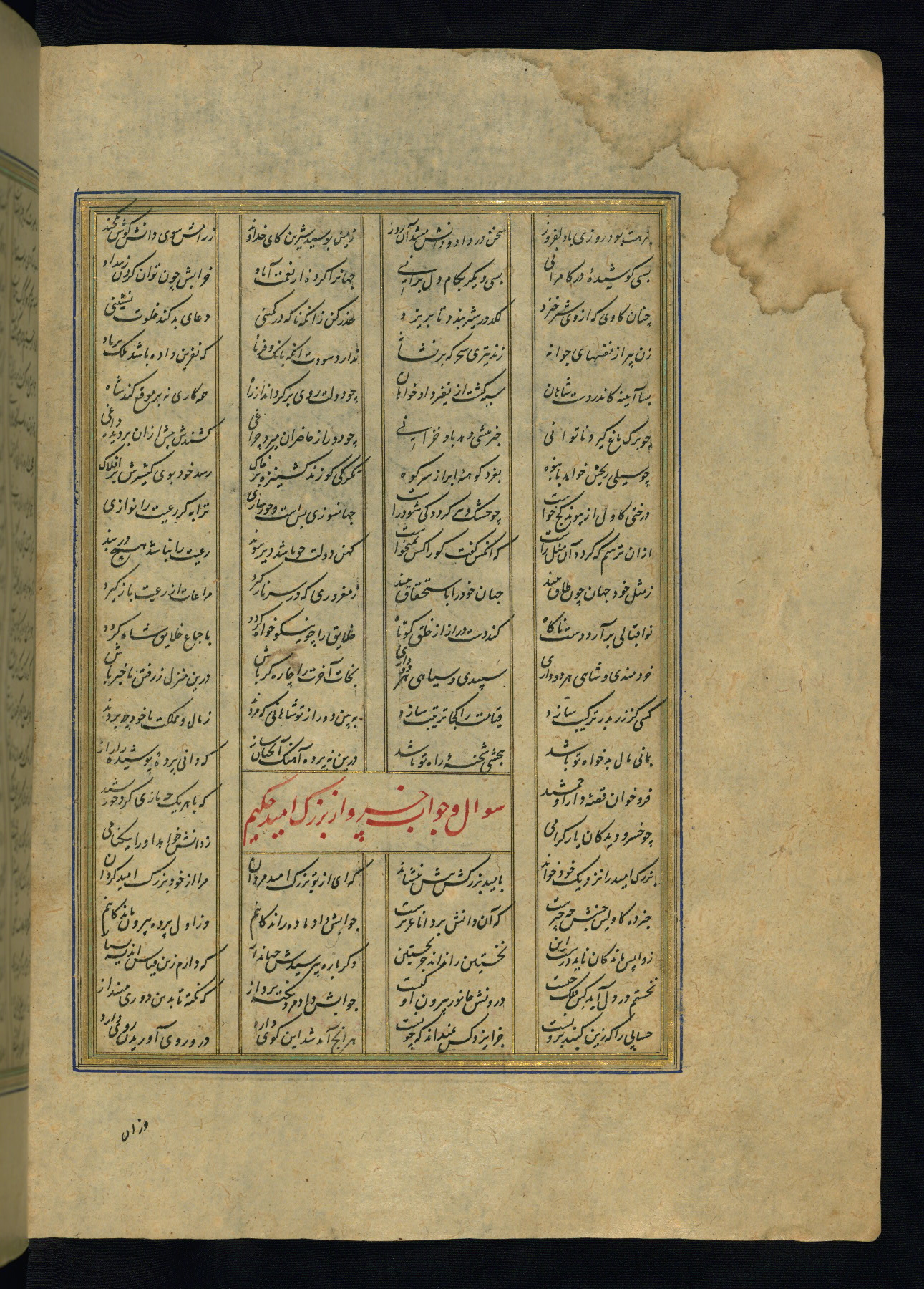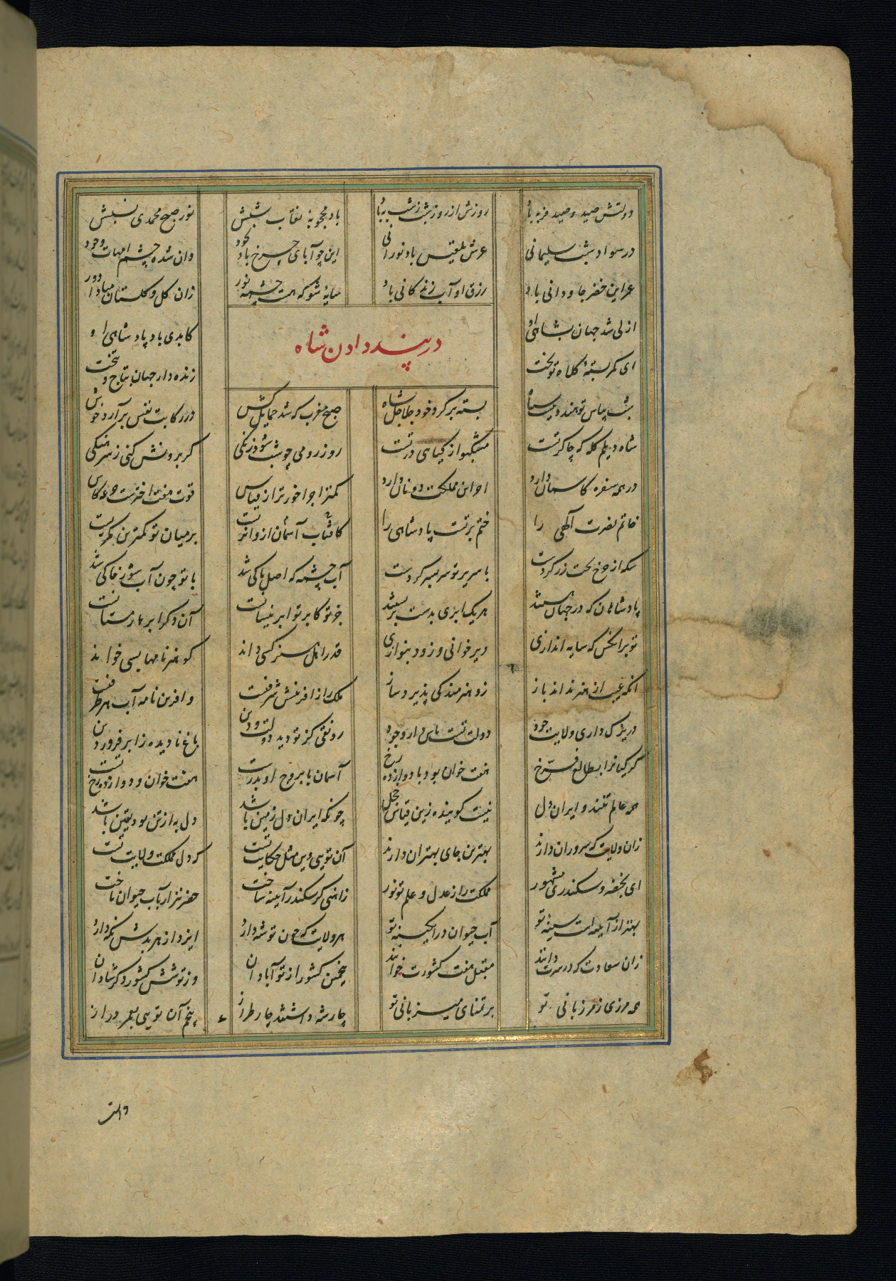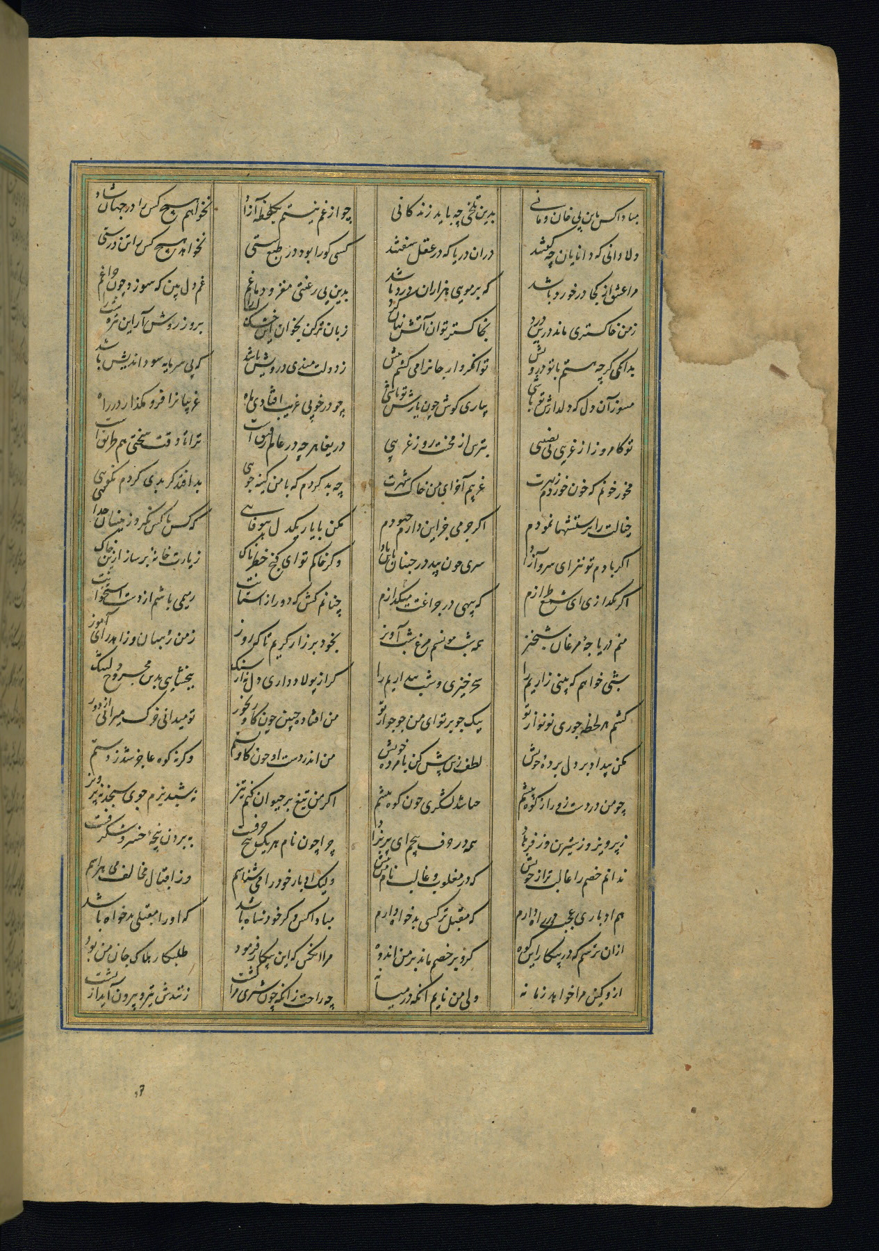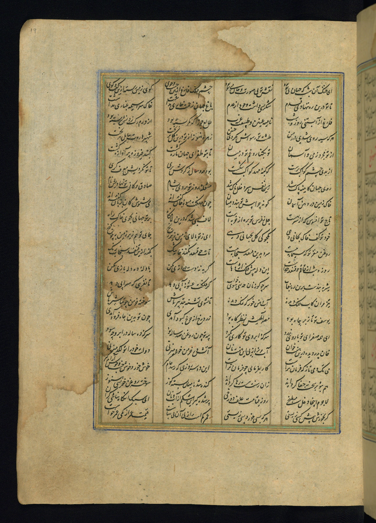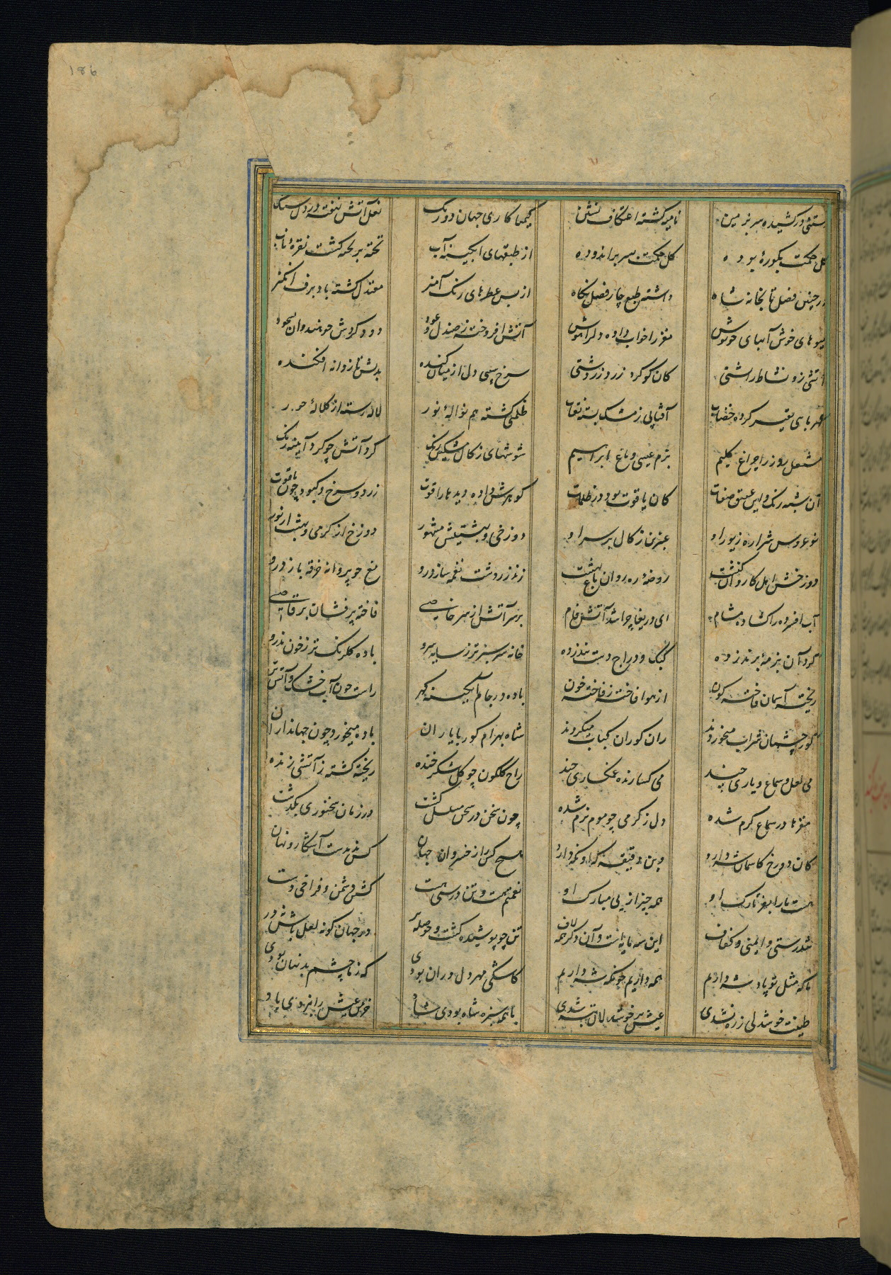 This is an illuminated and illustrated copy of the Khamsah (quintet) by Niẓāmī Ganjavī (d. 605 AH / 1209 CE), completed by Ḥabīb Allāh ibn ʿAlī ibn Ḥusām in Safavid Iran in Rabīʿ II 971 AH / 1563 CE. Illuminated titlepieces introduce the five poems, and there are thirty illustrations, the majority of which are attributable to thirteenth century AH / nineteenth CE Qajar Iran. Ownership notes and seals indicating the provenance of this manuscript are found throughout the codex (fols. 1a, 2a, 153a, 177a, 233a, 349a, and 351a). The binding is not original to the manuscript.