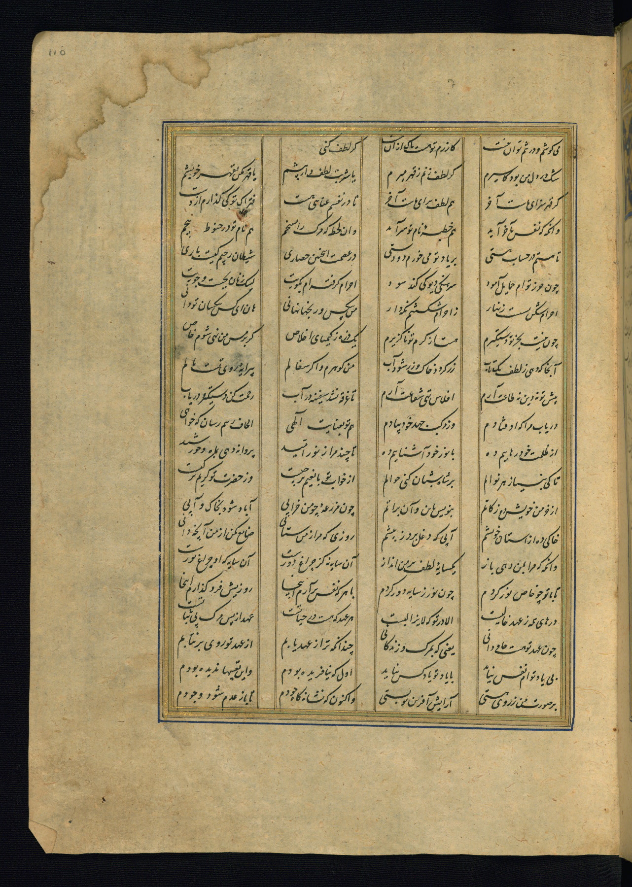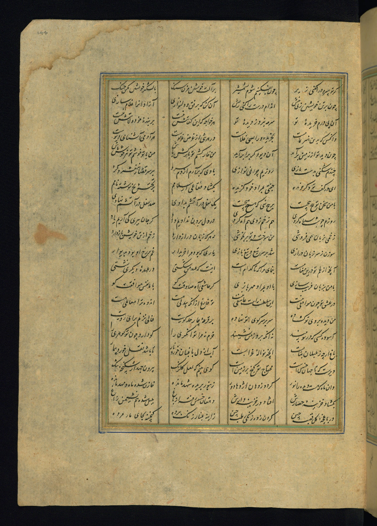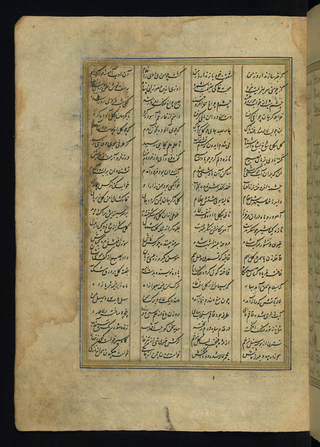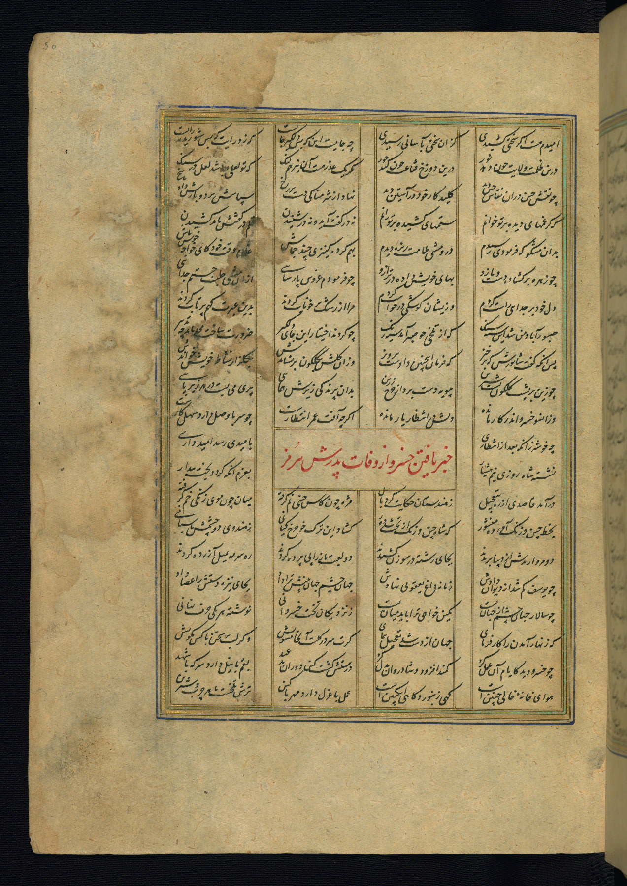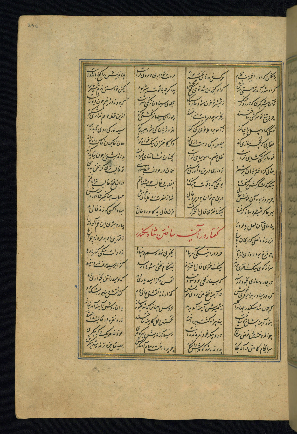 This is an illuminated and illustrated copy of the Khamsah (quintet) by Niẓāmī Ganjavī (d. 605 AH / 1209 CE), completed by Ḥabīb Allāh ibn ʿAlī ibn Ḥusām in Safavid Iran in Rabīʿ II 971 AH / 1563 CE. Illuminated titlepieces introduce the five poems, and there are thirty illustrations, the majority of which are attributable to thirteenth century AH / nineteenth CE Qajar Iran. Ownership notes and seals indicating the provenance of this manuscript are found throughout the codex (fols. 1a, 2a, 153a, 177a, 233a, 349a, and 351a). The binding is not original to the manuscript.