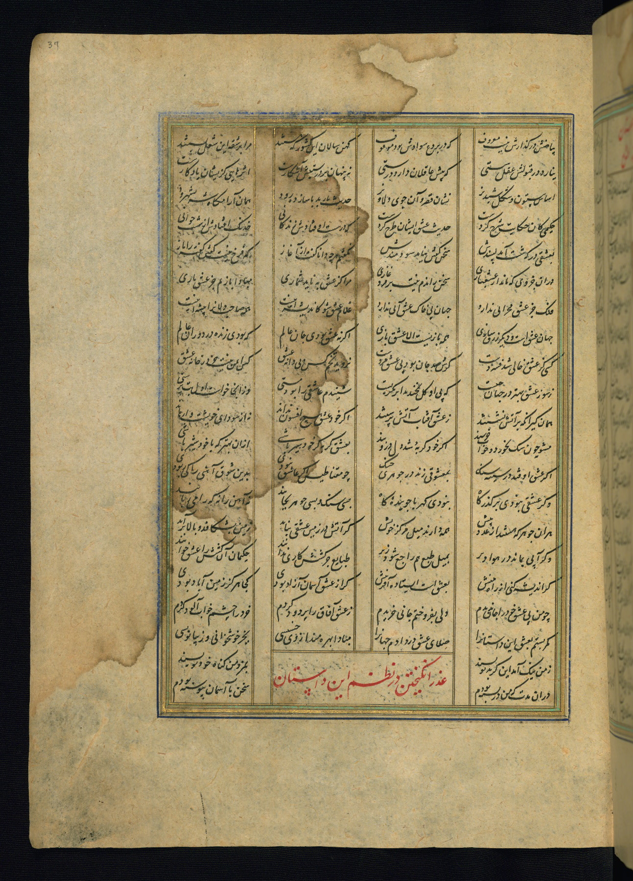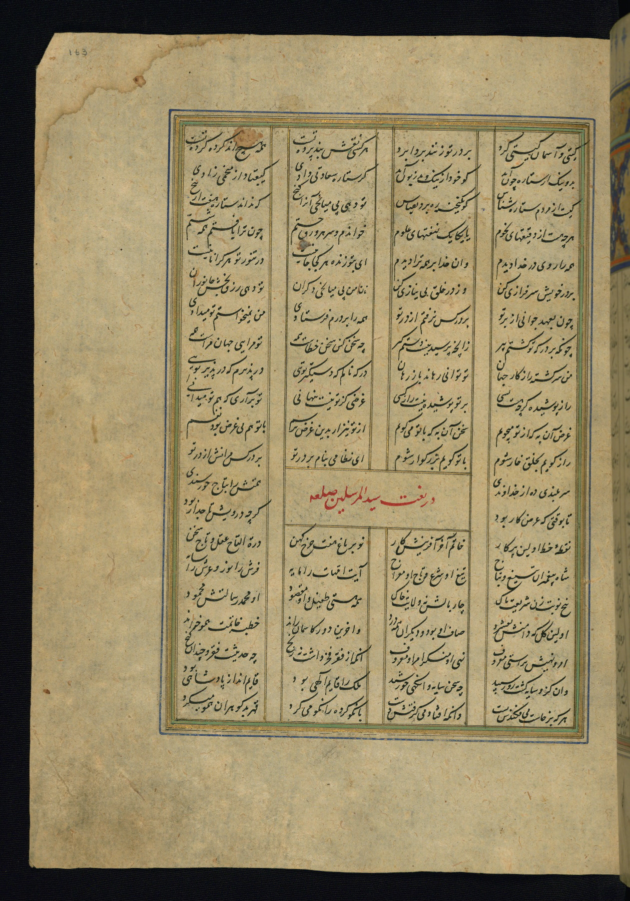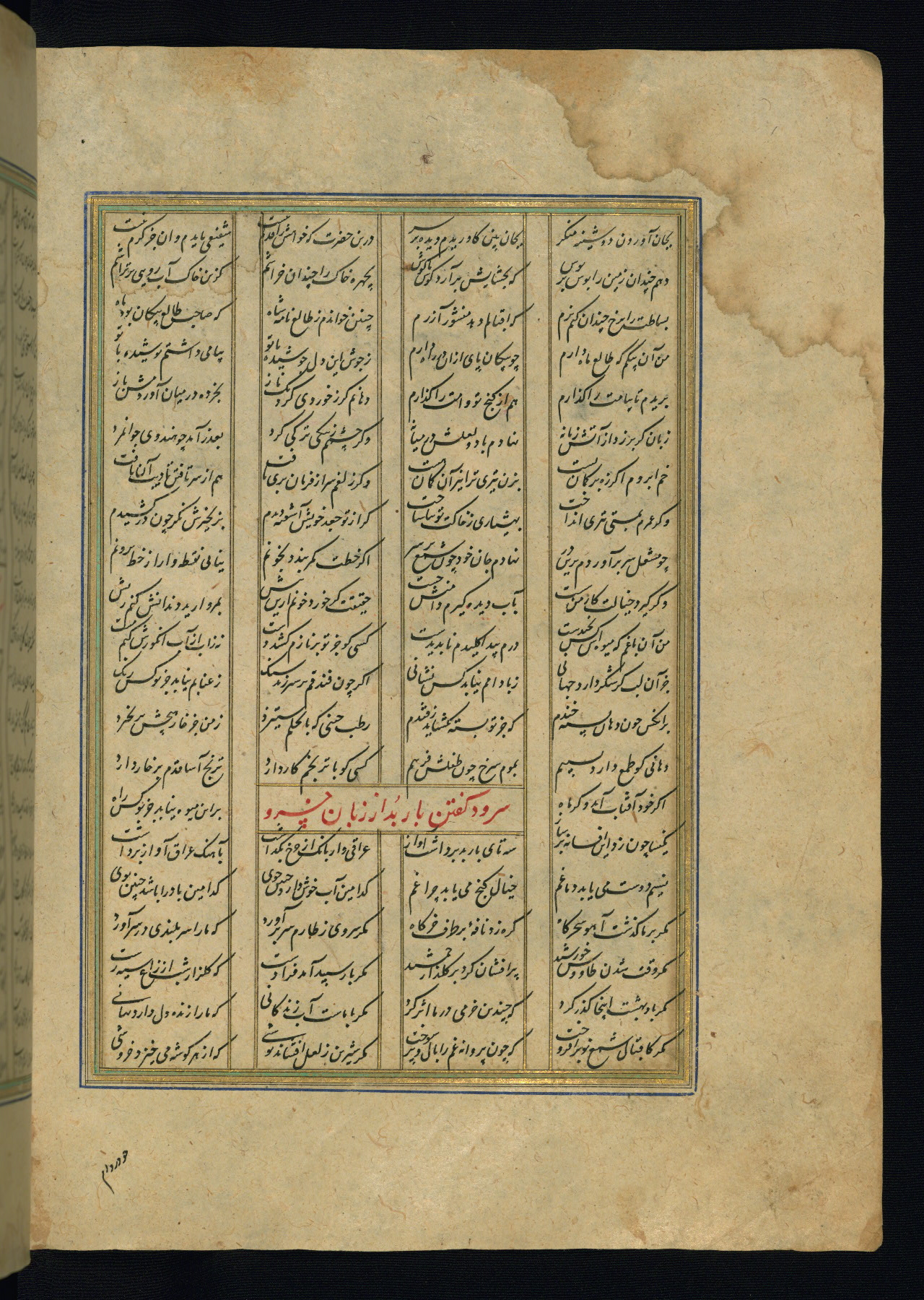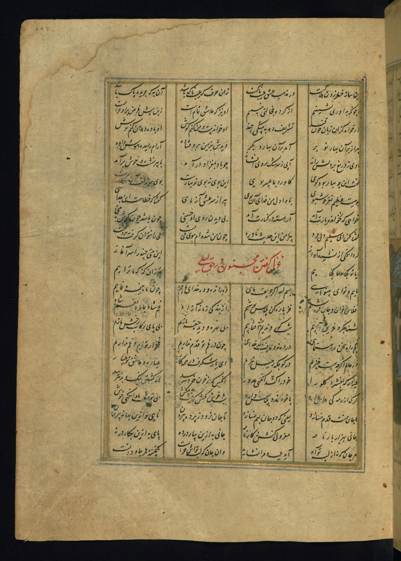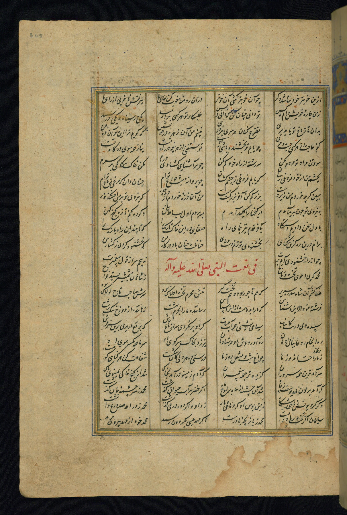 This is an illuminated and illustrated copy of the Khamsah (quintet) by Niẓāmī Ganjavī (d. 605 AH / 1209 CE), completed by Ḥabīb Allāh ibn ʿAlī ibn Ḥusām in Safavid Iran in Rabīʿ II 971 AH / 1563 CE. Illuminated titlepieces introduce the five poems, and there are thirty illustrations, the majority of which are attributable to thirteenth century AH / nineteenth CE Qajar Iran. Ownership notes and seals indicating the provenance of this manuscript are found throughout the codex (fols. 1a, 2a, 153a, 177a, 233a, 349a, and 351a). The binding is not original to the manuscript.