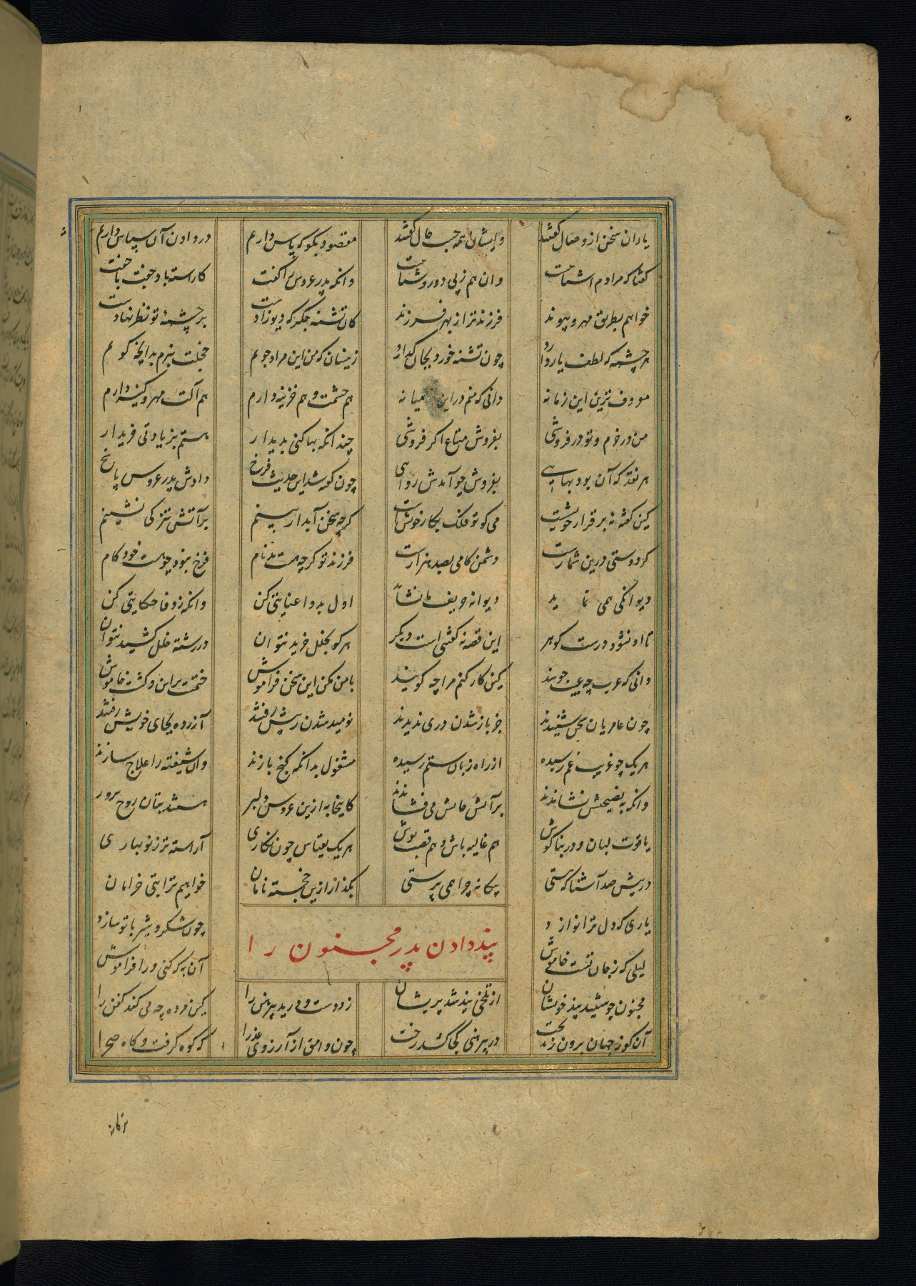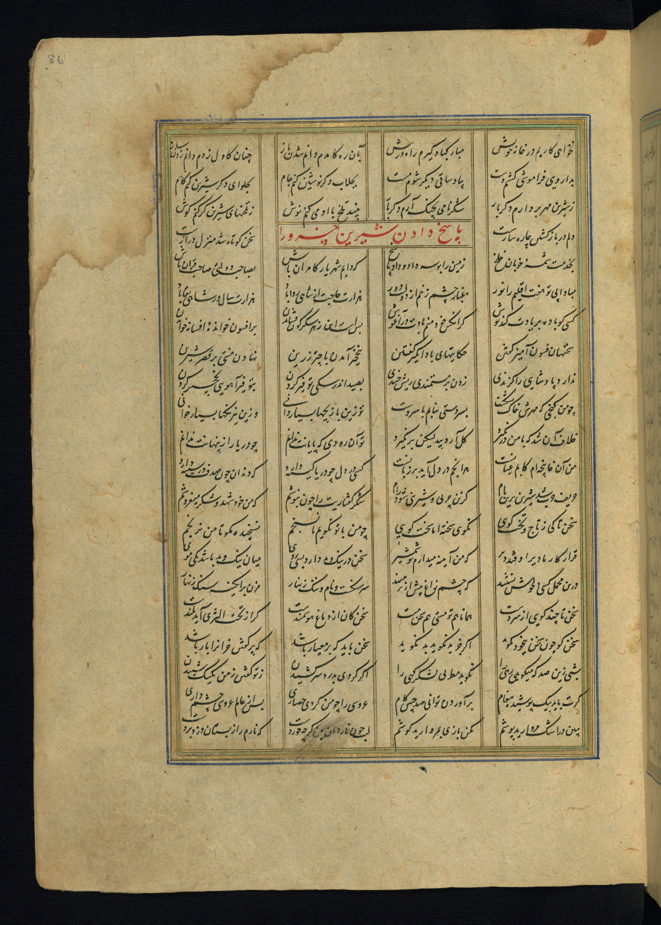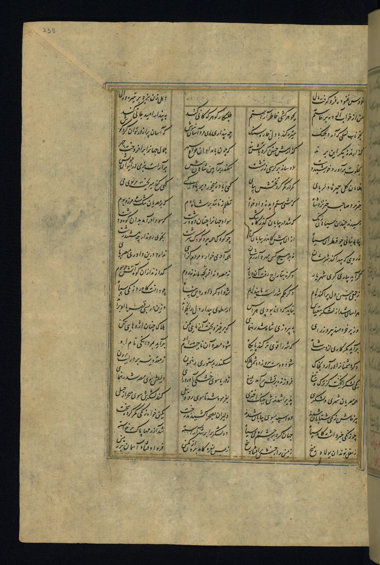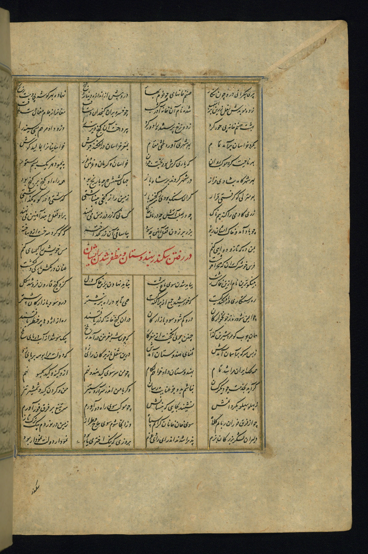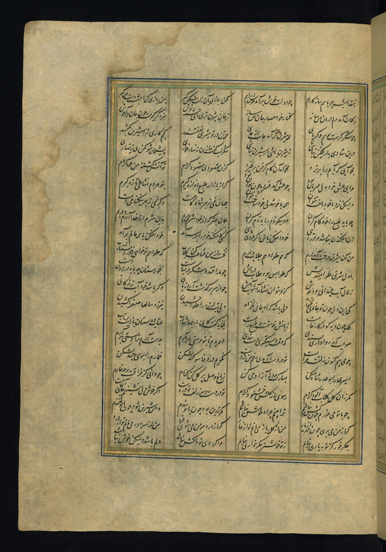 This is an illuminated and illustrated copy of the Khamsah (quintet) by Niẓāmī Ganjavī (d. 605 AH / 1209 CE), completed by Ḥabīb Allāh ibn ʿAlī ibn Ḥusām in Safavid Iran in Rabīʿ II 971 AH / 1563 CE. Illuminated titlepieces introduce the five poems, and there are thirty illustrations, the majority of which are attributable to thirteenth century AH / nineteenth CE Qajar Iran. Ownership notes and seals indicating the provenance of this manuscript are found throughout the codex (fols. 1a, 2a, 153a, 177a, 233a, 349a, and 351a). The binding is not original to the manuscript.