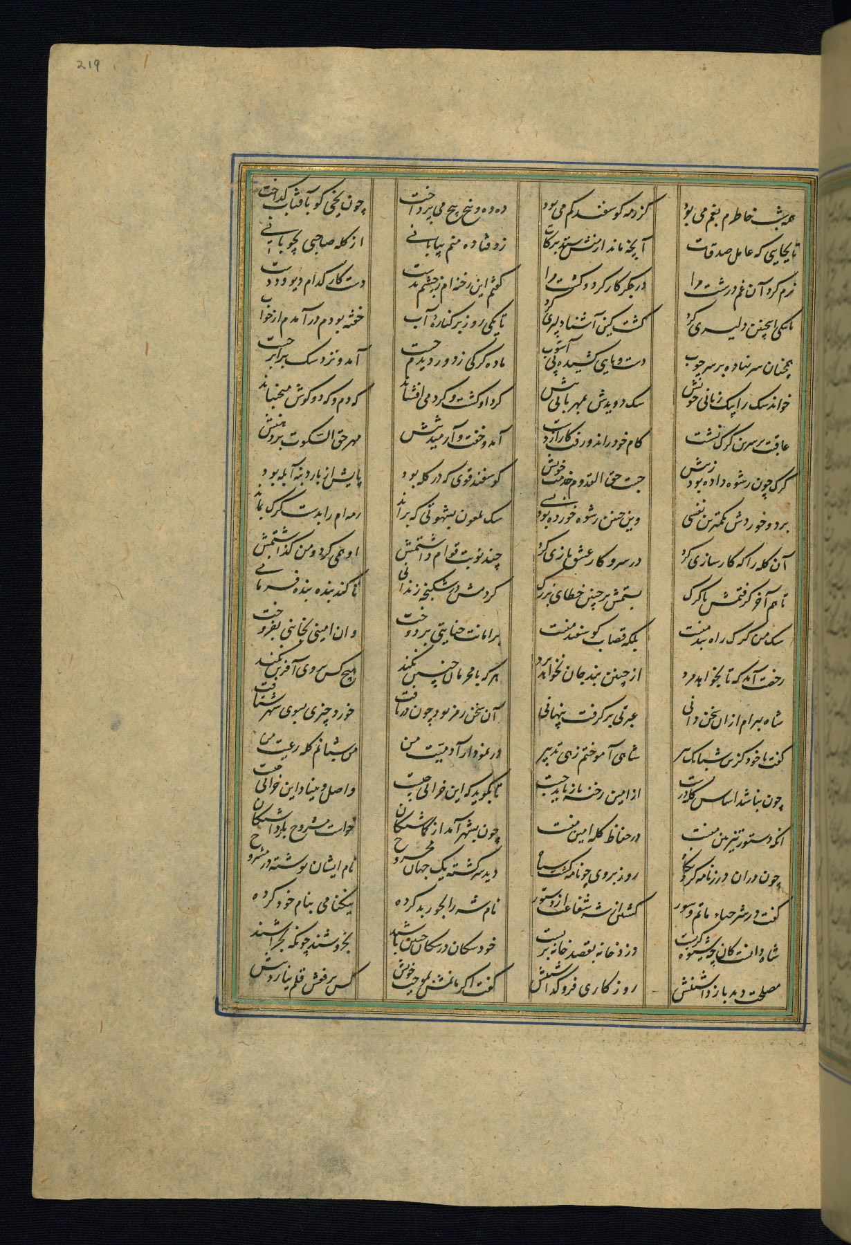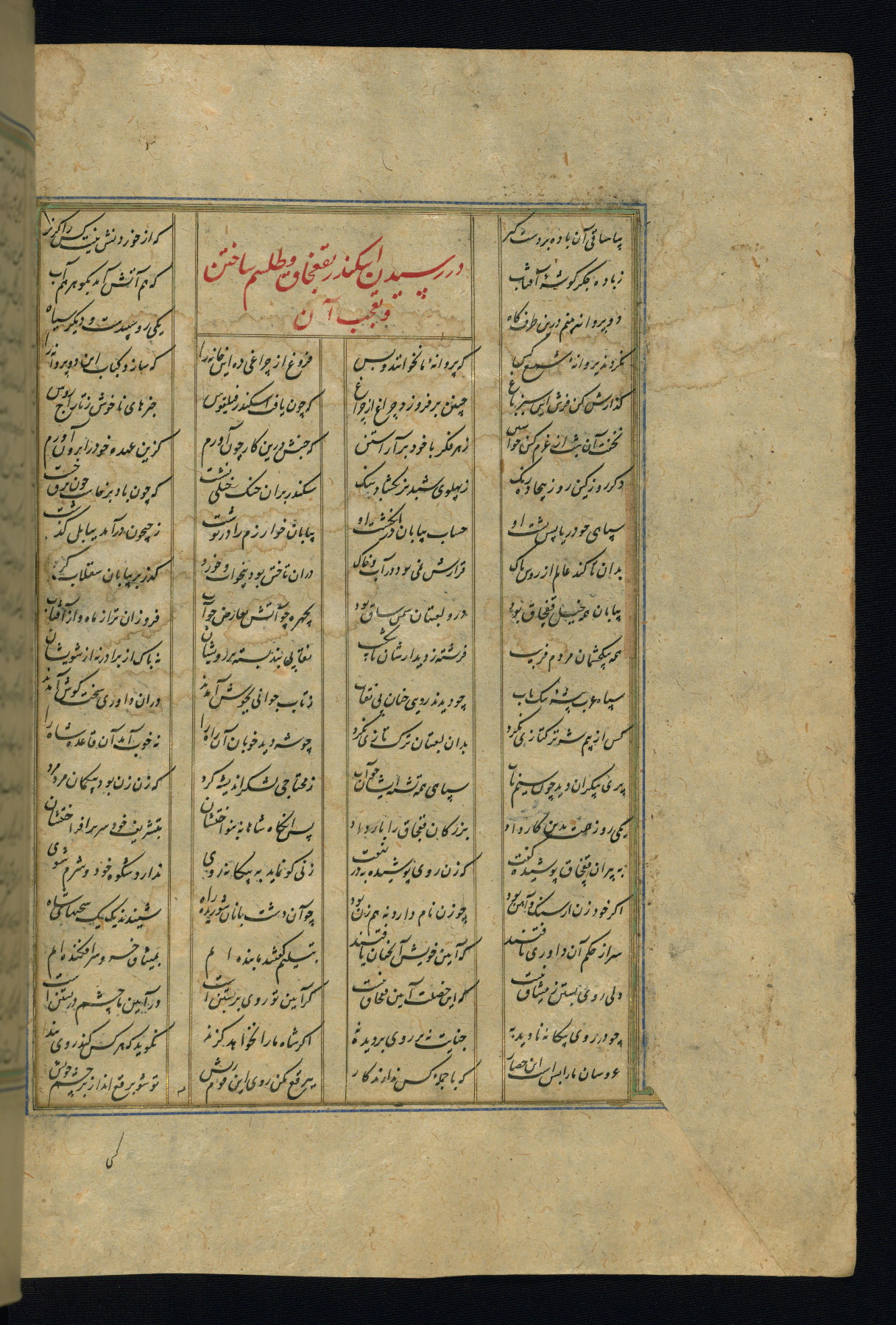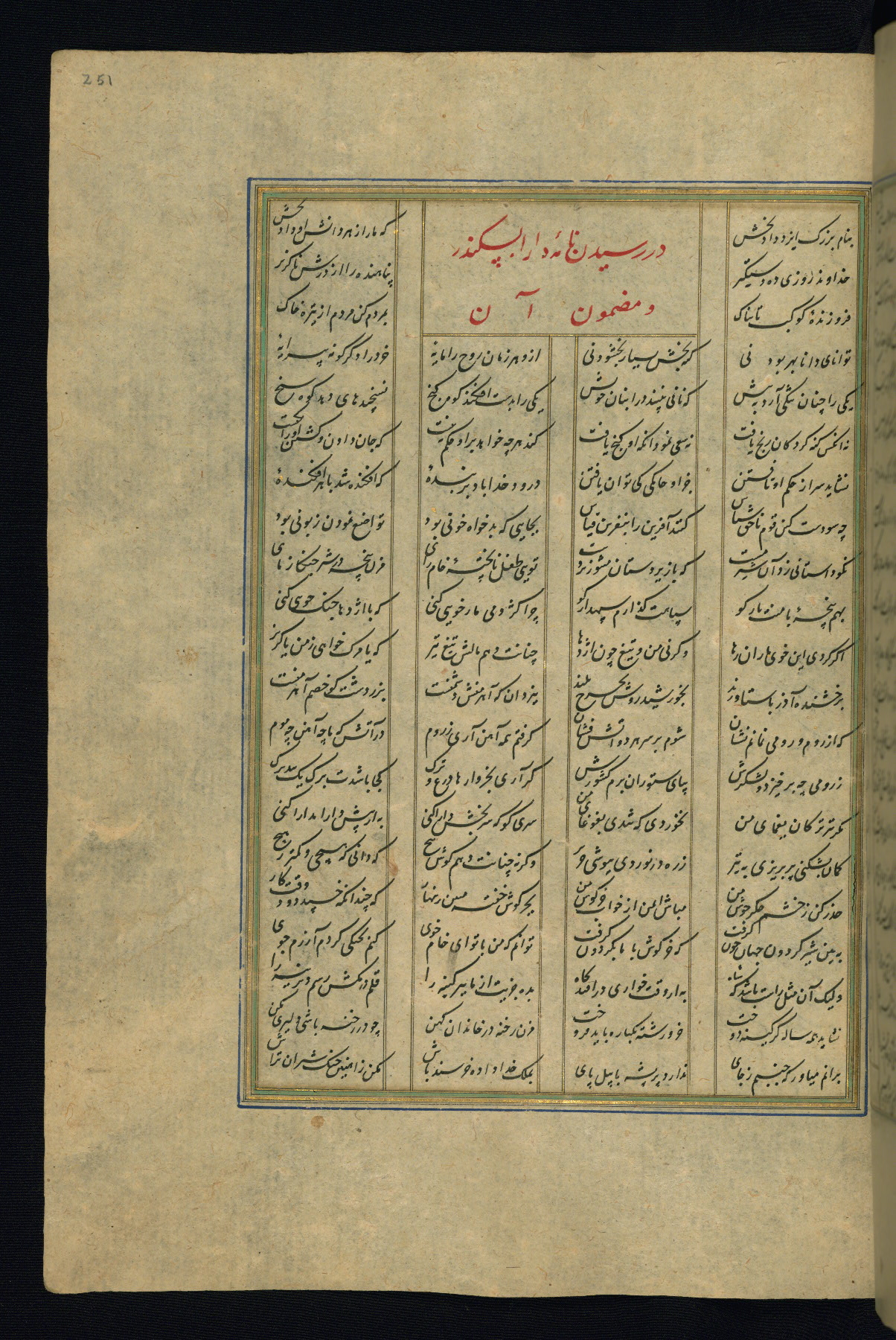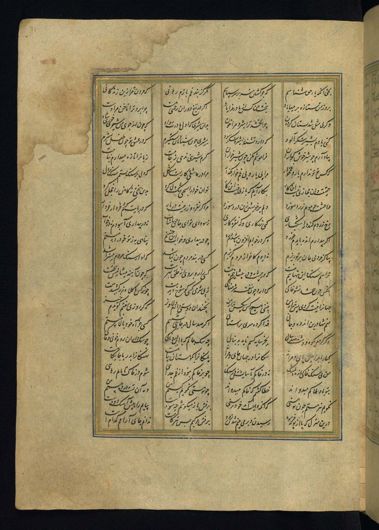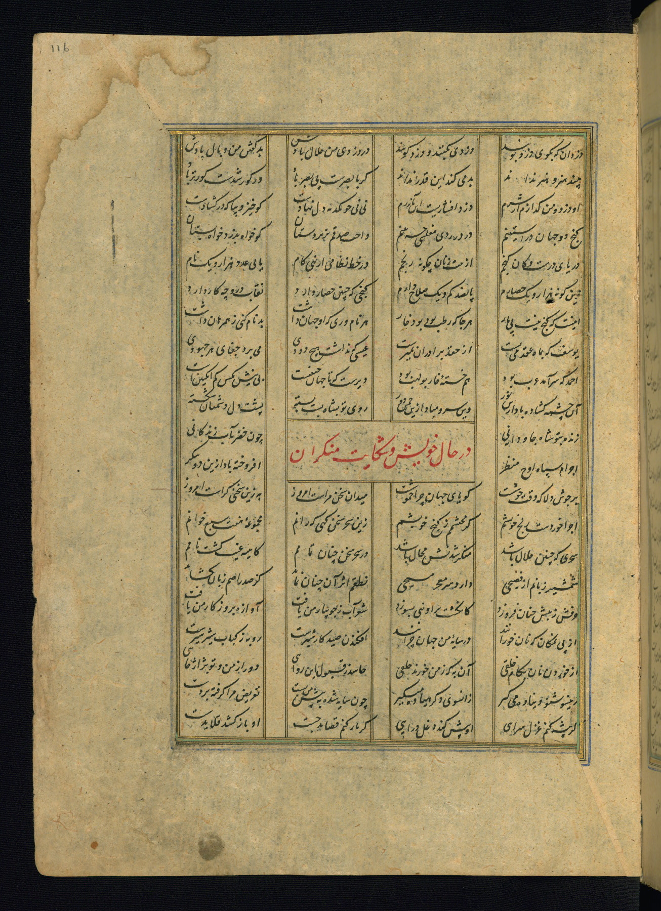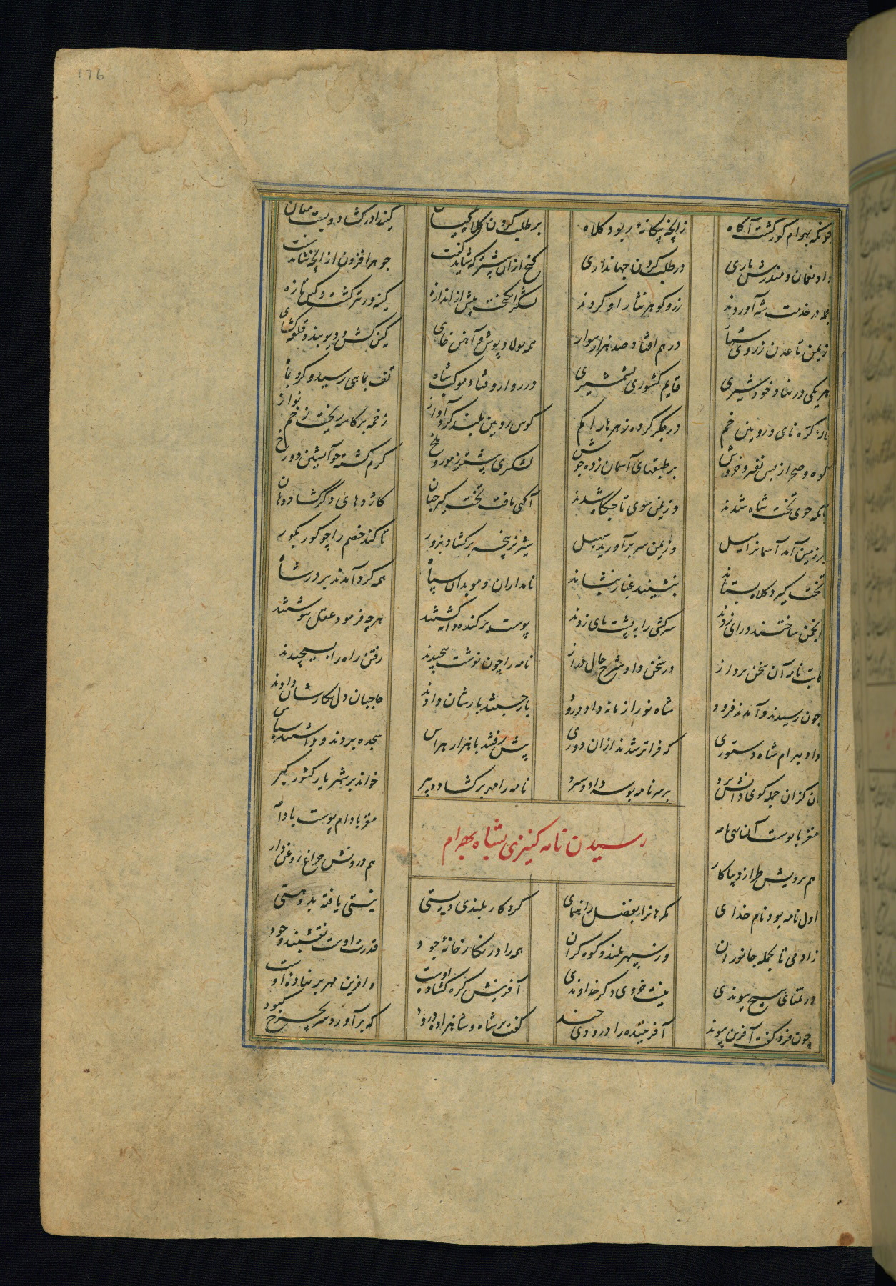 This is an illuminated and illustrated copy of the Khamsah (quintet) by Niẓāmī Ganjavī (d. 605 AH / 1209 CE), completed by Ḥabīb Allāh ibn ʿAlī ibn Ḥusām in Safavid Iran in Rabīʿ II 971 AH / 1563 CE. Illuminated titlepieces introduce the five poems, and there are thirty illustrations, the majority of which are attributable to thirteenth century AH / nineteenth CE Qajar Iran. Ownership notes and seals indicating the provenance of this manuscript are found throughout the codex (fols. 1a, 2a, 153a, 177a, 233a, 349a, and 351a). The binding is not original to the manuscript.
