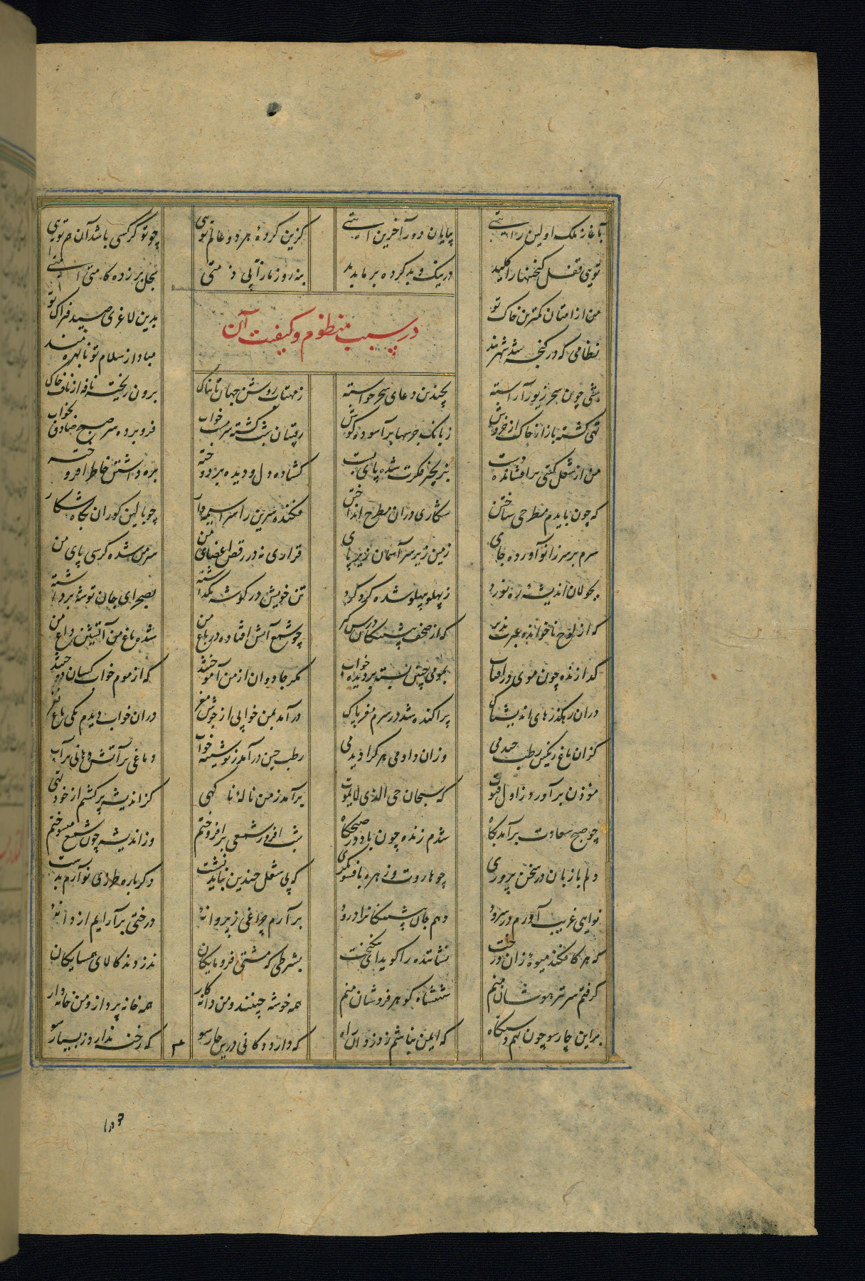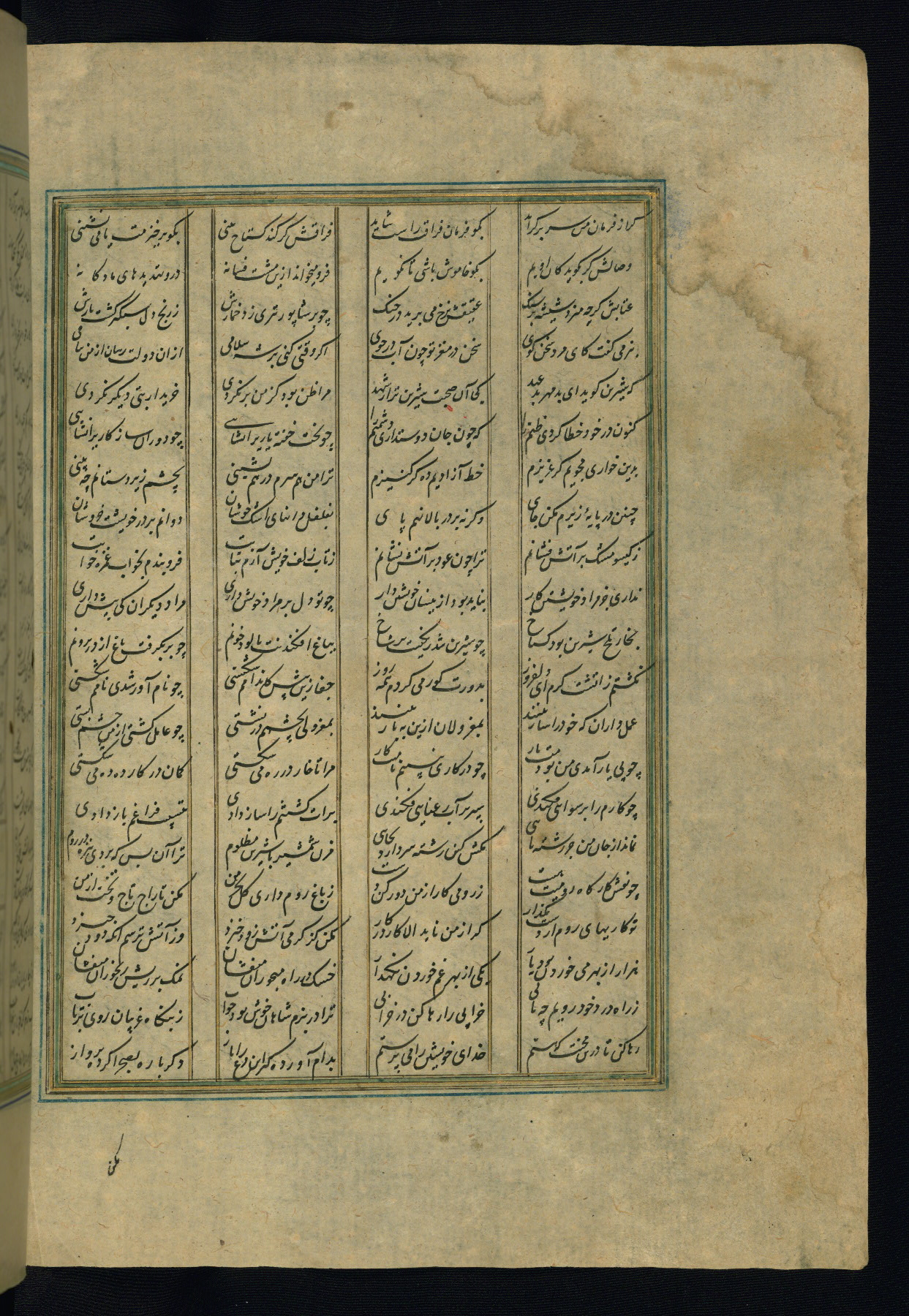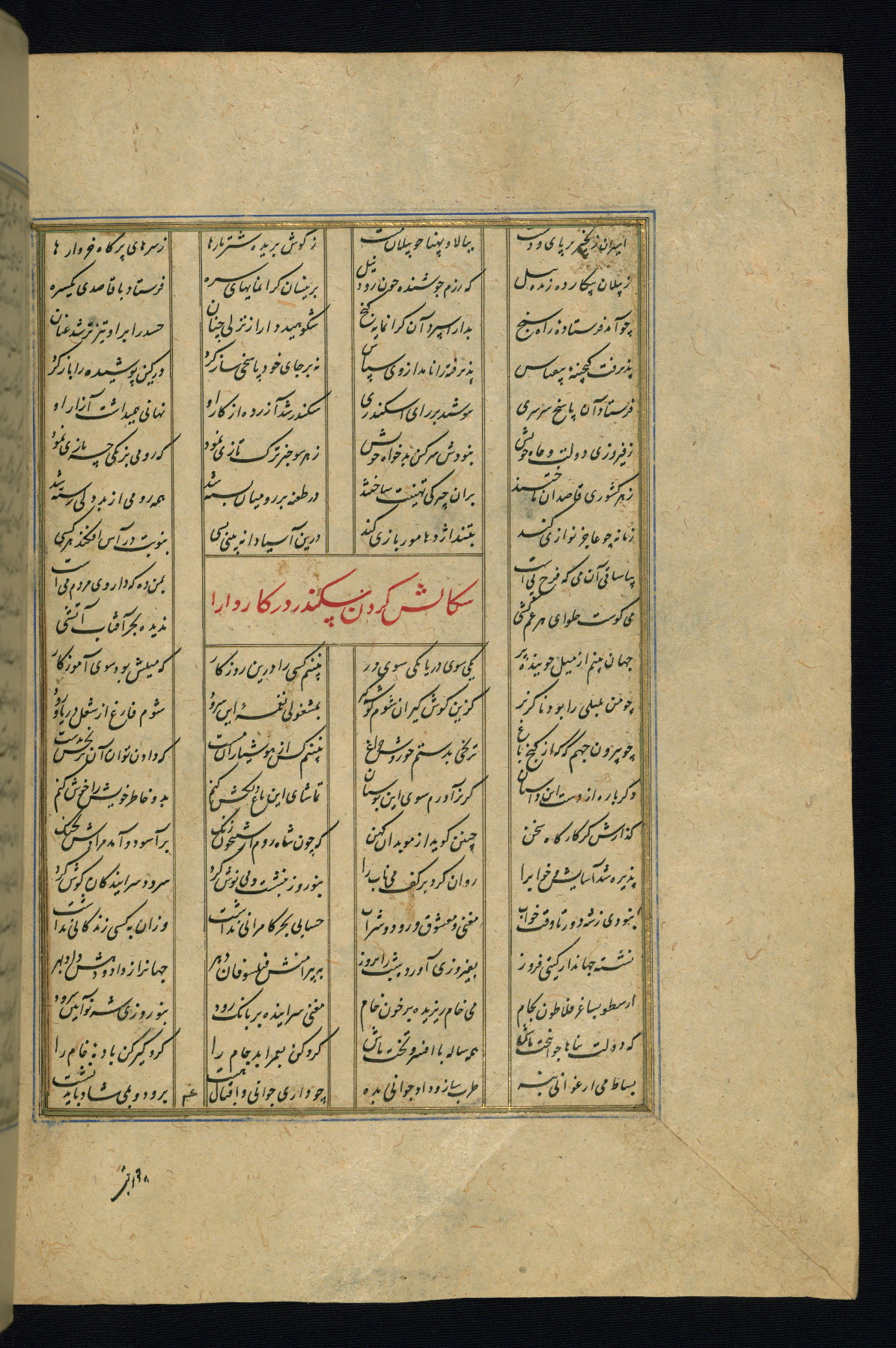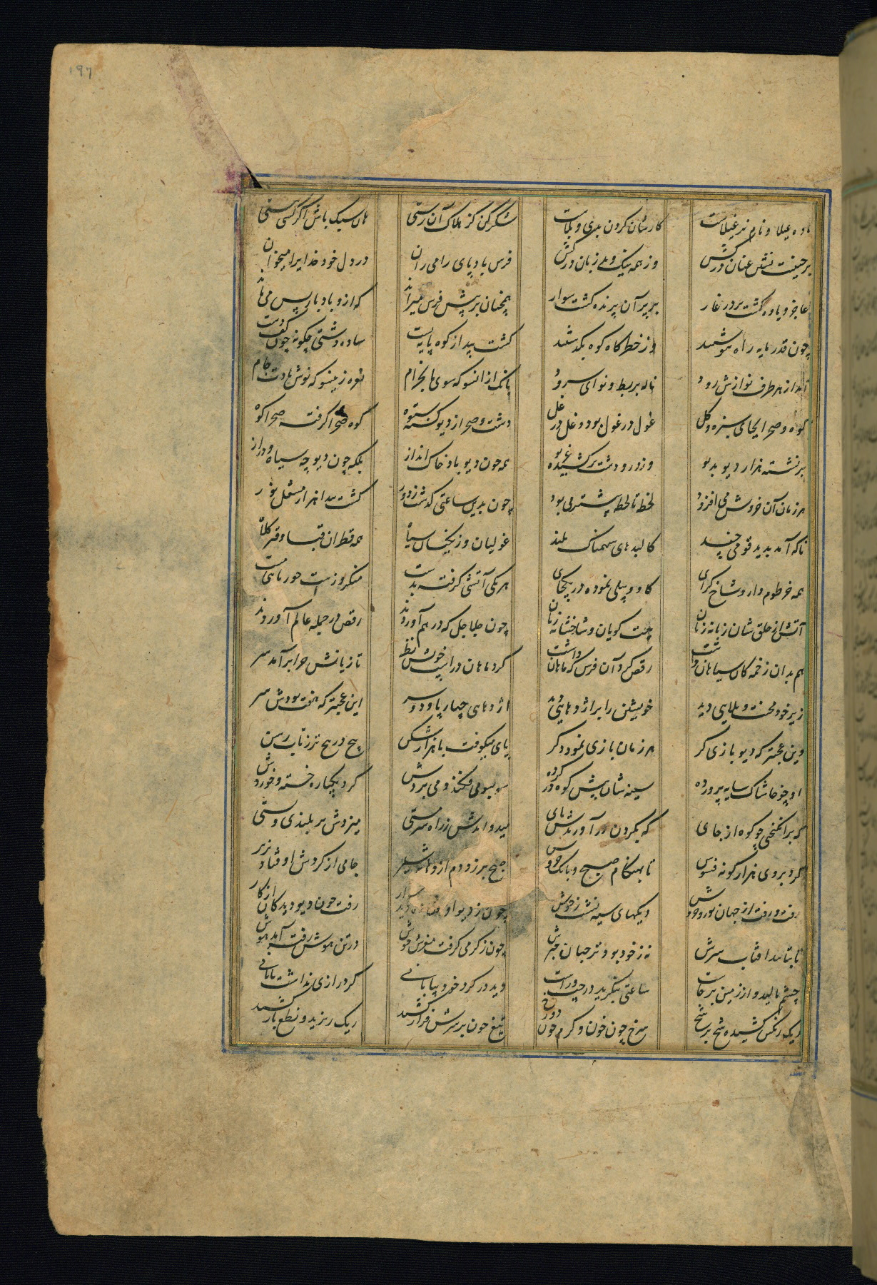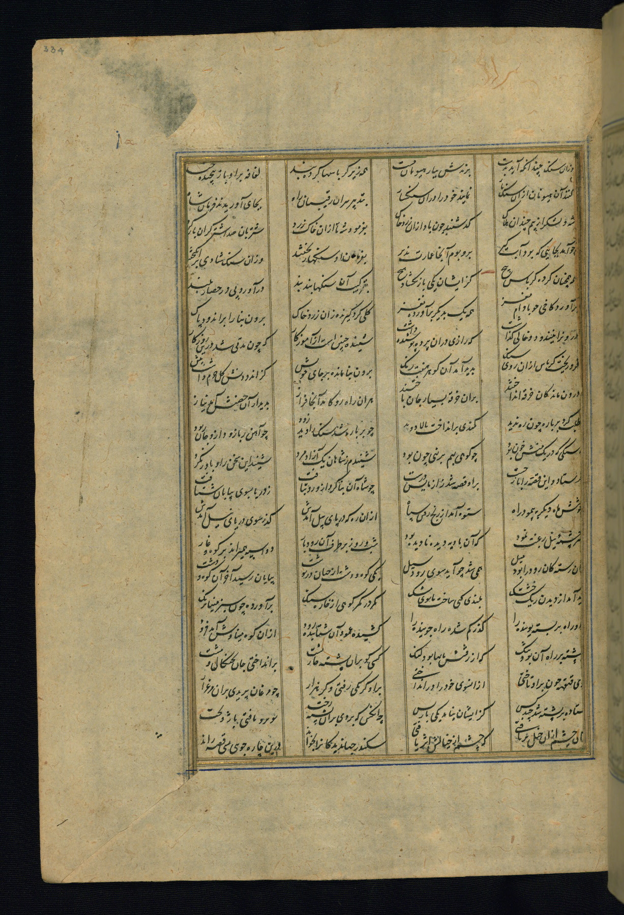 This is an illuminated and illustrated copy of the Khamsah (quintet) by Niẓāmī Ganjavī (d. 605 AH / 1209 CE), completed by Ḥabīb Allāh ibn ʿAlī ibn Ḥusām in Safavid Iran in Rabīʿ II 971 AH / 1563 CE. Illuminated titlepieces introduce the five poems, and there are thirty illustrations, the majority of which are attributable to thirteenth century AH / nineteenth CE Qajar Iran. Ownership notes and seals indicating the provenance of this manuscript are found throughout the codex (fols. 1a, 2a, 153a, 177a, 233a, 349a, and 351a). The binding is not original to the manuscript.