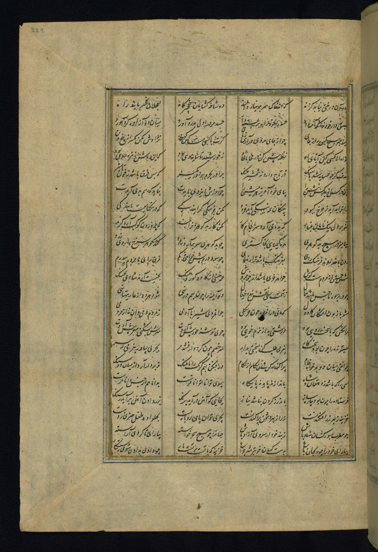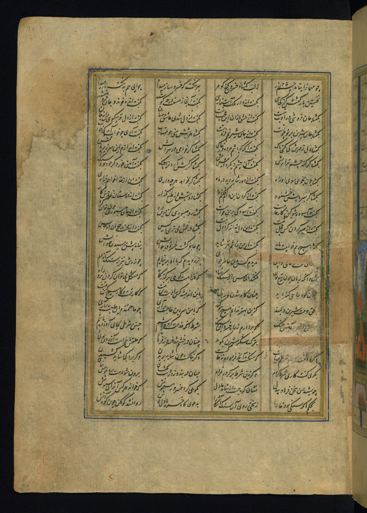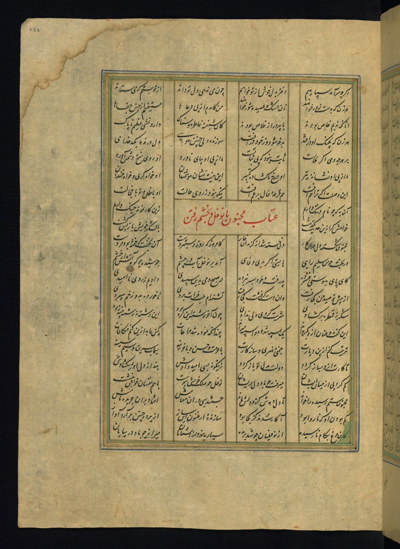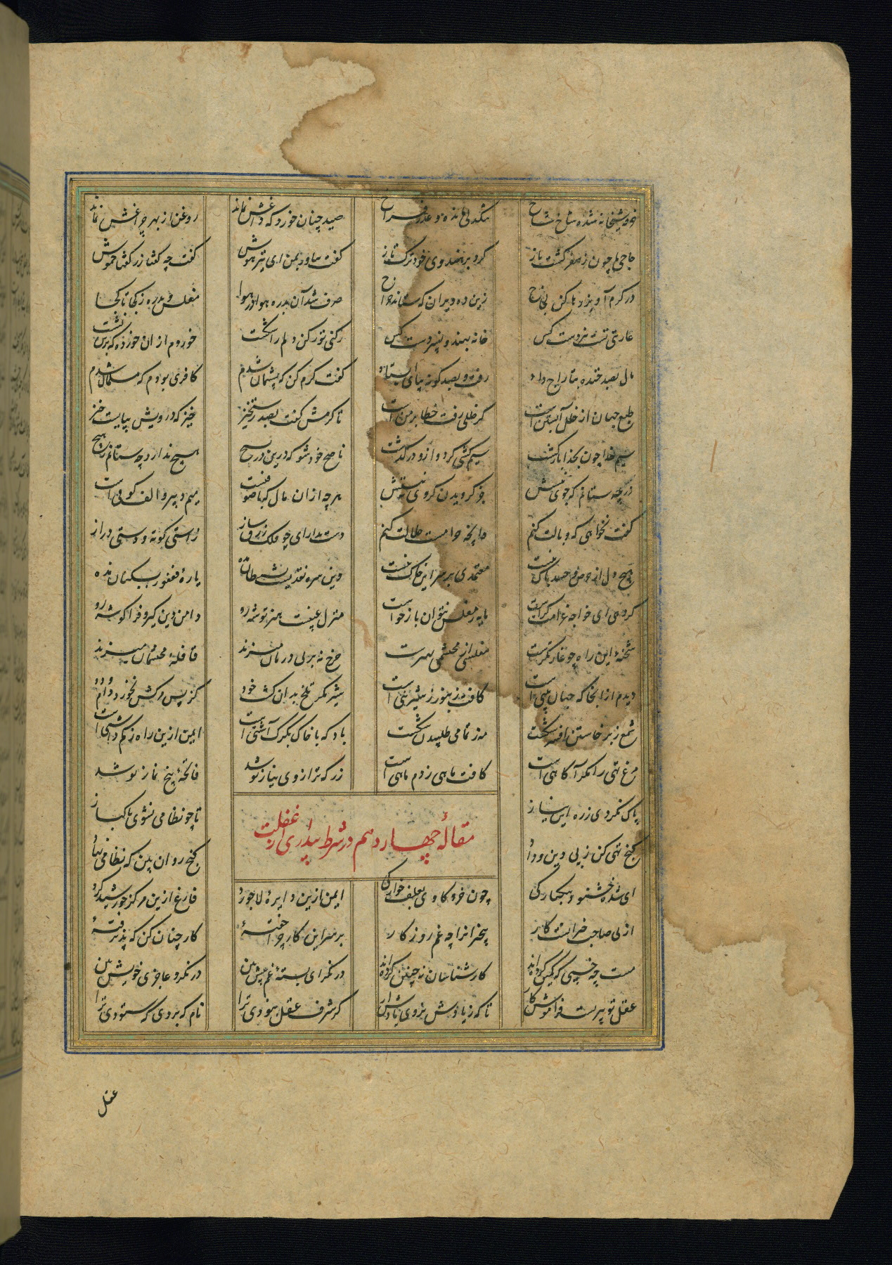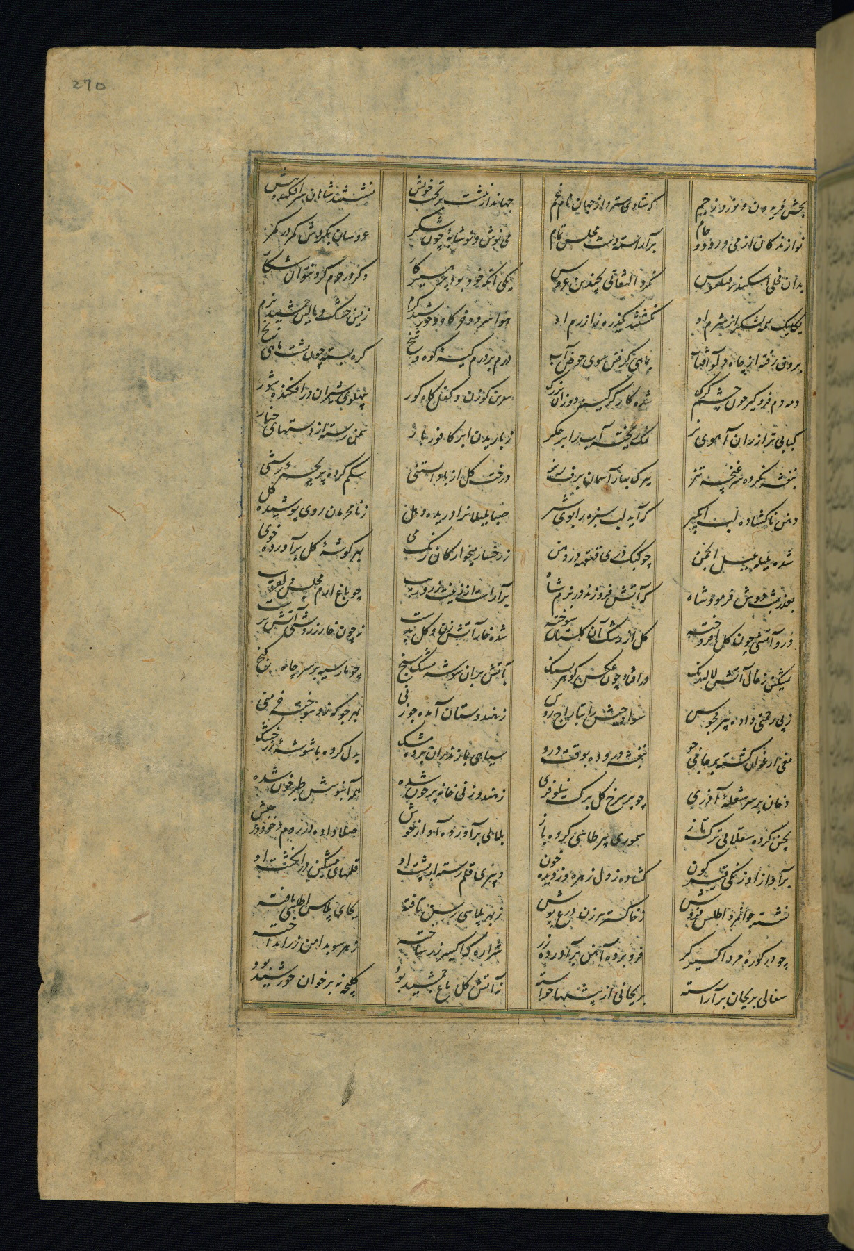 This is an illuminated and illustrated copy of the Khamsah (quintet) by Niẓāmī Ganjavī (d. 605 AH / 1209 CE), completed by Ḥabīb Allāh ibn ʿAlī ibn Ḥusām in Safavid Iran in Rabīʿ II 971 AH / 1563 CE. Illuminated titlepieces introduce the five poems, and there are thirty illustrations, the majority of which are attributable to thirteenth century AH / nineteenth CE Qajar Iran. Ownership notes and seals indicating the provenance of this manuscript are found throughout the codex (fols. 1a, 2a, 153a, 177a, 233a, 349a, and 351a). The binding is not original to the manuscript.