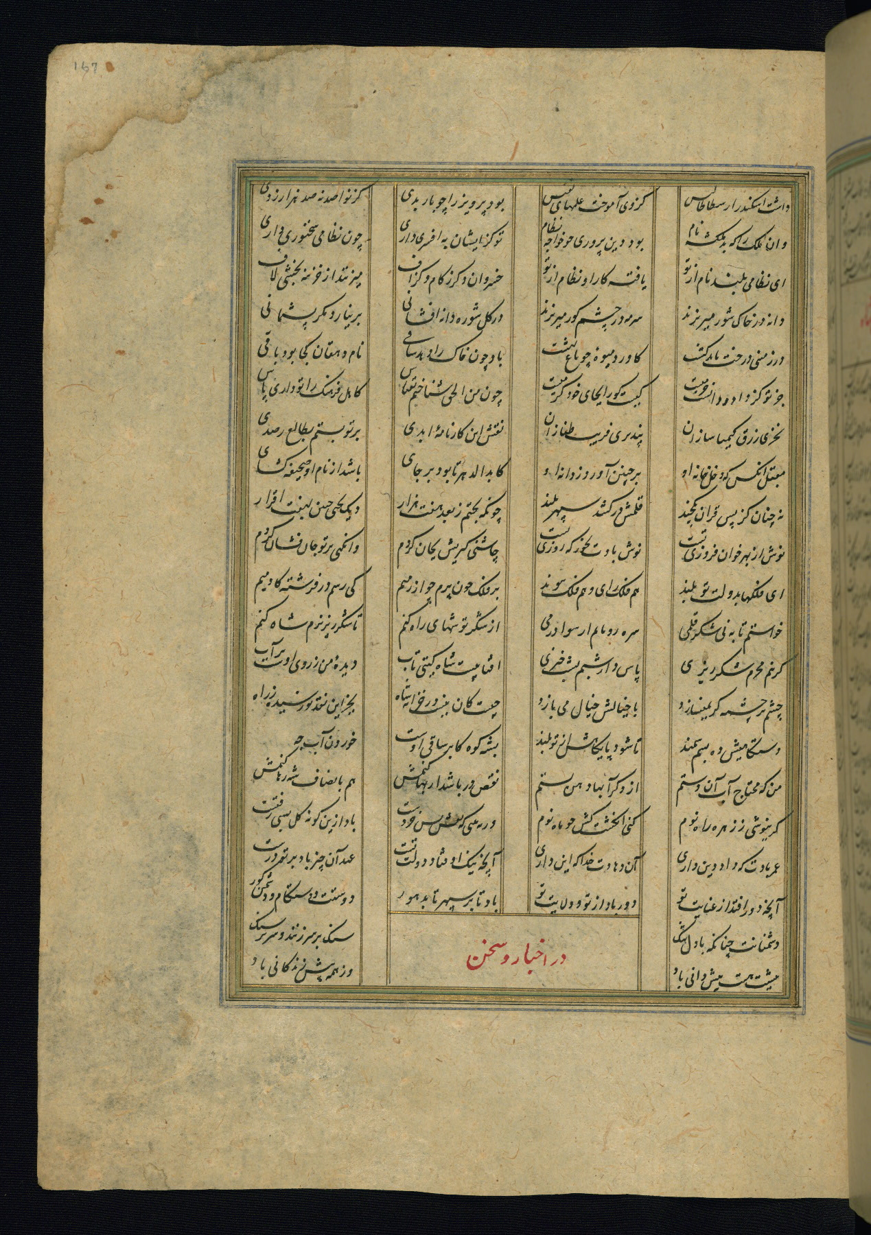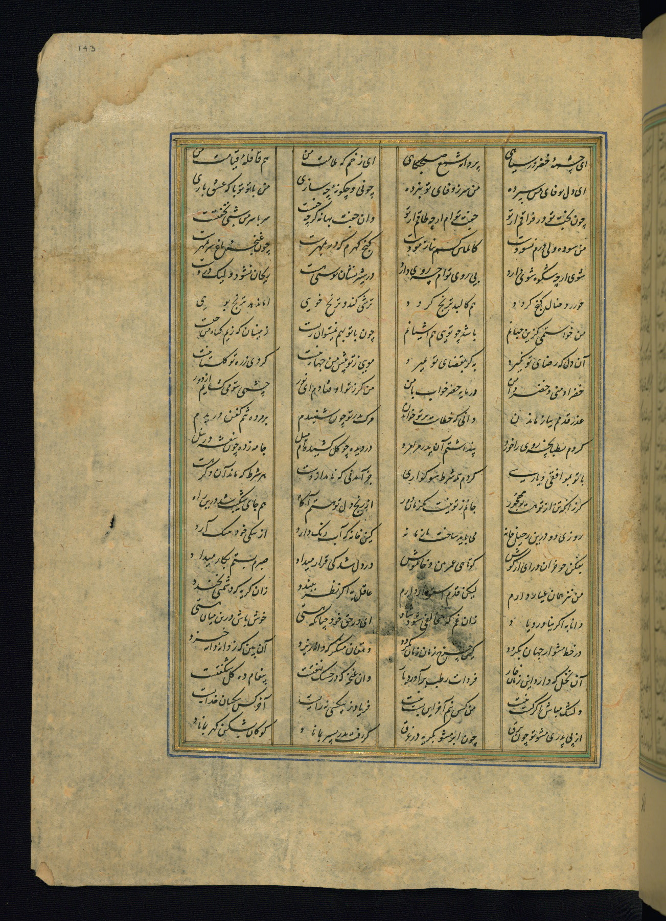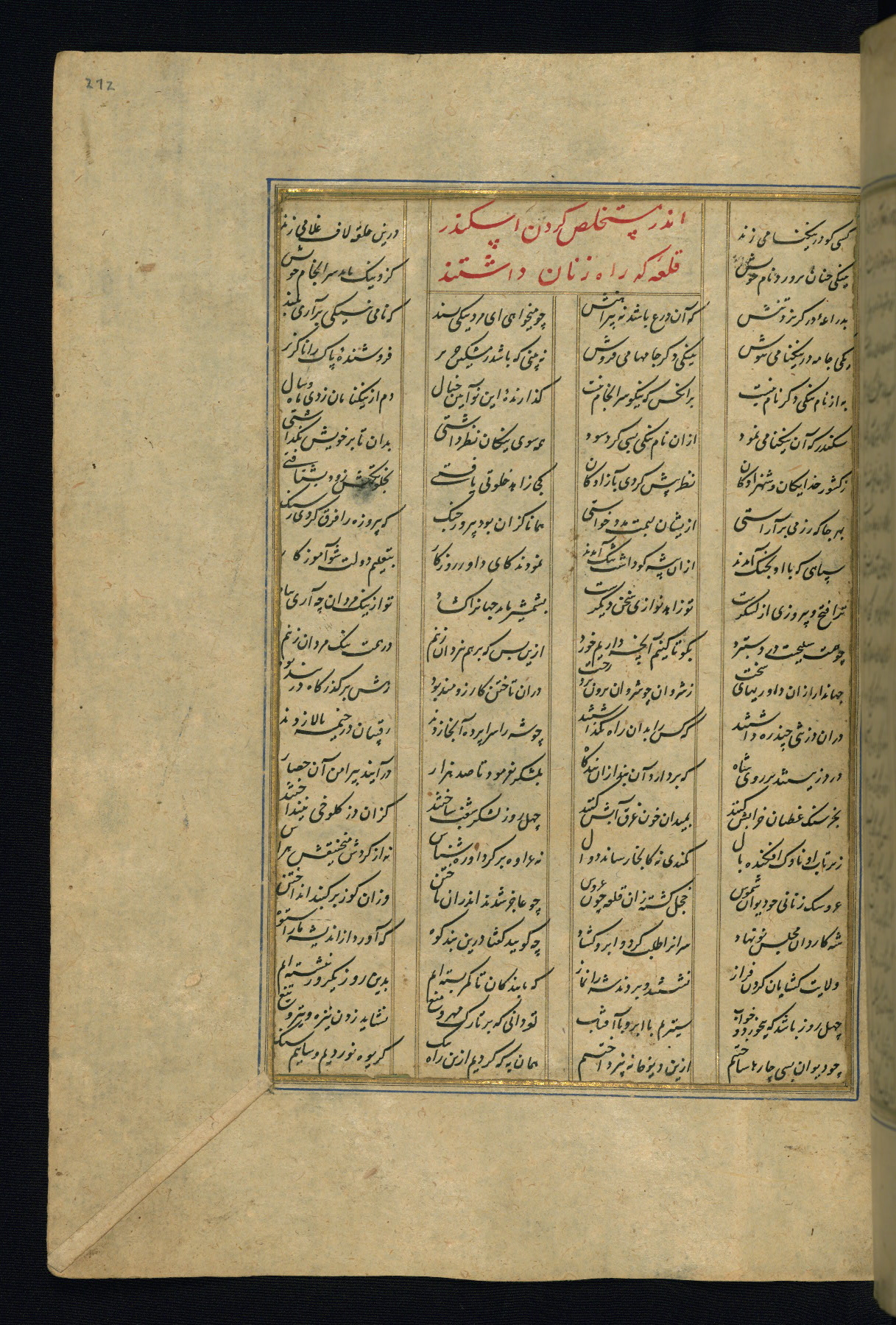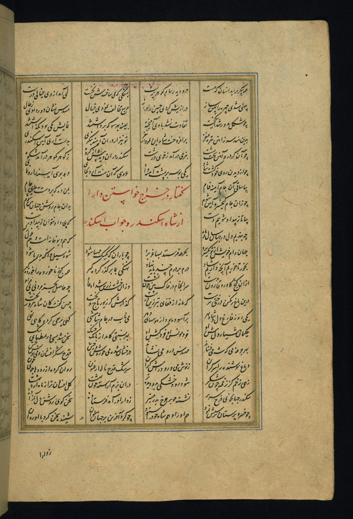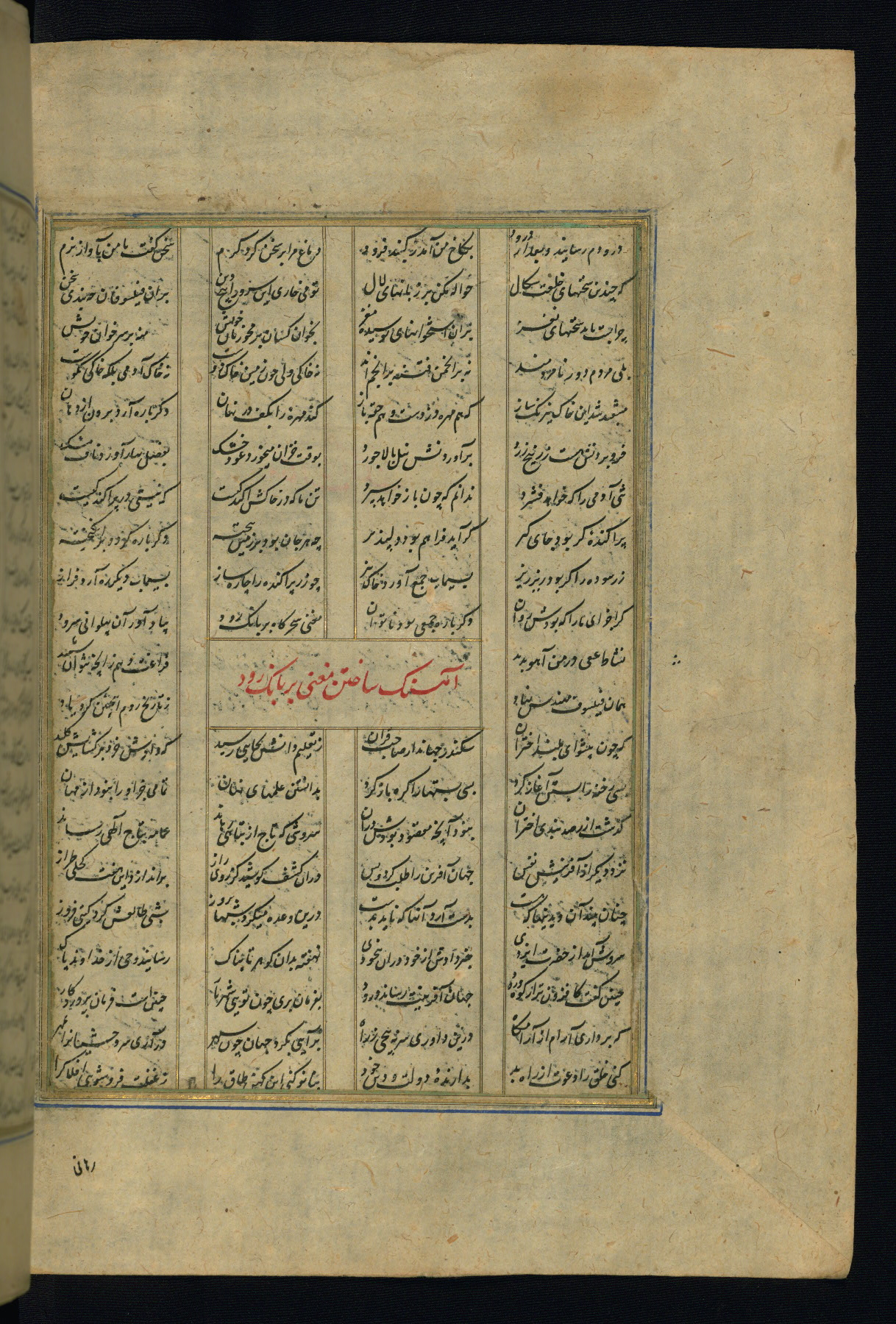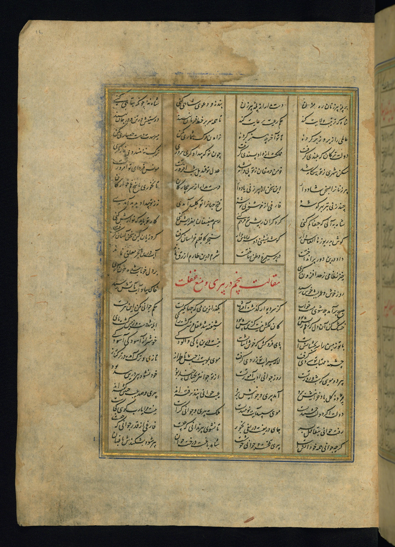 This is an illuminated and illustrated copy of the Khamsah (quintet) by Niẓāmī Ganjavī (d. 605 AH / 1209 CE), completed by Ḥabīb Allāh ibn ʿAlī ibn Ḥusām in Safavid Iran in Rabīʿ II 971 AH / 1563 CE. Illuminated titlepieces introduce the five poems, and there are thirty illustrations, the majority of which are attributable to thirteenth century AH / nineteenth CE Qajar Iran. Ownership notes and seals indicating the provenance of this manuscript are found throughout the codex (fols. 1a, 2a, 153a, 177a, 233a, 349a, and 351a). The binding is not original to the manuscript.