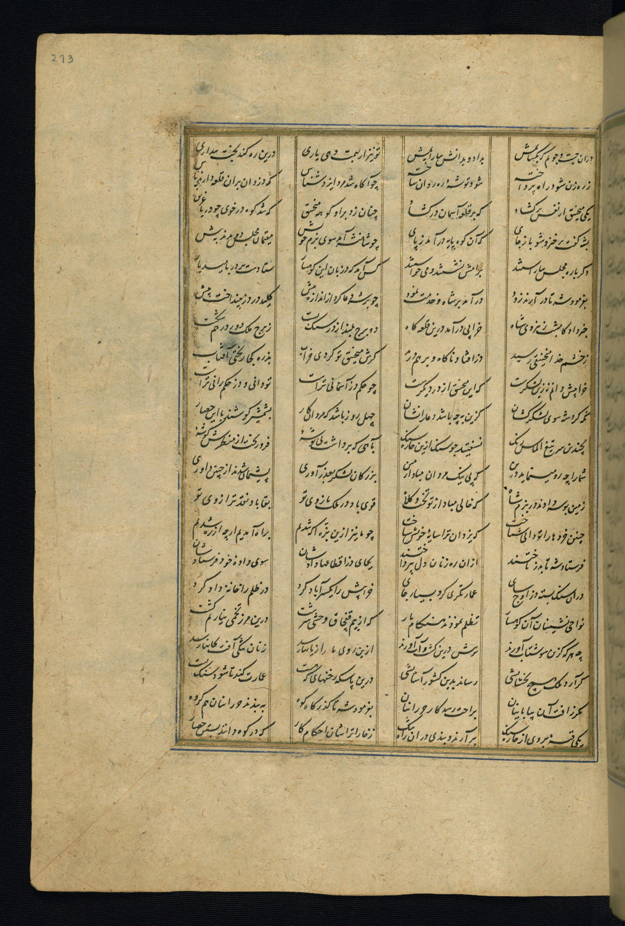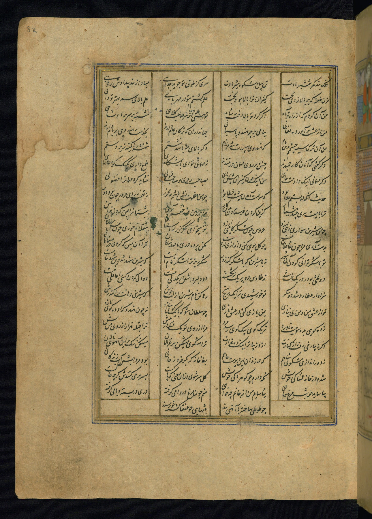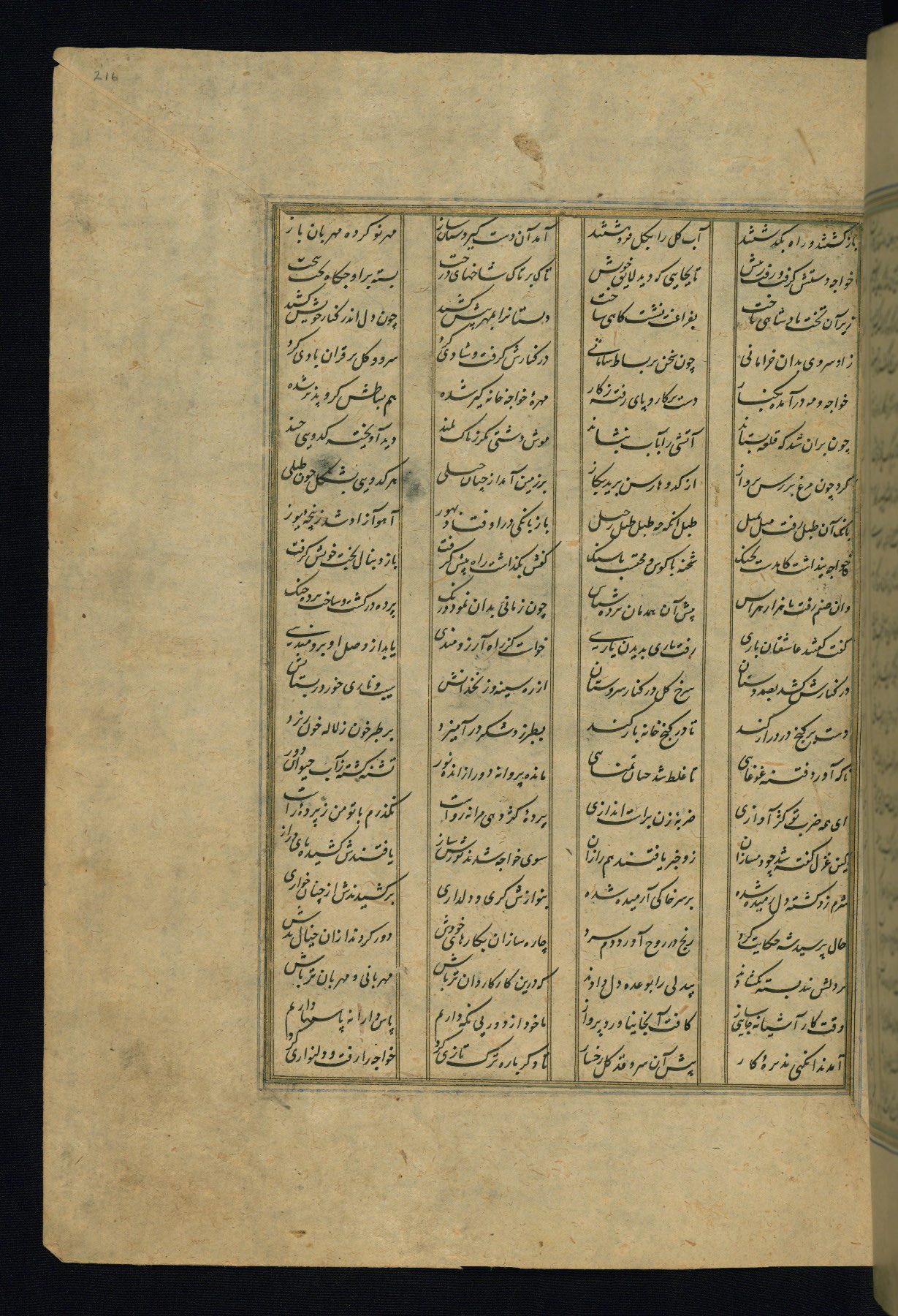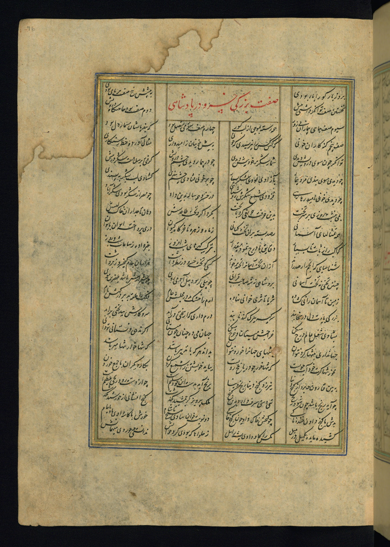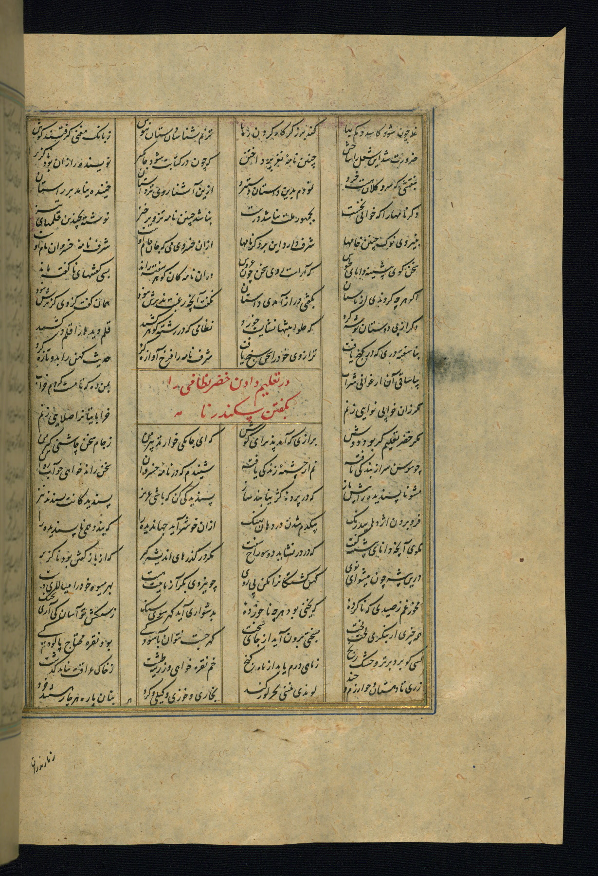 This is an illuminated and illustrated copy of the Khamsah (quintet) by Niẓāmī Ganjavī (d. 605 AH / 1209 CE), completed by Ḥabīb Allāh ibn ʿAlī ibn Ḥusām in Safavid Iran in Rabīʿ II 971 AH / 1563 CE. Illuminated titlepieces introduce the five poems, and there are thirty illustrations, the majority of which are attributable to thirteenth century AH / nineteenth CE Qajar Iran. Ownership notes and seals indicating the provenance of this manuscript are found throughout the codex (fols. 1a, 2a, 153a, 177a, 233a, 349a, and 351a). The binding is not original to the manuscript.