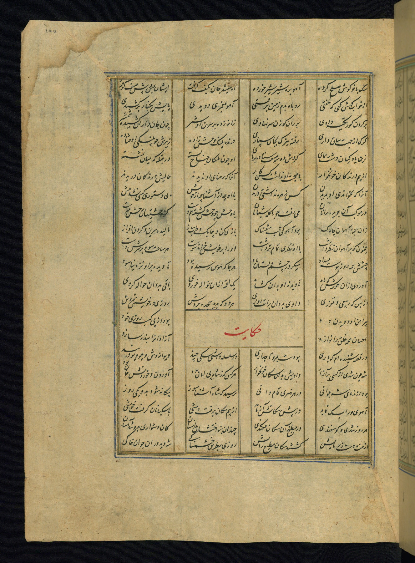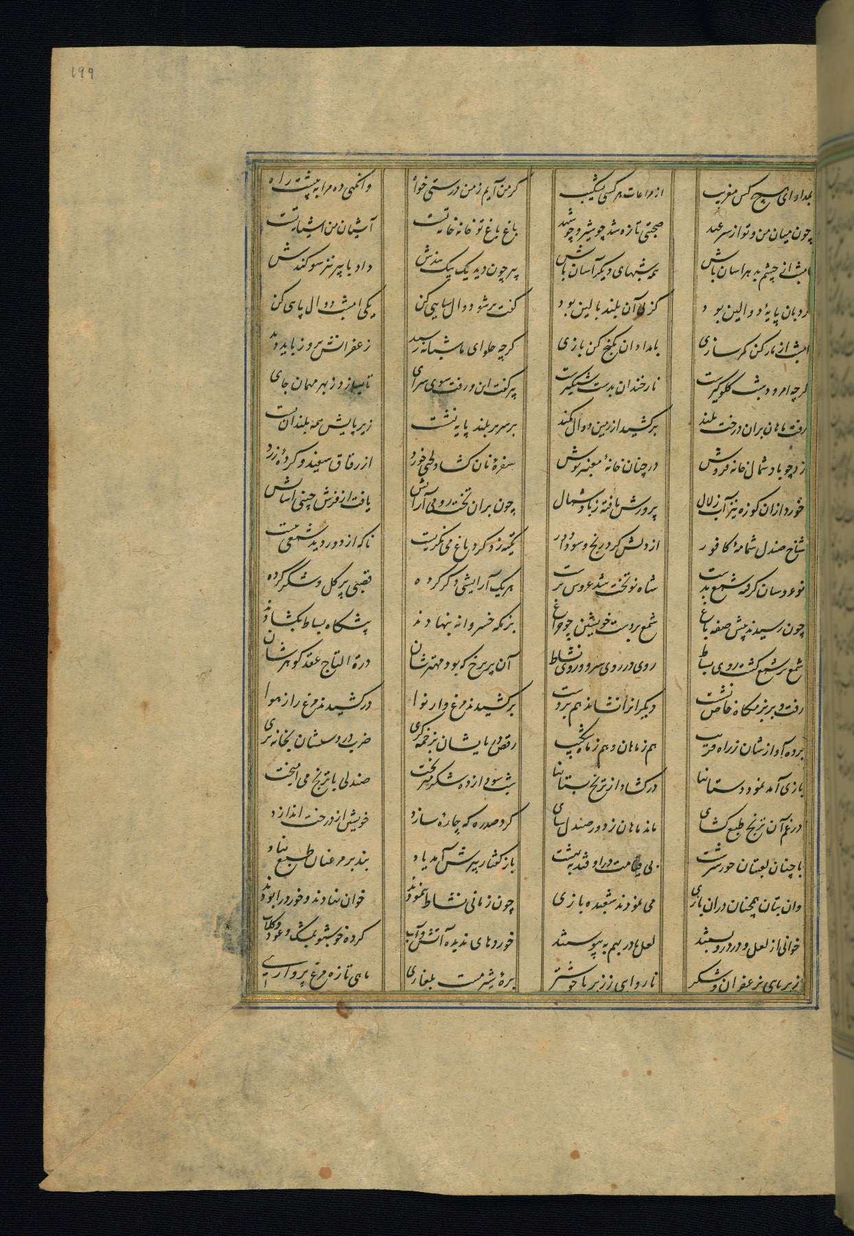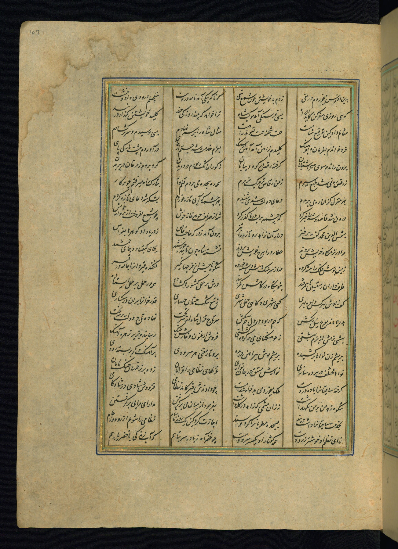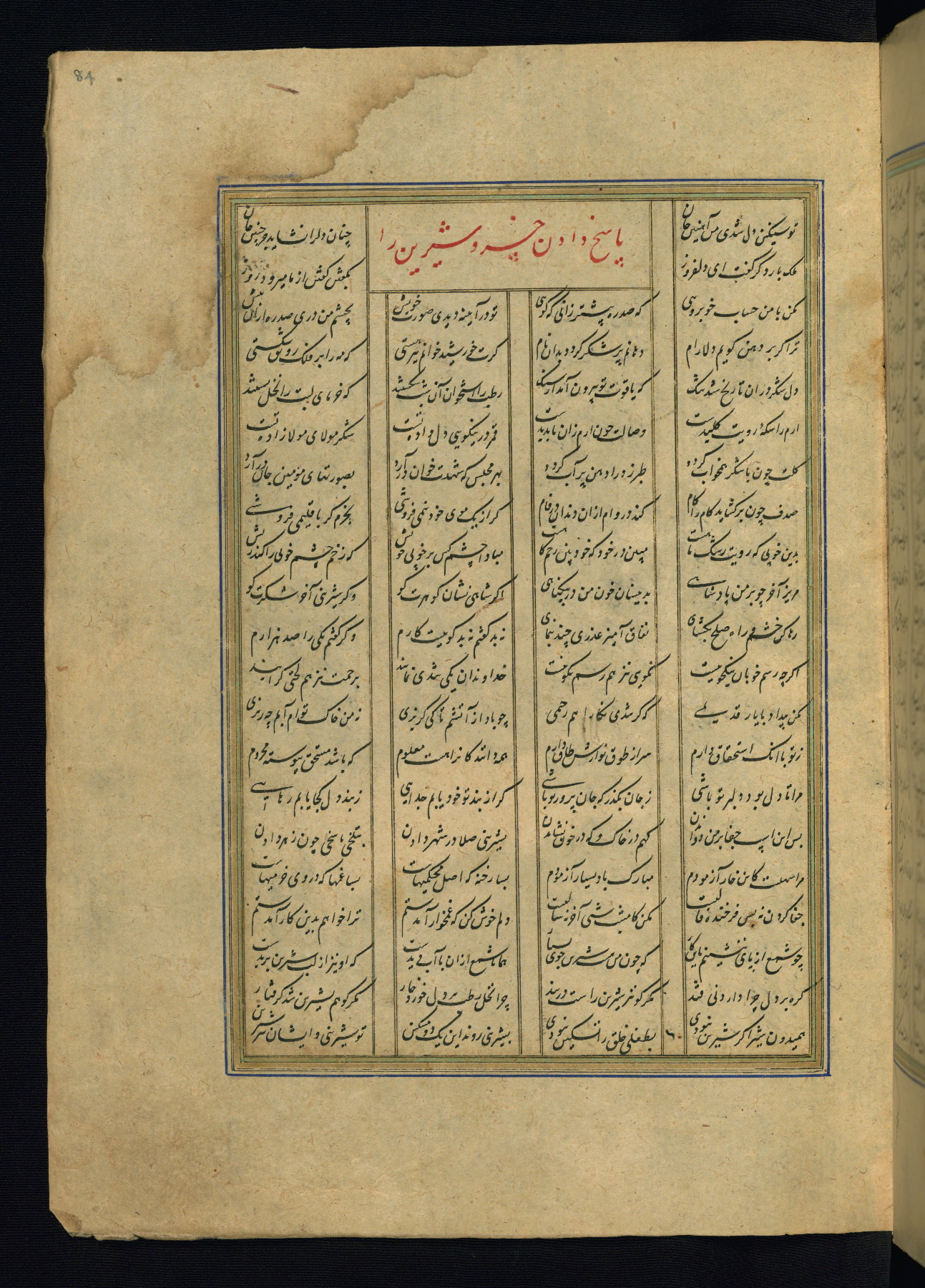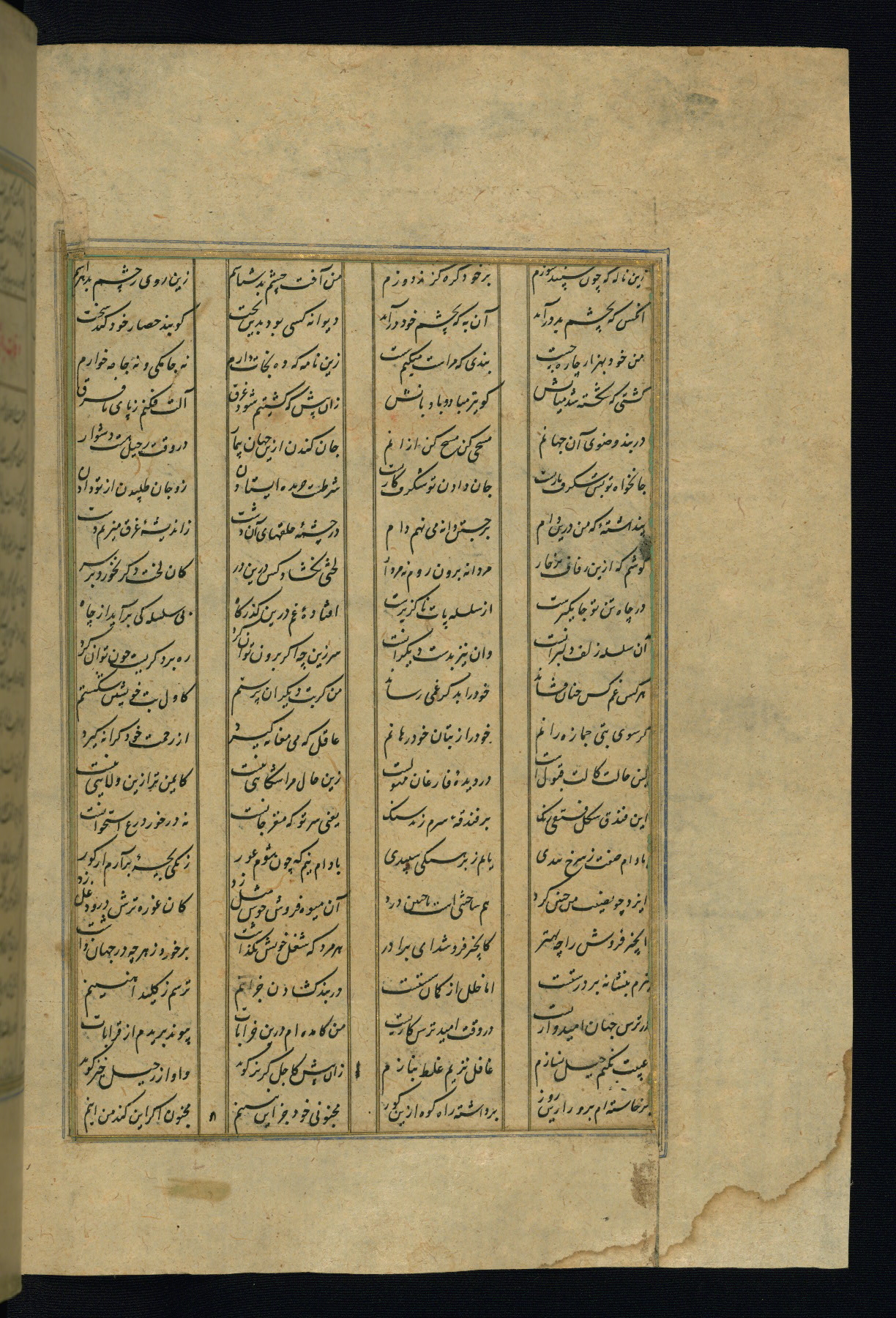 This is an illuminated and illustrated copy of the Khamsah (quintet) by Niẓāmī Ganjavī (d. 605 AH / 1209 CE), completed by Ḥabīb Allāh ibn ʿAlī ibn Ḥusām in Safavid Iran in Rabīʿ II 971 AH / 1563 CE. Illuminated titlepieces introduce the five poems, and there are thirty illustrations, the majority of which are attributable to thirteenth century AH / nineteenth CE Qajar Iran. Ownership notes and seals indicating the provenance of this manuscript are found throughout the codex (fols. 1a, 2a, 153a, 177a, 233a, 349a, and 351a). The binding is not original to the manuscript.