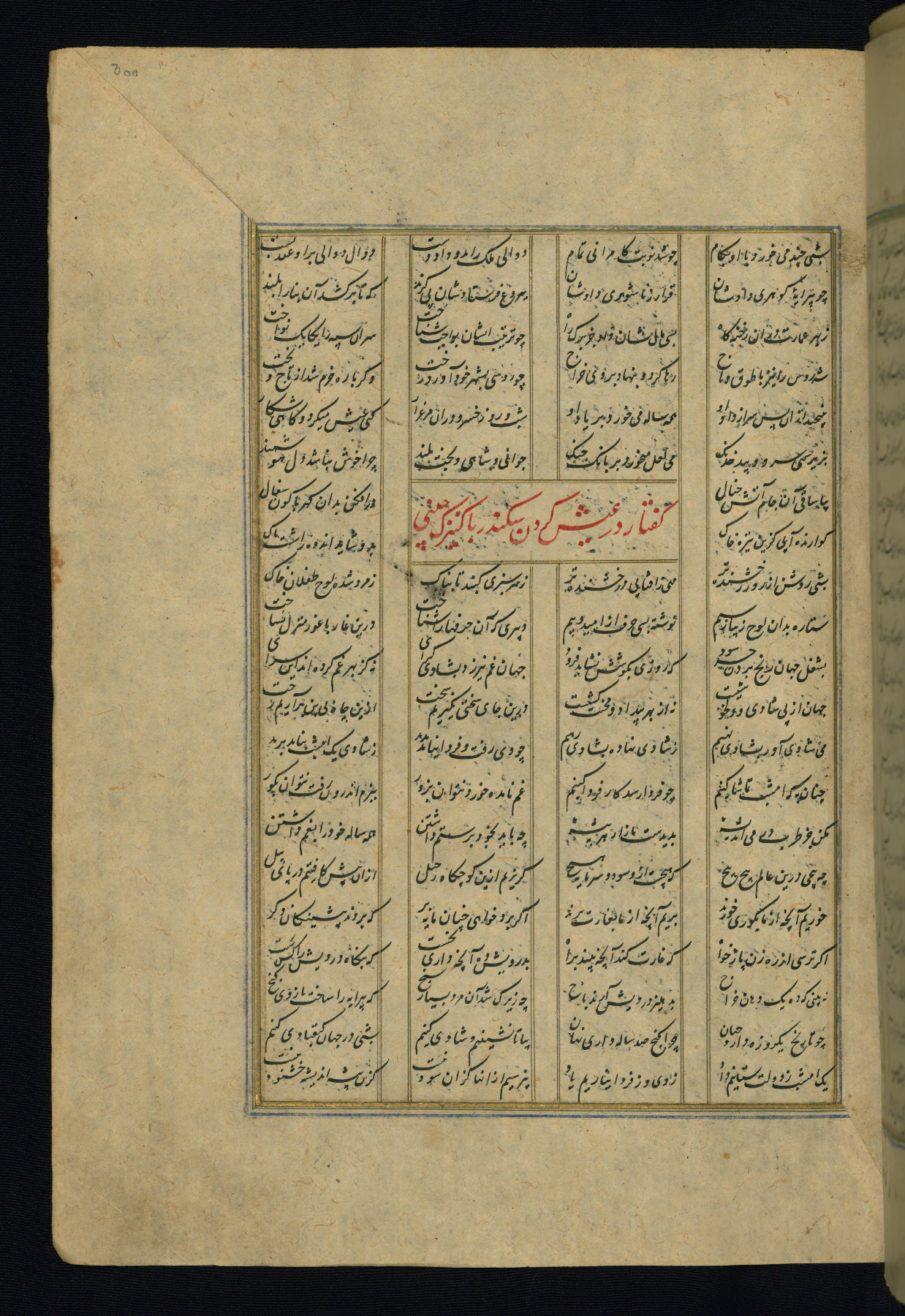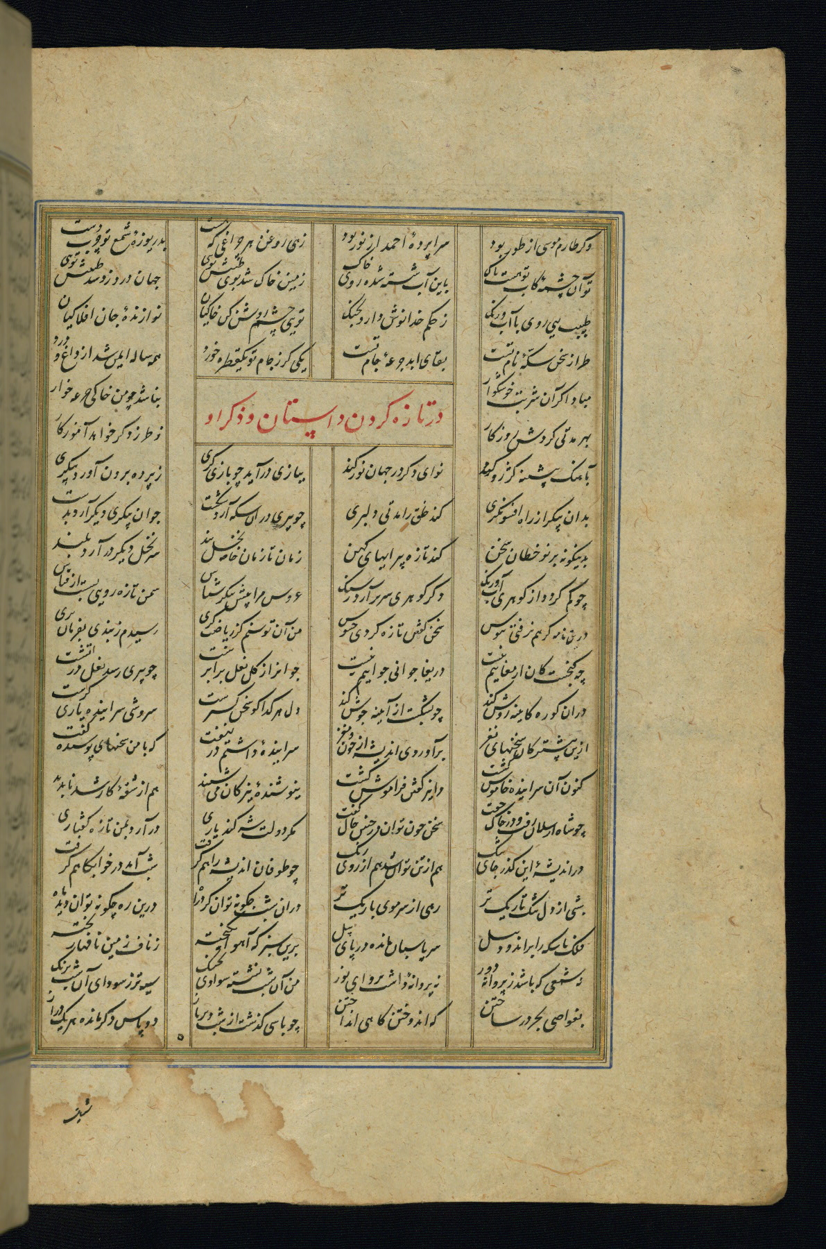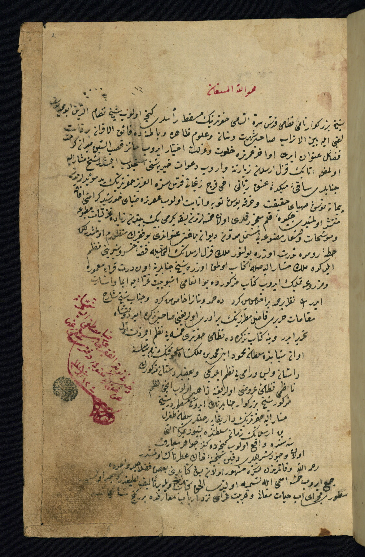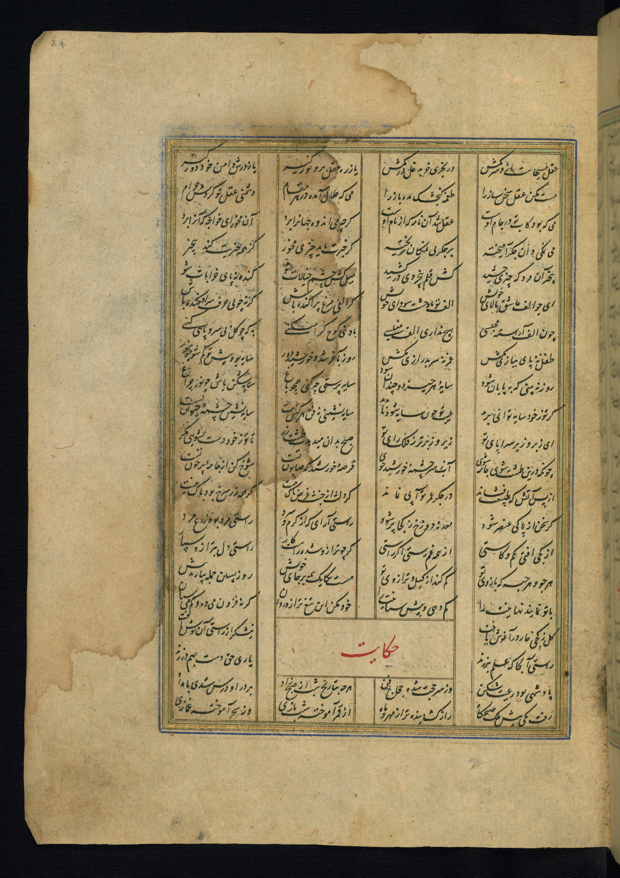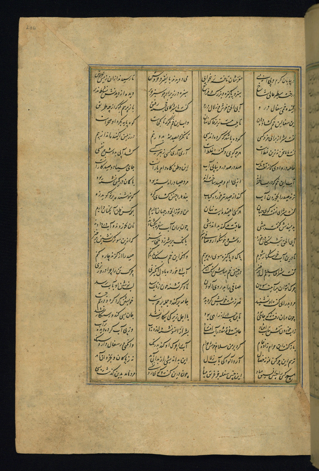 This is an illuminated and illustrated copy of the Khamsah (quintet) by Niẓāmī Ganjavī (d. 605 AH / 1209 CE), completed by Ḥabīb Allāh ibn ʿAlī ibn Ḥusām in Safavid Iran in Rabīʿ II 971 AH / 1563 CE. Illuminated titlepieces introduce the five poems, and there are thirty illustrations, the majority of which are attributable to thirteenth century AH / nineteenth CE Qajar Iran. Ownership notes and seals indicating the provenance of this manuscript are found throughout the codex (fols. 1a, 2a, 153a, 177a, 233a, 349a, and 351a). The binding is not original to the manuscript.