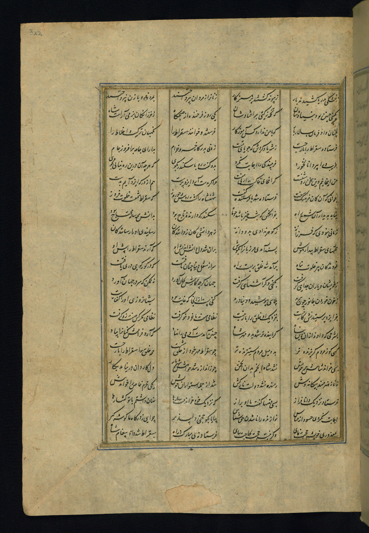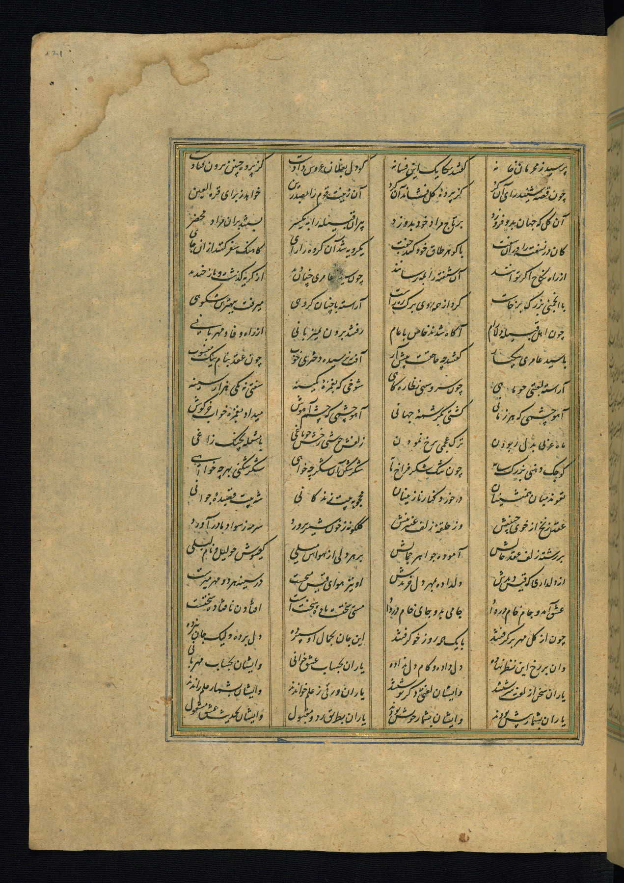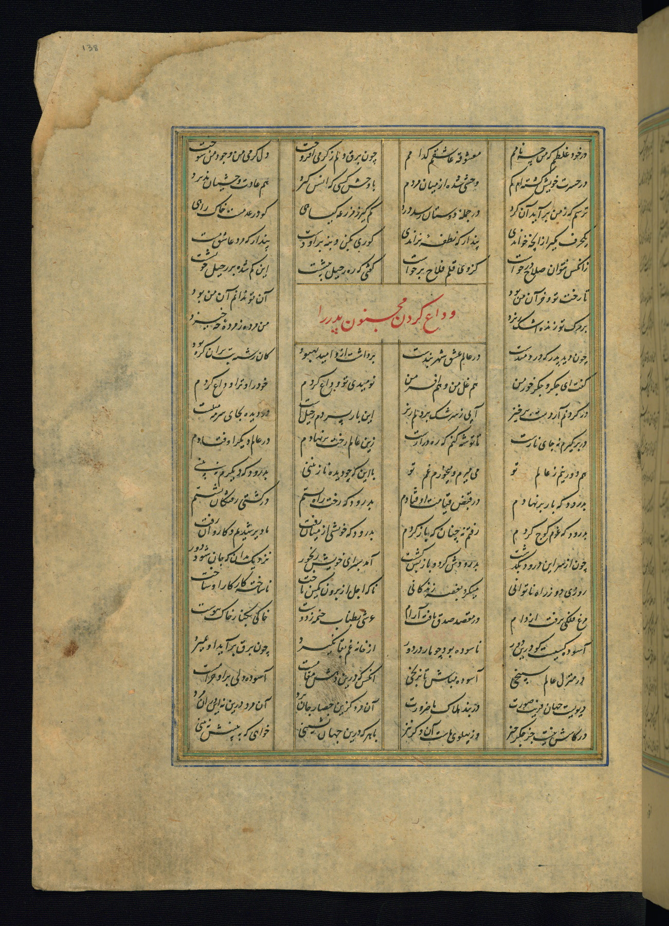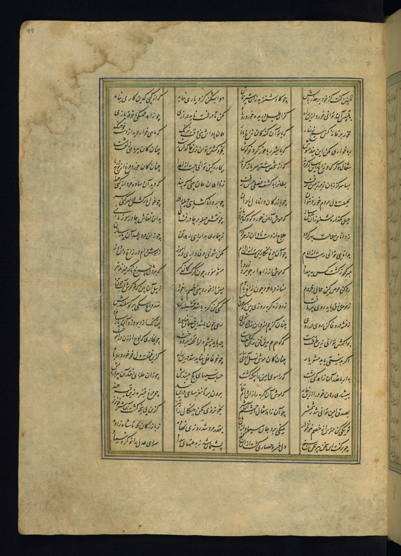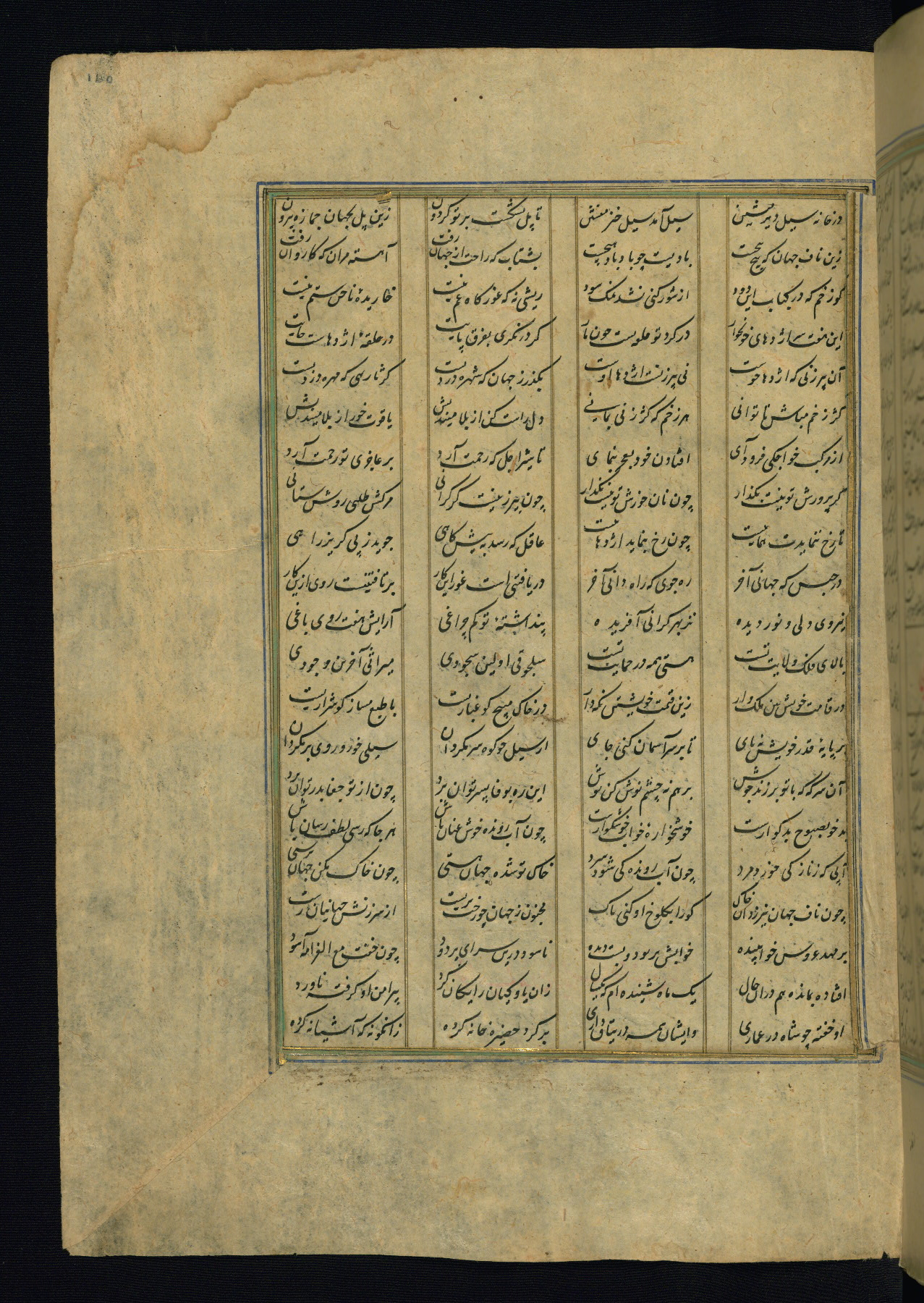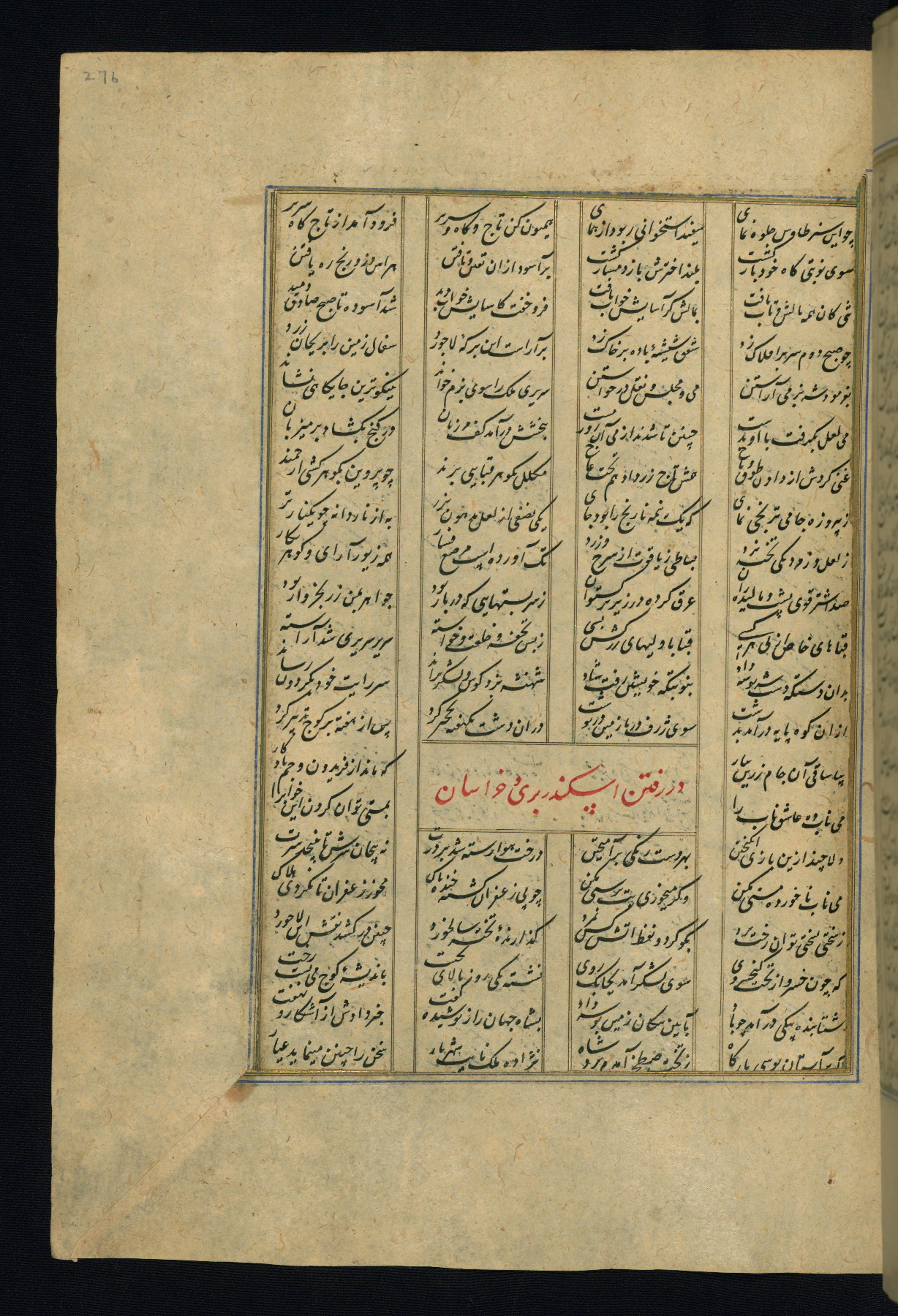This is an illuminated and illustrated copy of the Khamsah (quintet) by Niẓāmī Ganjavī (d. 605 AH / 1209 CE), completed by Ḥabīb Allāh ibn ʿAlī ibn Ḥusām in Safavid Iran in Rabīʿ II 971 AH / 1563 CE. Illuminated titlepieces introduce the five poems, and there are thirty illustrations, the majority of which are attributable to thirteenth century AH / nineteenth CE Qajar Iran. Ownership notes and seals indicating the provenance of this manuscript are found throughout the codex (fols. 1a, 2a, 153a, 177a, 233a, 349a, and 351a). The binding is not original to the manuscript.