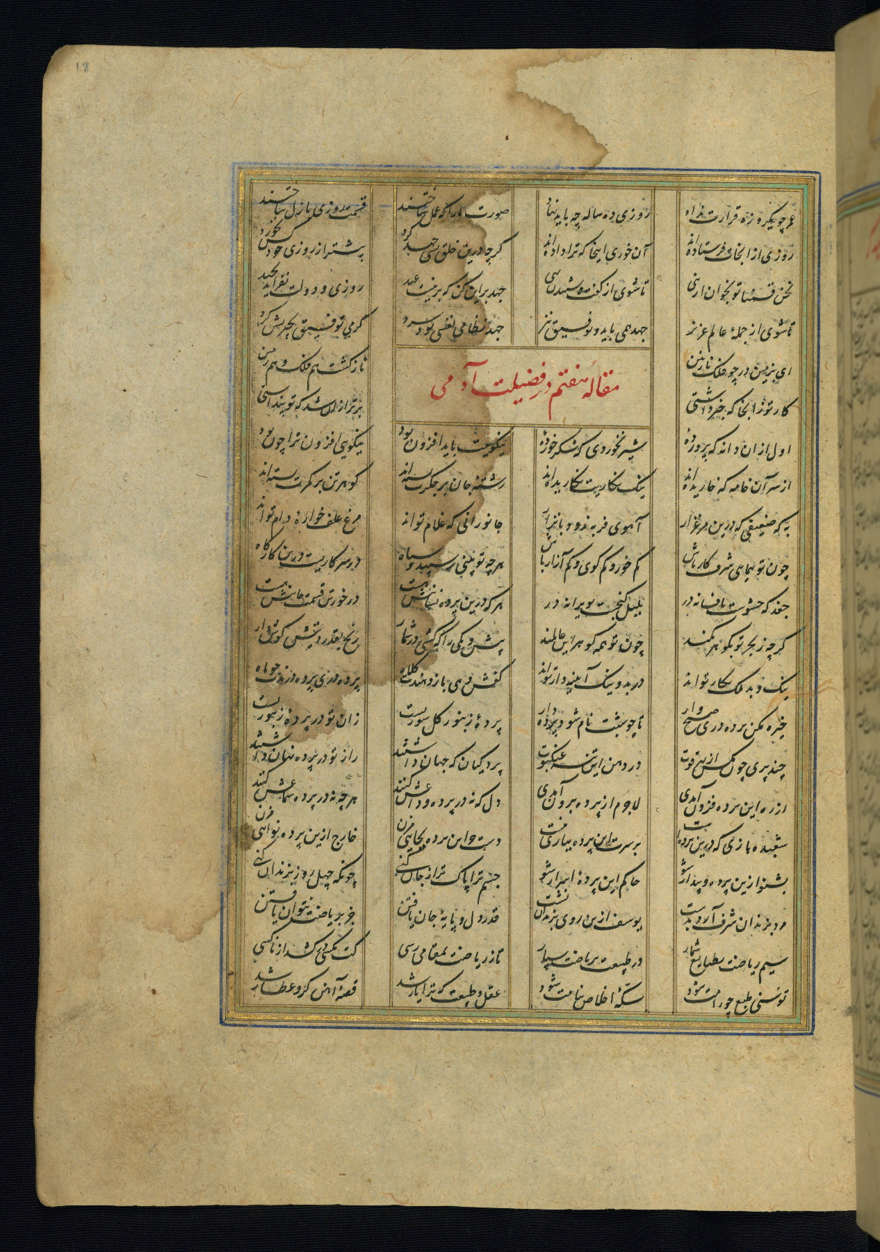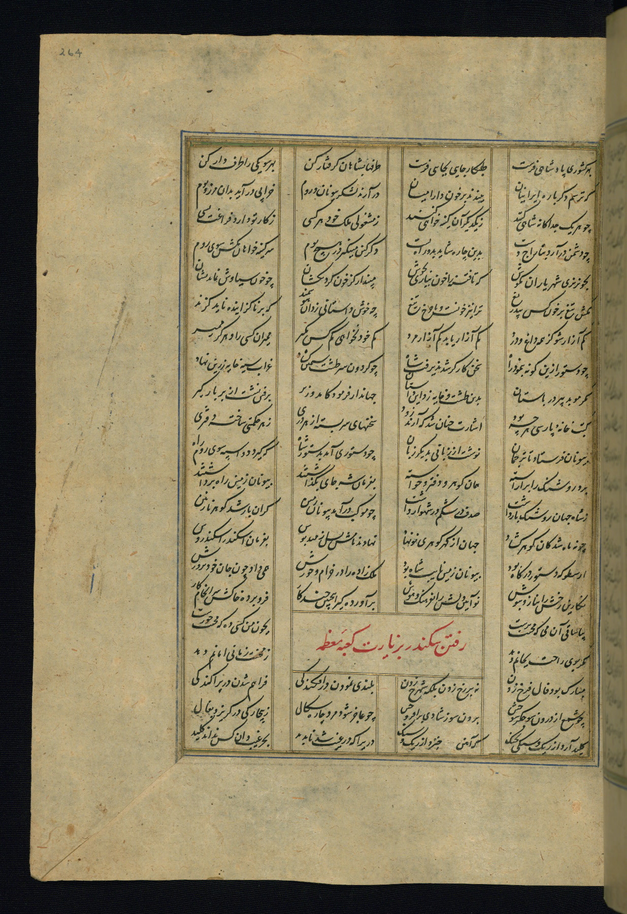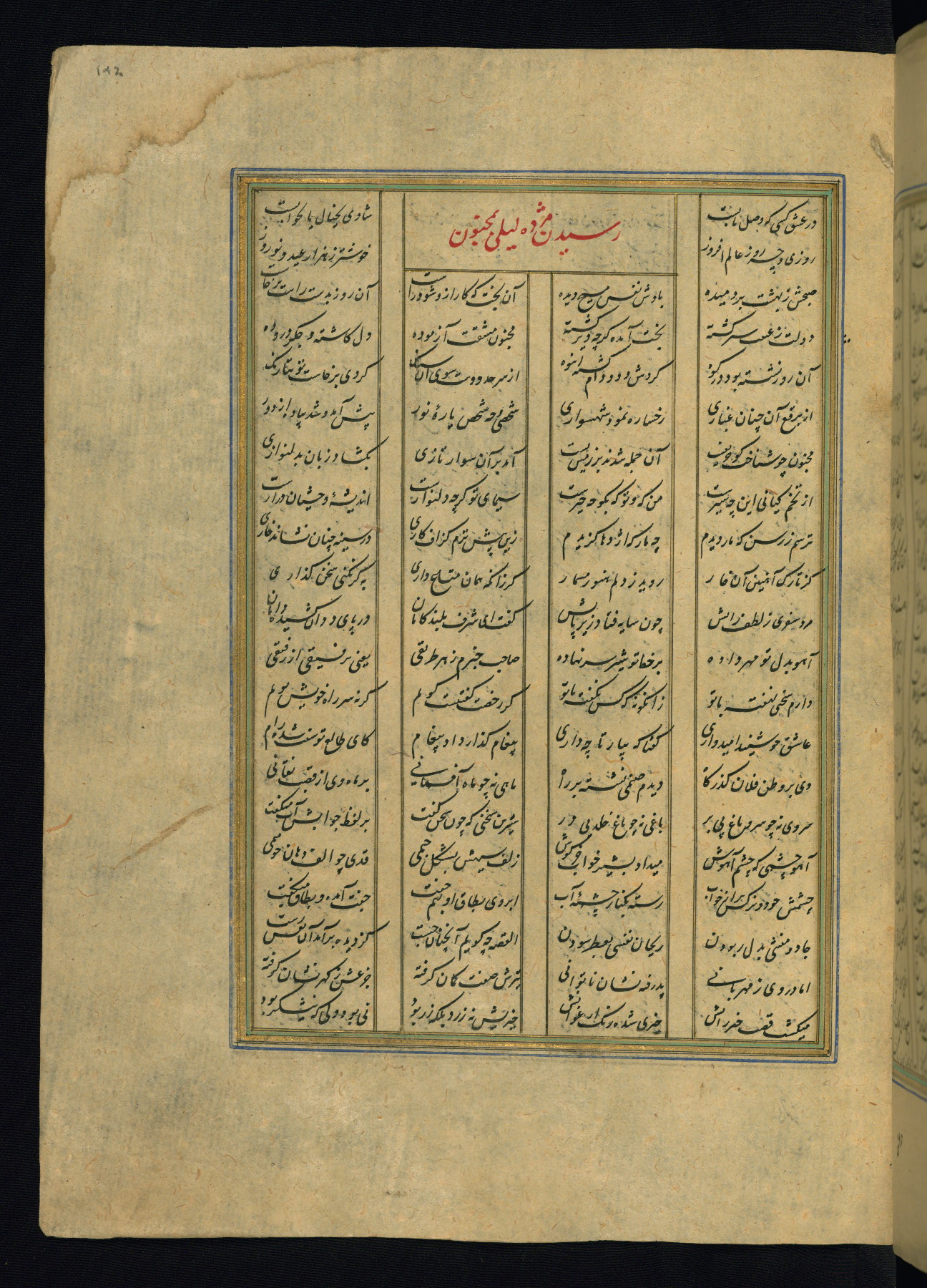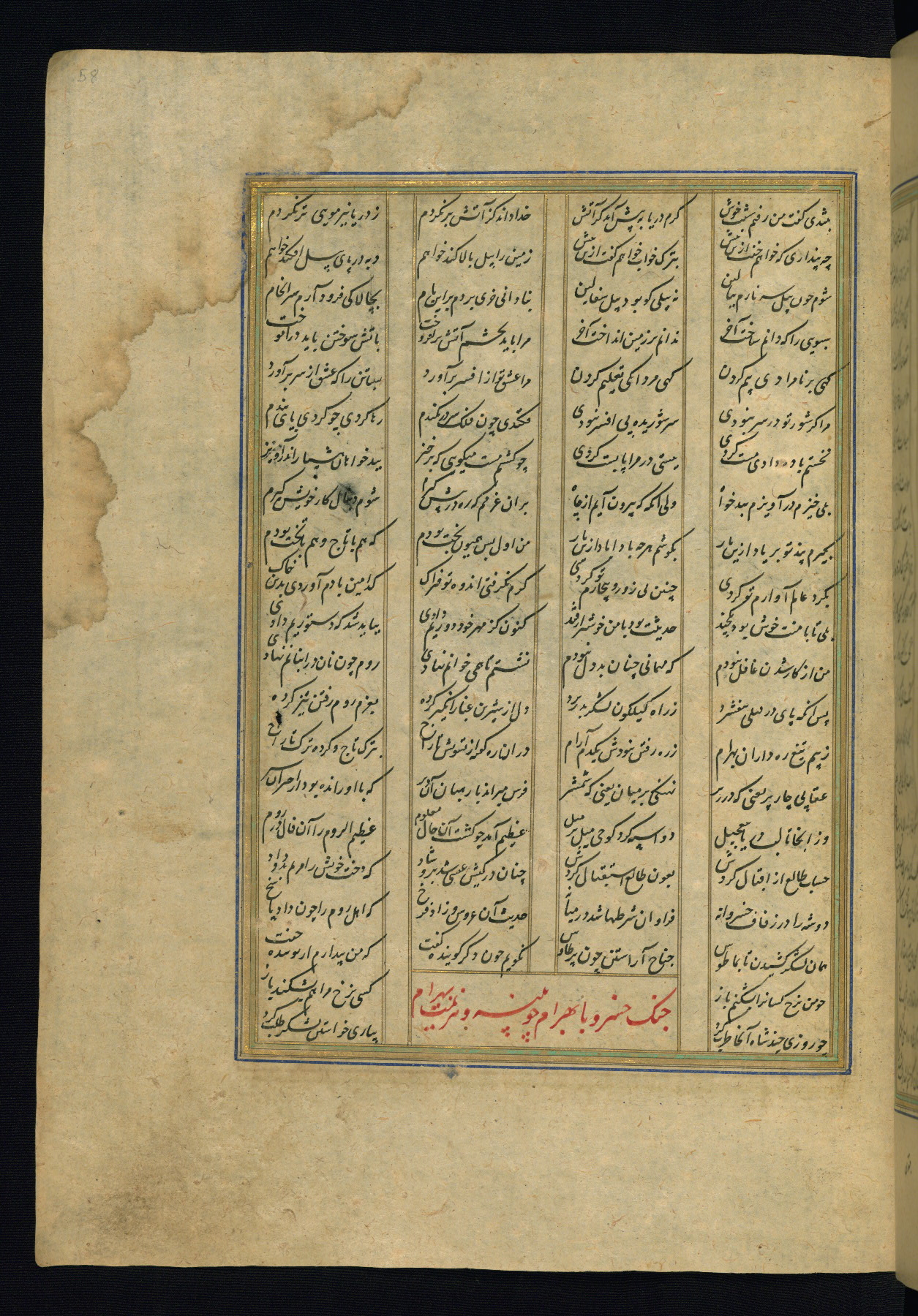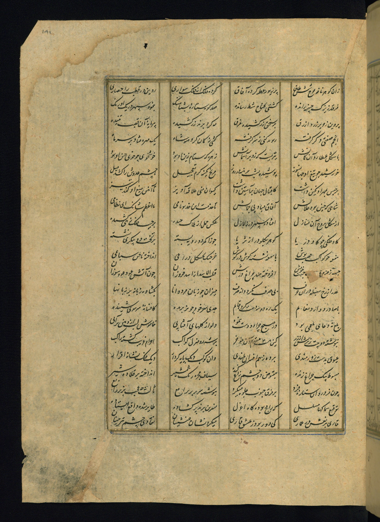 This is an illuminated and illustrated copy of the Khamsah (quintet) by Niẓāmī Ganjavī (d. 605 AH / 1209 CE), completed by Ḥabīb Allāh ibn ʿAlī ibn Ḥusām in Safavid Iran in Rabīʿ II 971 AH / 1563 CE. Illuminated titlepieces introduce the five poems, and there are thirty illustrations, the majority of which are attributable to thirteenth century AH / nineteenth CE Qajar Iran. Ownership notes and seals indicating the provenance of this manuscript are found throughout the codex (fols. 1a, 2a, 153a, 177a, 233a, 349a, and 351a). The binding is not original to the manuscript.