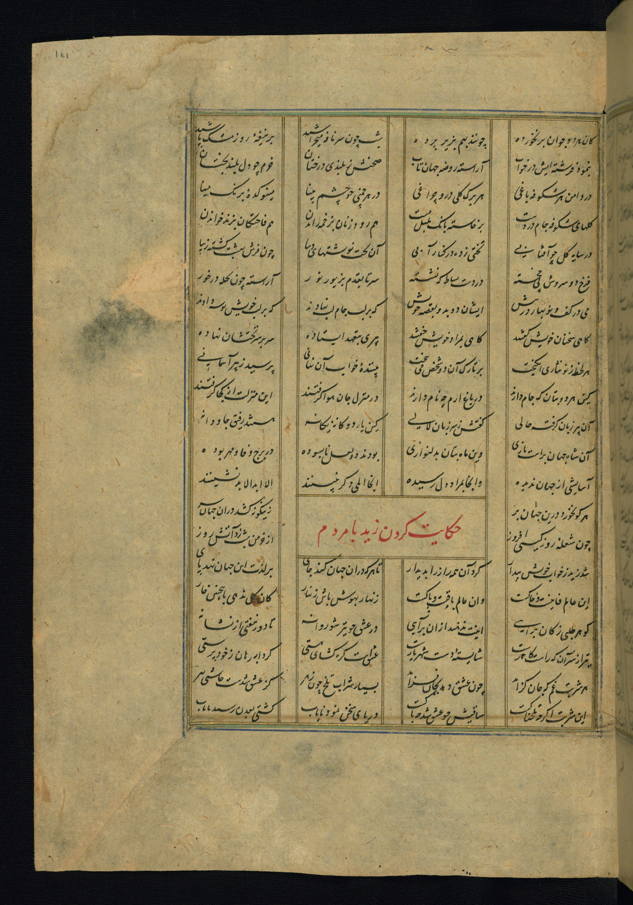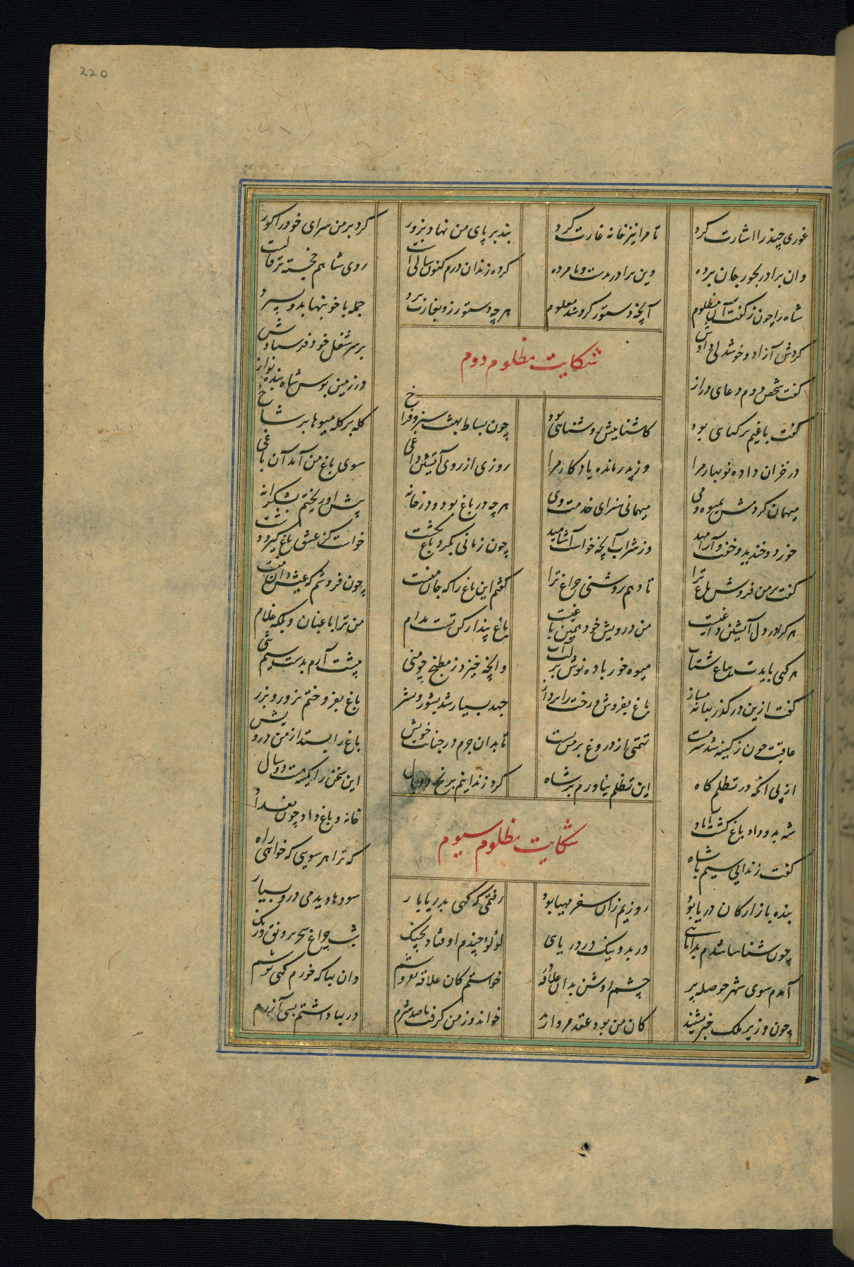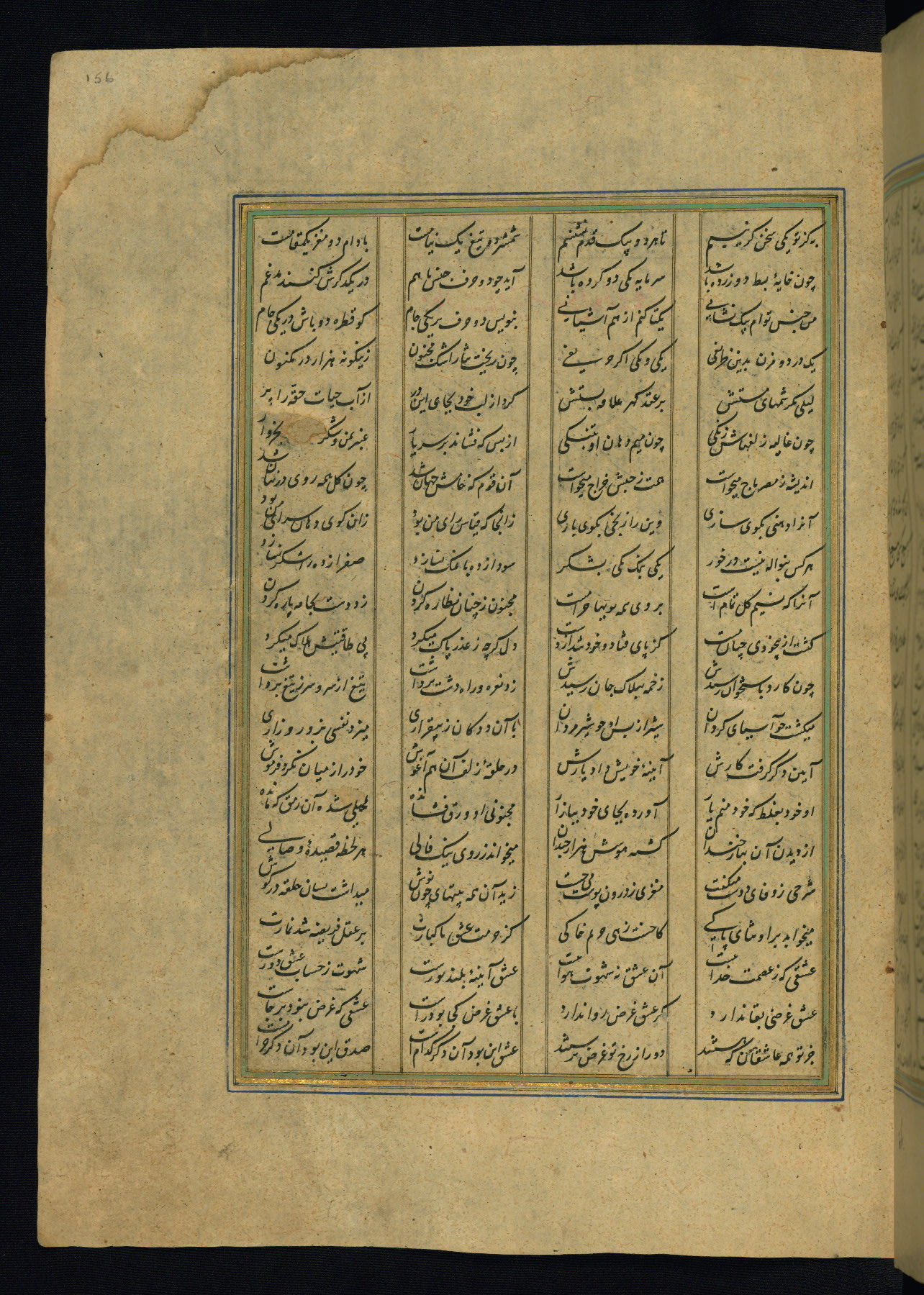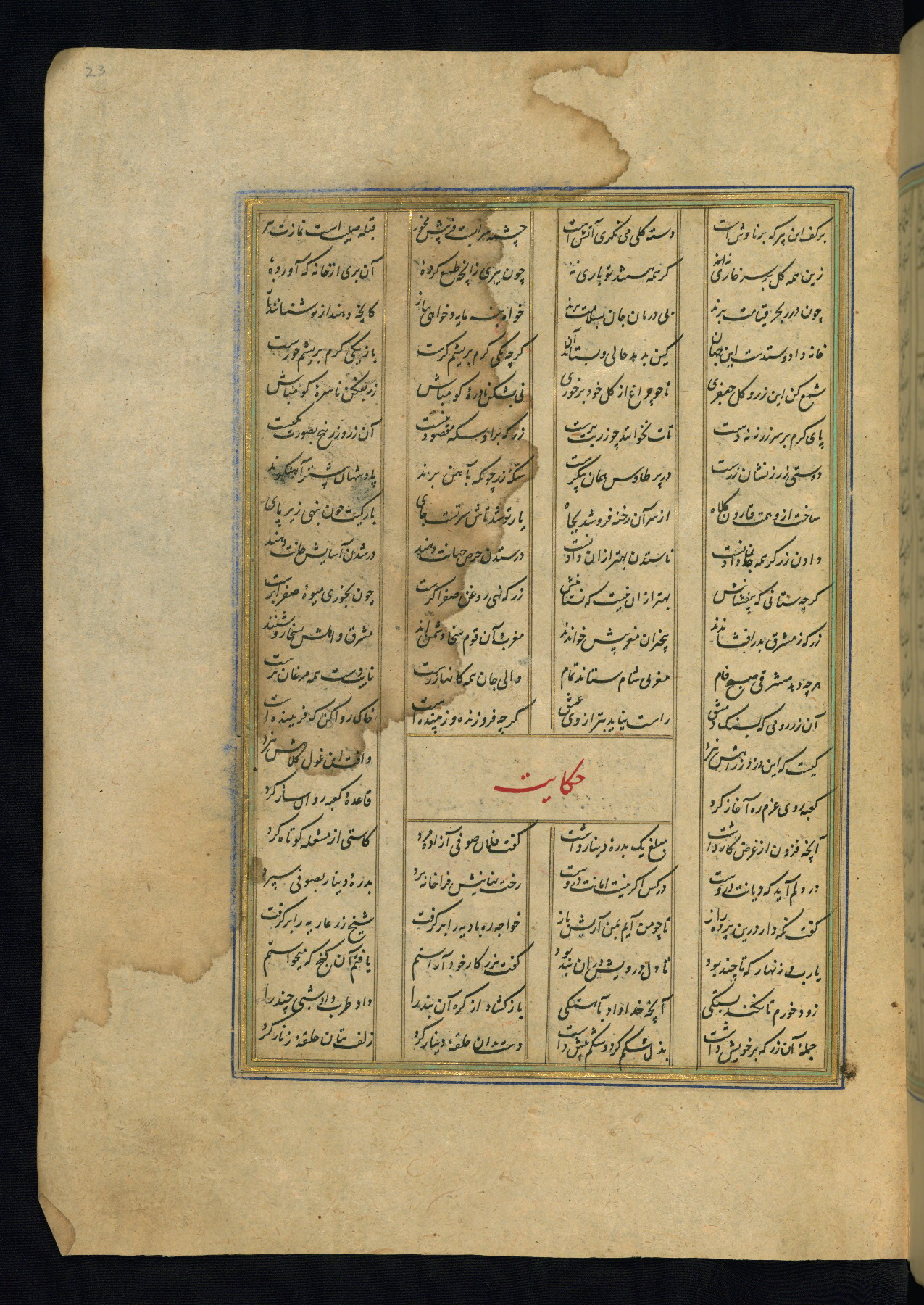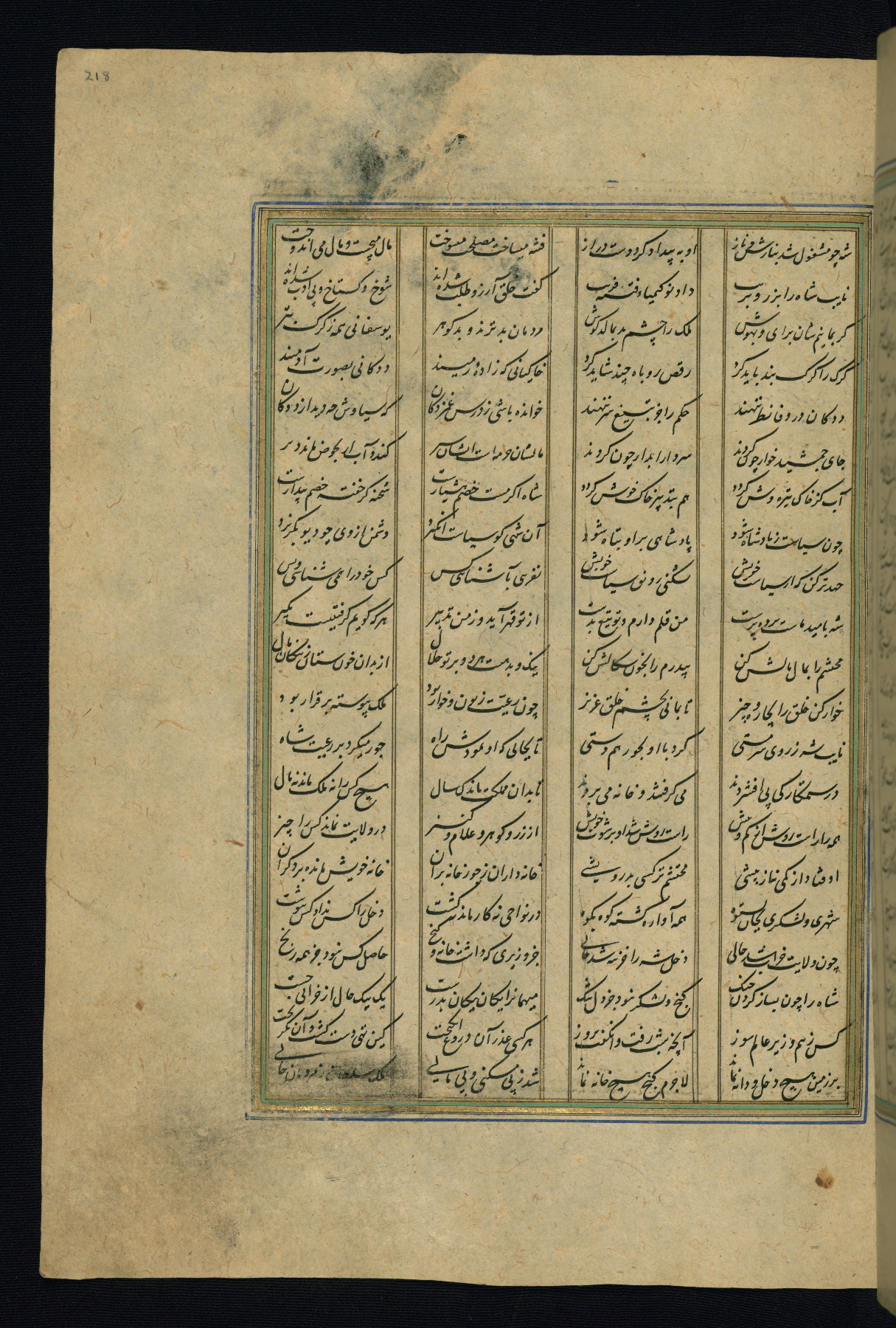 This is an illuminated and illustrated copy of the Khamsah (quintet) by Niẓāmī Ganjavī (d. 605 AH / 1209 CE), completed by Ḥabīb Allāh ibn ʿAlī ibn Ḥusām in Safavid Iran in Rabīʿ II 971 AH / 1563 CE. Illuminated titlepieces introduce the five poems, and there are thirty illustrations, the majority of which are attributable to thirteenth century AH / nineteenth CE Qajar Iran. Ownership notes and seals indicating the provenance of this manuscript are found throughout the codex (fols. 1a, 2a, 153a, 177a, 233a, 349a, and 351a). The binding is not original to the manuscript.