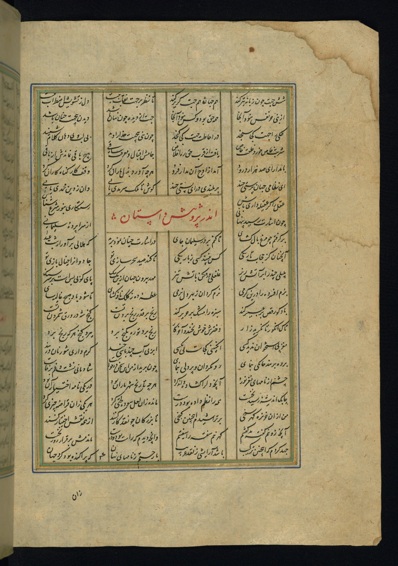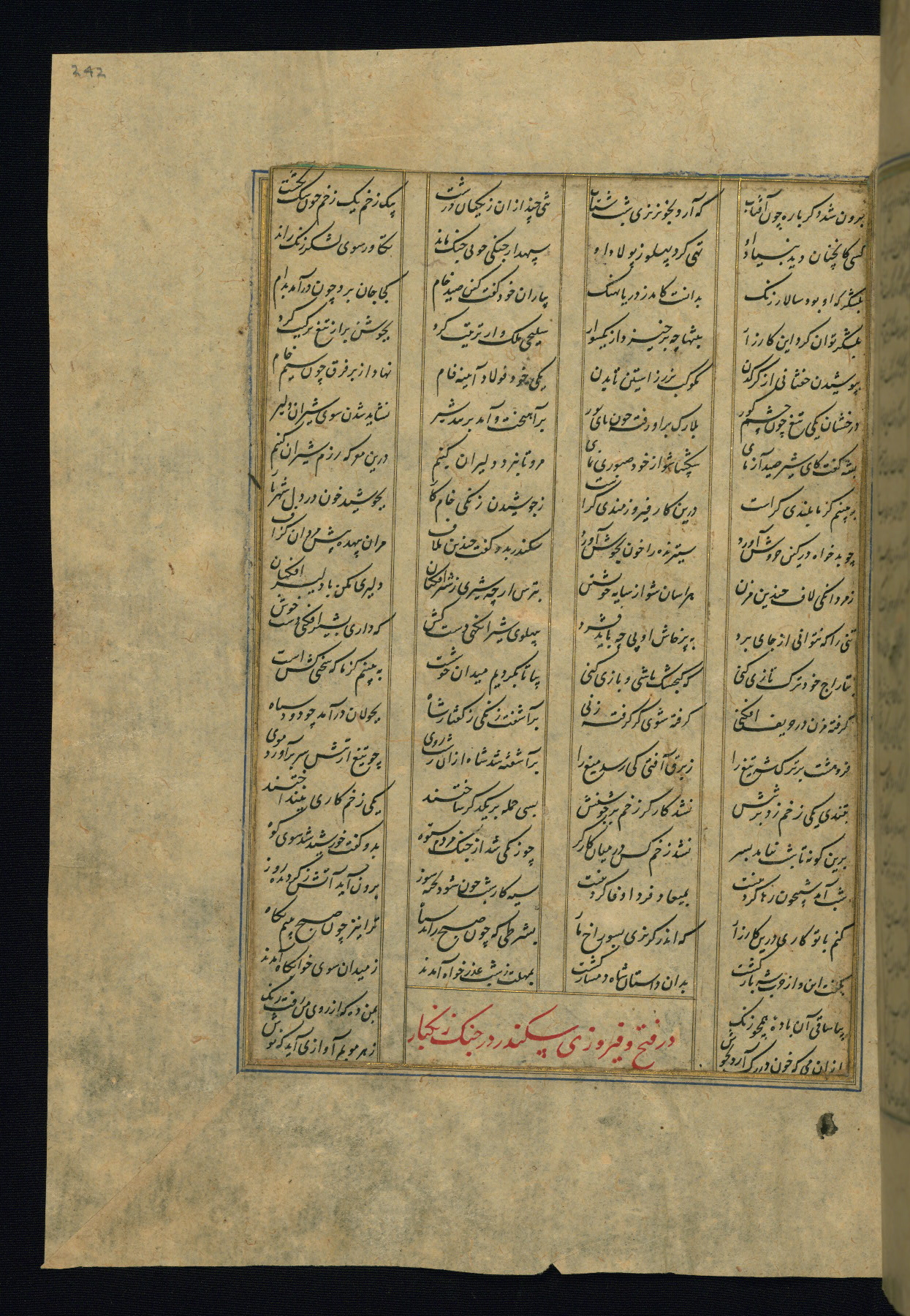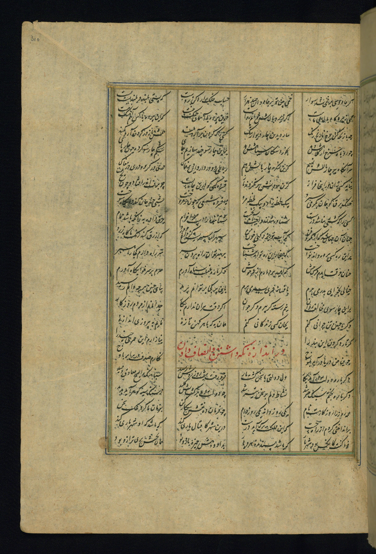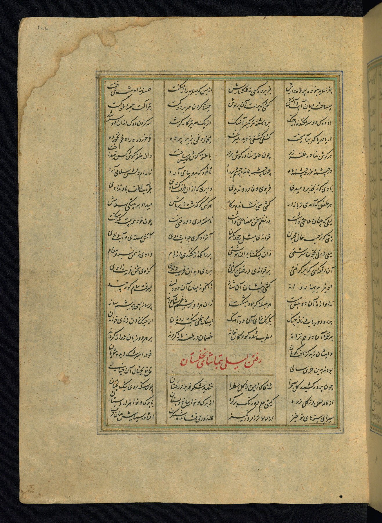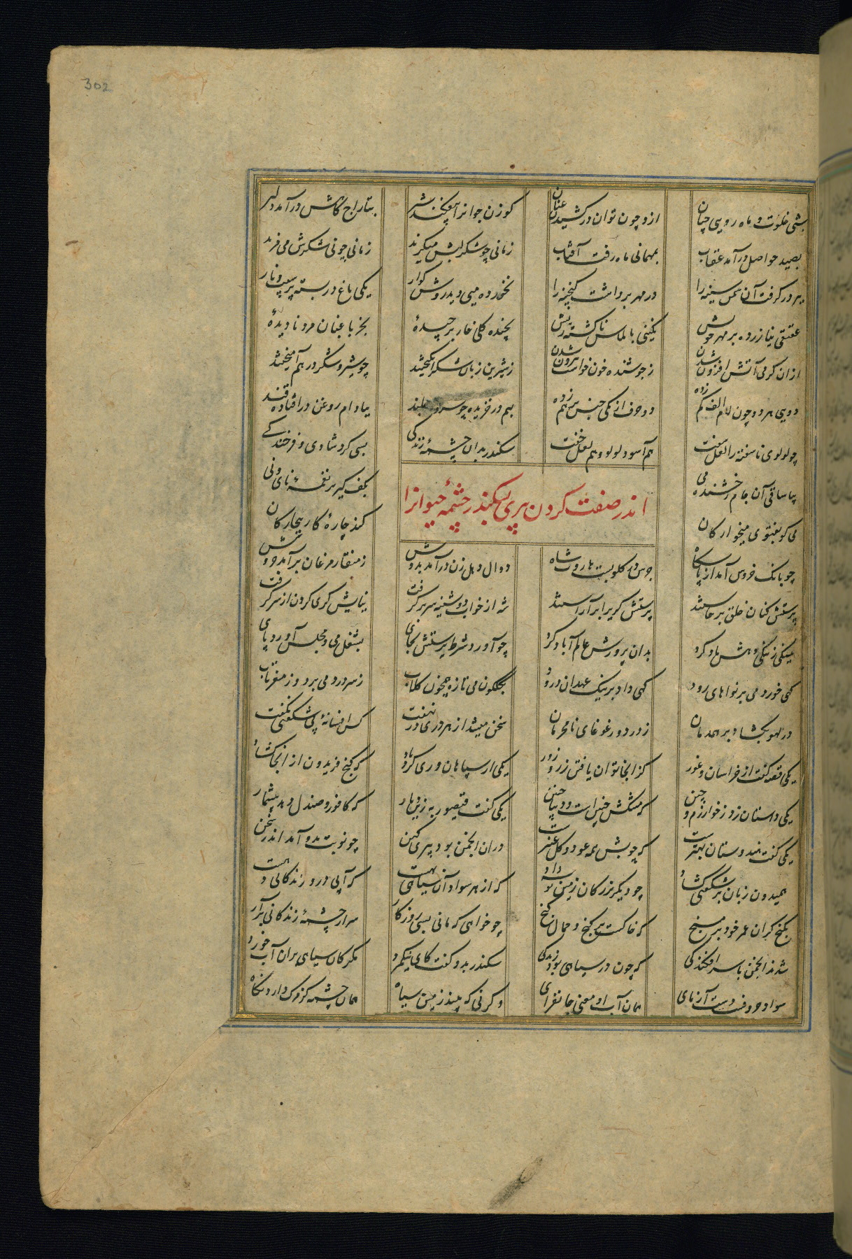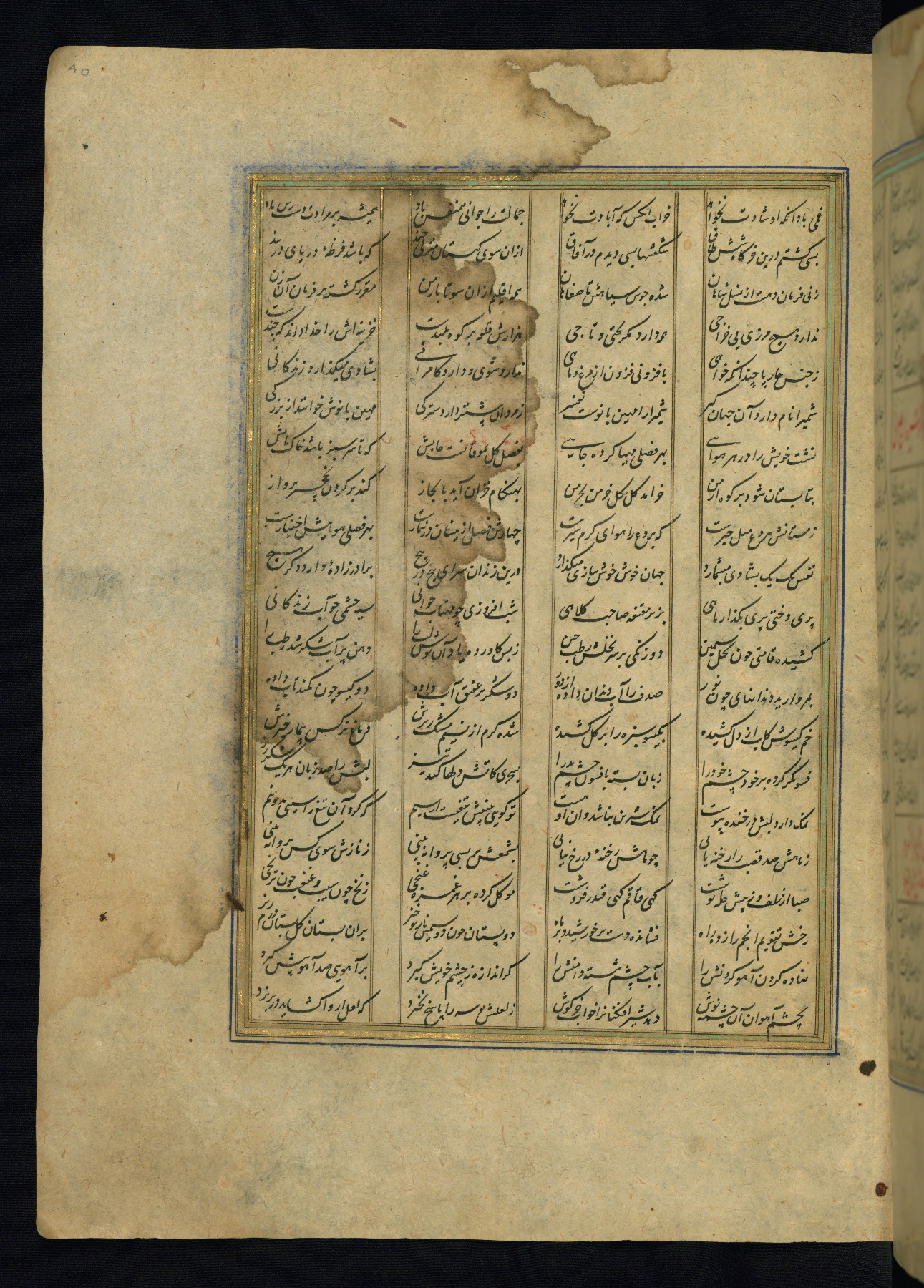 This is an illuminated and illustrated copy of the Khamsah (quintet) by Niẓāmī Ganjavī (d. 605 AH / 1209 CE), completed by Ḥabīb Allāh ibn ʿAlī ibn Ḥusām in Safavid Iran in Rabīʿ II 971 AH / 1563 CE. Illuminated titlepieces introduce the five poems, and there are thirty illustrations, the majority of which are attributable to thirteenth century AH / nineteenth CE Qajar Iran. Ownership notes and seals indicating the provenance of this manuscript are found throughout the codex (fols. 1a, 2a, 153a, 177a, 233a, 349a, and 351a). The binding is not original to the manuscript.