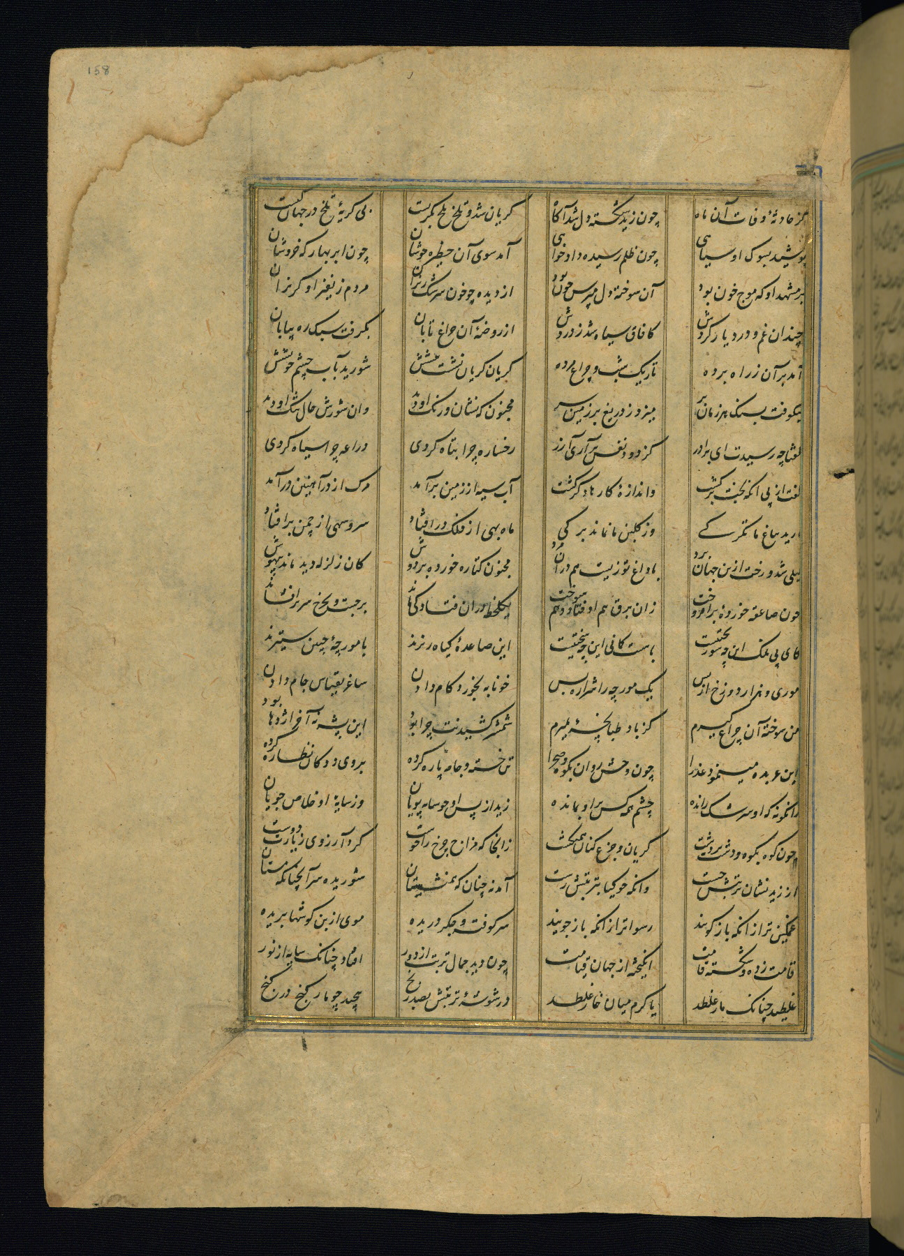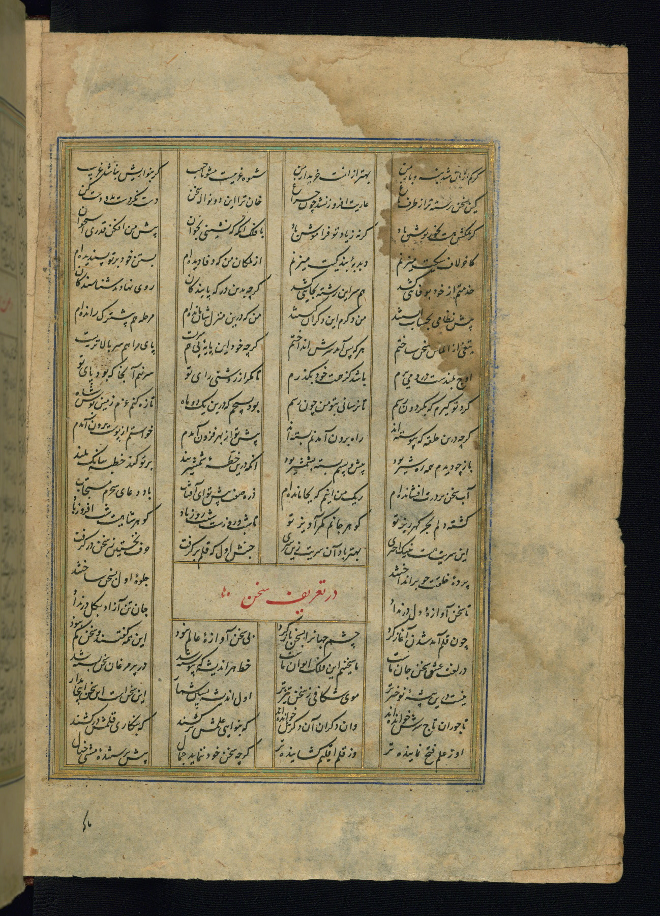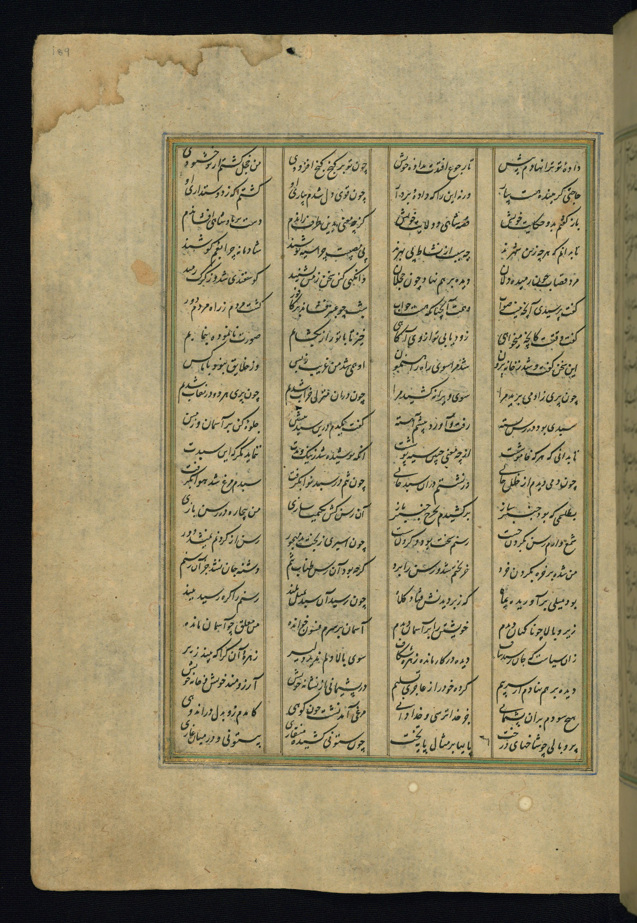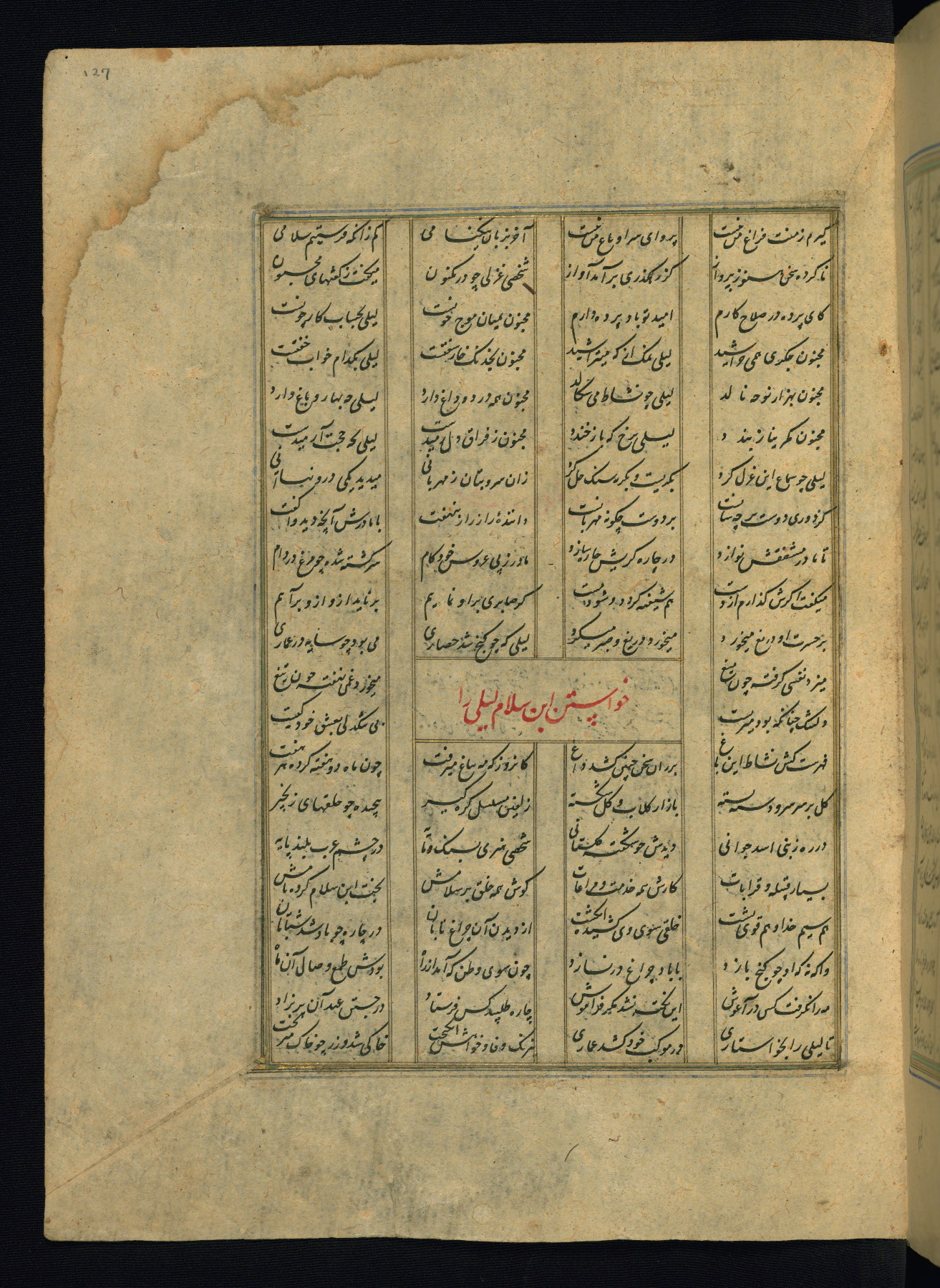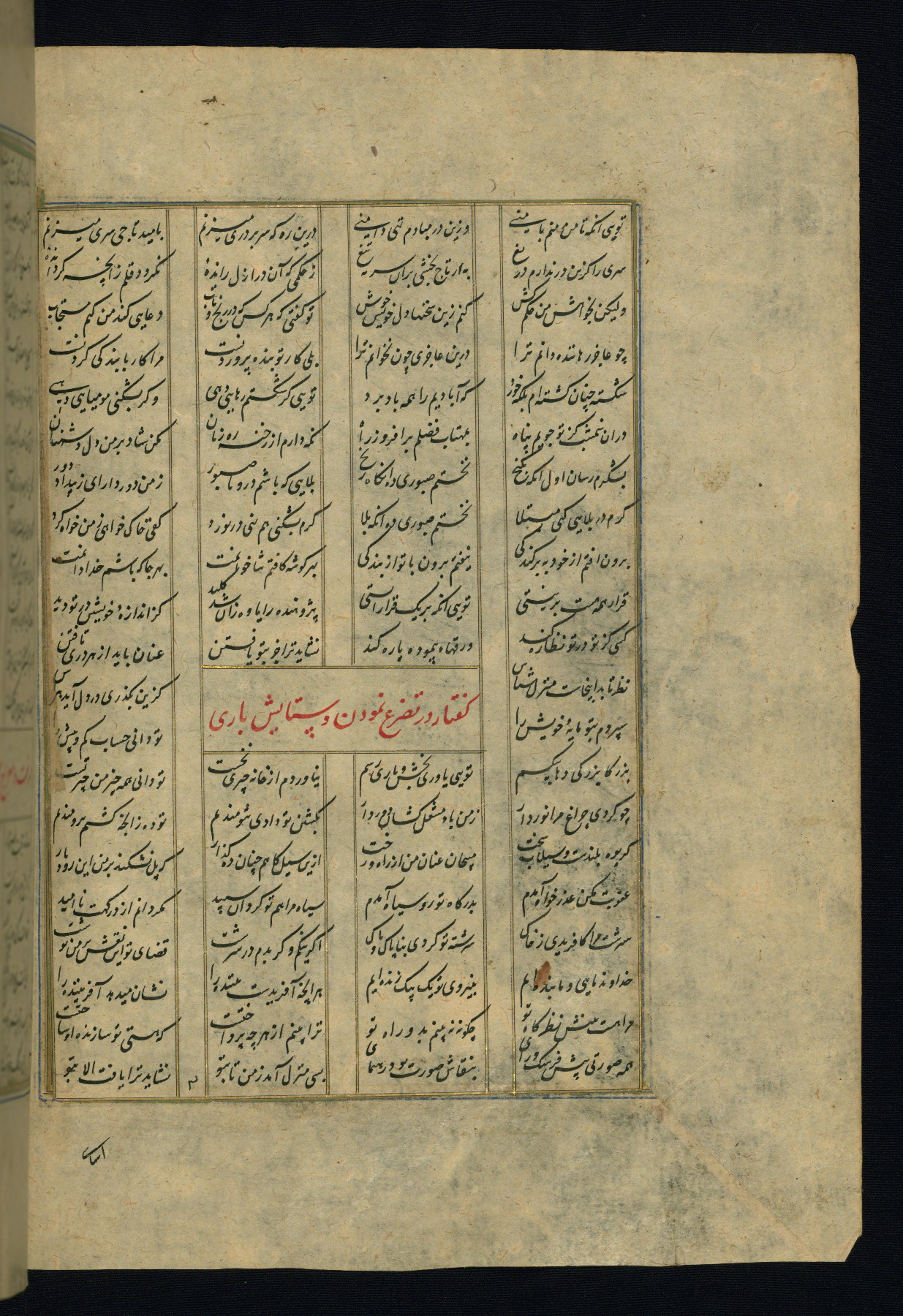 This is an illuminated and illustrated copy of the Khamsah (quintet) by Niẓāmī Ganjavī (d. 605 AH / 1209 CE), completed by Ḥabīb Allāh ibn ʿAlī ibn Ḥusām in Safavid Iran in Rabīʿ II 971 AH / 1563 CE. Illuminated titlepieces introduce the five poems, and there are thirty illustrations, the majority of which are attributable to thirteenth century AH / nineteenth CE Qajar Iran. Ownership notes and seals indicating the provenance of this manuscript are found throughout the codex (fols. 1a, 2a, 153a, 177a, 233a, 349a, and 351a). The binding is not original to the manuscript.